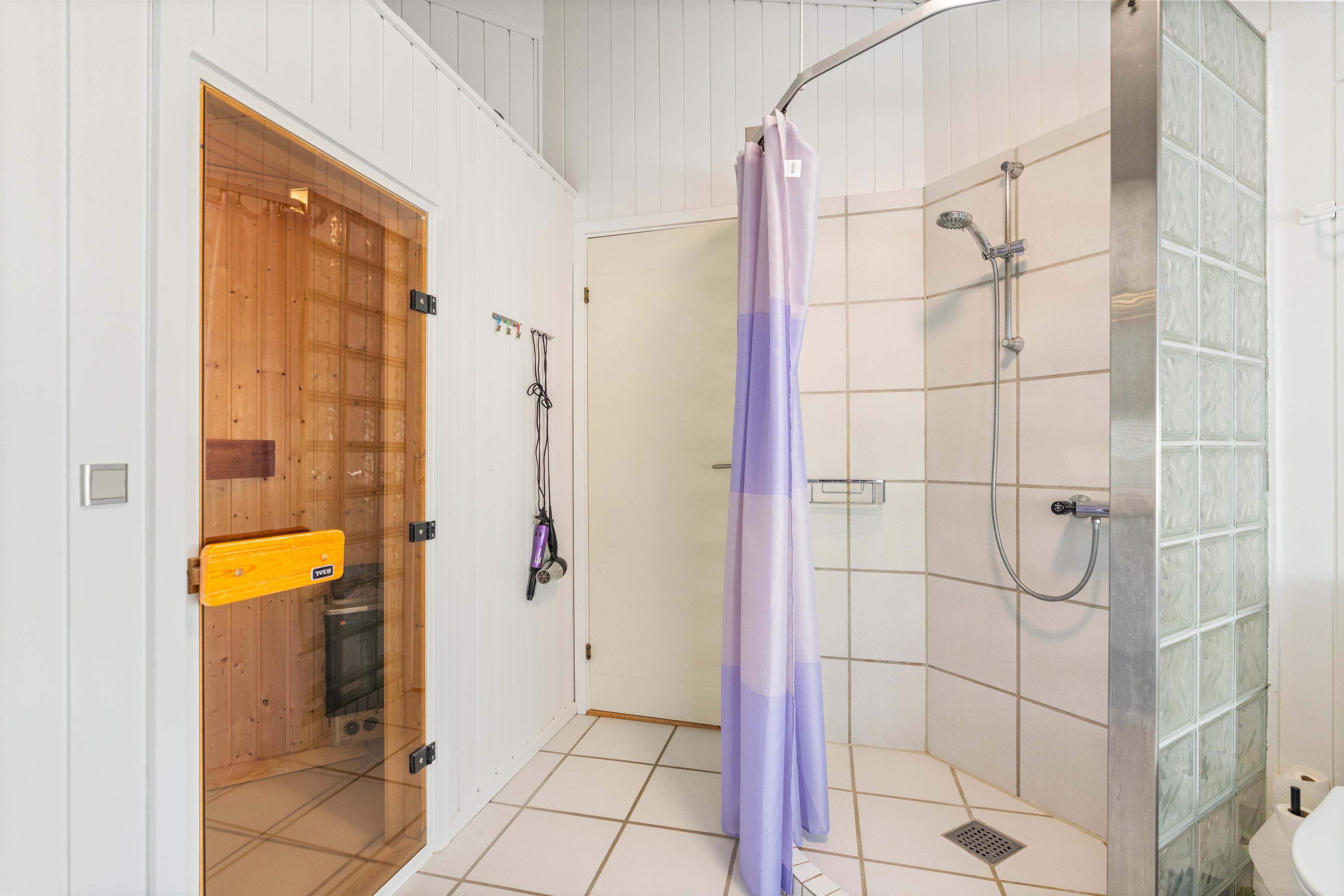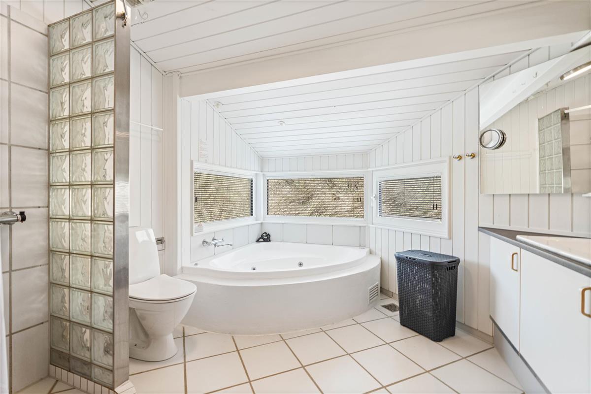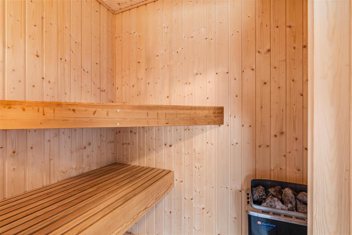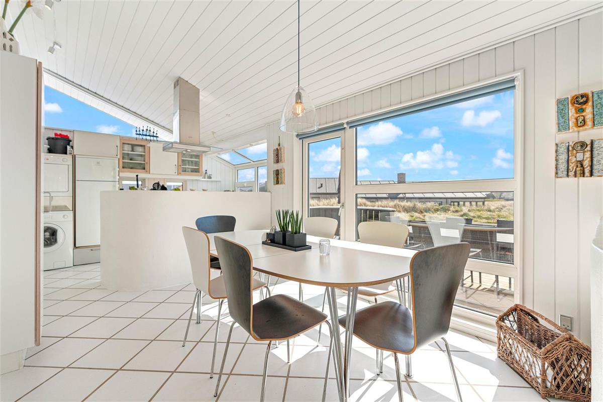 The house has two beautiful bathrooms, both with underfloor heating and shower enclosures. The main bathroom also features an excellent corner whirlpool and access to the sauna. The south-facing kitchen offers expansive views across the dune landscape.