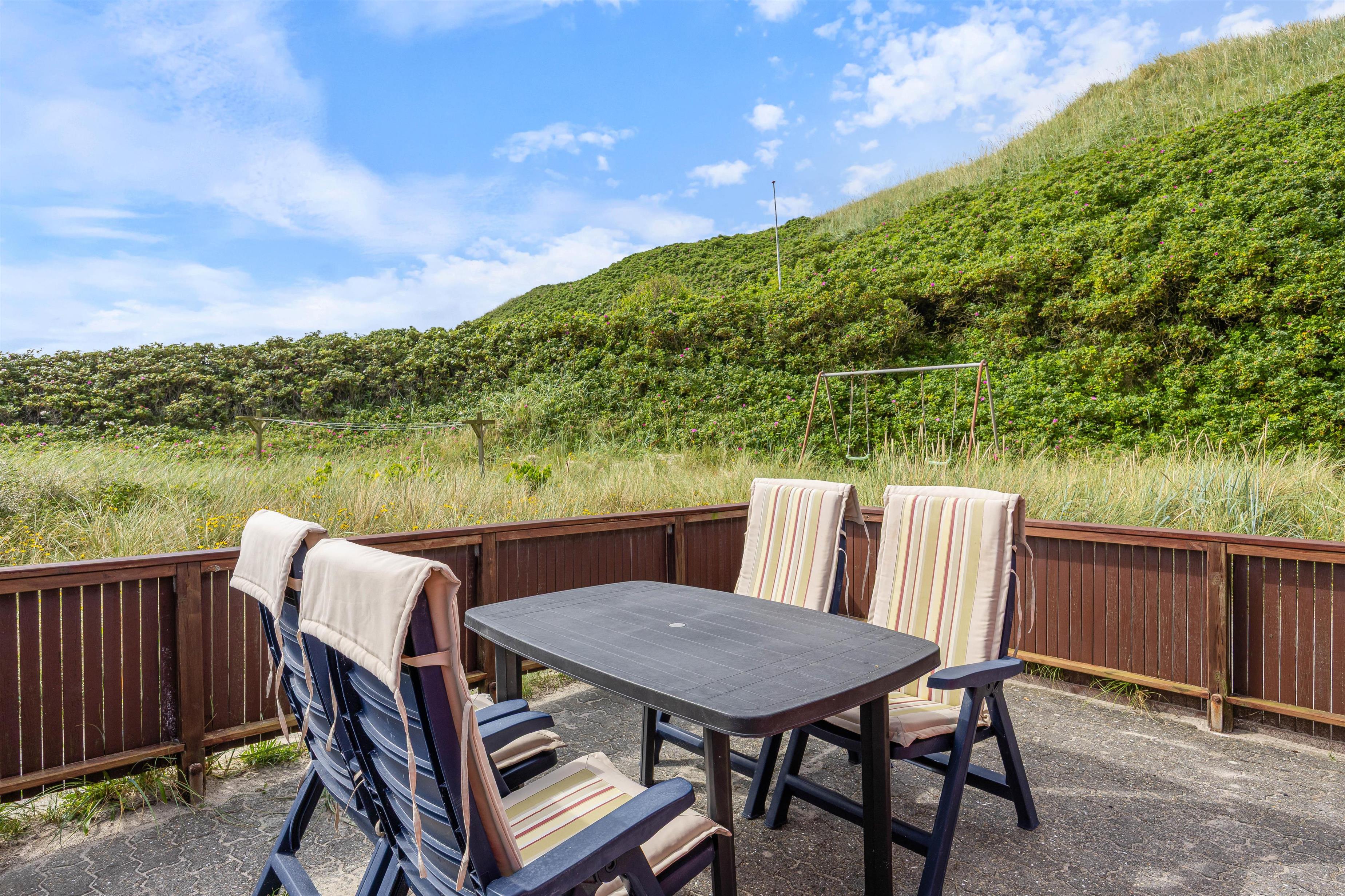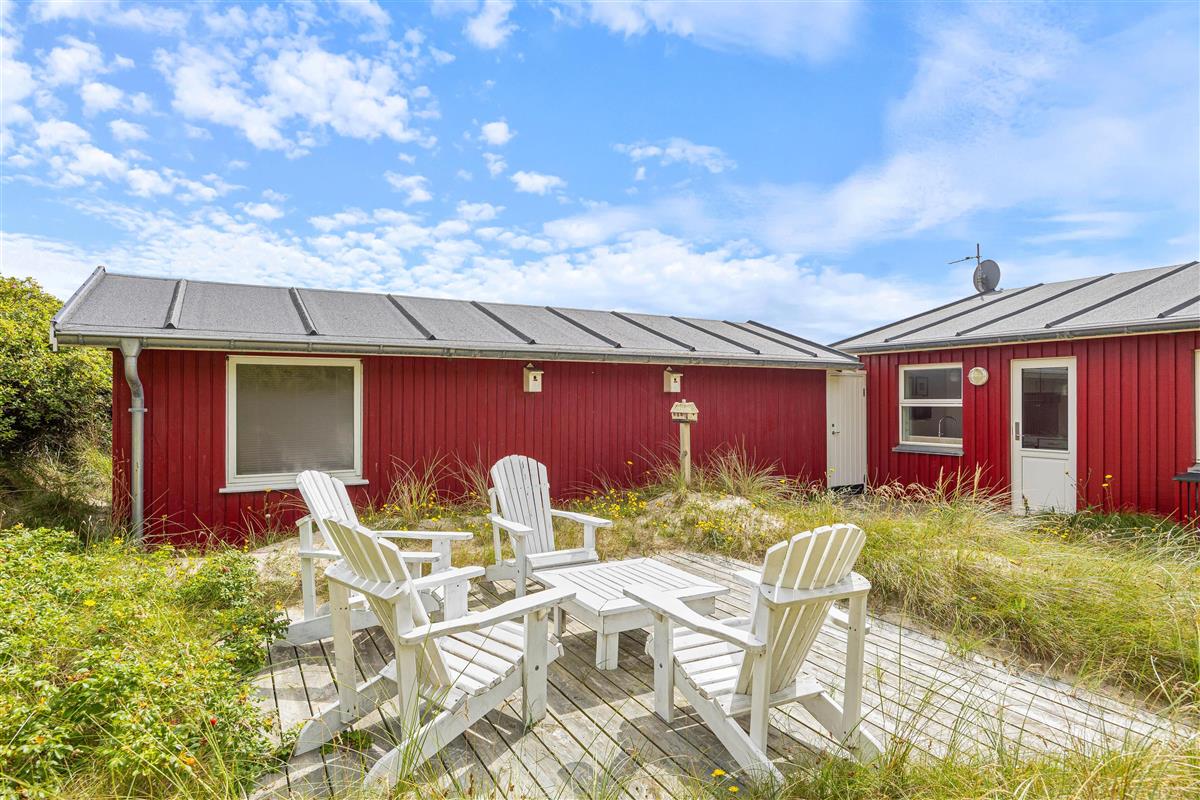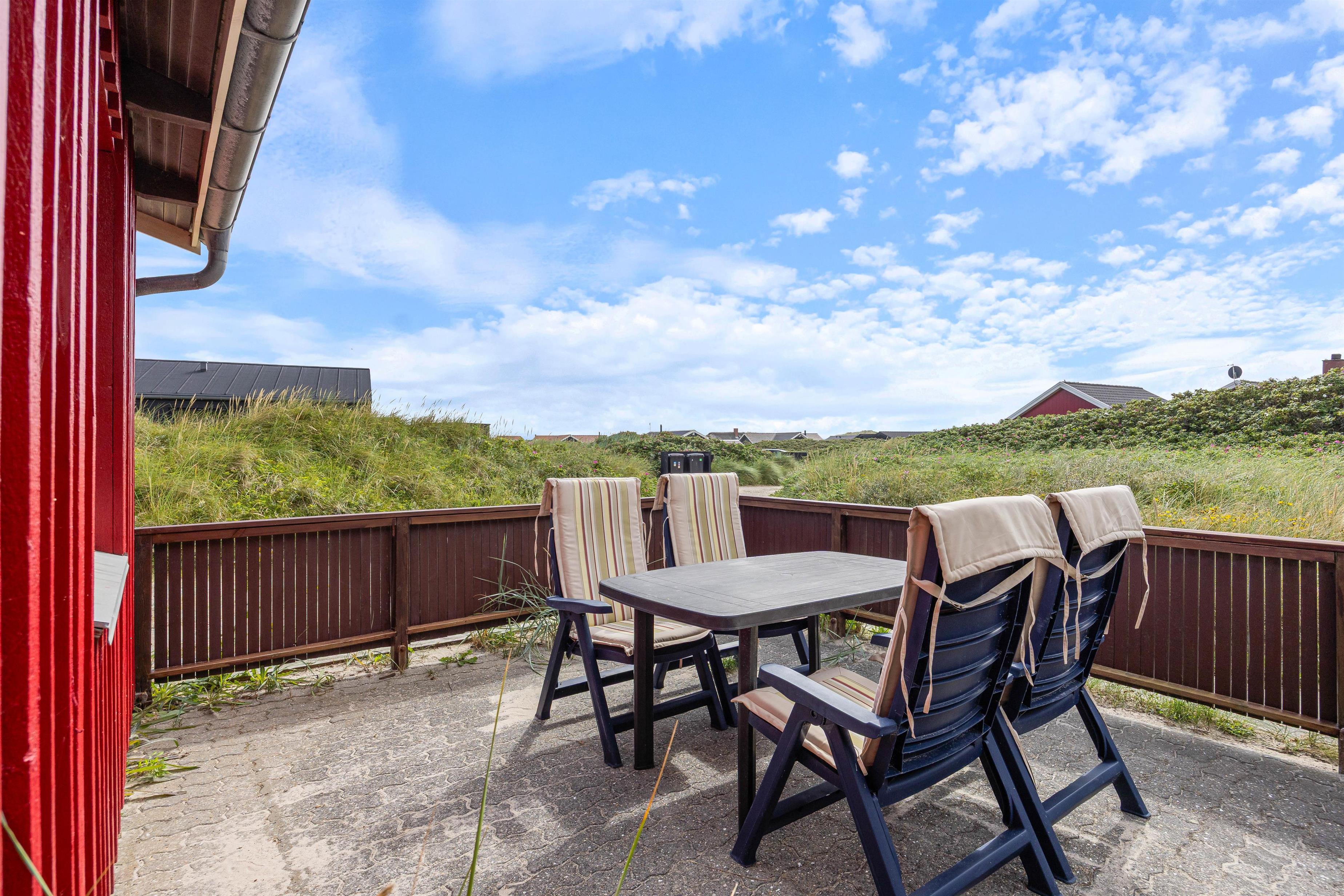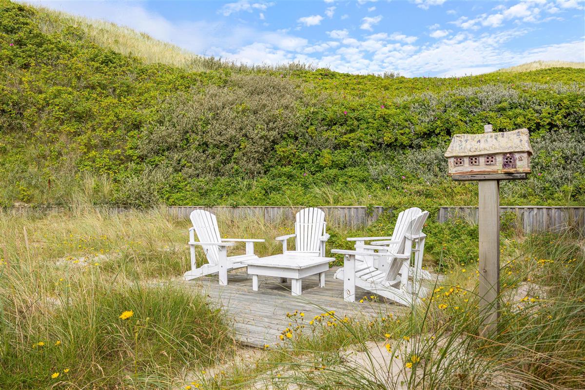 This Årgab holiday home impresses not only with its interior but also its outstanding location directly behind the dune. A path by the house leads you straight over the dune down to the beach. This proximity to the wild beauty of the beach allows you to feel the sand beneath your feet, hear the surf, and breathe in the fresh sea air whenever you wish. The fantastic location enables you to be inspired daily by the surrounding beauty and fully enjoy the freedom of beach living. The terrace is a wonderful spot to appreciate the fresh sea air and natural surroundings. It offers plenty of space for relaxed outdoor hours, whether enjoying breakfast al fresco or a cosy evening dinner overlooking the dune landscape. Due to the immediate proximity to the dunes, you may find a fine layer of sand on the terrace, lending it an authentic and natural charm that serves as a constant reminder of your closeness to the beach and rugged coastal beauty.