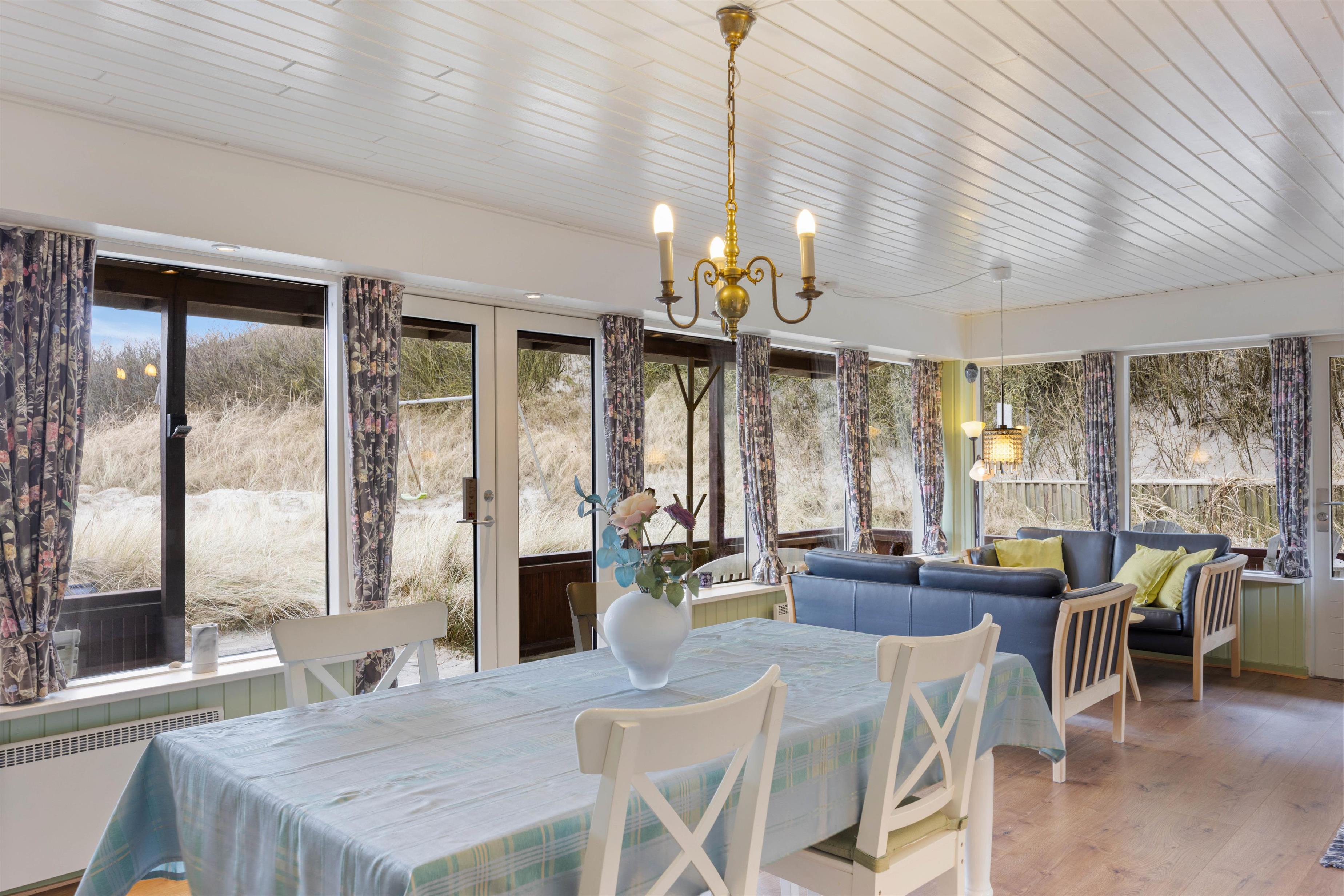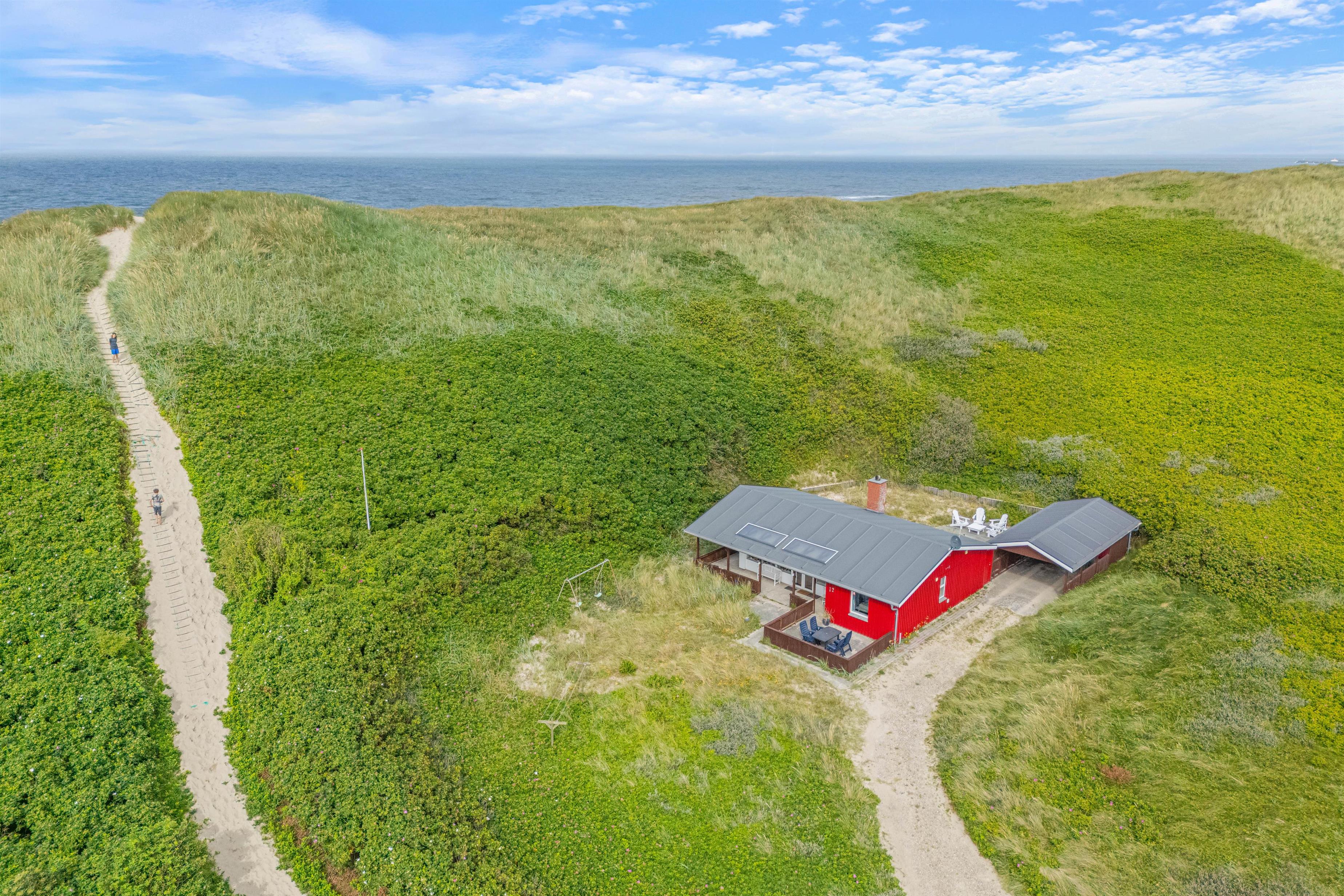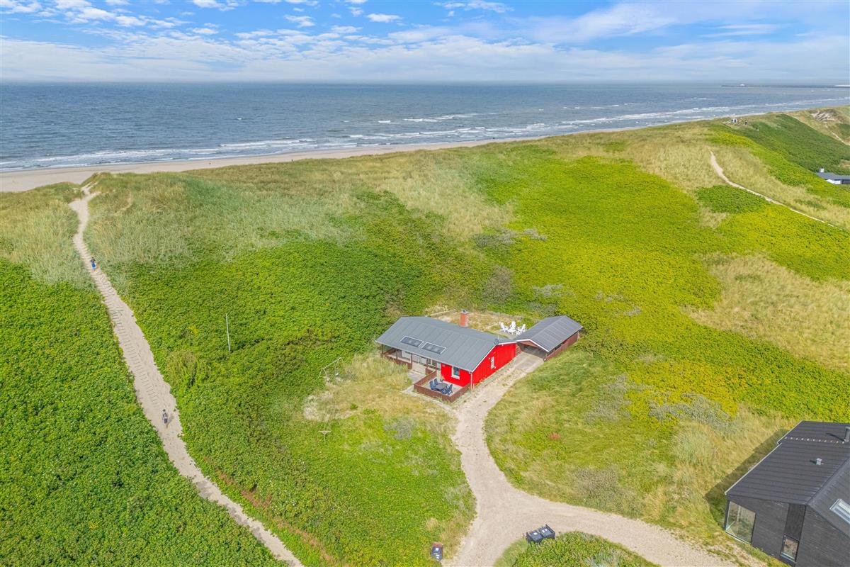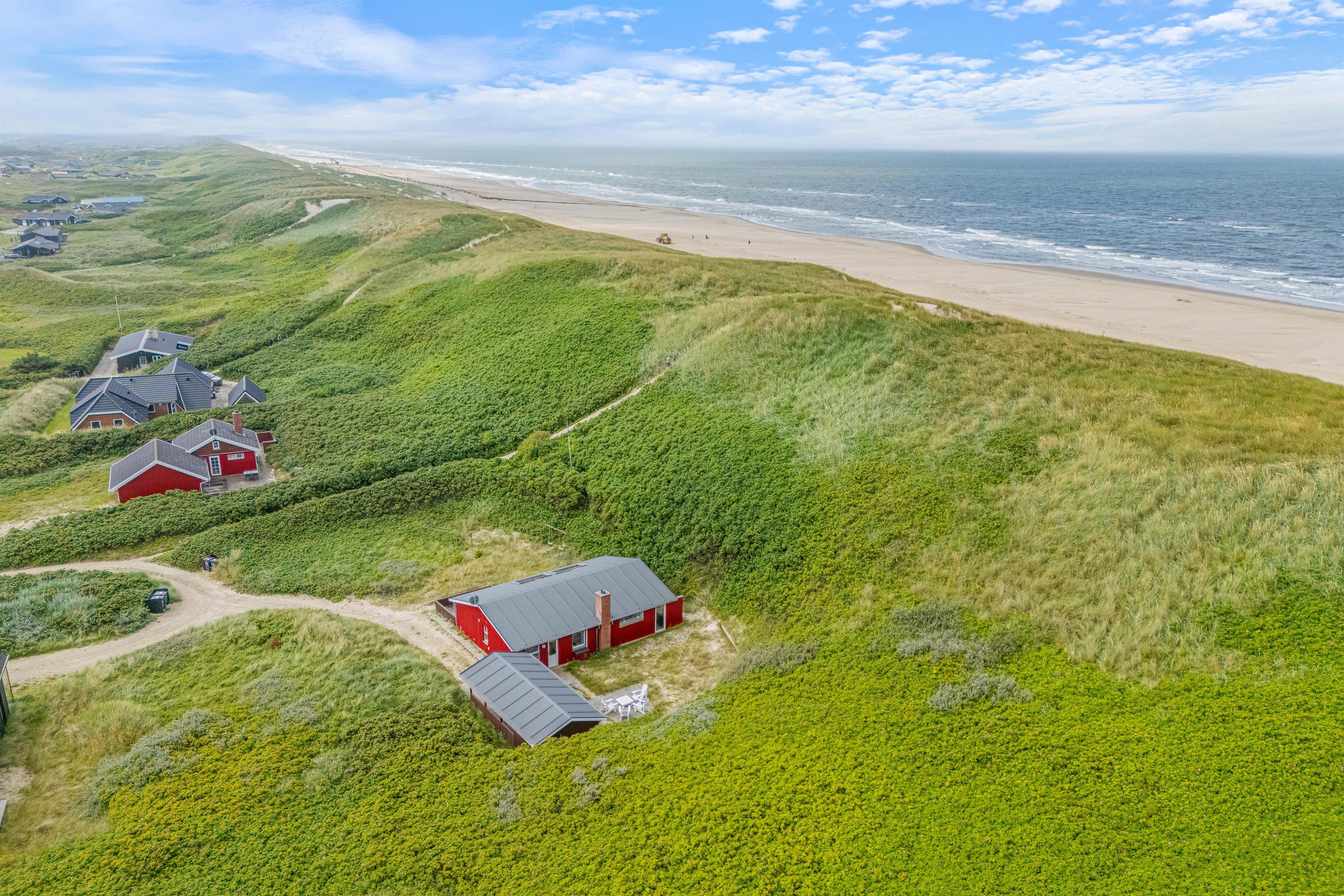 This Årgab holiday home impresses not only with its interior but also its outstanding location directly behind the dune. A path by the house leads you straight over the dune down to the beach. This proximity to the wild beauty of the beach allows you to feel the sand beneath your feet, hear the surf, and breathe in the fresh sea air whenever you wish. The fantastic location enables you to be inspired daily by the surrounding beauty and fully enjoy the freedom of beach living. The terrace is a wonderful spot to appreciate the fresh sea air and natural surroundings. It offers plenty of space for relaxed outdoor hours, whether enjoying breakfast al fresco or a cosy evening dinner overlooking the dune landscape. Due to the immediate proximity to the dunes, you may find a fine layer of sand on the terrace, lending it an authentic and natural charm that serves as a constant reminder of your closeness to the beach and rugged coastal beauty.