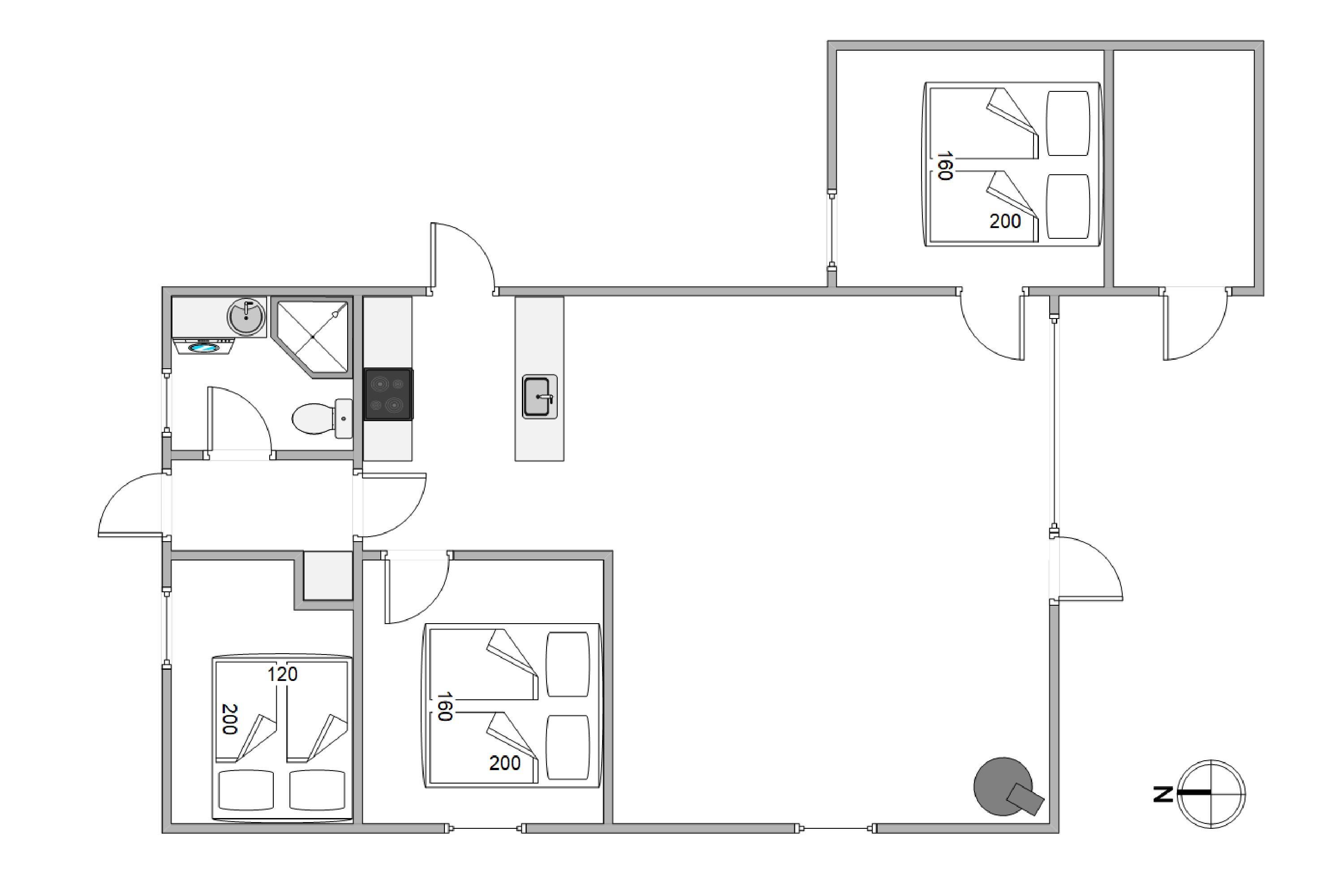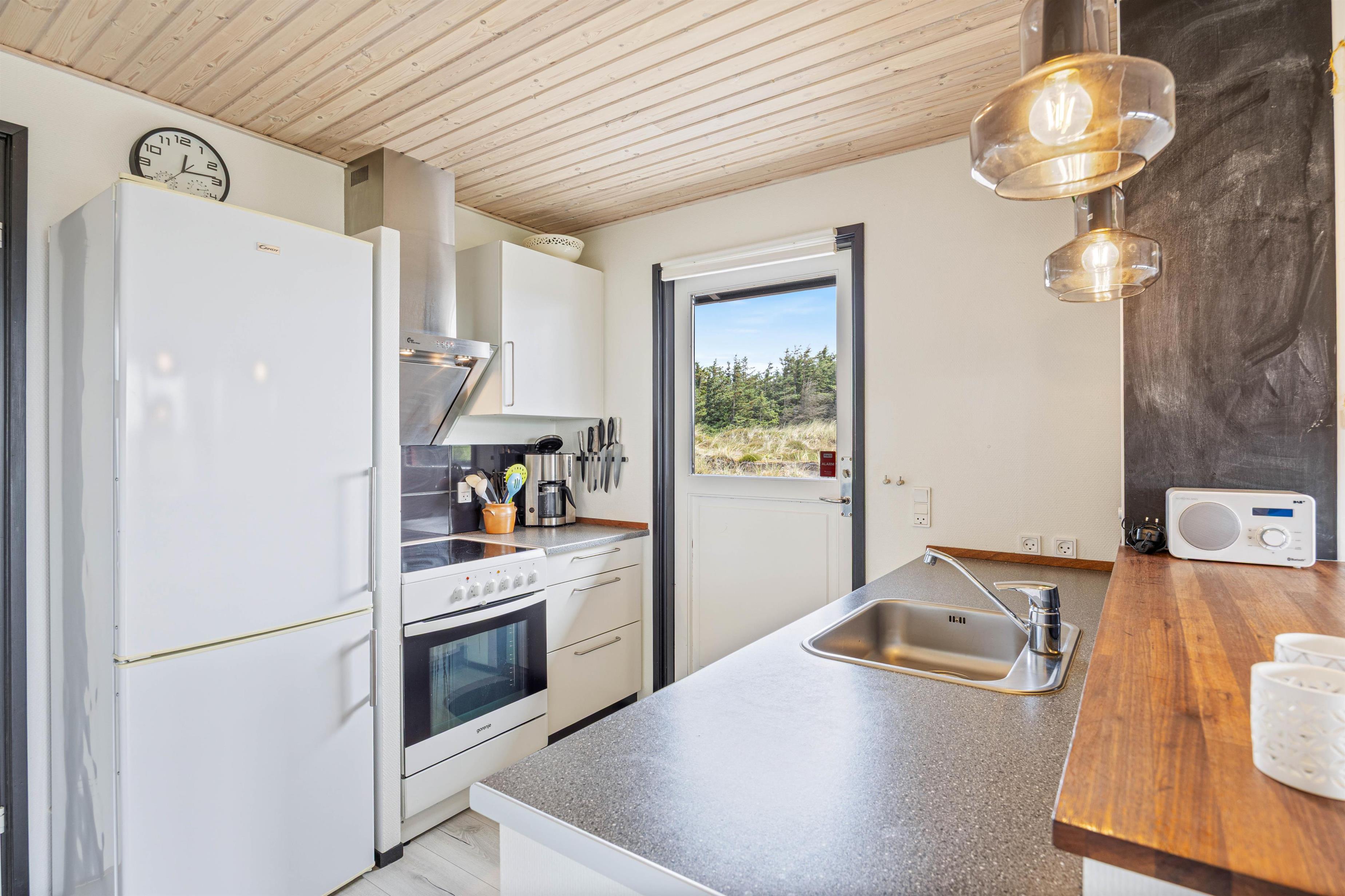 Upon entering the holiday home, you'll immediately feel the cosy comfort emanating from the wood-burning stove in the living room and the welcoming furnishings. The warm laminate flooring complements the homely atmosphere and continues through to the bedrooms. The three bedrooms comfortably accommodate up to five people, ensuring a restful night's sleep. The open-plan kitchen, adjoining the living and dining area, is perfectly equipped for daily needs. It features a dishwasher, an 80-litre freezer, and an oven with a ceramic hob. The kitchen also provides direct access to the spacious natural grounds. During the cooler months, an energy-efficient heat pump, along with underfloor heating in the bathroom, ensures comfortable warmth throughout.