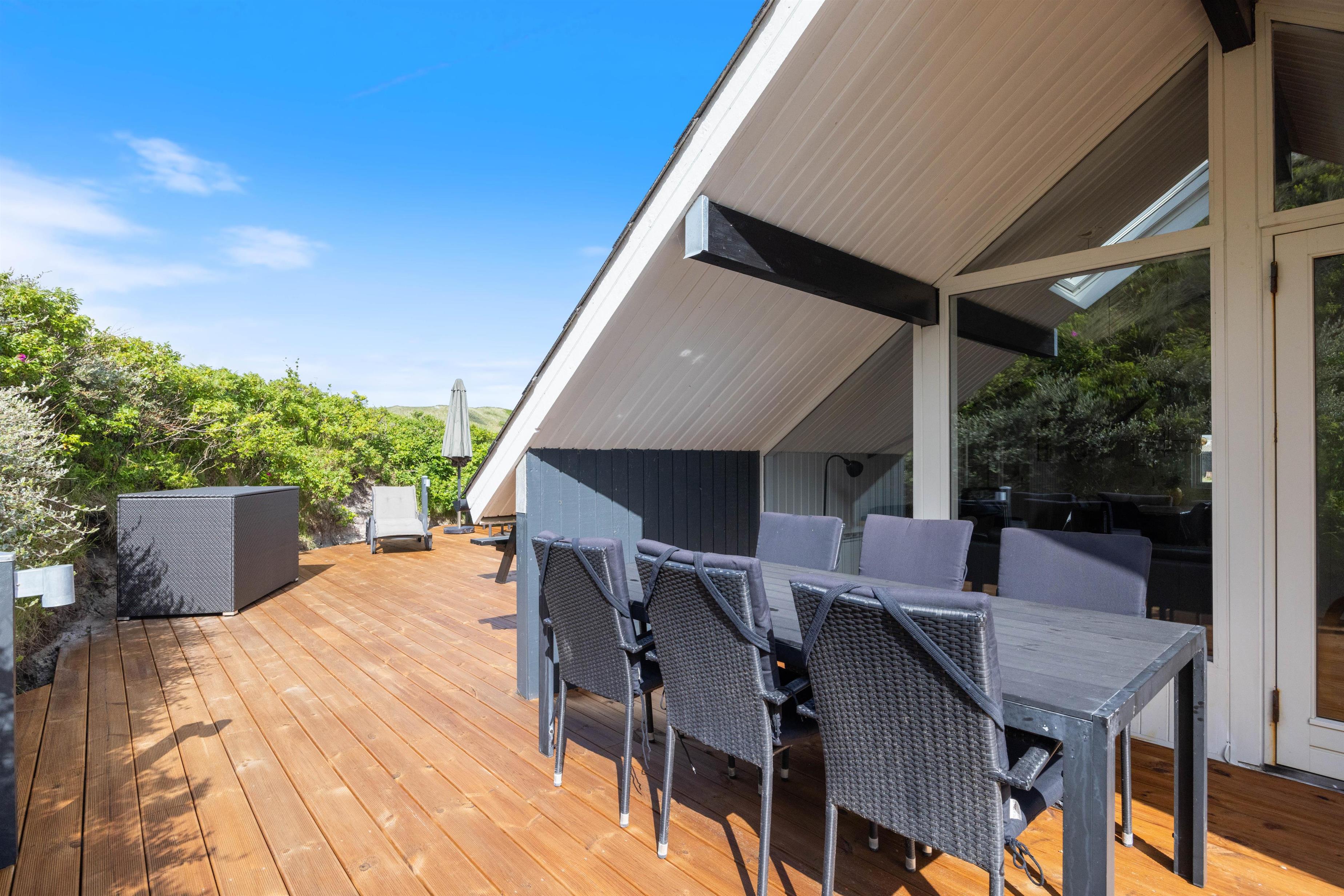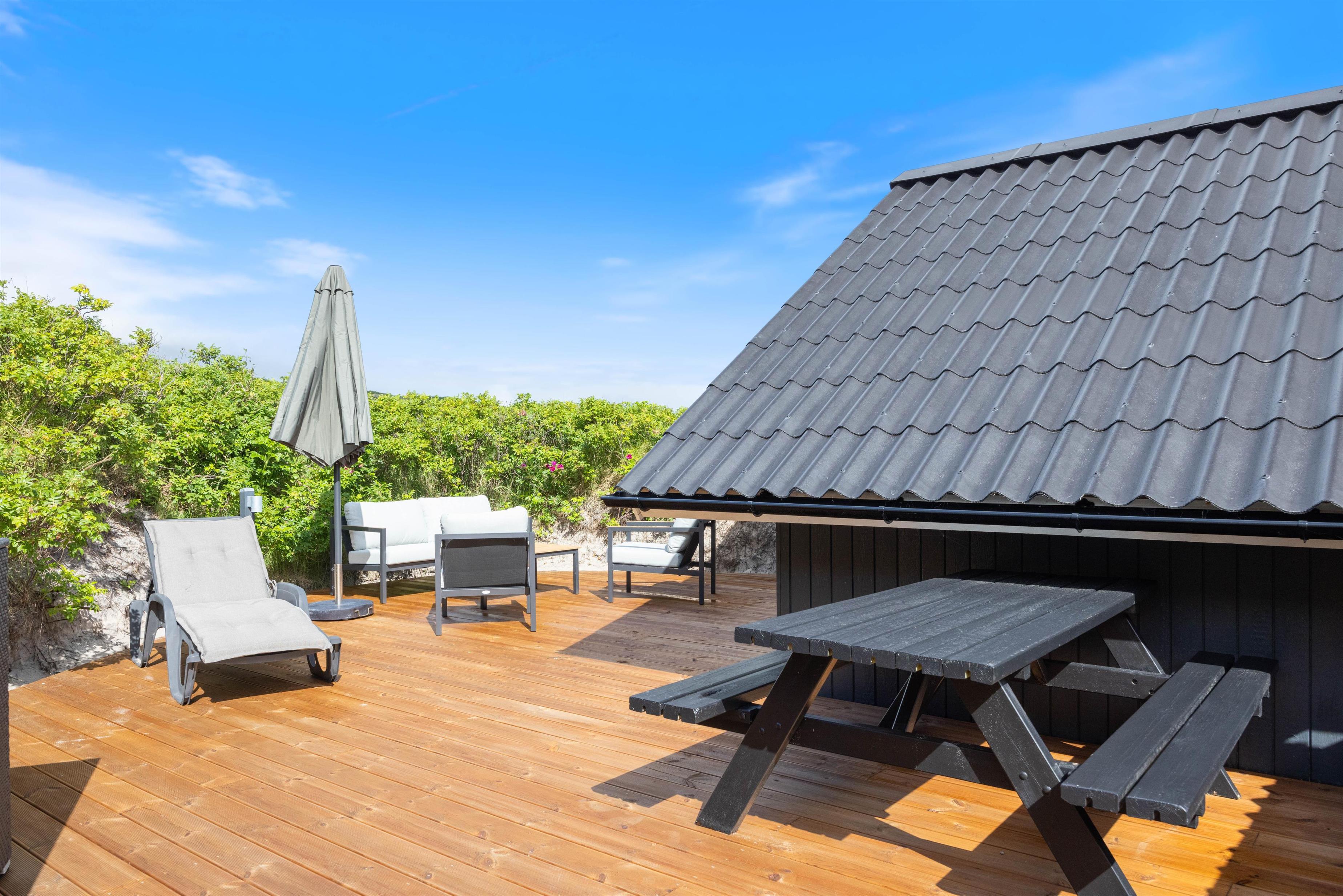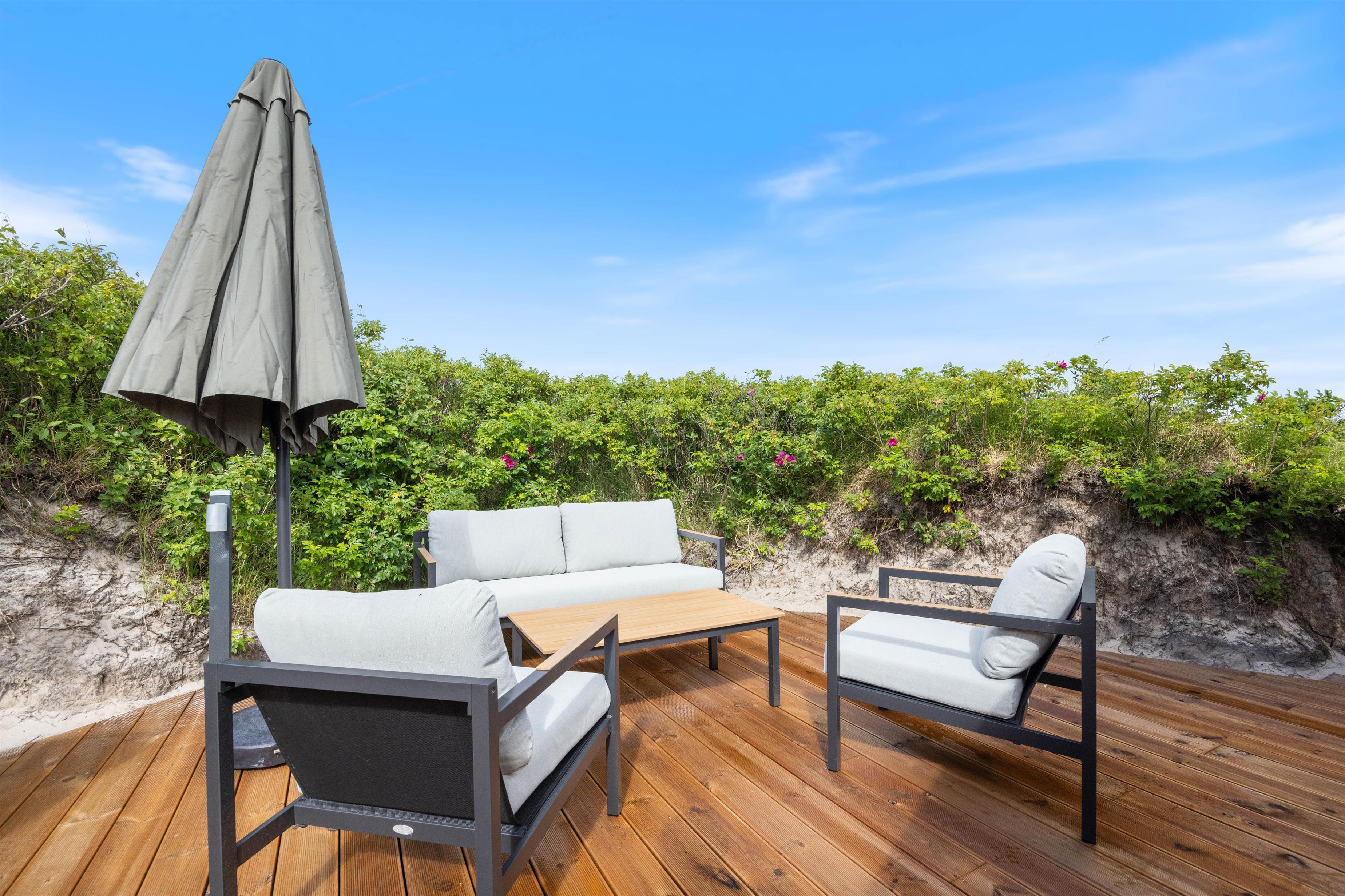 The enclosed terrace is partially covered – ensuring you'll always find the perfect spot to relax. Unwind in the comfortable garden furniture while the children explore the large natural grounds. In the evening, fire up the barbecue and enjoy your dinner on the terrace. If you're feeling energetic, climb the tall dunes to experience the unique sunset over the North Sea.