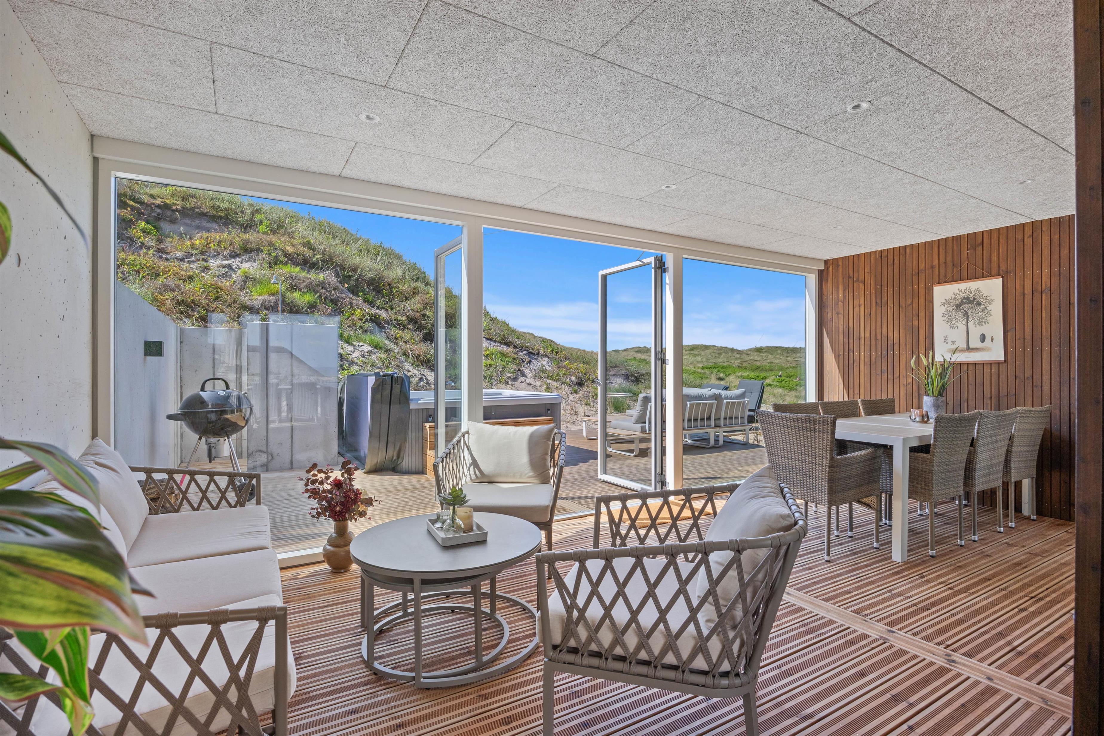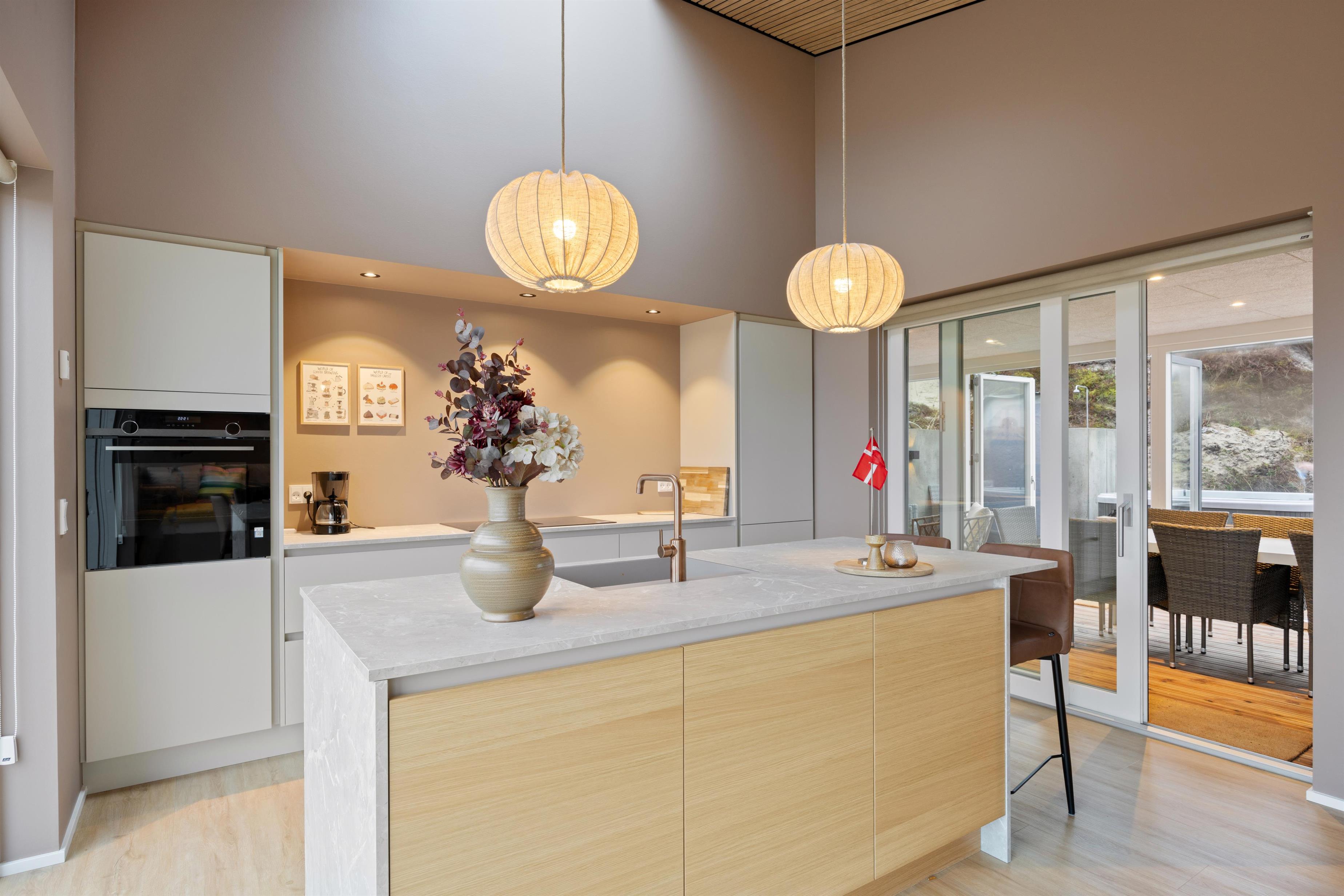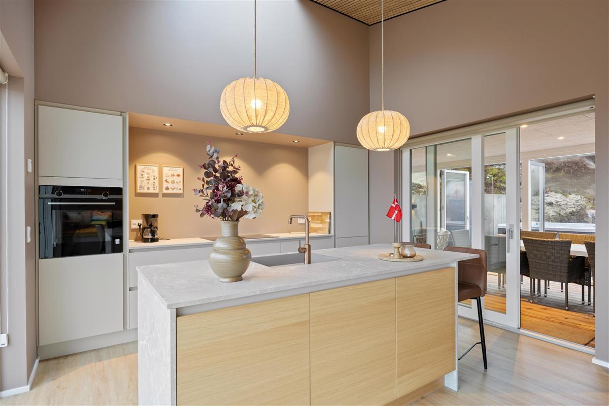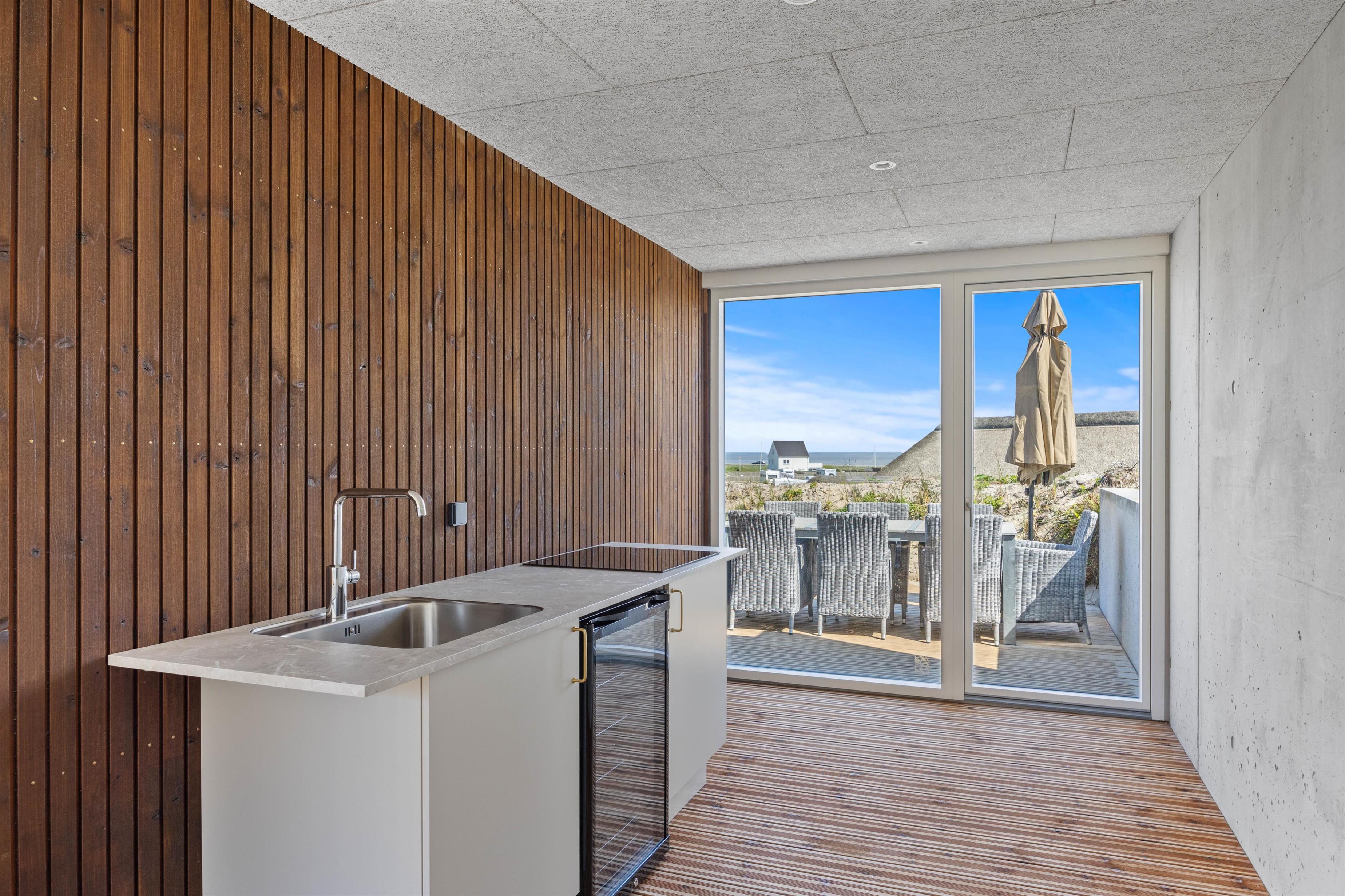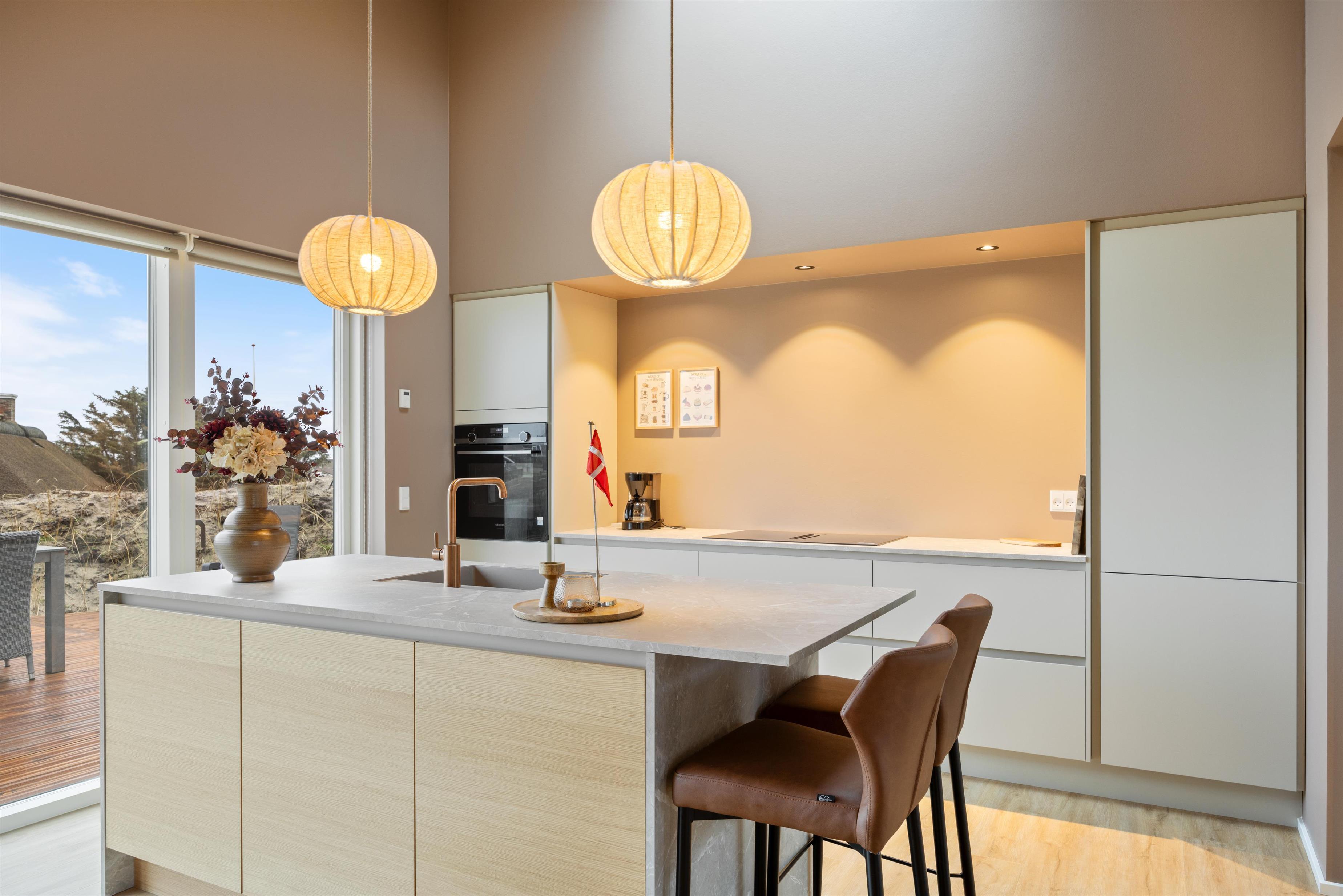 After a relaxing day at the beach, you can prepare and enjoy meals outdoors year-round under the covered terrace or in the conservatory, which features not only comfortable dining furniture but also a second cooking area complete with wine cooler and sink. Let yourself be enchanted by the impressive panoramic views of Ringkøbing Fjord visible throughout the holiday home.