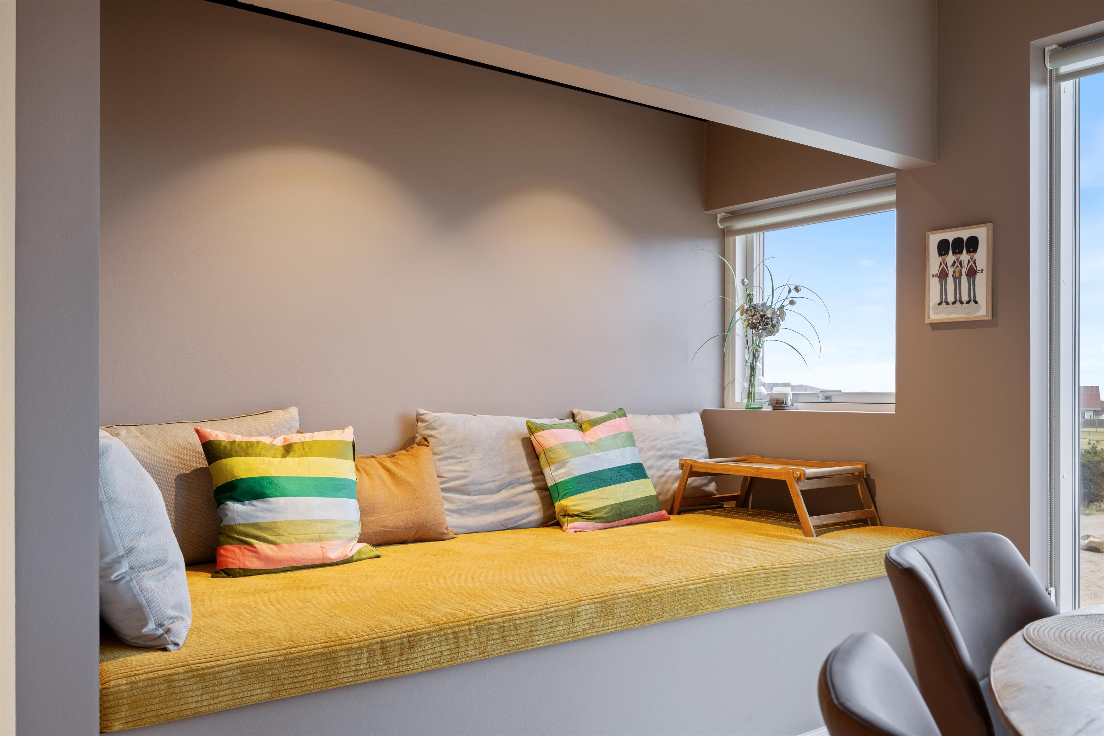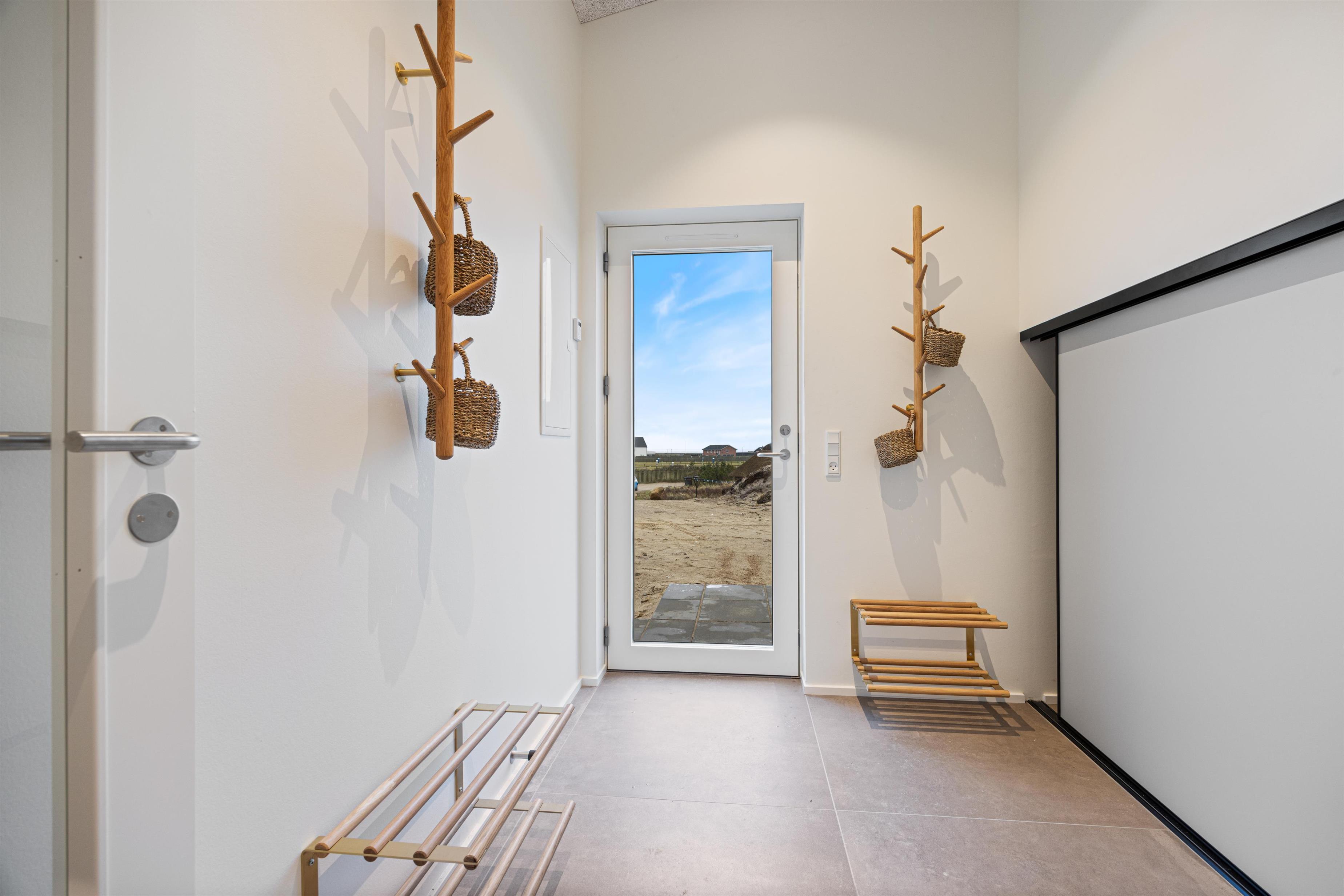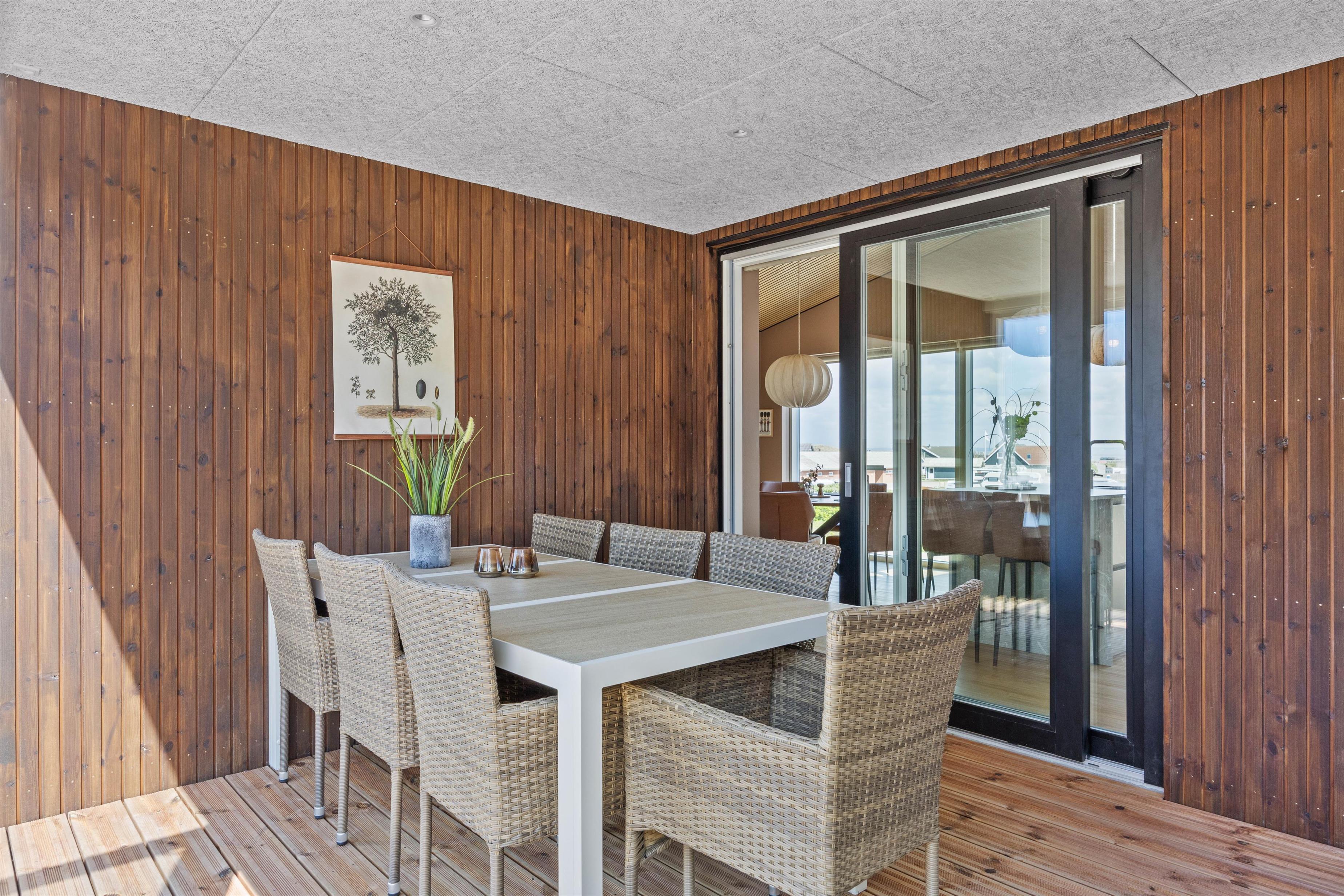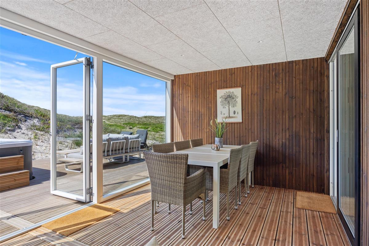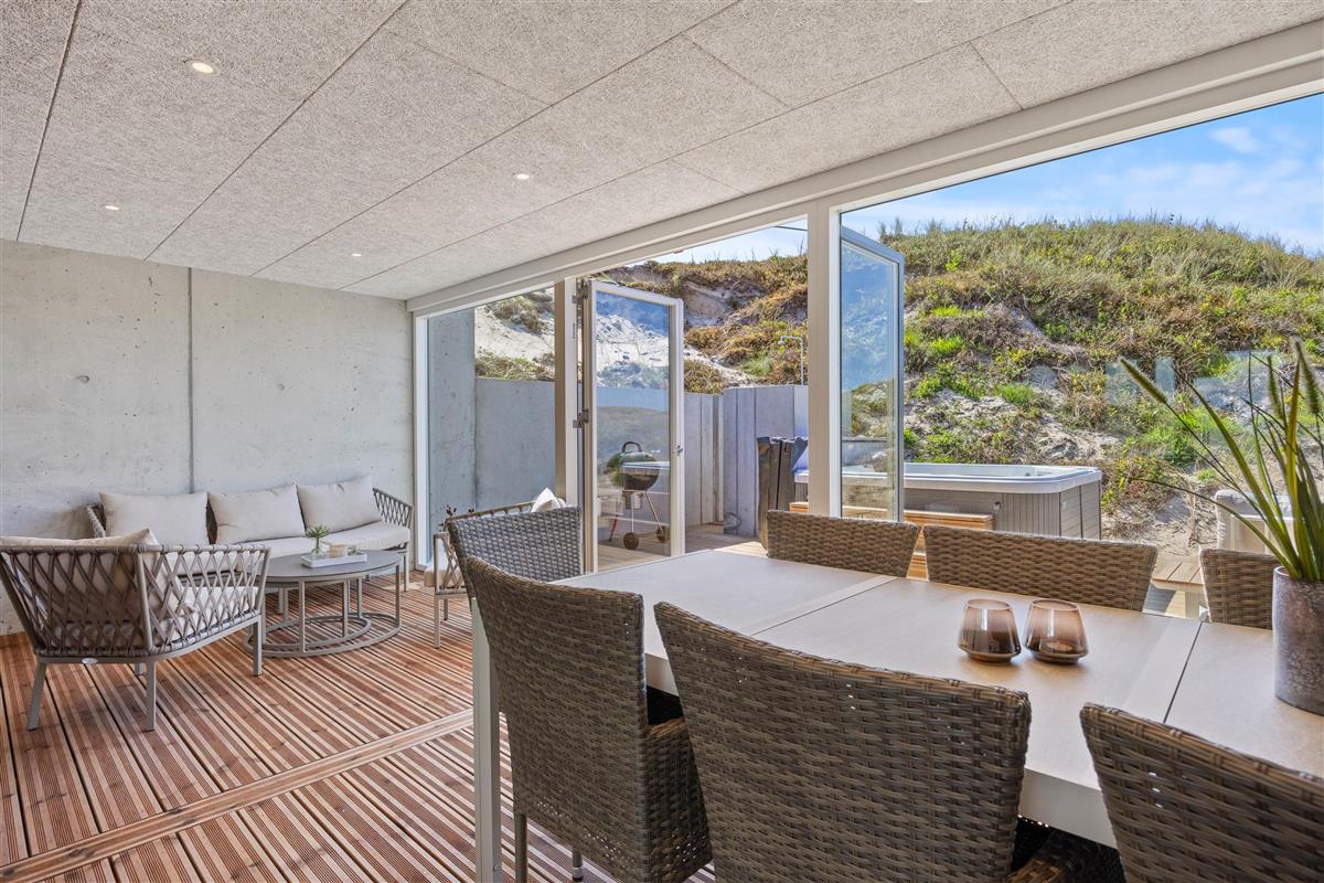 After a relaxing day at the beach, you can prepare and enjoy meals outdoors year-round under the covered terrace or in the conservatory, which features not only comfortable dining furniture but also a second cooking area complete with wine cooler and sink. Let yourself be enchanted by the impressive panoramic views of Ringkøbing Fjord visible throughout the holiday home.