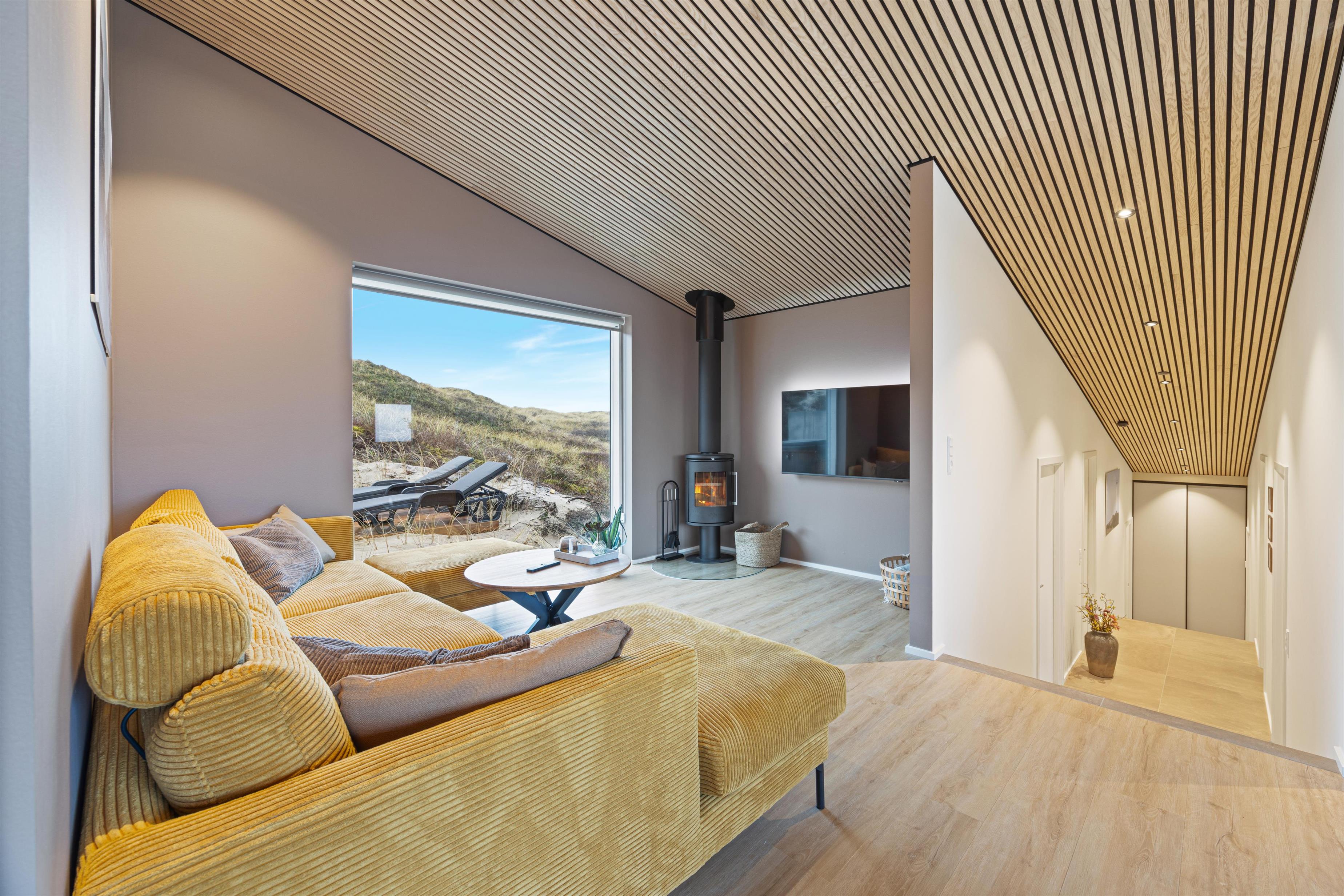 The modern architecture of this holiday home, built in 2025, is instantly captivating. Four tastefully furnished bedrooms offer supreme comfort, with two cosy double beds and four single beds ensuring restful sleep for all guests. The wood-burning stove in the living room creates incomparable moments of cosiness as you listen to the crackling flames. Underfloor heating throughout the living area provides additional warmth. The spacious seating area offers everyone their own favourite spot to relax.