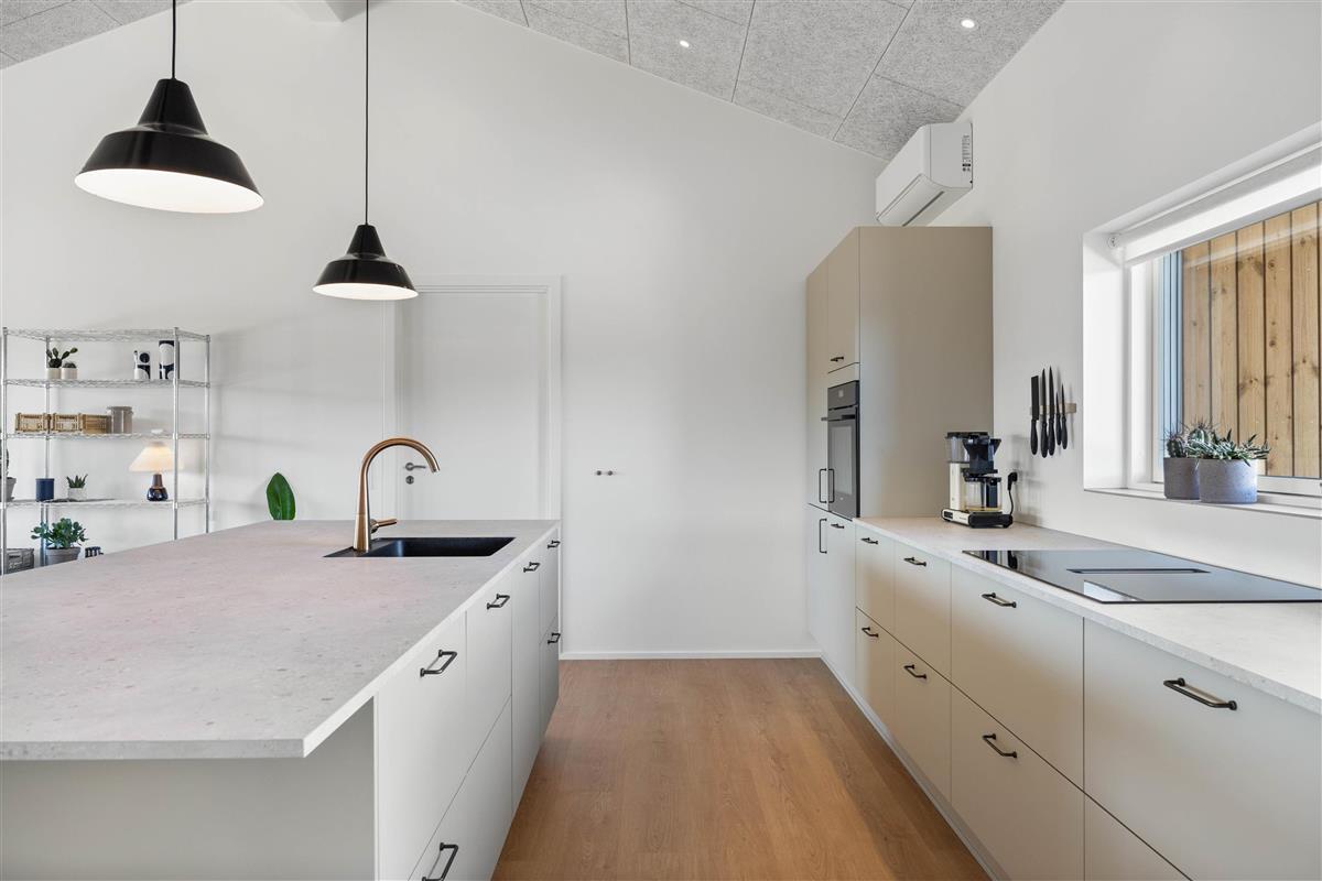 Upon entering, you're welcomed by a light-filled living space whose harmonious design instantly creates a sense of well-being. Large windows bring nature indoors, while the warm glow of the wood-burning stove creates a cosy atmosphere on cool evenings. Imagine settling into the comfortable sofa arrangement to read a good book or reflect on the day with your loved ones.