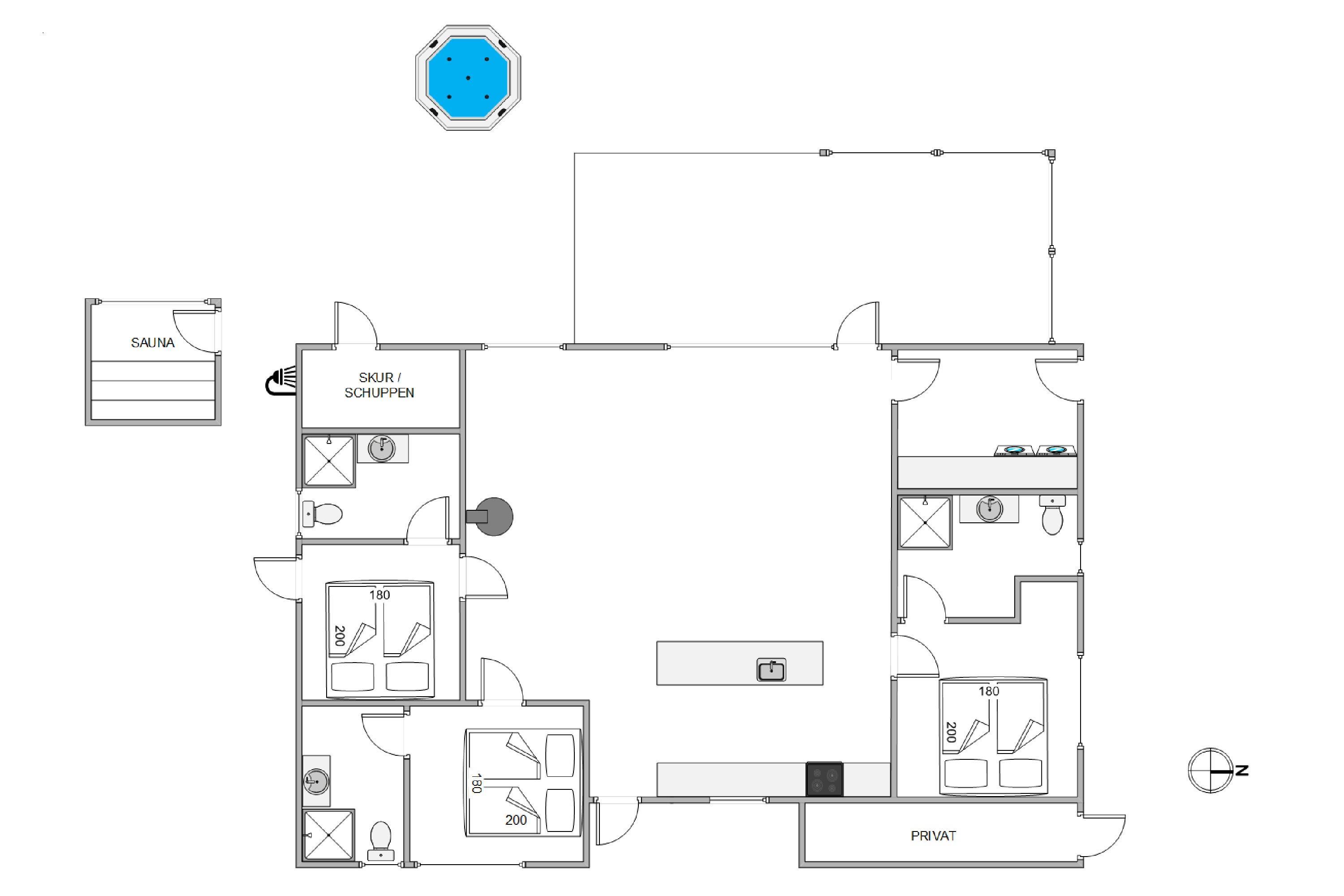 The holiday home opens onto an extensive natural plot of 2,388 square metres. On the enclosed terrace, you can relax in privacy, while the open winter garten invites you to enjoy the outdoors even during brief summer showers. Imagine starting your day with breakfast in the morning sun or ending your evening in the outdoor sauna and hot tub, surrounded by nature's expanse.