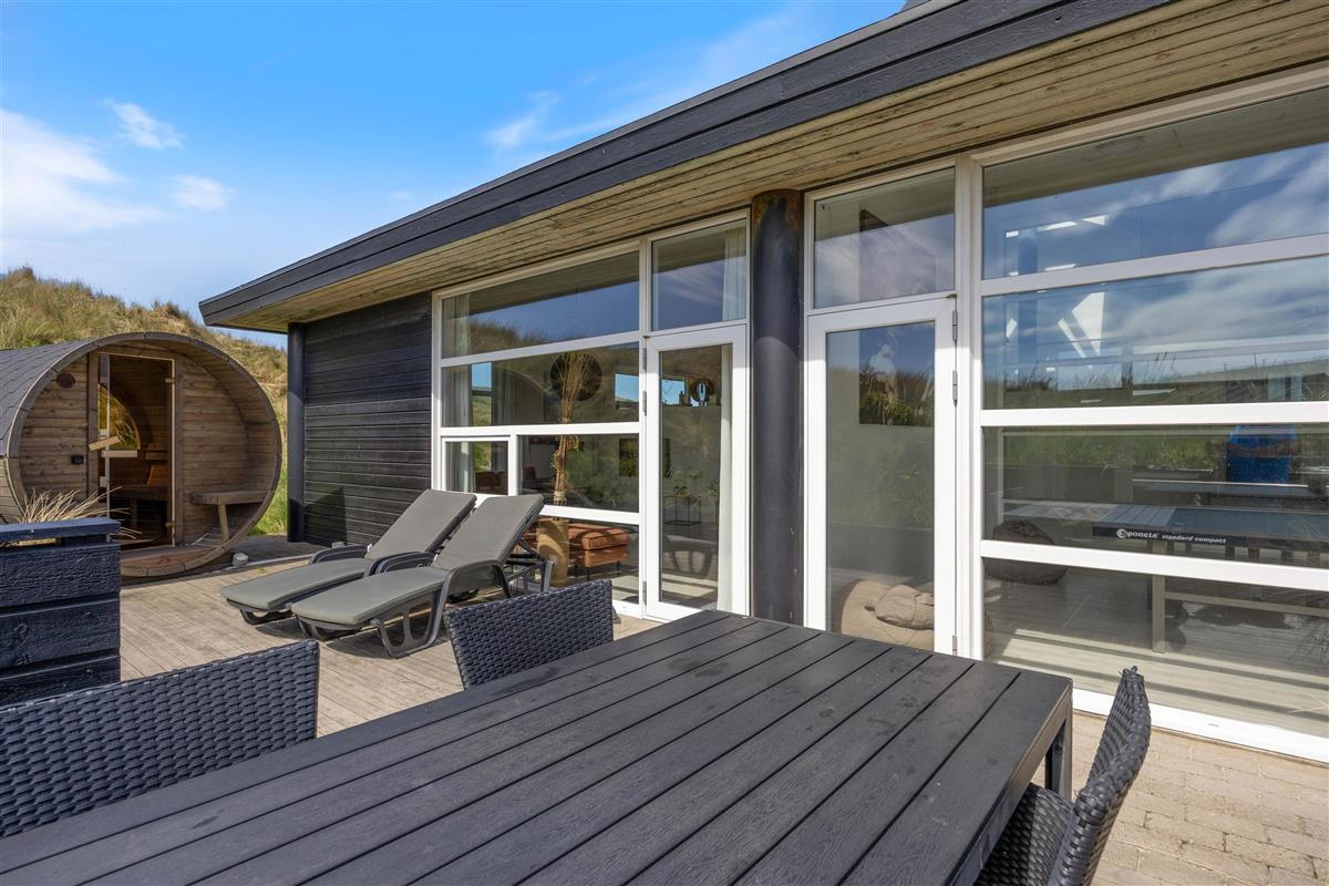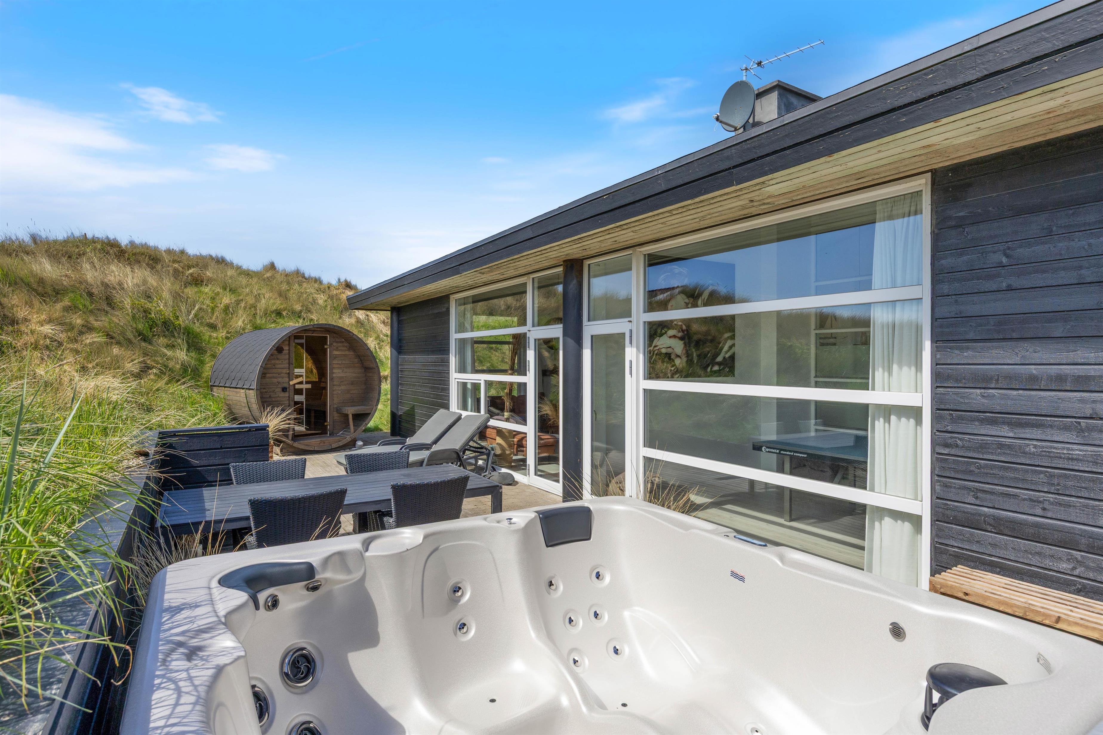 This beautiful holiday home in Årgab, located at Tingodden 391, offers 180 square metres of living space for up to 8 people. Comprehensively renovated in 2021, it features 4 comfortable bedrooms, 2 modern bathrooms and a spacious living area with wood-burning stove. Just 150 metres from the beach, this is the ideal location for families, friends or couples. Amenities include a fully equipped kitchen with dishwasher and 90-litre freezer, washing machine, tumble dryer and an electric car charging point. An outdoor hot tub, outdoor sauna and table tennis table complete the impressive facilities in this activity-focused holiday home. Your dog is also welcome to enjoy the 1,840-square-metre dune plot.