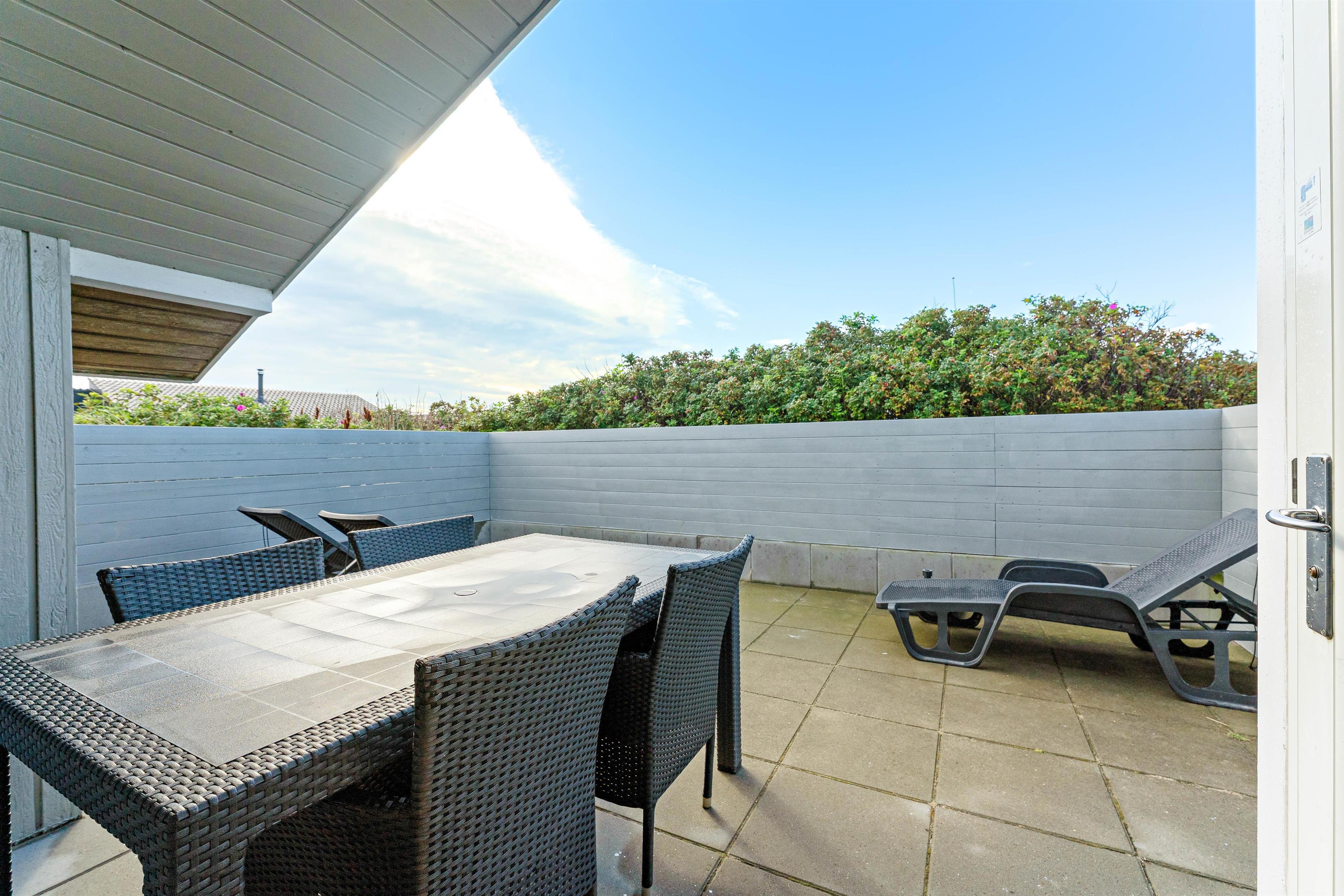 The holiday home features multiple terraces - an east-facing terrace protected from westerly winds, and a south-facing terrace that is partially enclosed and partially covered.