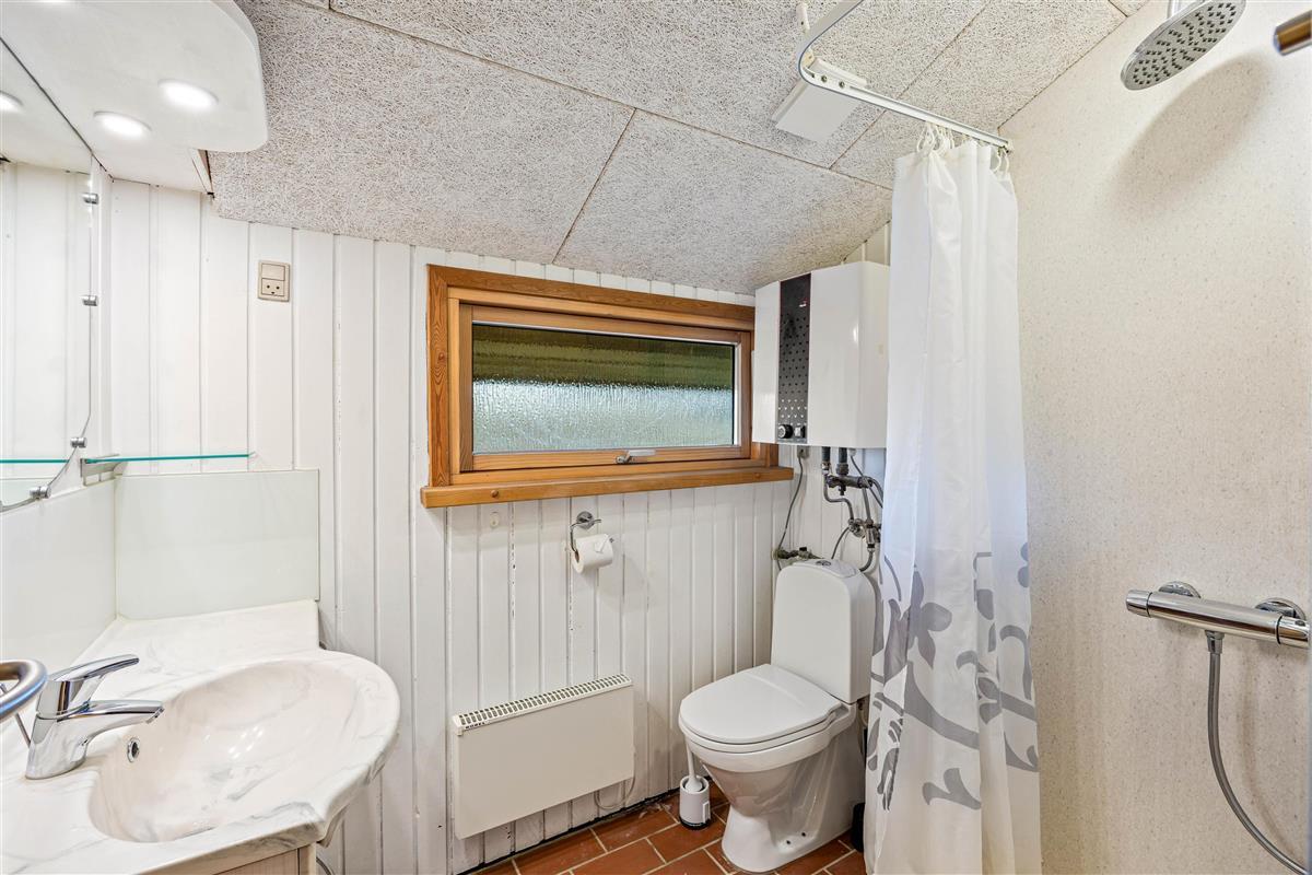 The bathroom features underfloor heating, a shower enclosure, and access to the holiday home's private sauna. After a long beach walk, you can warm up in the sauna for a perfectly relaxing end to your day.