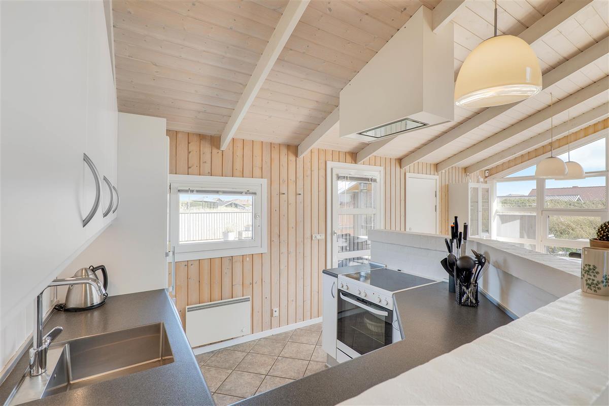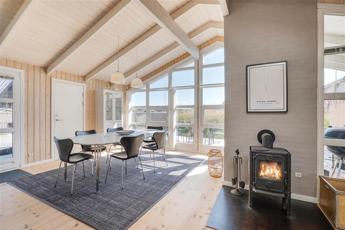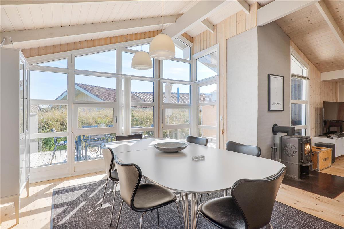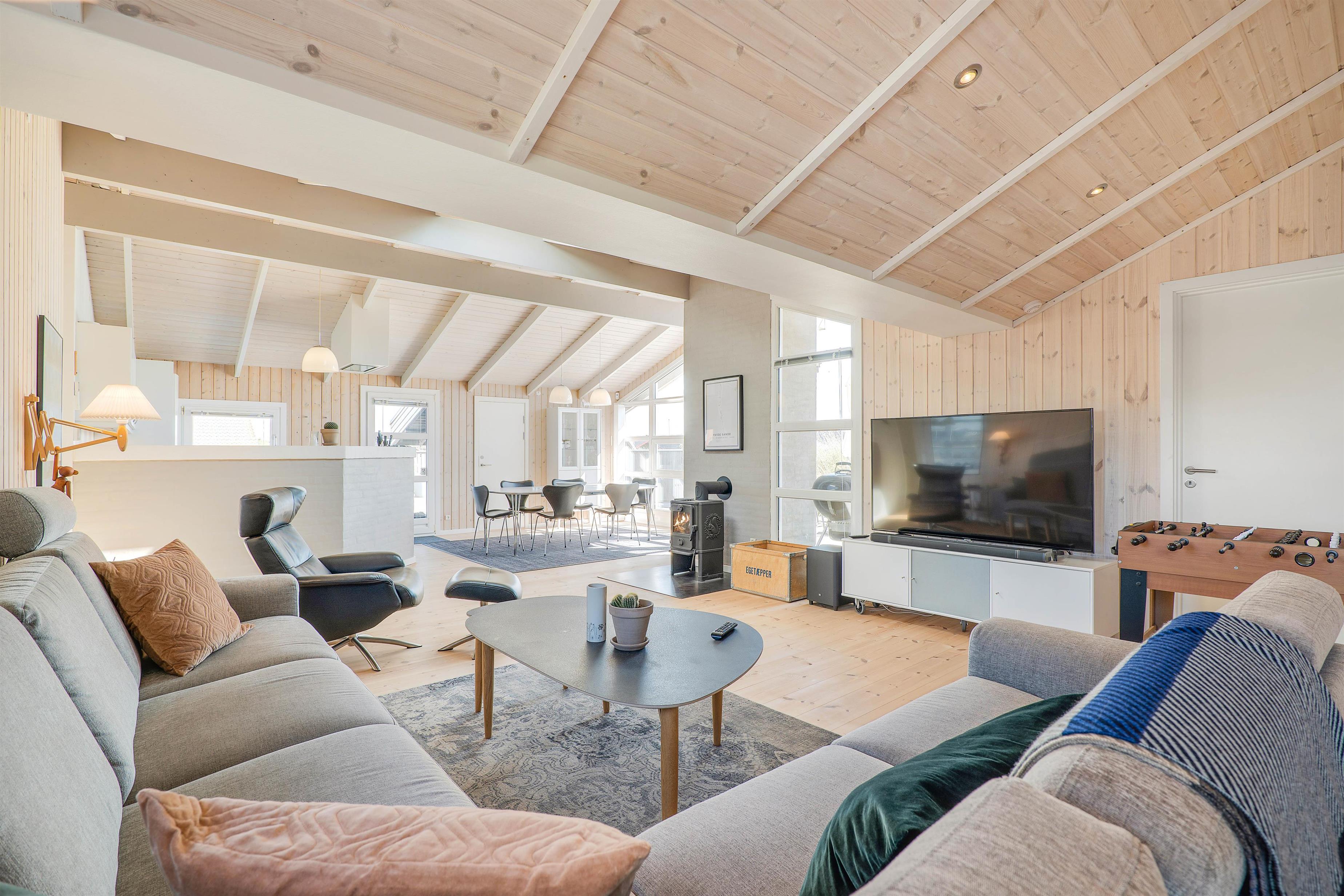 This holiday home is designed for togetherness. The open-plan kitchen connects directly to the living area, allowing you to spend time together even while cooking and preparing your favourite meals. Enjoy delicious evening meals at the large dining table positioned by the holiday home's window front.