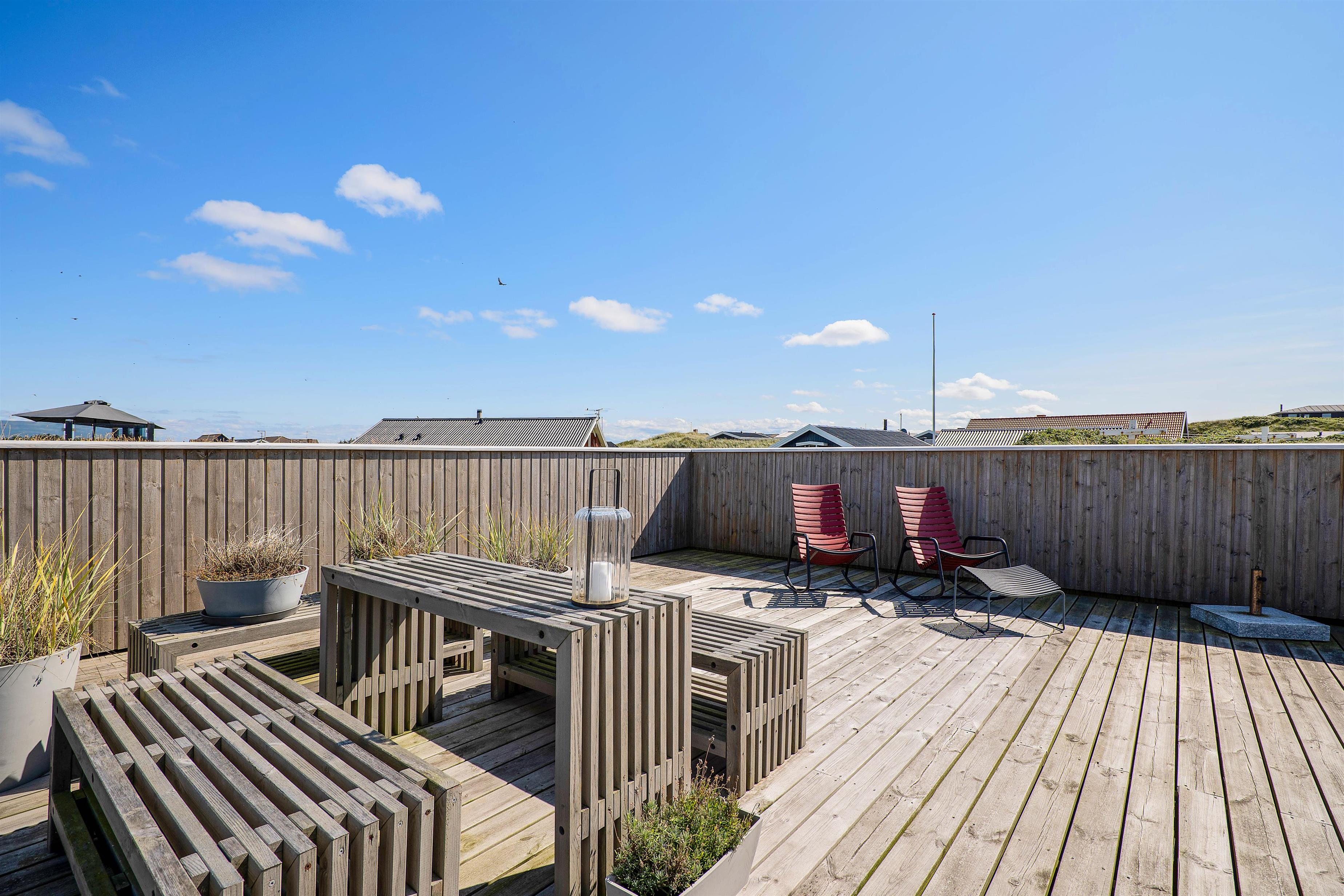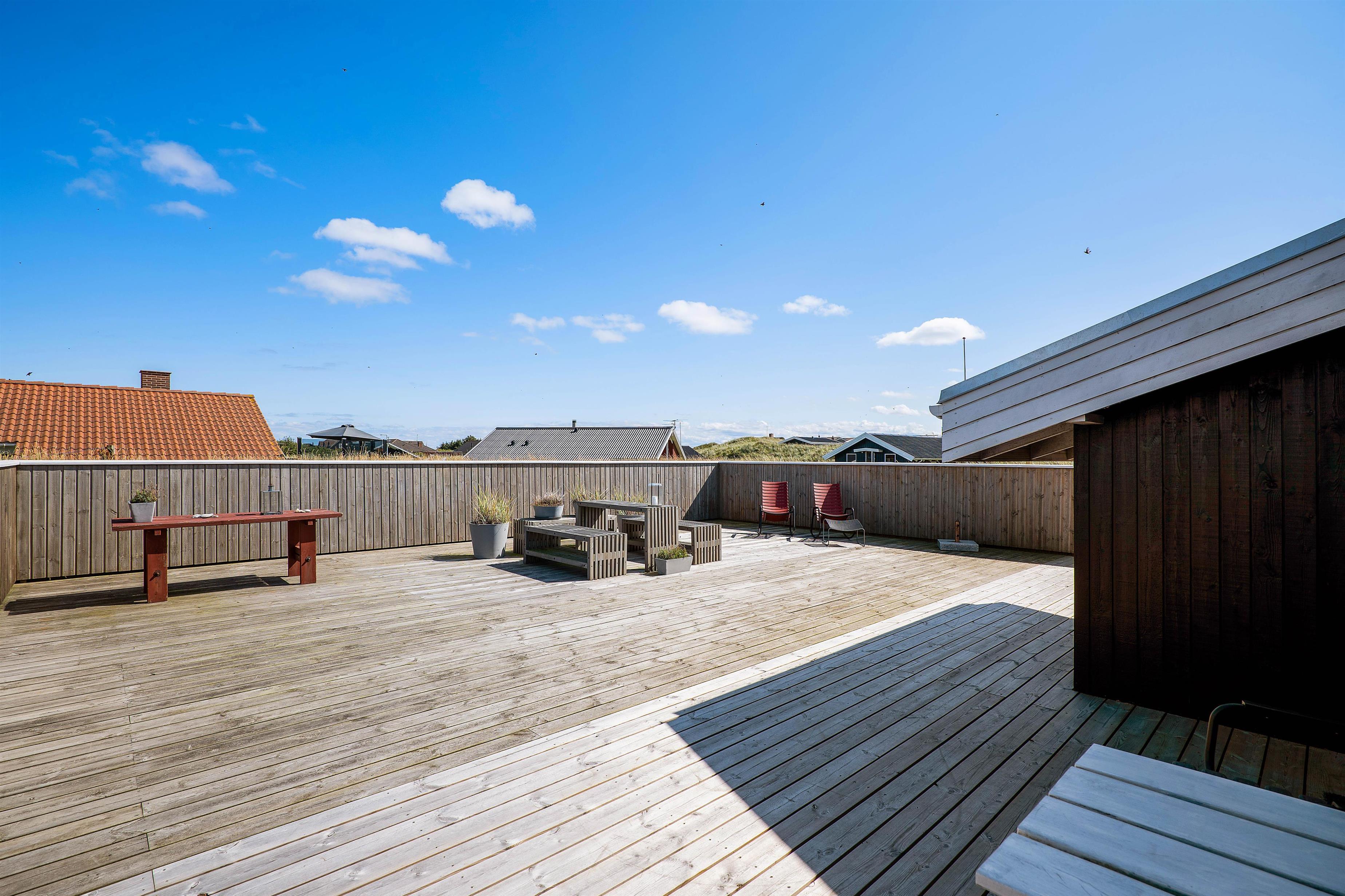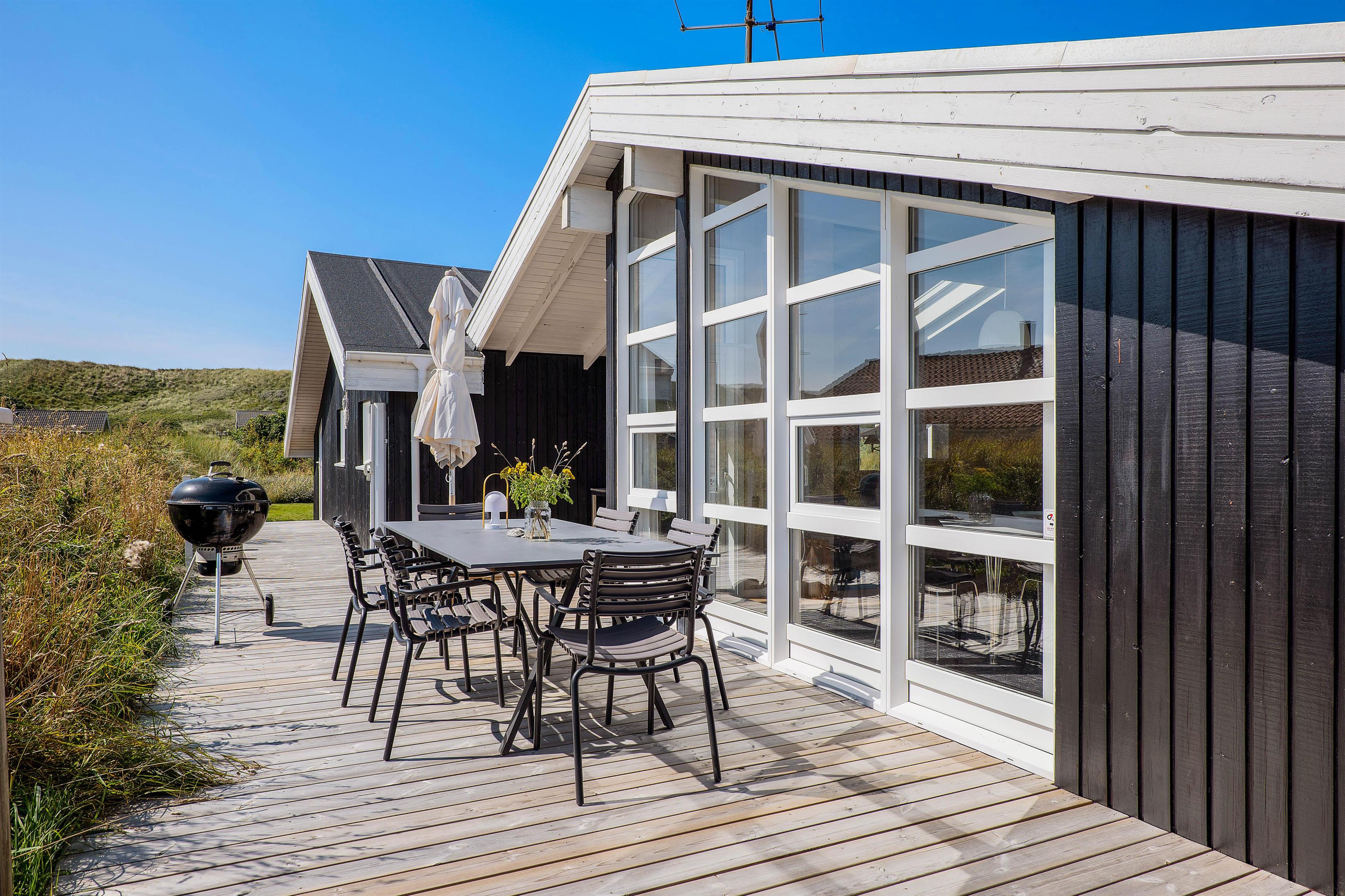 Listen to the sound of the nearby sea while enjoying the sunshine from comfortable garden furniture and sun loungers on the terrace. The large, partially screened wooden terrace wraps almost entirely around the house, allowing everyone to find their favourite spot and enjoy the sun throughout the day.