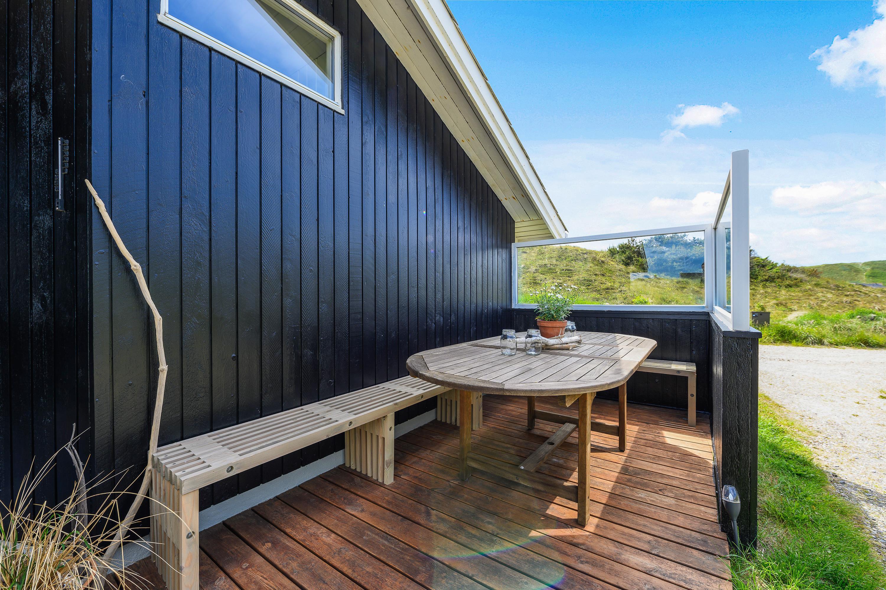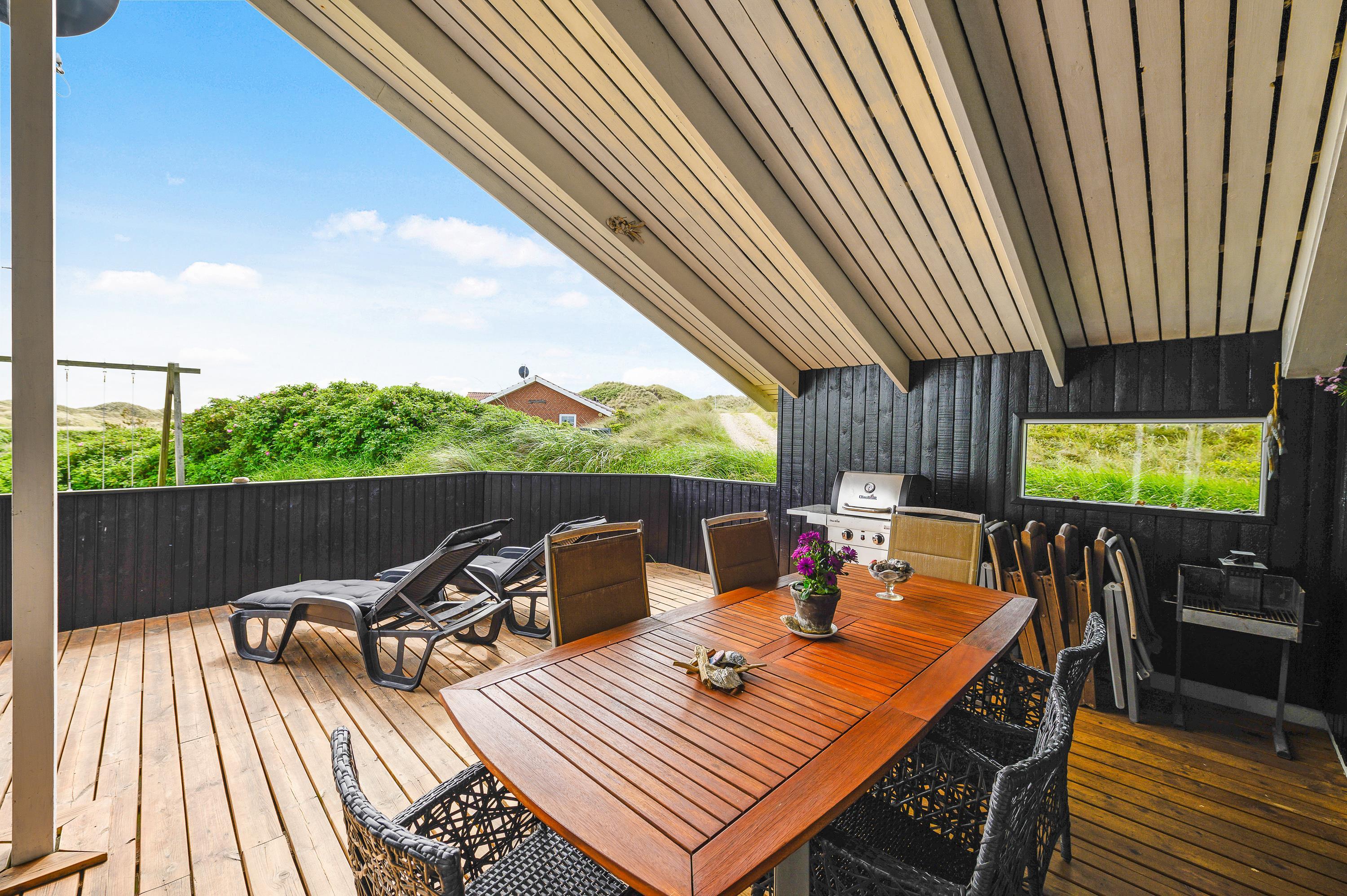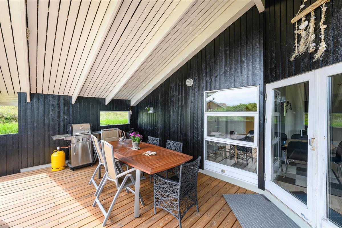 For warm summer days outdoors, there's a lovely wooden terrace that wraps almost entirely around the holiday home. You'll always find a sheltered spot here, as part of the terrace is covered. It's perfect for long summer evenings enjoying the natural surroundings.