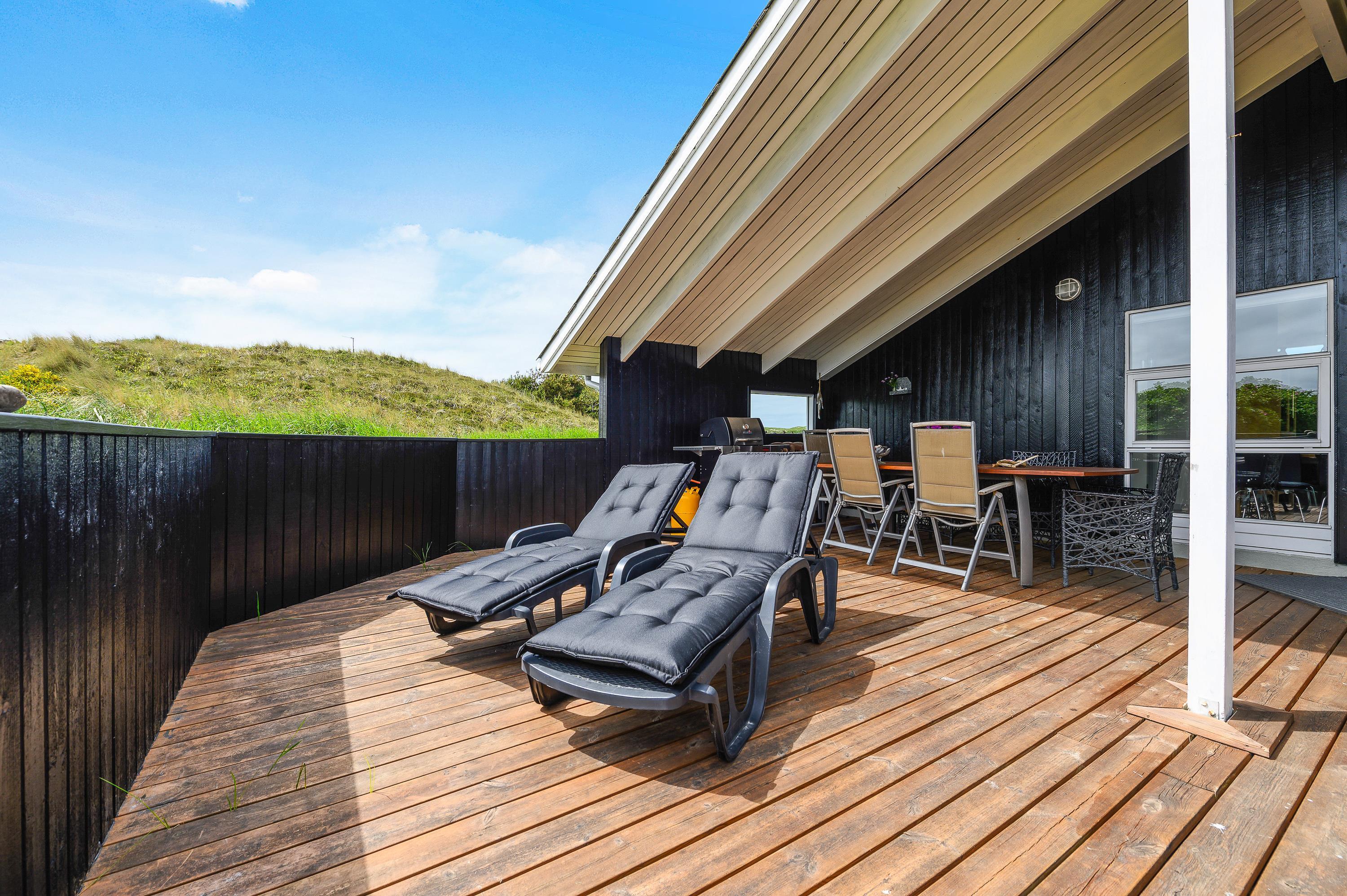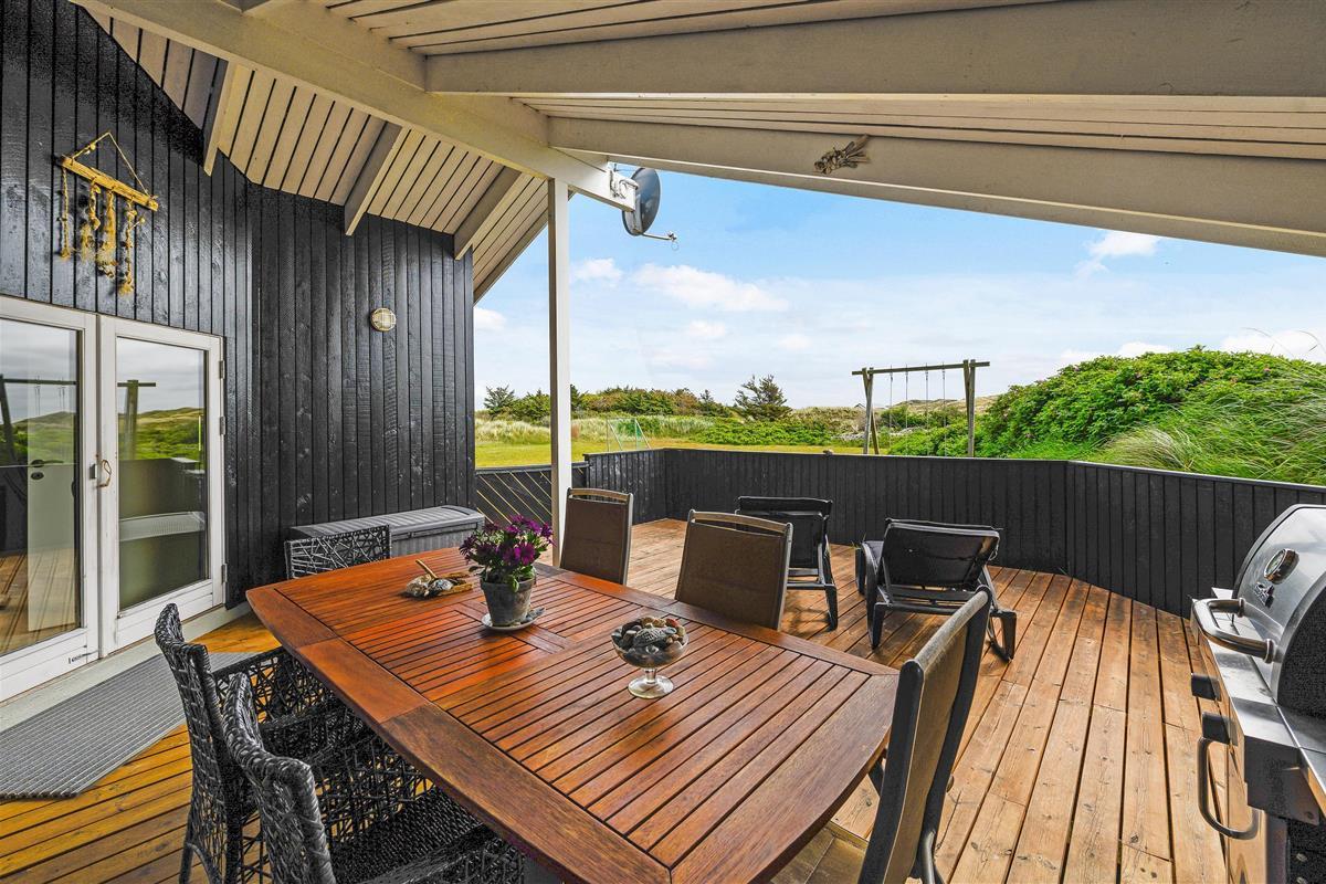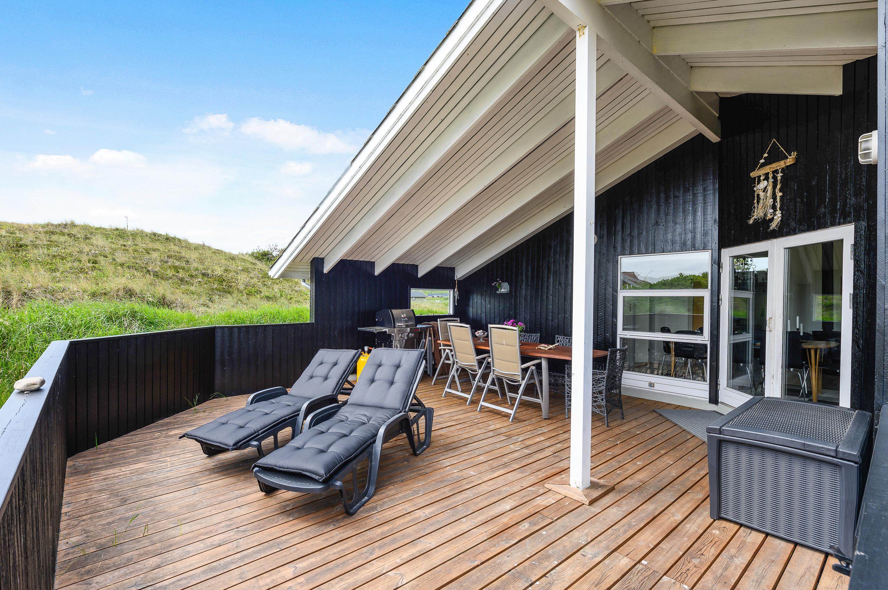 For warm summer days outdoors, there's a lovely wooden terrace that wraps almost entirely around the holiday home. You'll always find a sheltered spot here, as part of the terrace is covered. It's perfect for long summer evenings enjoying the natural surroundings.