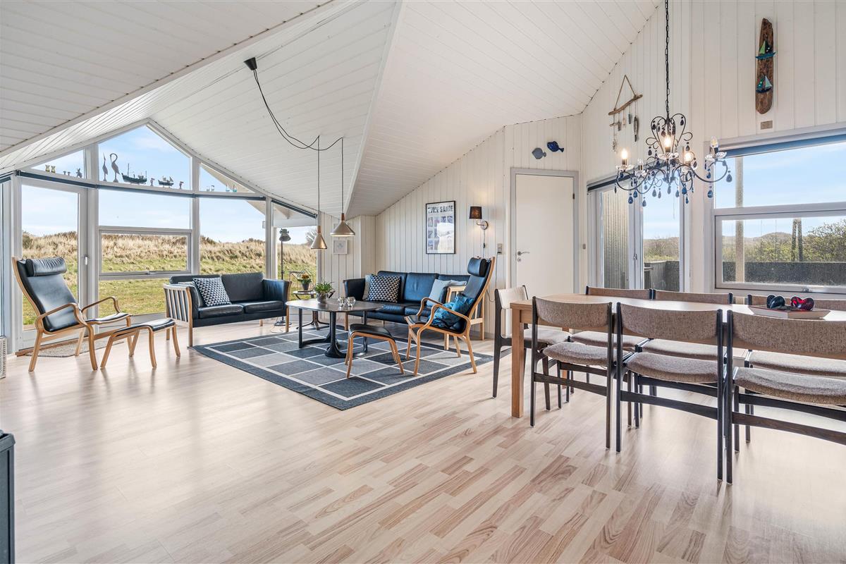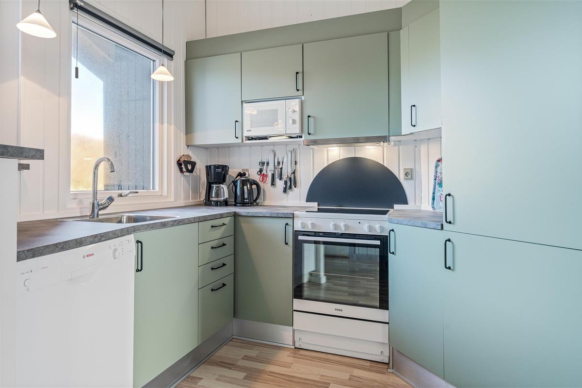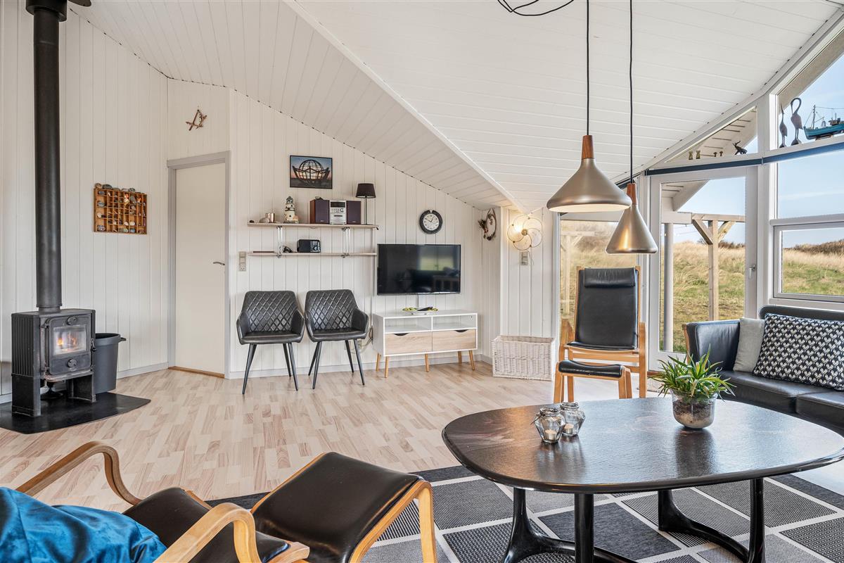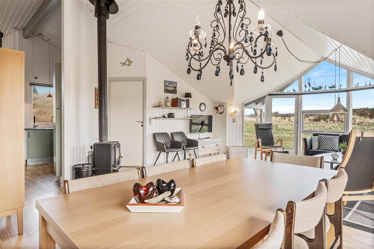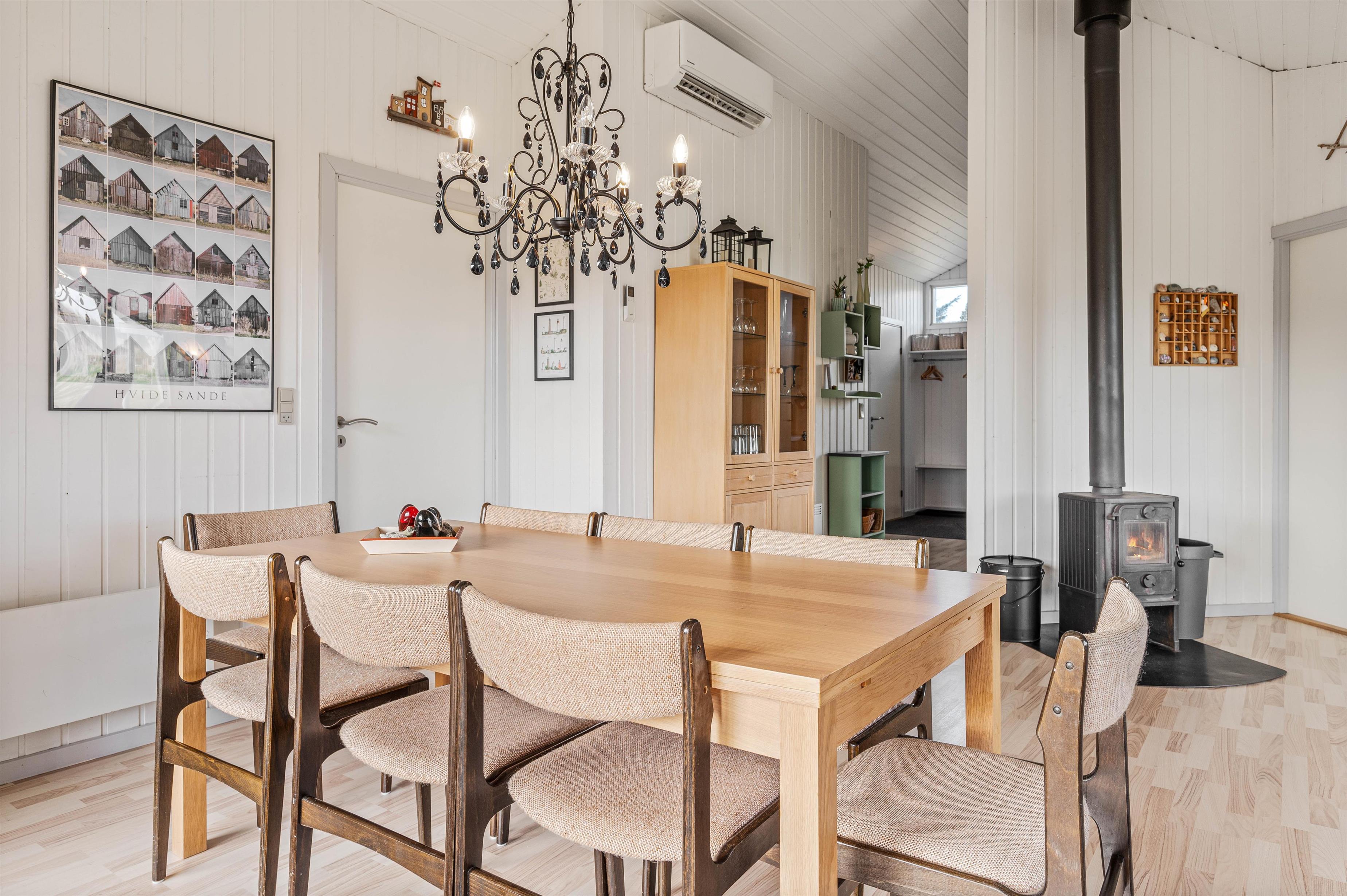 Your holiday home can be described as a beautifully appointed holiday home with excellent furnishings. The summer house features four bedrooms - three with double beds and one with two single beds - accommodating up to eight people in total. The bright and welcoming kitchen is open-plan, connecting to the living area and dining space.