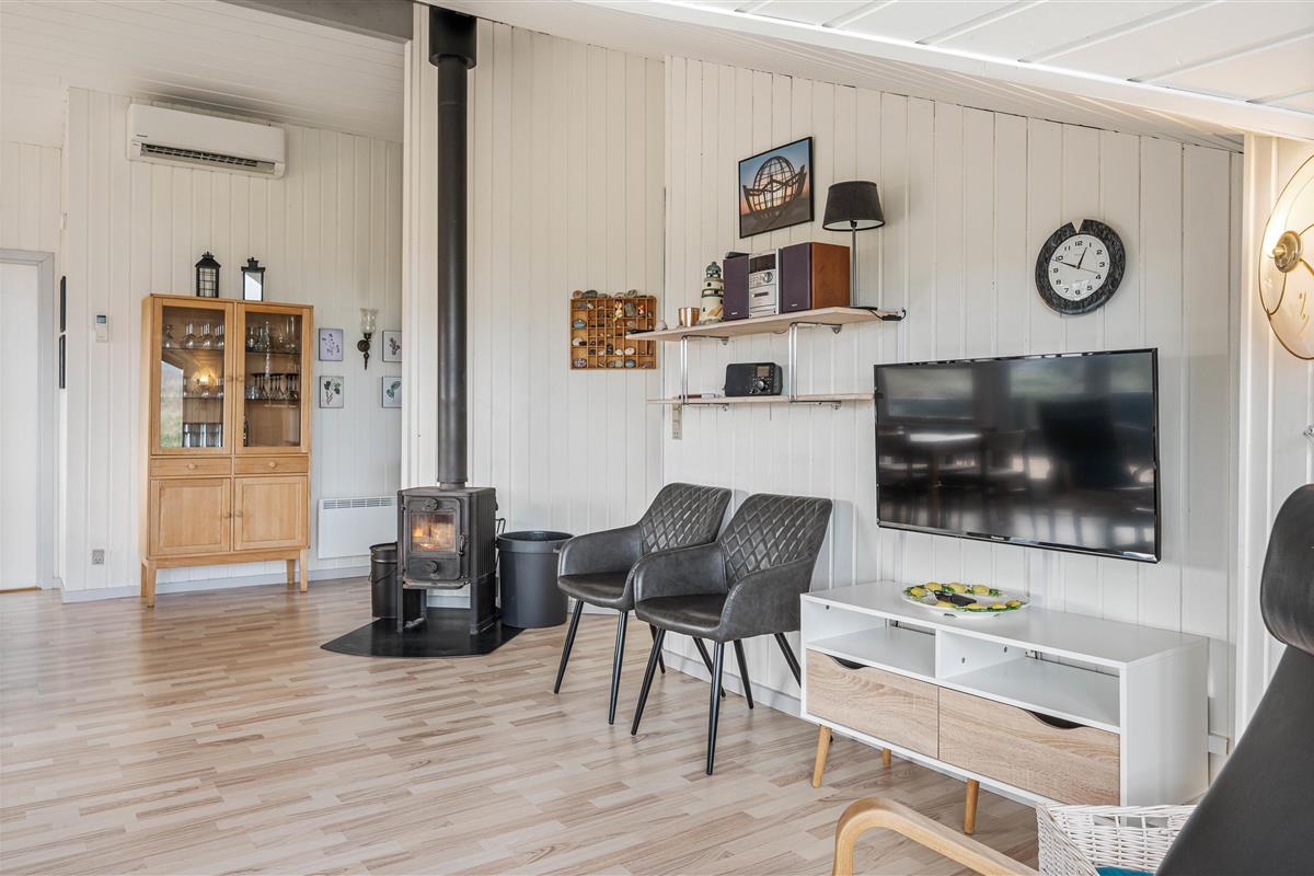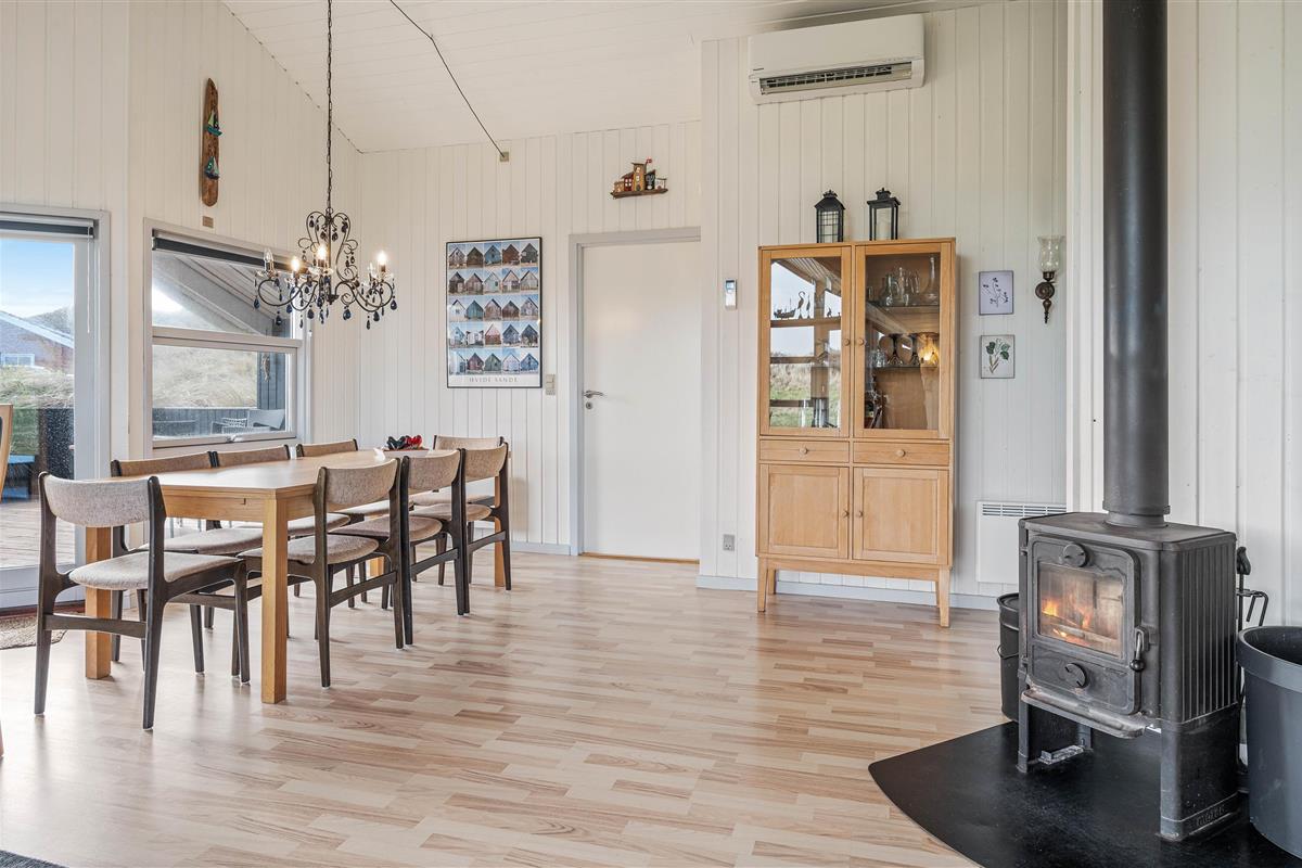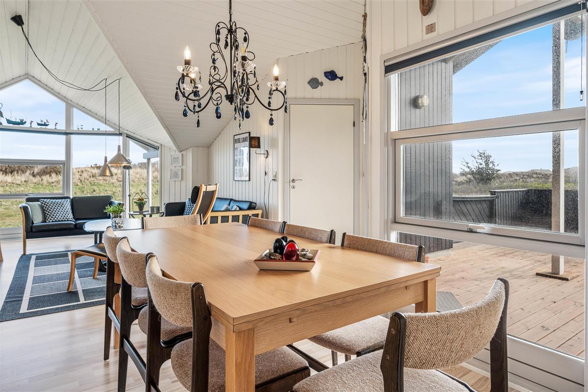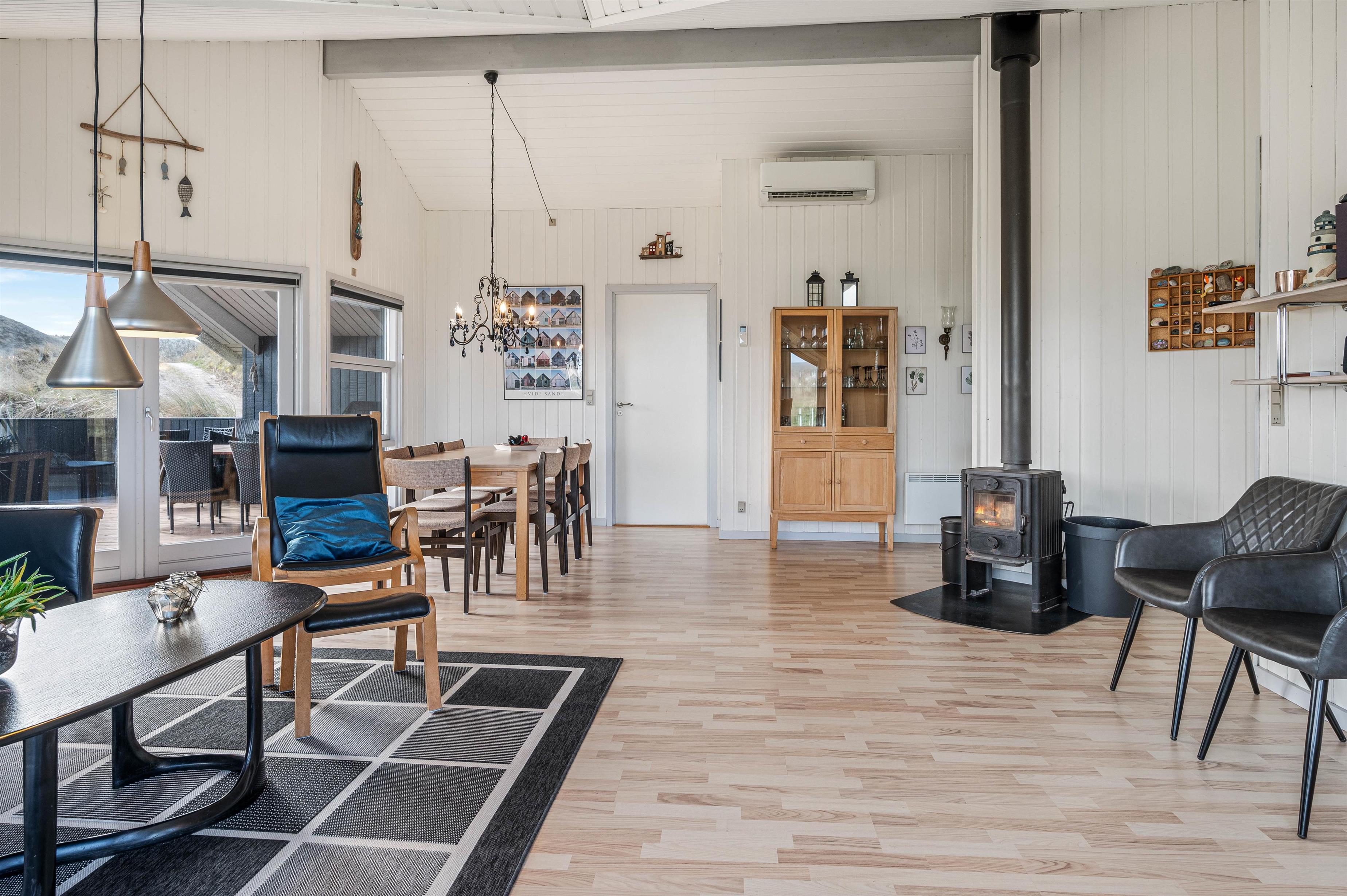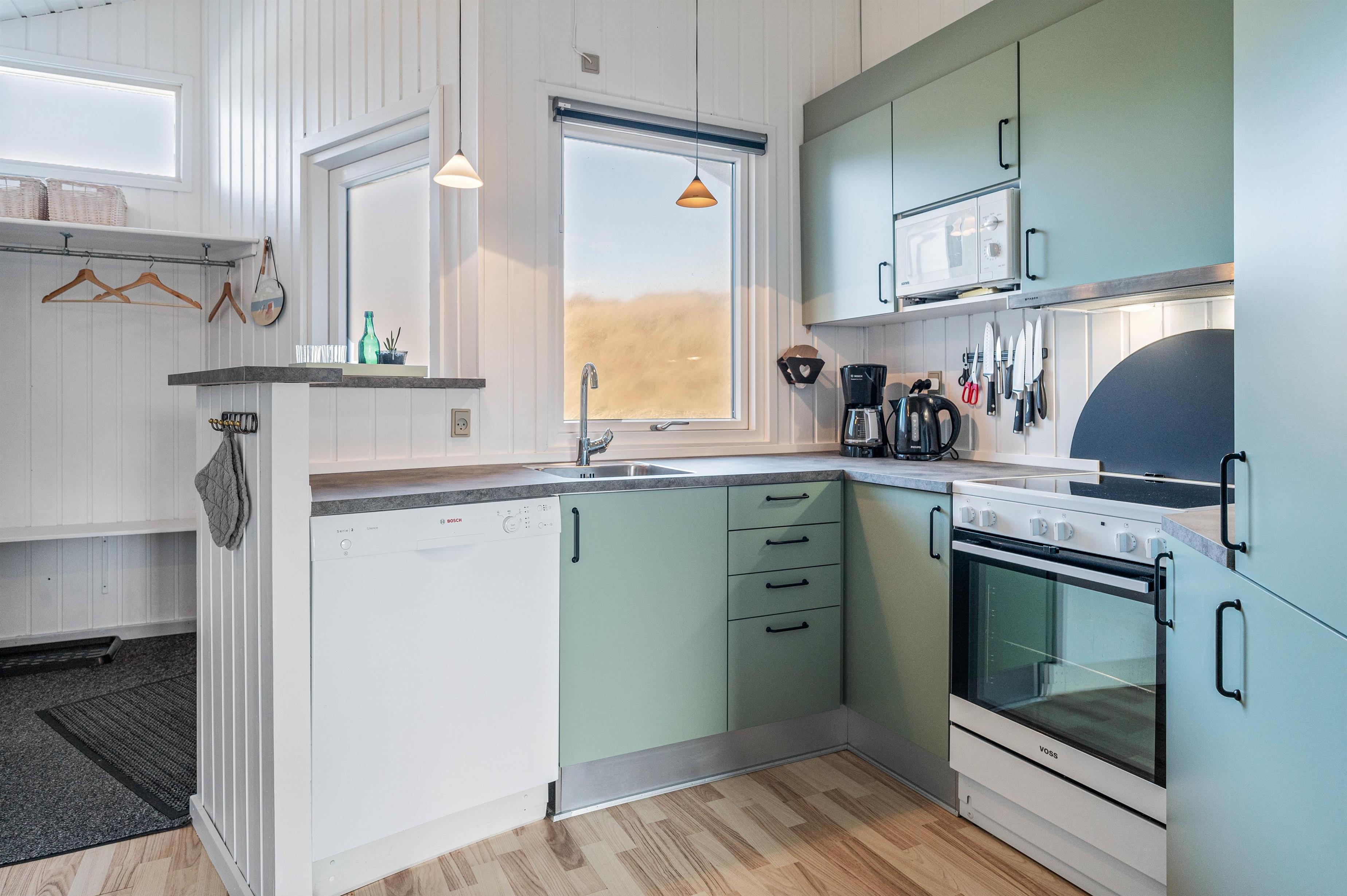 Your holiday home can be described as a beautifully appointed holiday home with excellent furnishings. The summer house features four bedrooms - three with double beds and one with two single beds - accommodating up to eight people in total. The bright and welcoming kitchen is open-plan, connecting to the living area and dining space.