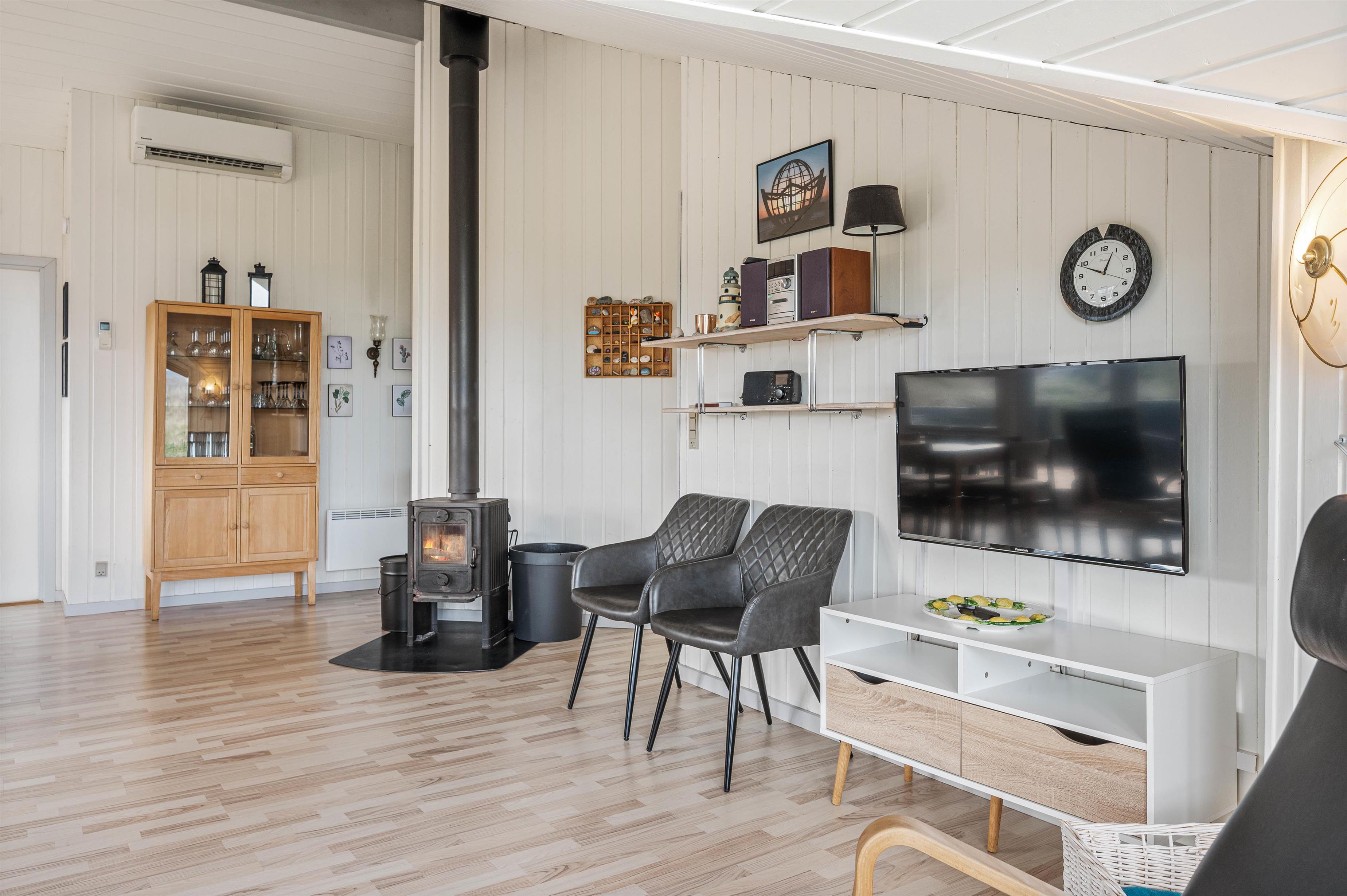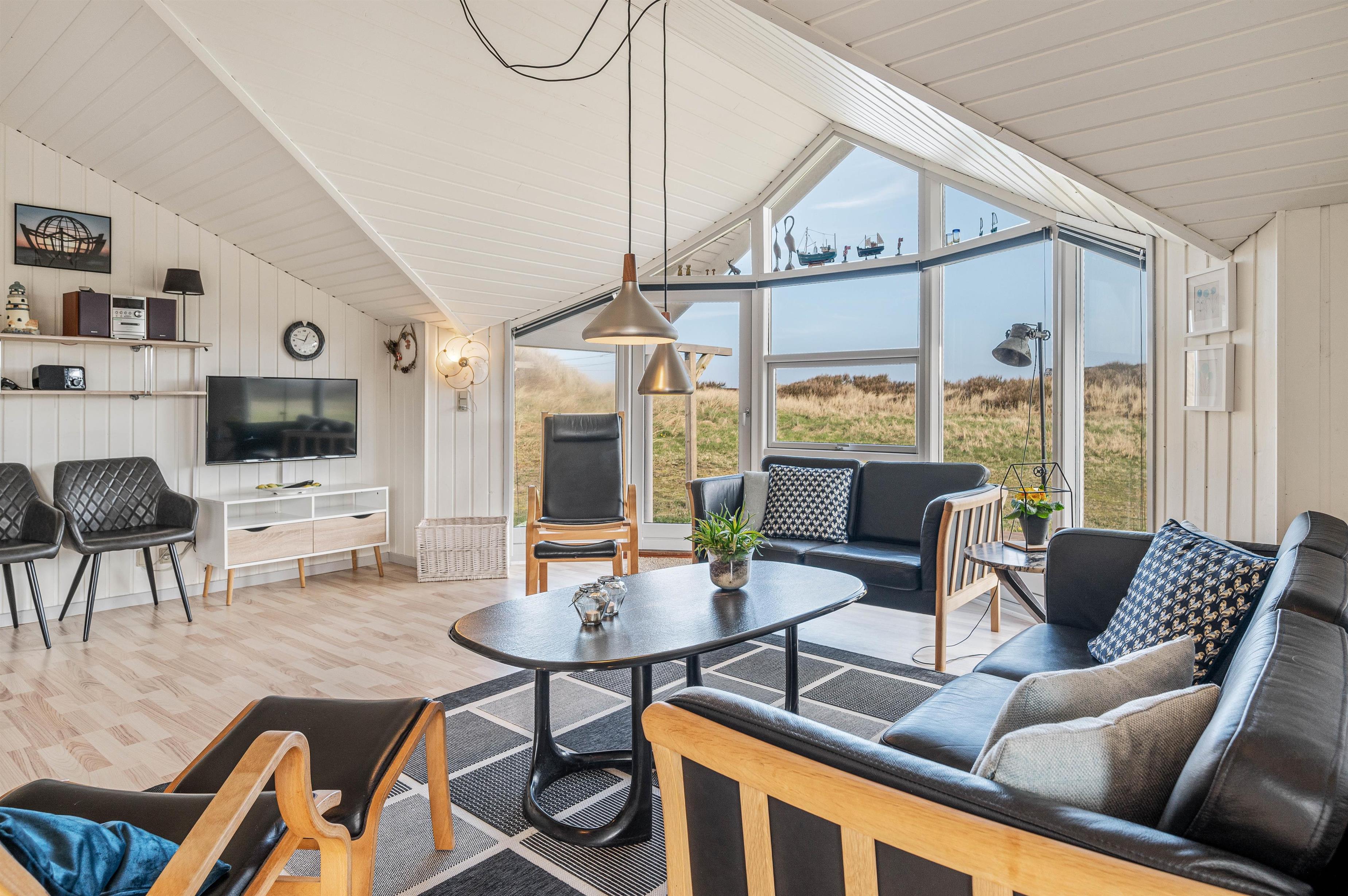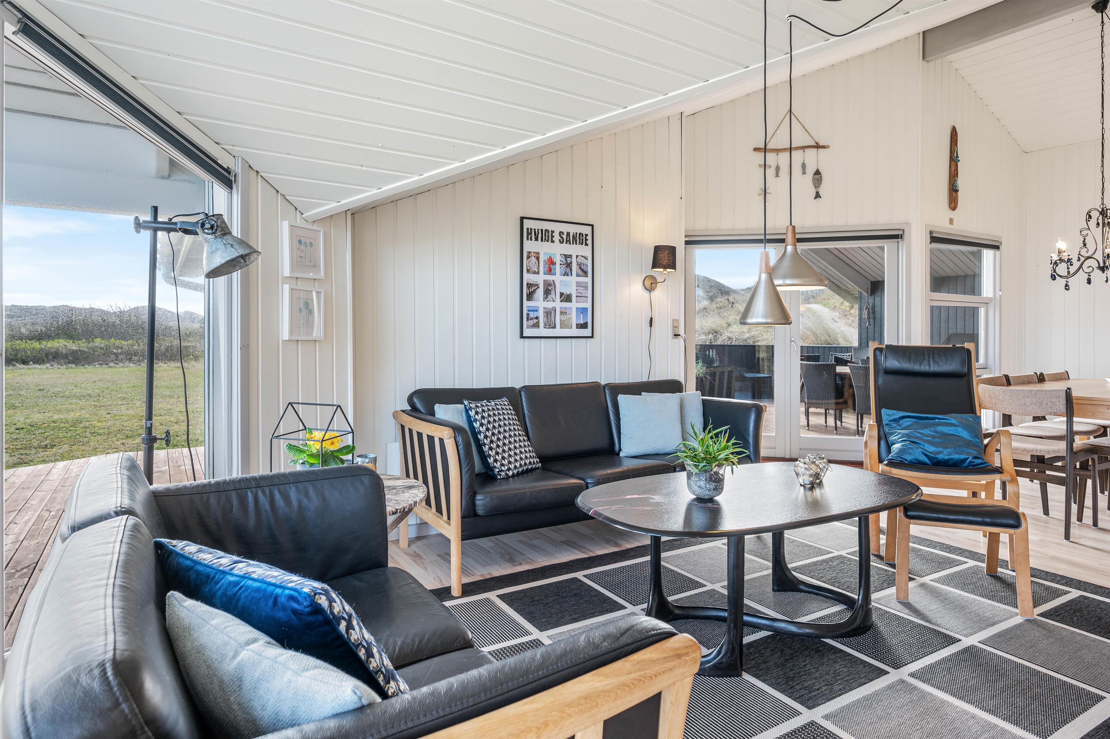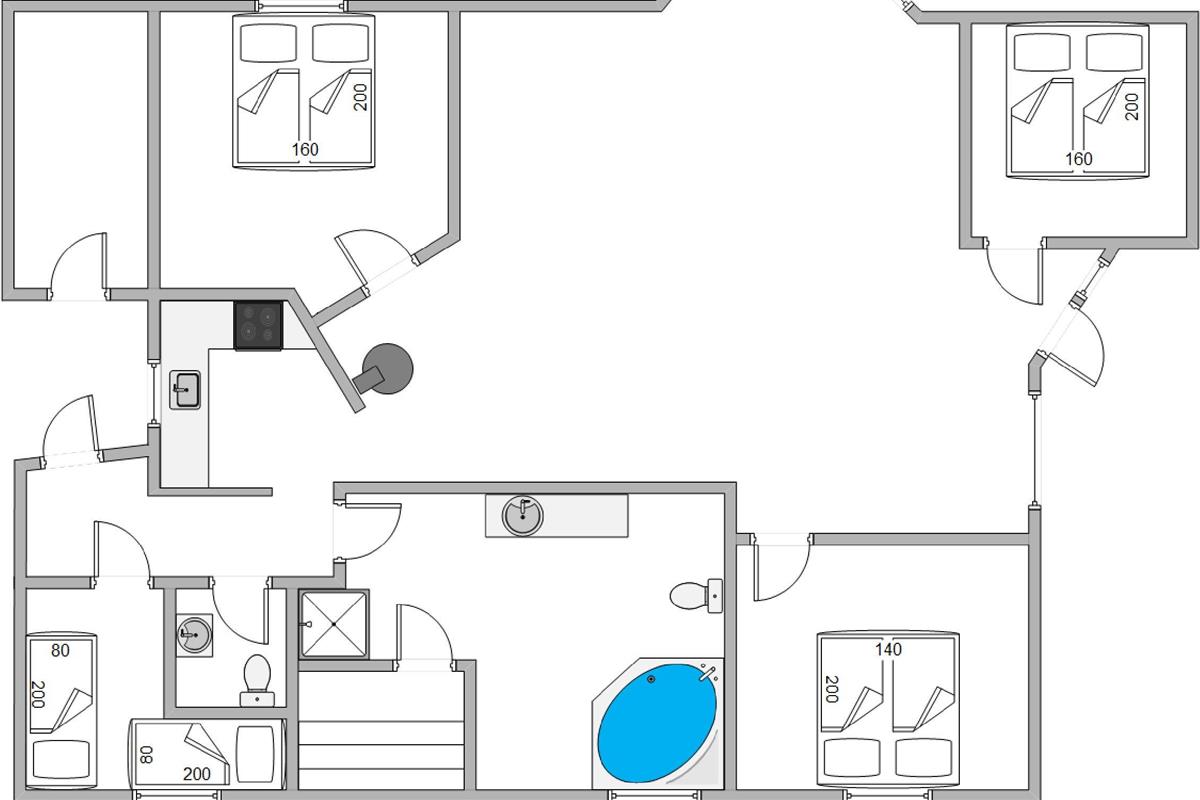 Your holiday home can be described as a beautifully appointed holiday home with excellent furnishings. The summer house features four bedrooms - three with double beds and one with two single beds - accommodating up to eight people in total. The bright and welcoming kitchen is open-plan, connecting to the living area and dining space.