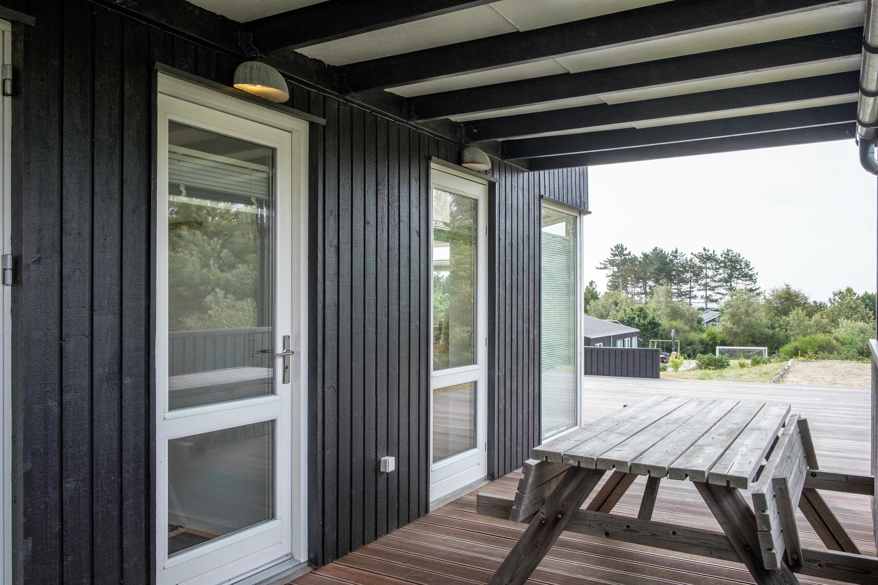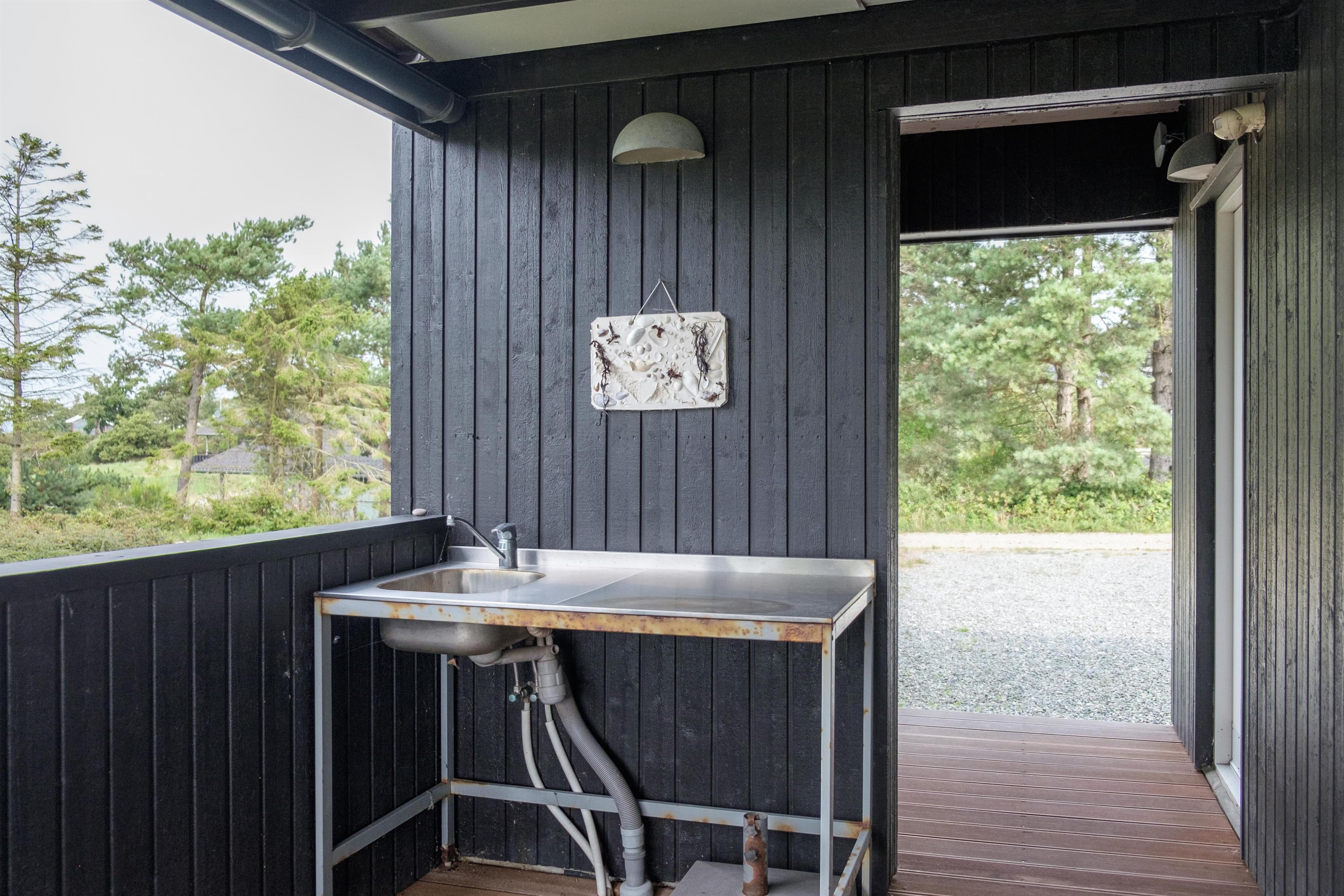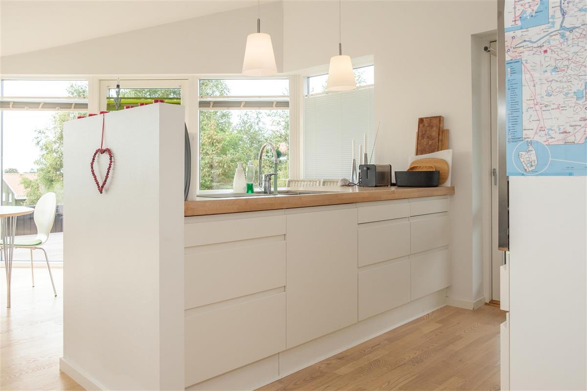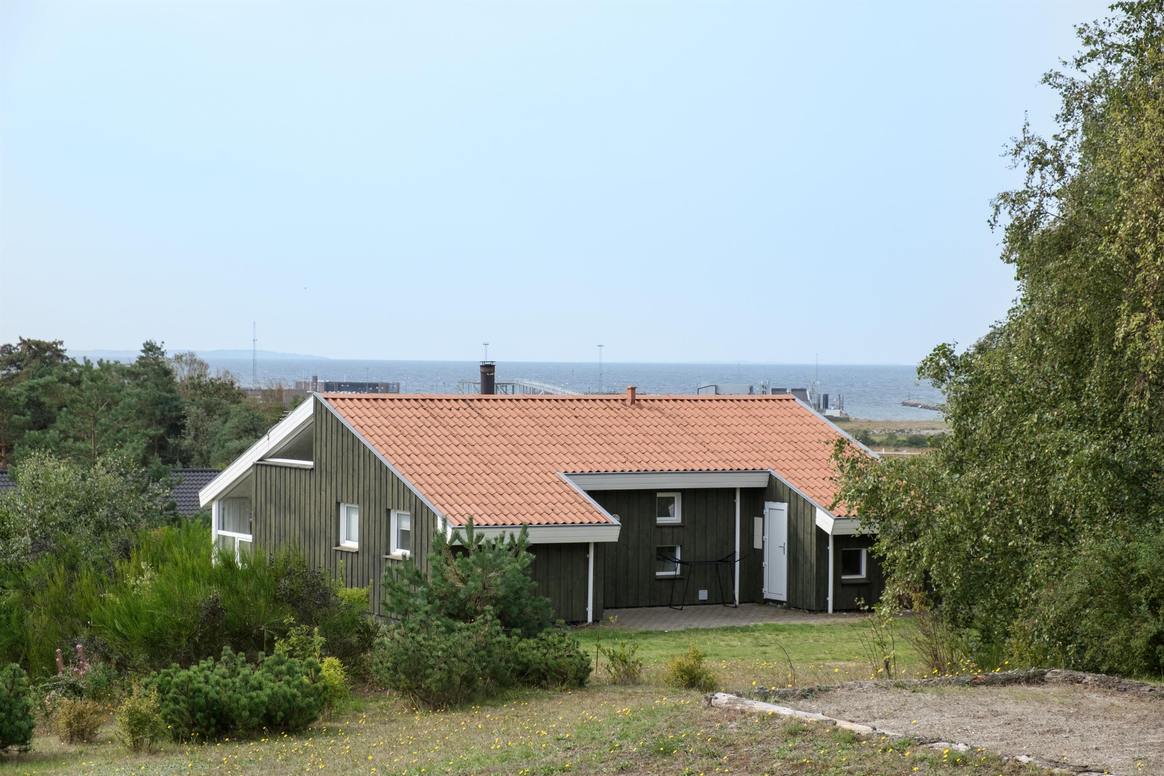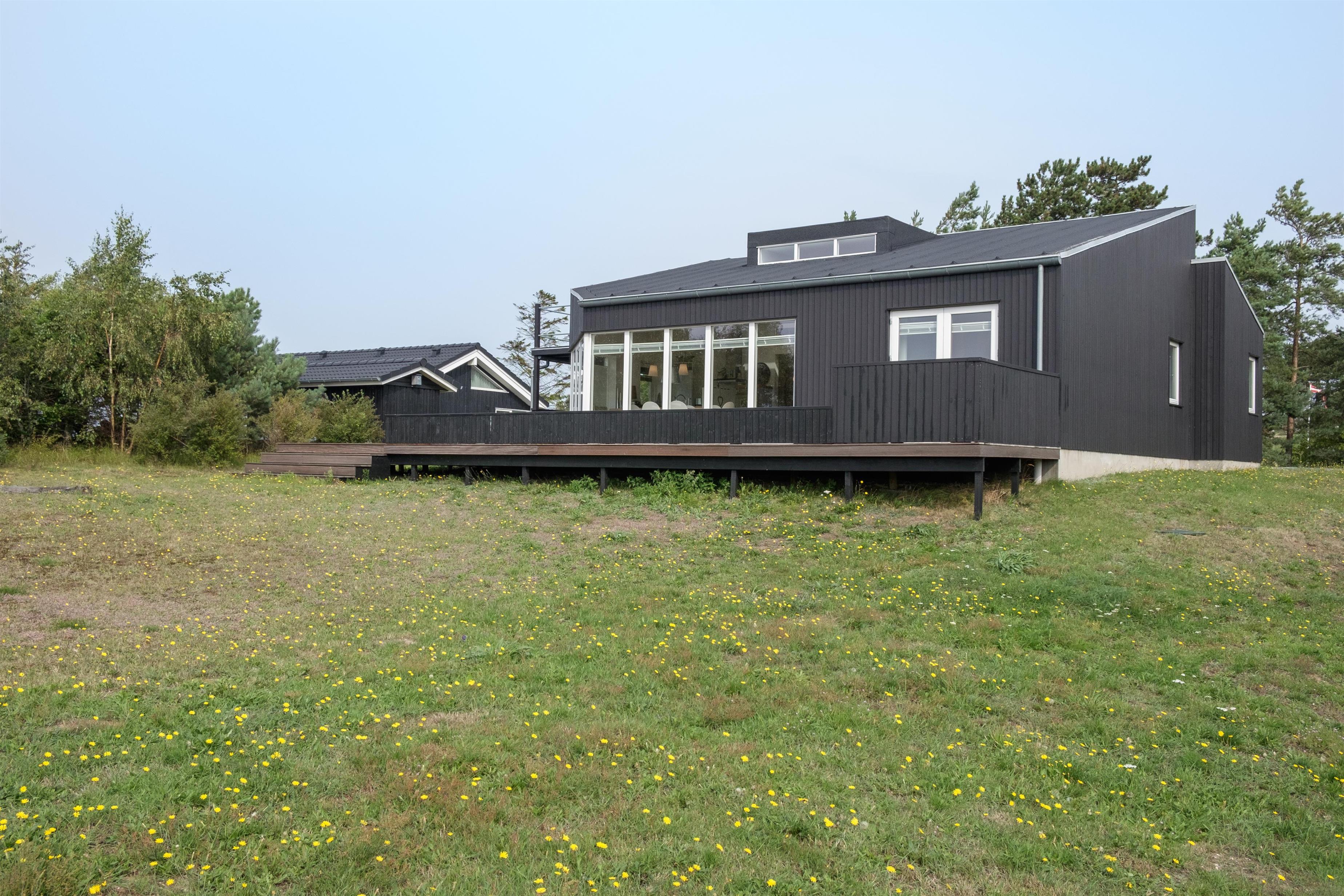 Truly bright and lovely holiday home on an elevated natural lot with a view of the hilly landscape south of Ebeltoft and with a sea view of Aarhus Bay. The house has a large, partially covered wooden terrace with a sea view. There are garden furniture, sun loungers, a parasol, grill, and a small outdoor kitchen/fish cleaning area.
