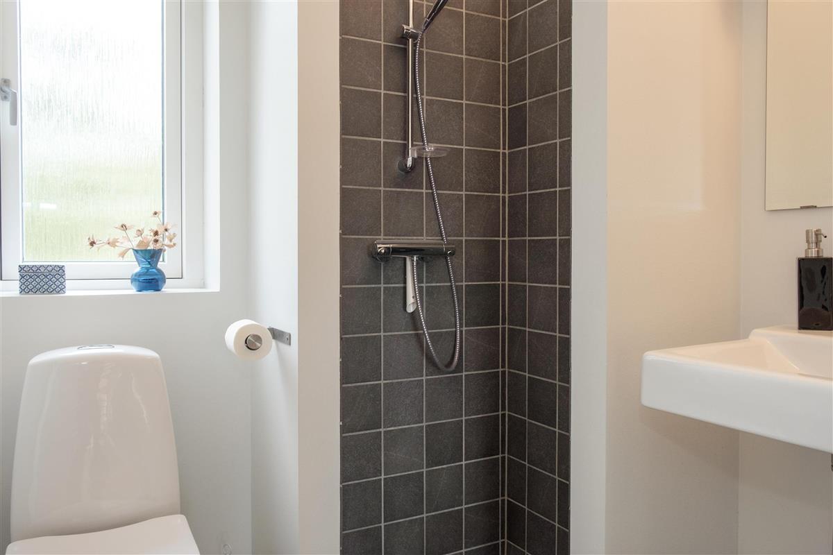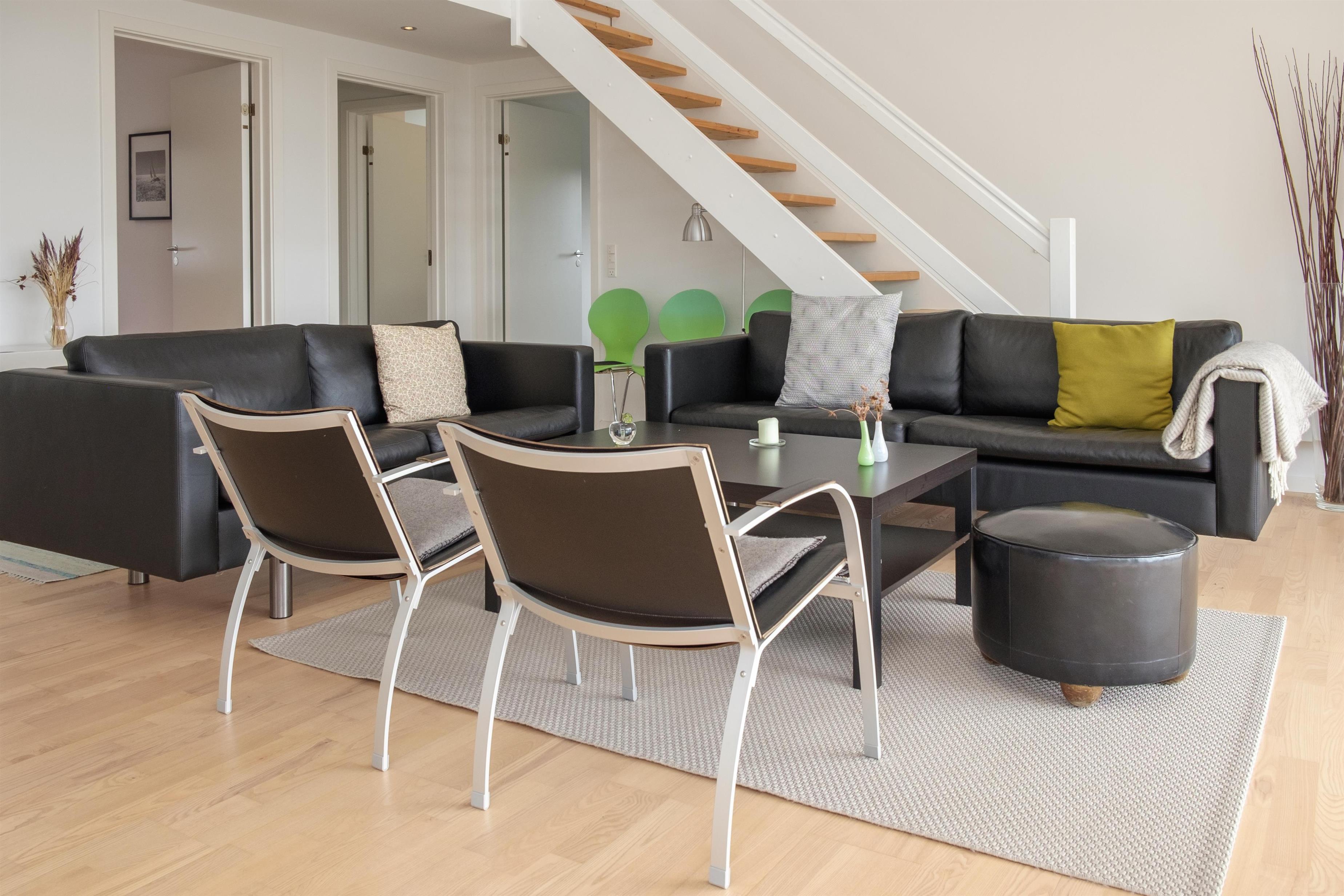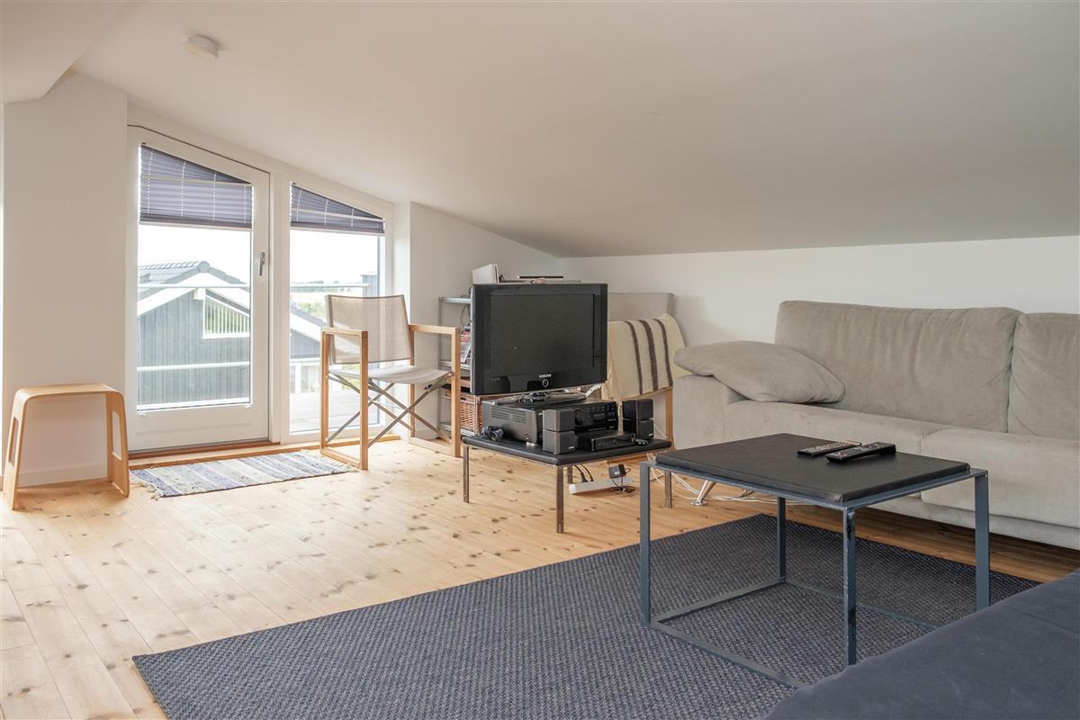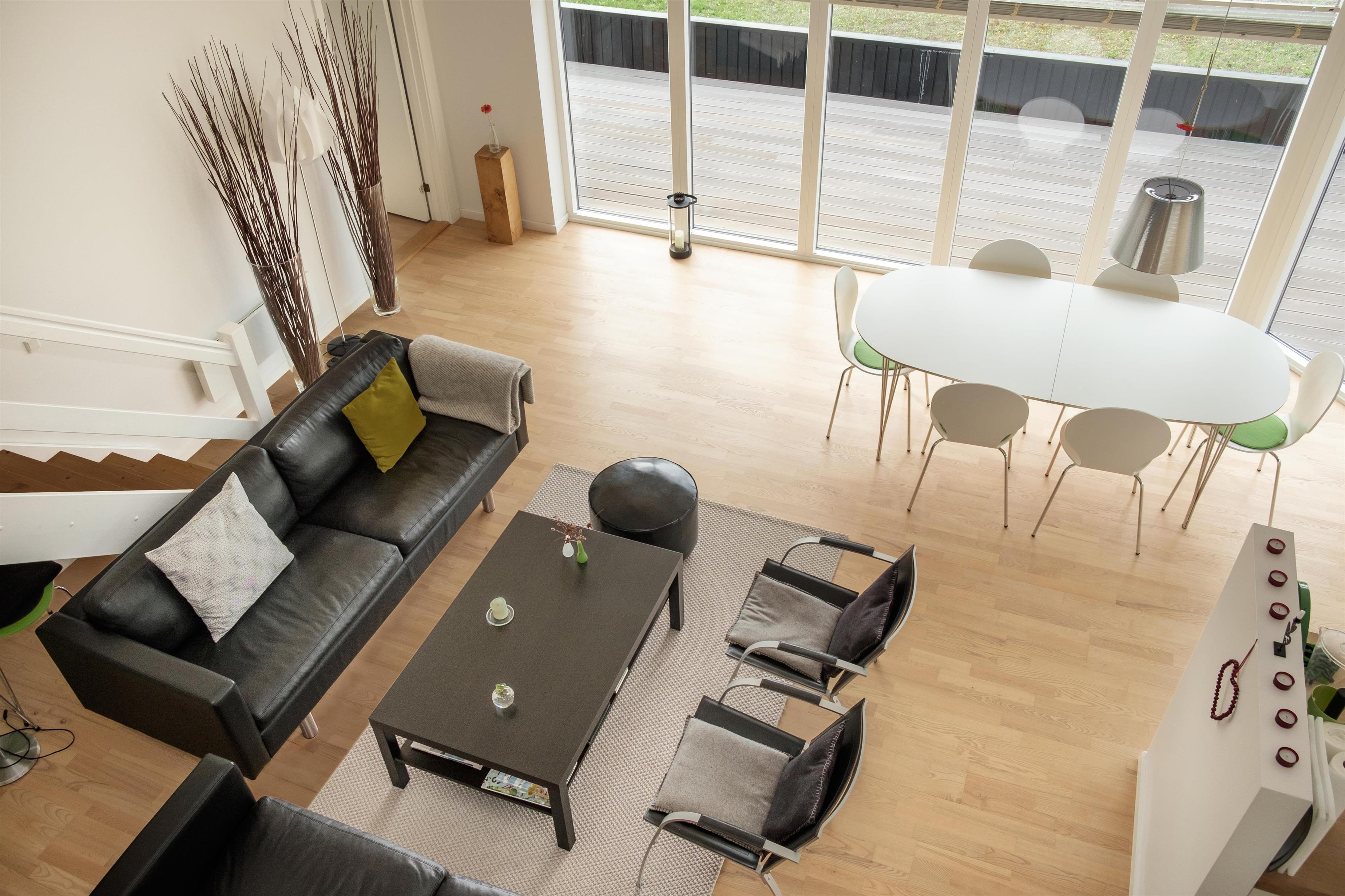 The large, bright, and inviting living room with panoramic windows is in open connection with the kitchen and has access to the terrace. Comfortable and spacious sofa seating as well as a dining area for 6 people, TV with Danish (including TV2) and German channels, and a radio. Lovely, new, and well-appointed kitchen with ceramic hobs, built-in oven, fridge/freezer, and dishwasher. From the living room, a staircase leads up to the 1st floor with a cozy and bright living area with a view balcony. The 6 sleeping spaces are distributed among 3 lovely, bright bedrooms on the ground floor with double beds. Large, nice bathroom with a spa bath and shower cabin, as well as a smaller bathroom with a shower. Internet access is available.
