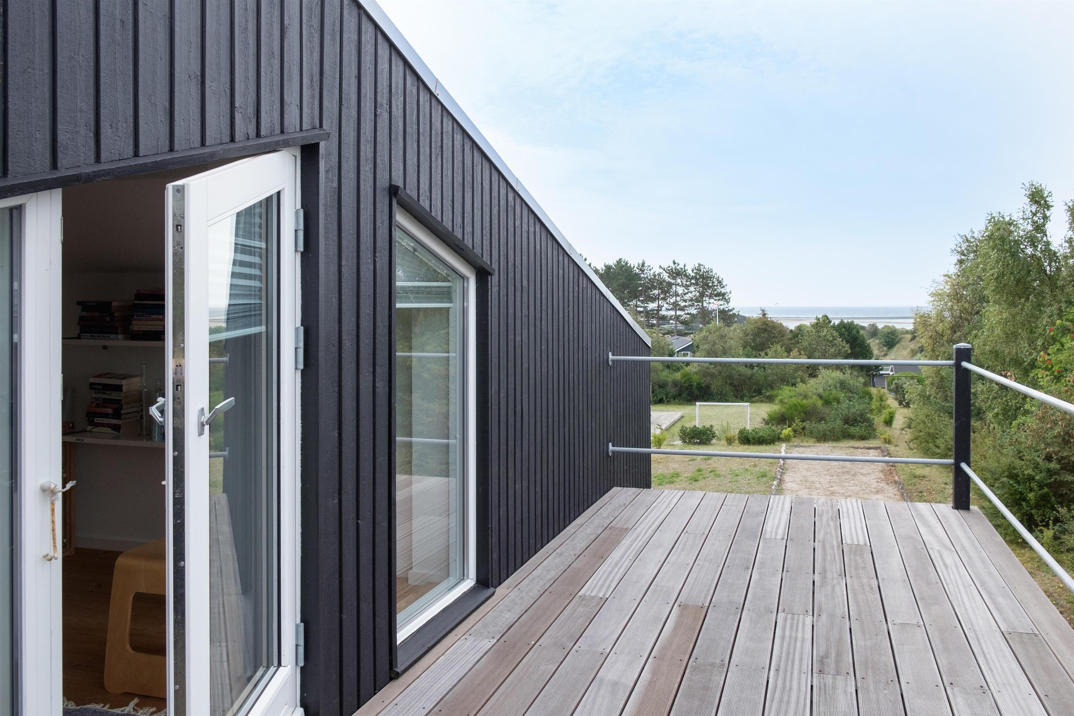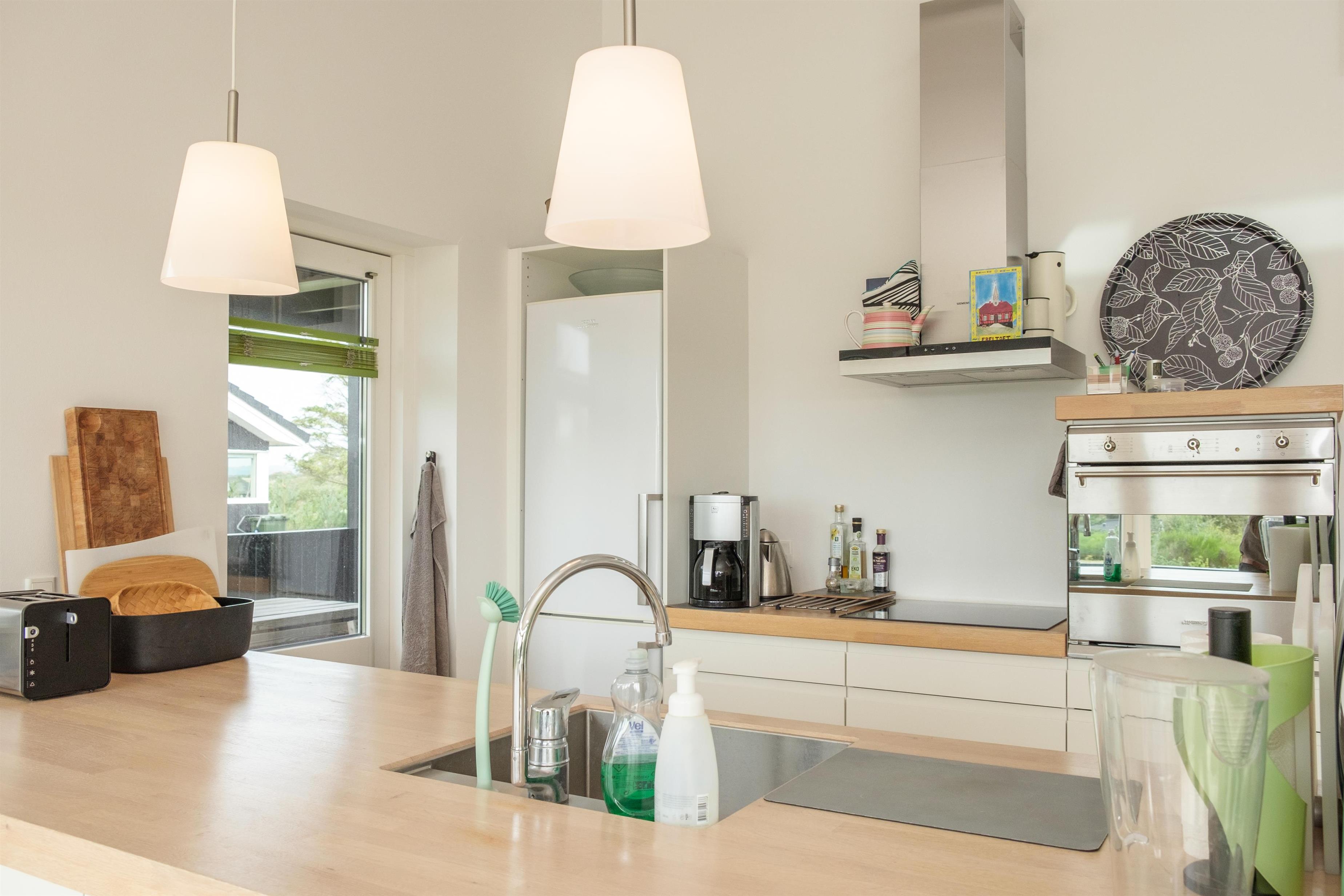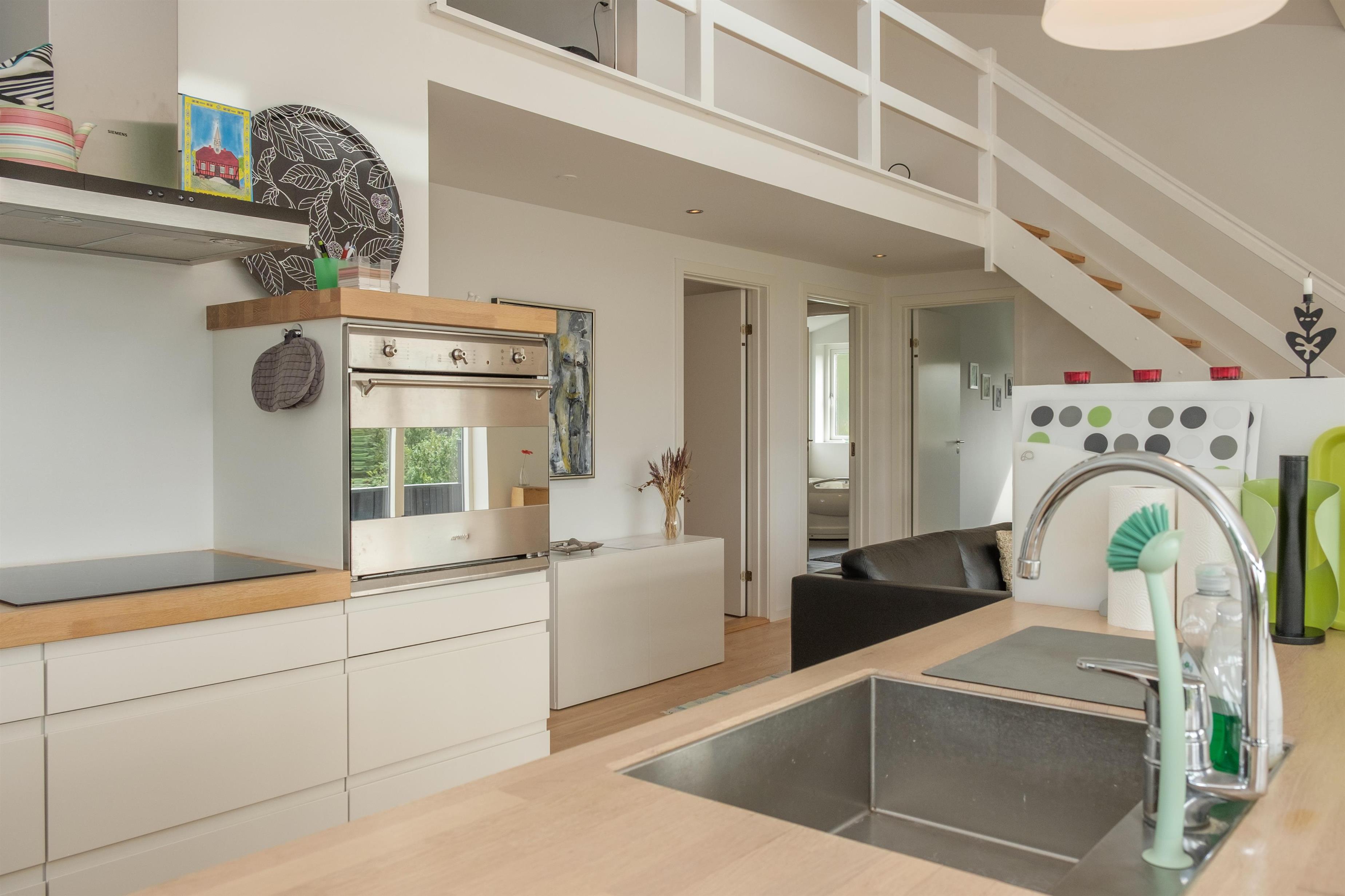 The large, bright, and inviting living room with panoramic windows is in open connection with the kitchen and has access to the terrace. Comfortable and spacious sofa seating as well as a dining area for 6 people, TV with Danish (including TV2) and German channels, and a radio. Lovely, new, and well-appointed kitchen with ceramic hobs, built-in oven, fridge/freezer, and dishwasher. From the living room, a staircase leads up to the 1st floor with a cozy and bright living area with a view balcony. The 6 sleeping spaces are distributed among 3 lovely, bright bedrooms on the ground floor with double beds. Large, nice bathroom with a spa bath and shower cabin, as well as a smaller bathroom with a shower. Internet access is available.