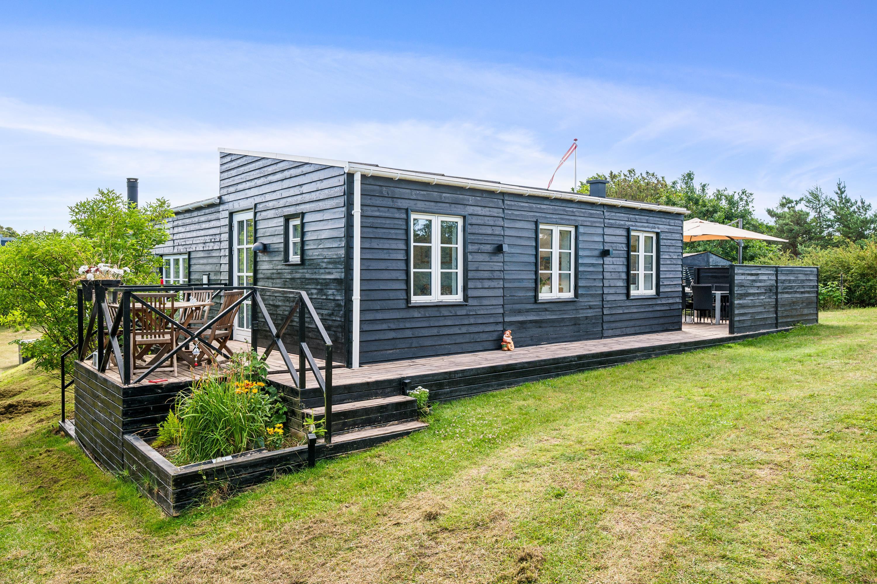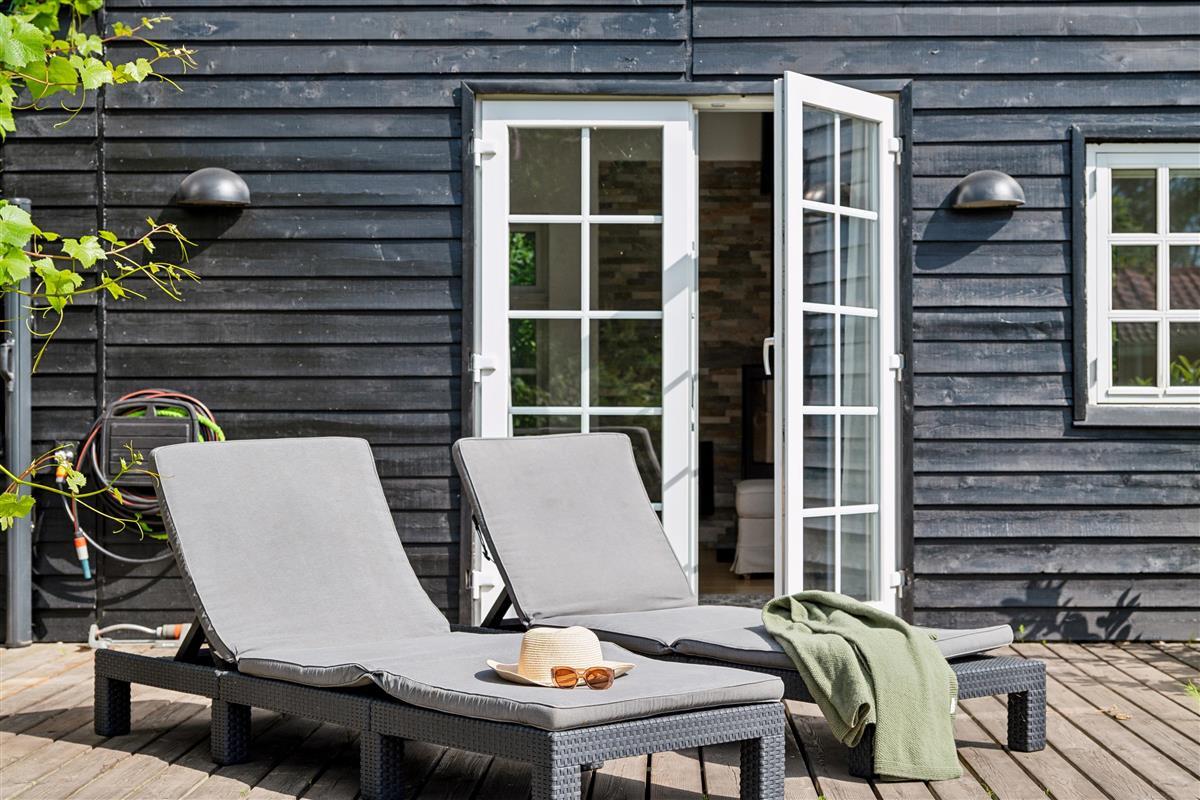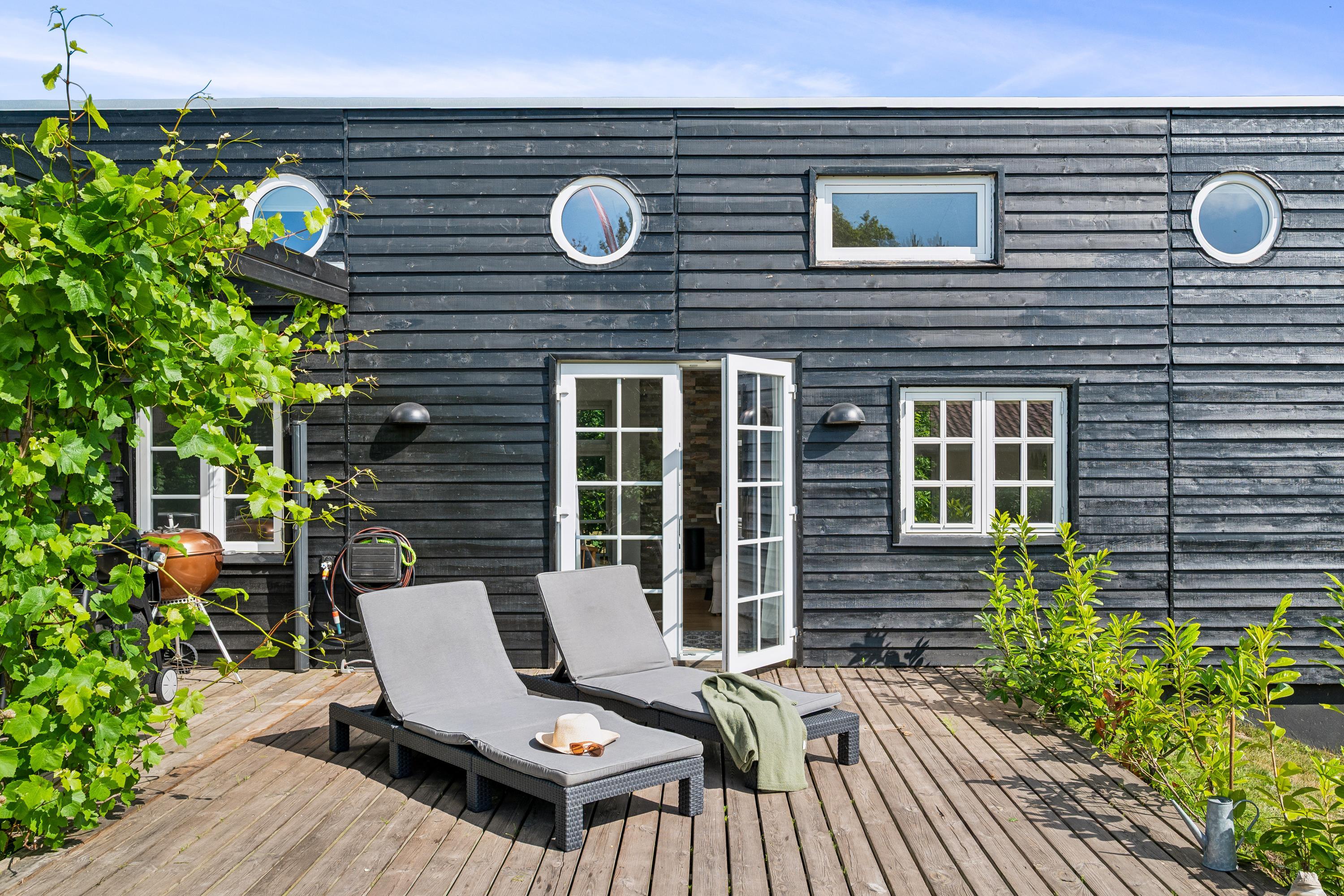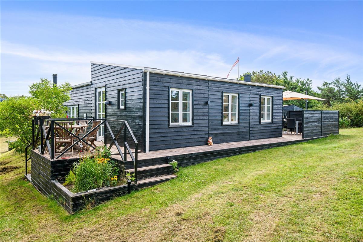 "Ombord" is a newly modernized and very well-equipped holiday home situated on a hilly and beautifully wooded natural plot with space for play close to both the beach and mountain bike trail. On the large, covered terrace with thermo glass roof and lounge sofa, you can enjoy the warmth and barbecue, even in rainy weather. The rest of the large terrace offers ample space to bask in the sun. Despite its thoroughly modern maritime appearance, the quirky walls from the original 1963 house have been preserved.