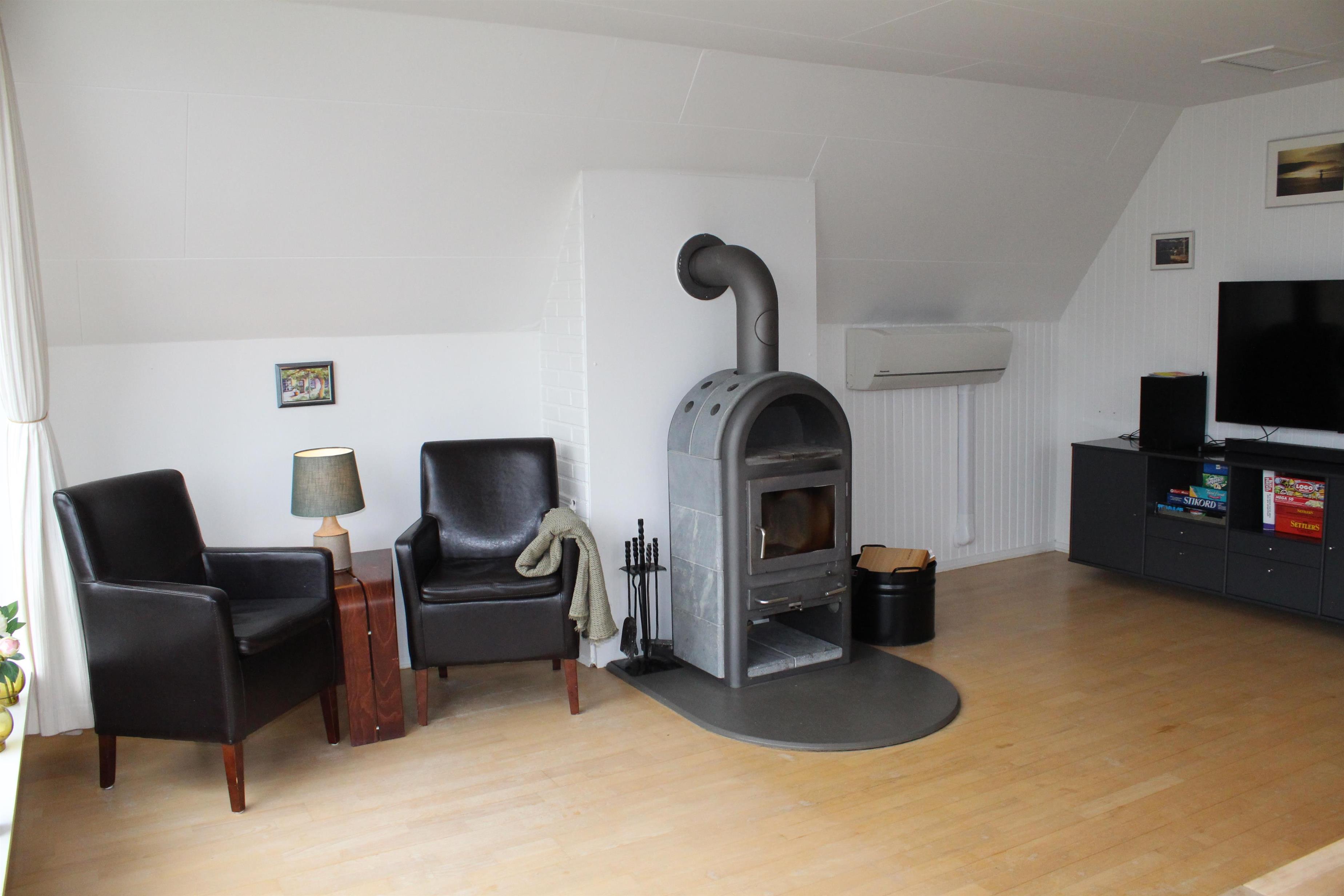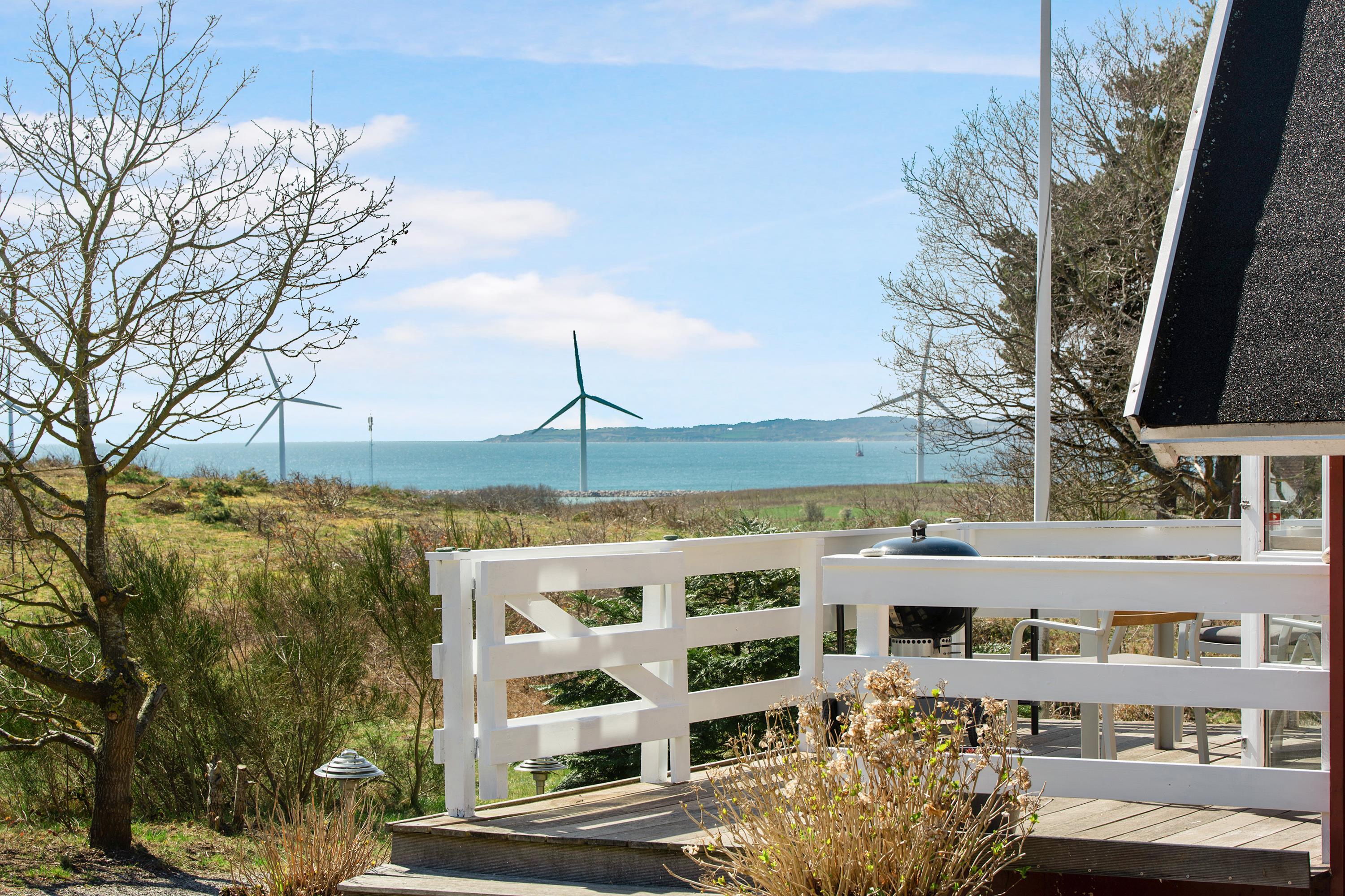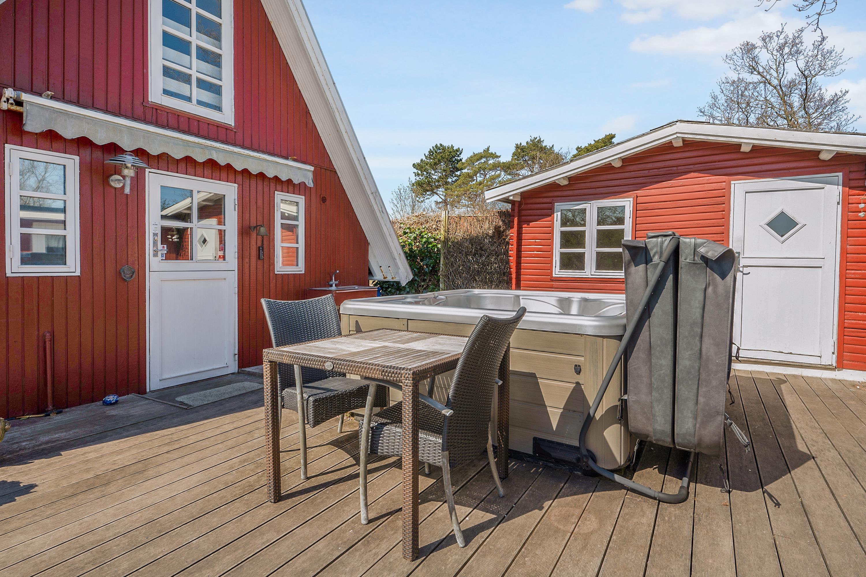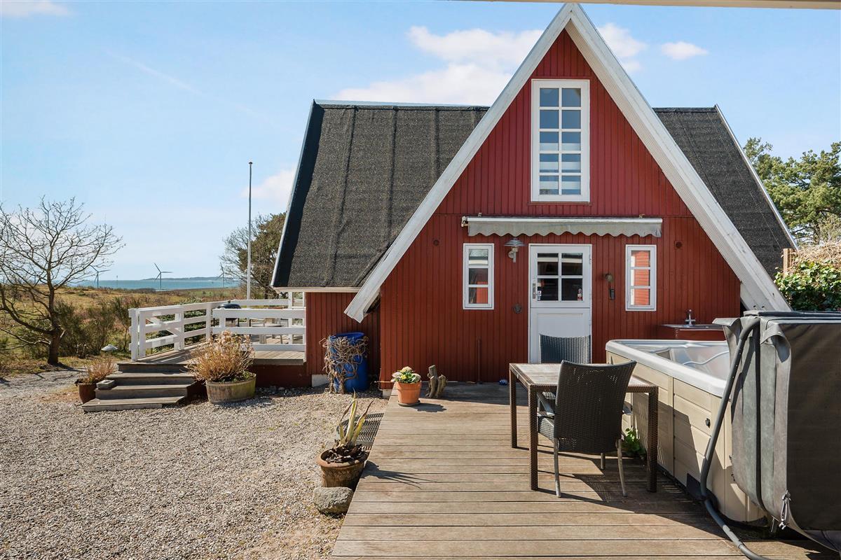 Older, well-maintained, and spacious holiday home on 2 levels, situated on a quiet road close to both Ebeltoft and Øer, with a lovely view of the Kattegat. Two beautiful, sheltered wooden terraces facing south and west, as well as a large, central, and fenced wooden terrace with a hot tub. There are garden furniture, loungers, a grill, and a parasol, as well as a delightful outdoor kitchen. The house has a carport. Large, bright, and well-furnished living room with access to the terrace. Cozy sofa furniture, wood stove, TV with Danish (including TV2) and German channels, and a radio. The spacious and well-equipped kitchen with visible ceiling beams has good dining space for 6 people, ceramic hobs and oven, refrigerator, dishwasher, and microwave, as well as access to a large, elevated terrace. On the ground floor, there is also 1 spacious bedroom with a double bed, while the 1st floor has 2 rooms with sloping ceilings (note: an extra room is locked for the owner), both with 2 single beds, making a total of 6 sleeping places. Newer, bright, and well-appointed bathroom with shower, cabinet arrangement, and washing machine, as well as a guest toilet, both on the ground floor. There is internet access.