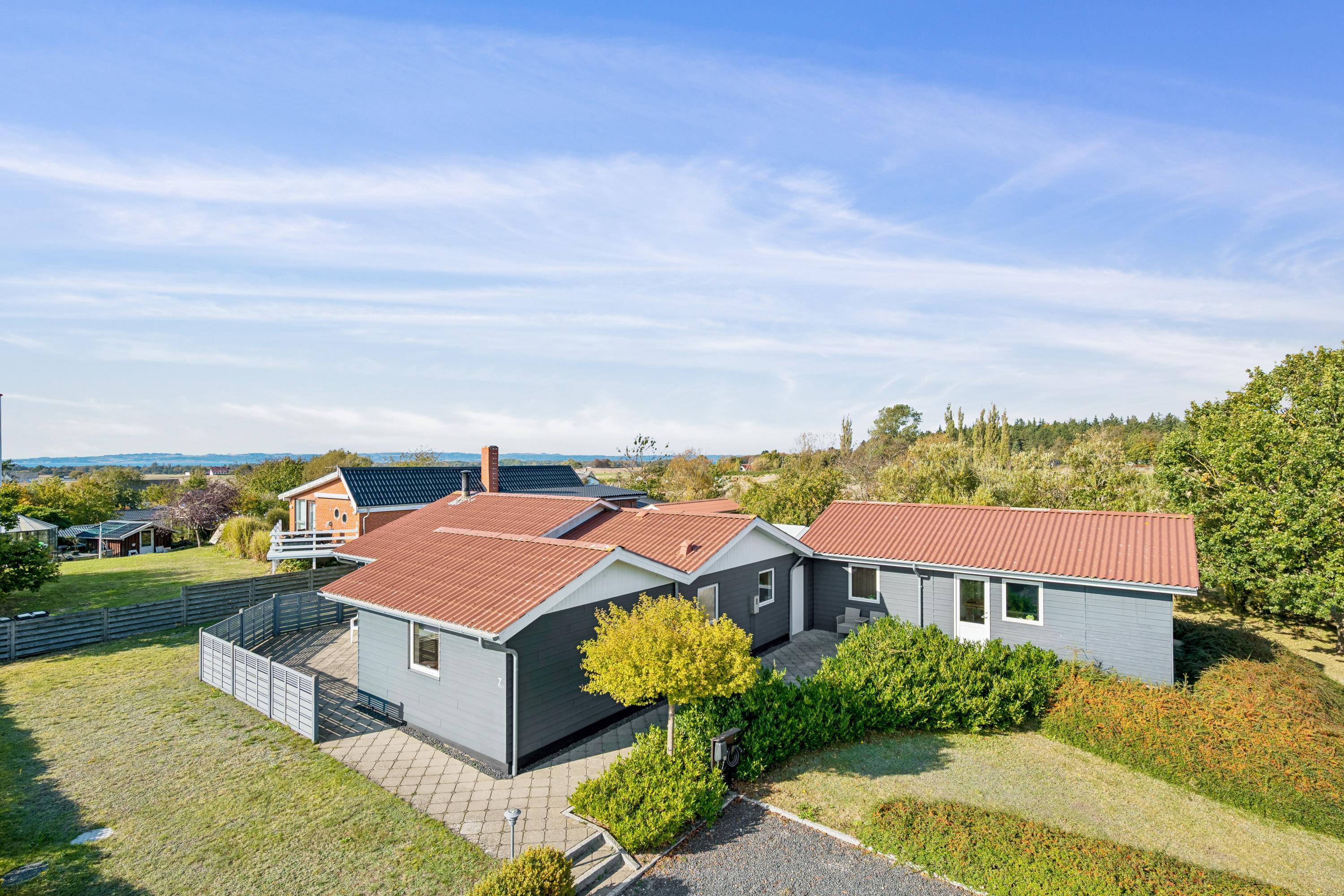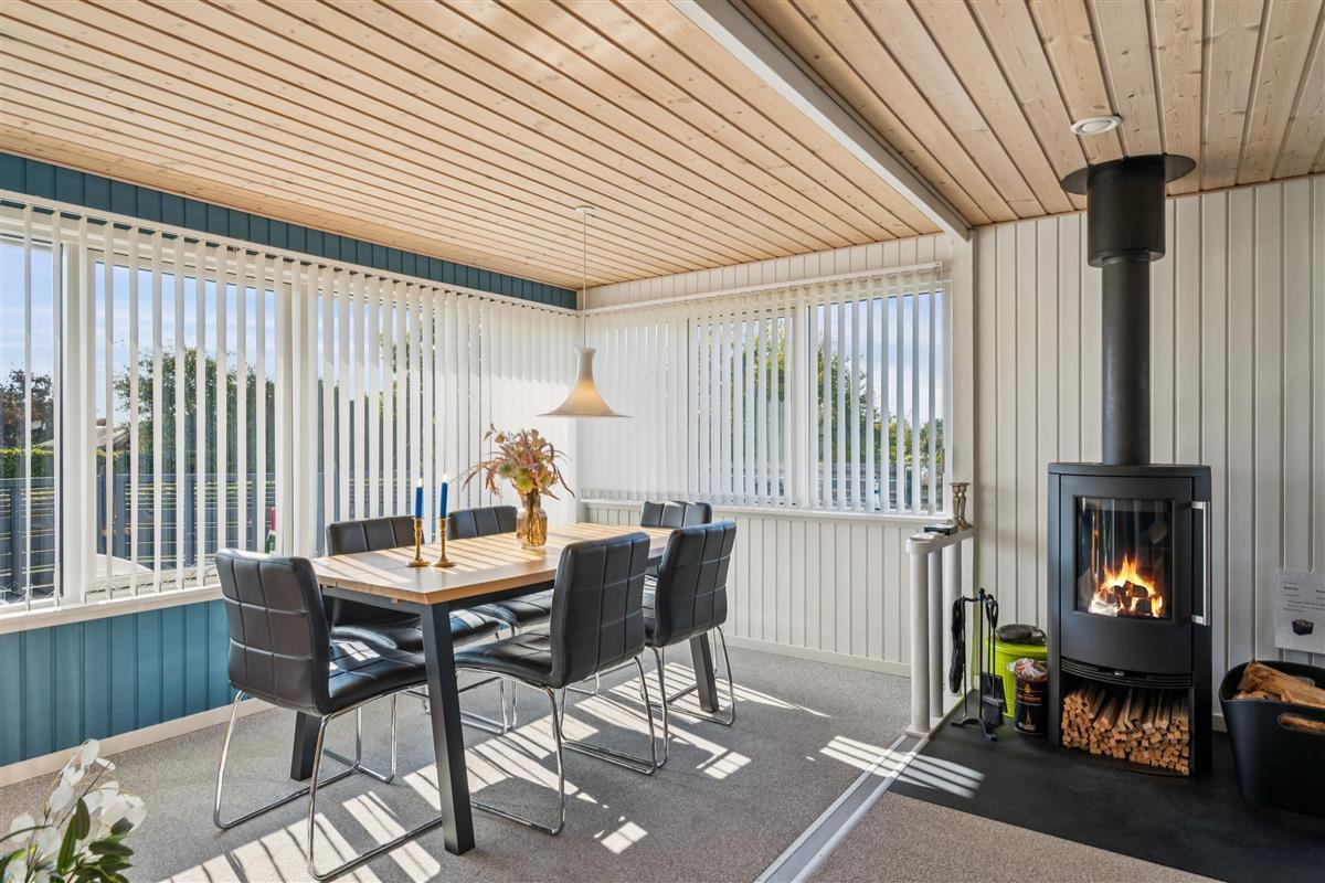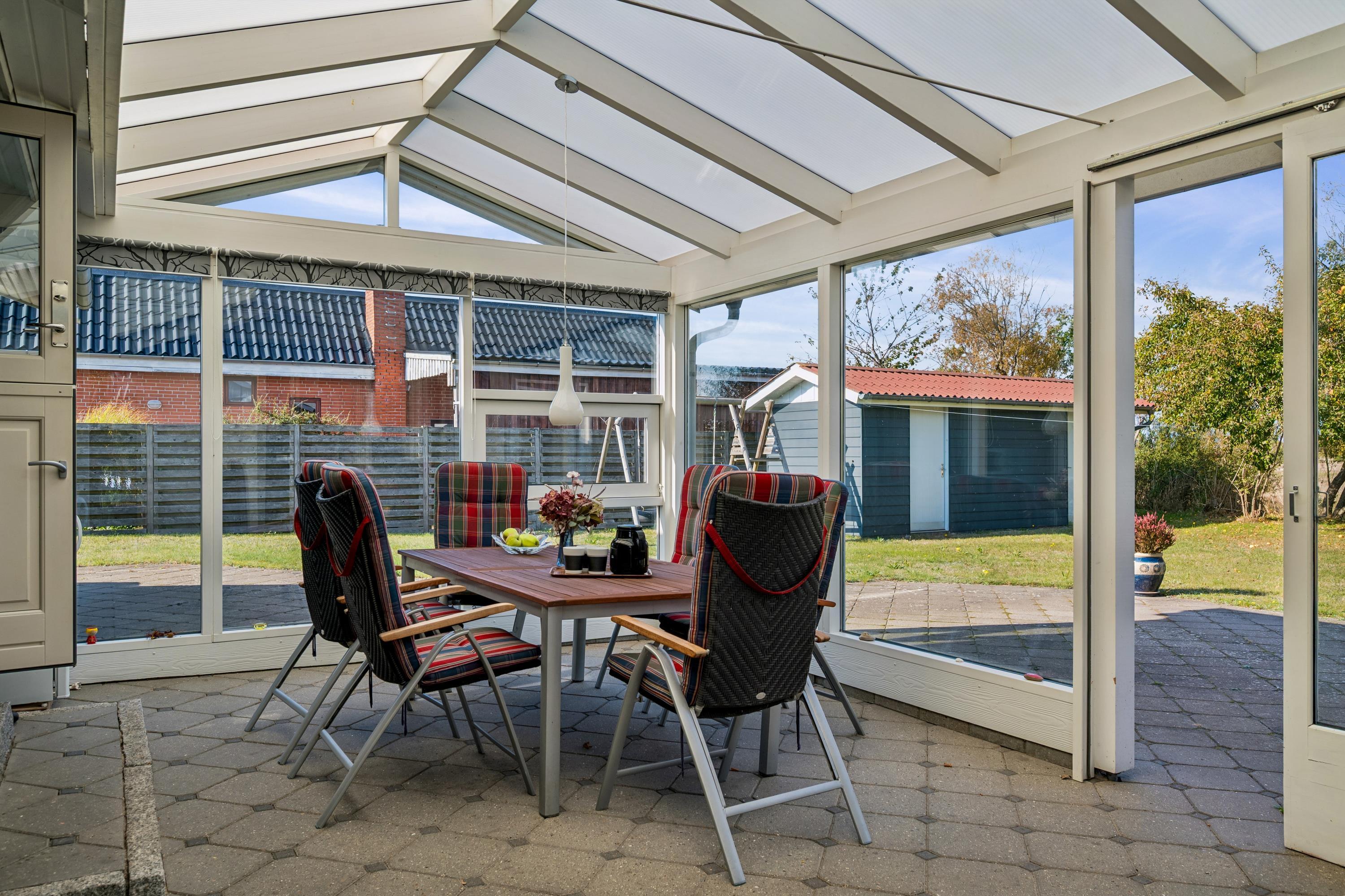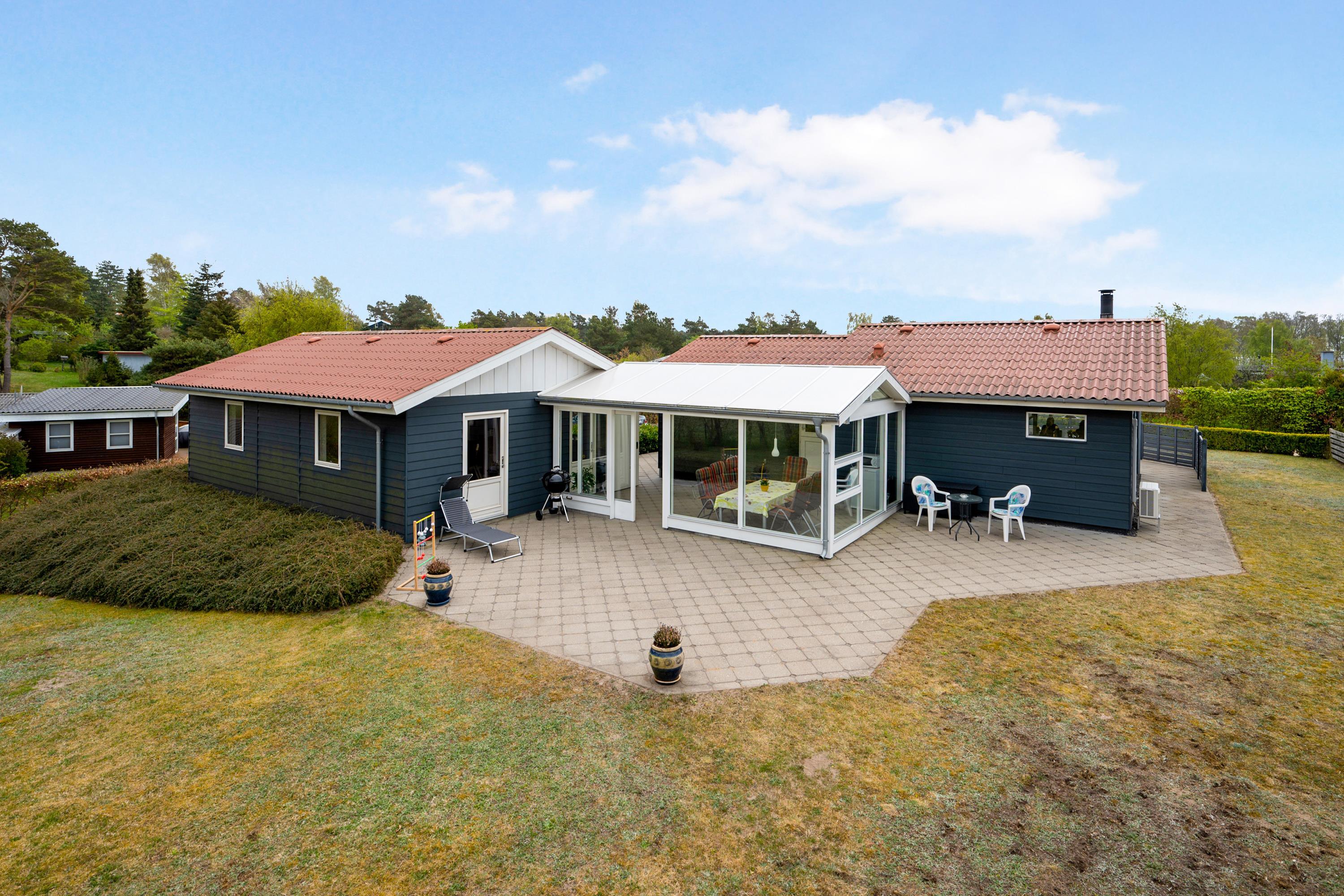 Close to Ebeltoft town and near the beach, you will find this spacious, well-maintained, and continuously modernized holiday home. The house is elevated in the northern part of the large holiday home area between Ebeltoft and Øer. Large, northwest-facing tiled terrace with a lovely conservatory where you can enjoy lunch and the view regardless of the weather, as well as a delightful, secluded, south-facing tiled terrace. Here, there are garden furniture and a grill.