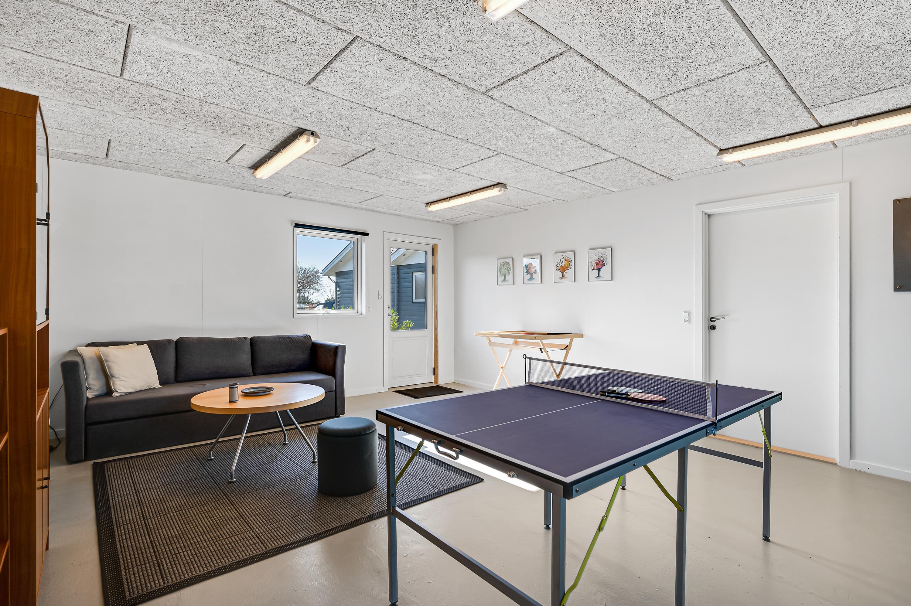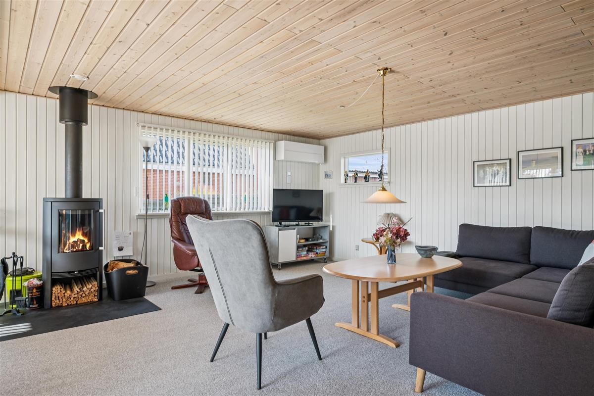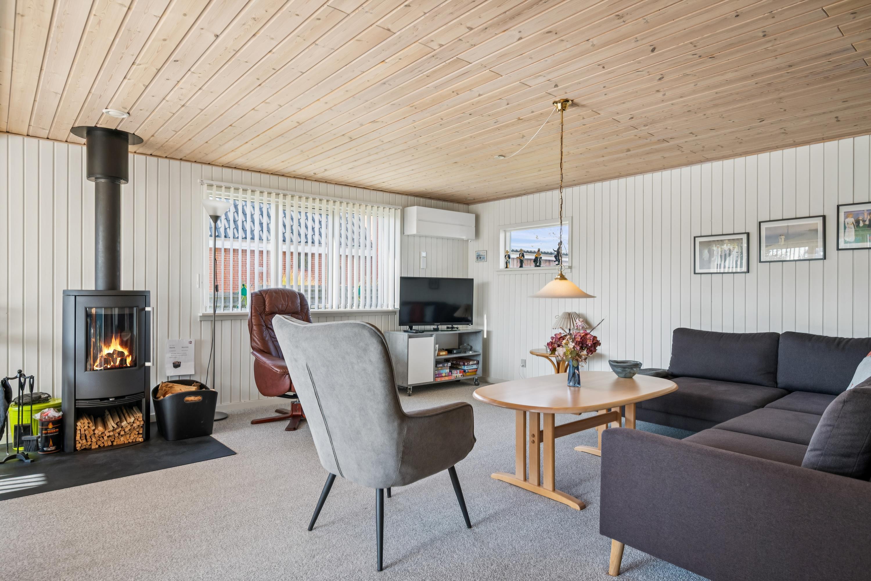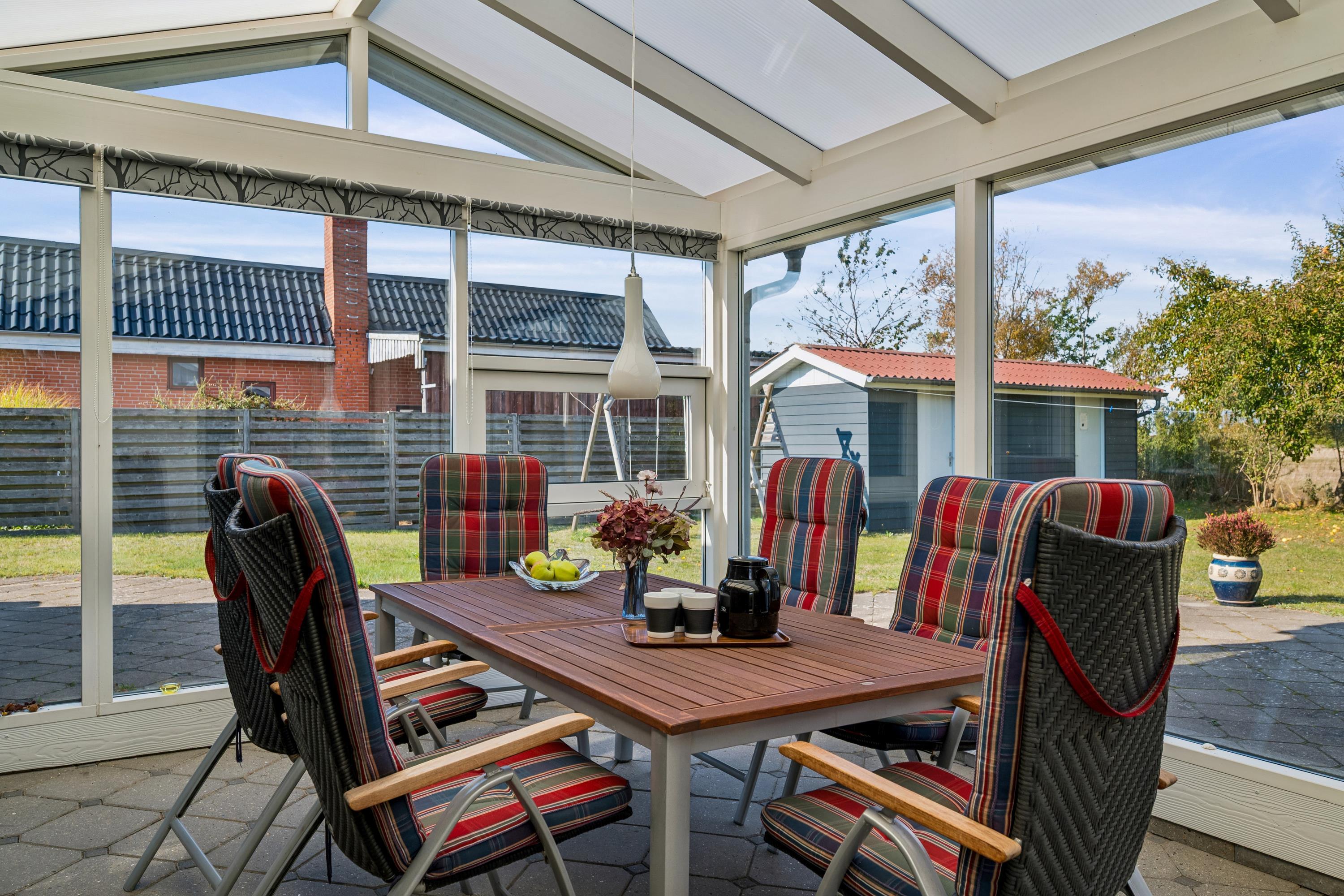 You enter directly into the large living/dining room with a wood-burning stove, comfortable sofa corner, TV with Danish (including TV2) and German channels, and a separate dining area for 6 people with a view of the garden. In open connection with the living room, there is a really nice, well-equipped kitchen with ample workspace and a stove with ceramic hobs and oven, fridge/freezer, dishwasher, and microwave. From the kitchen, there is also an exit to the conservatory. The house accommodates 6 sleeping places distributed among 2 good bedrooms with double beds and 1 slightly smaller room/annex with an entrance from the conservatory. New, regular bathroom with a shower, cabinet arrangement, and washing machine. There are, among other things, darts, a foosball table, and table tennis available in the newly furnished activity section, and there is internet in the house. Firewood can be purchased from the owner for the wood-burning stoves.