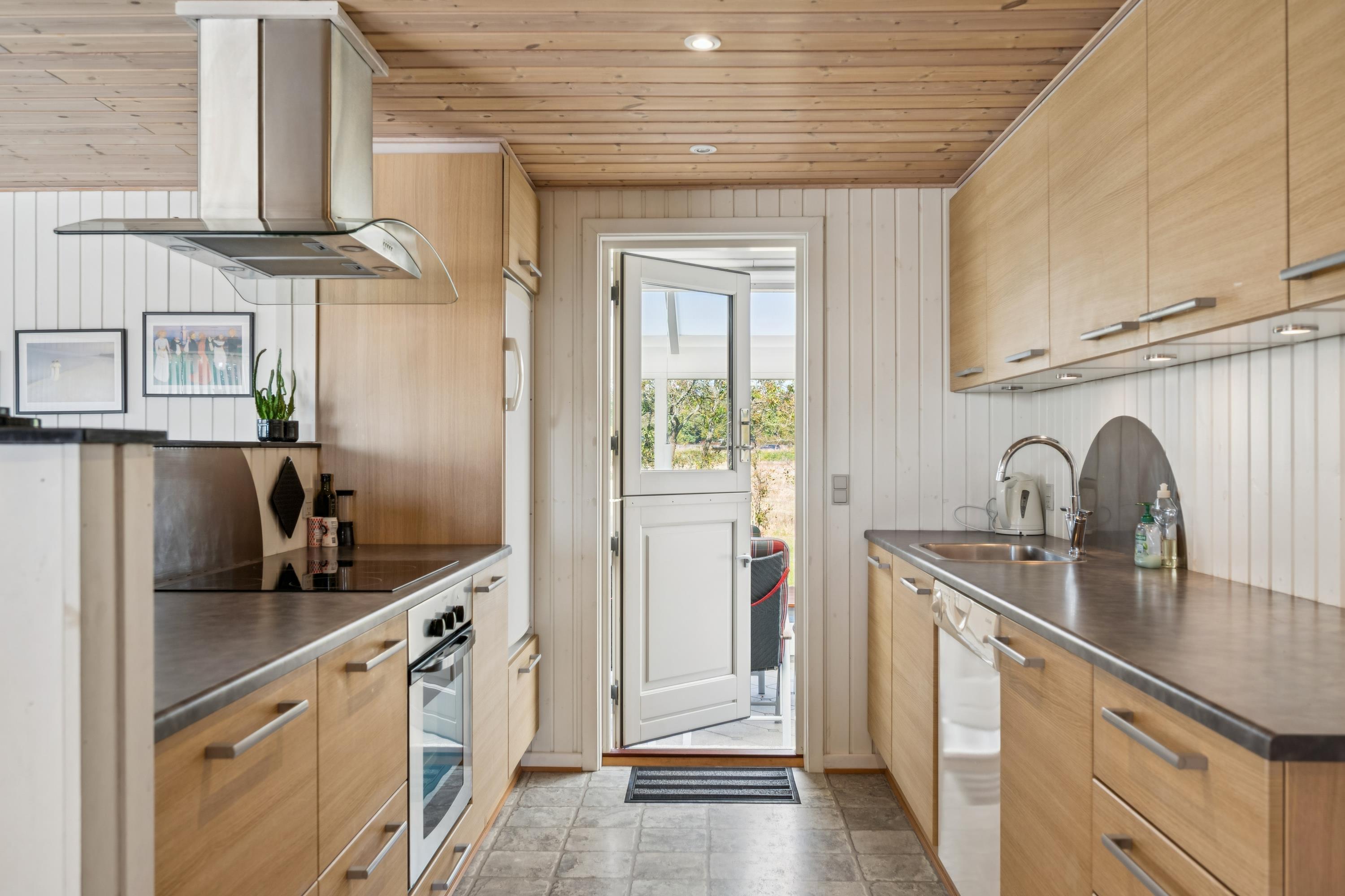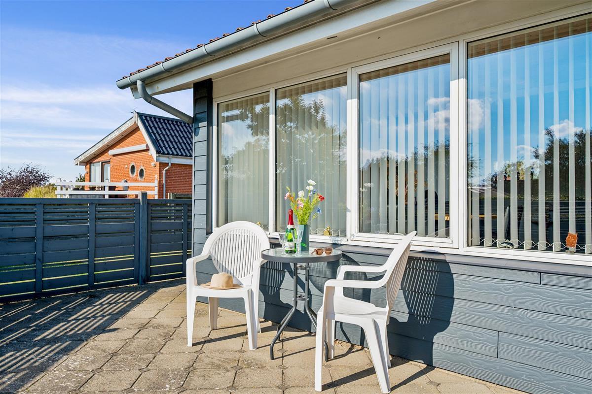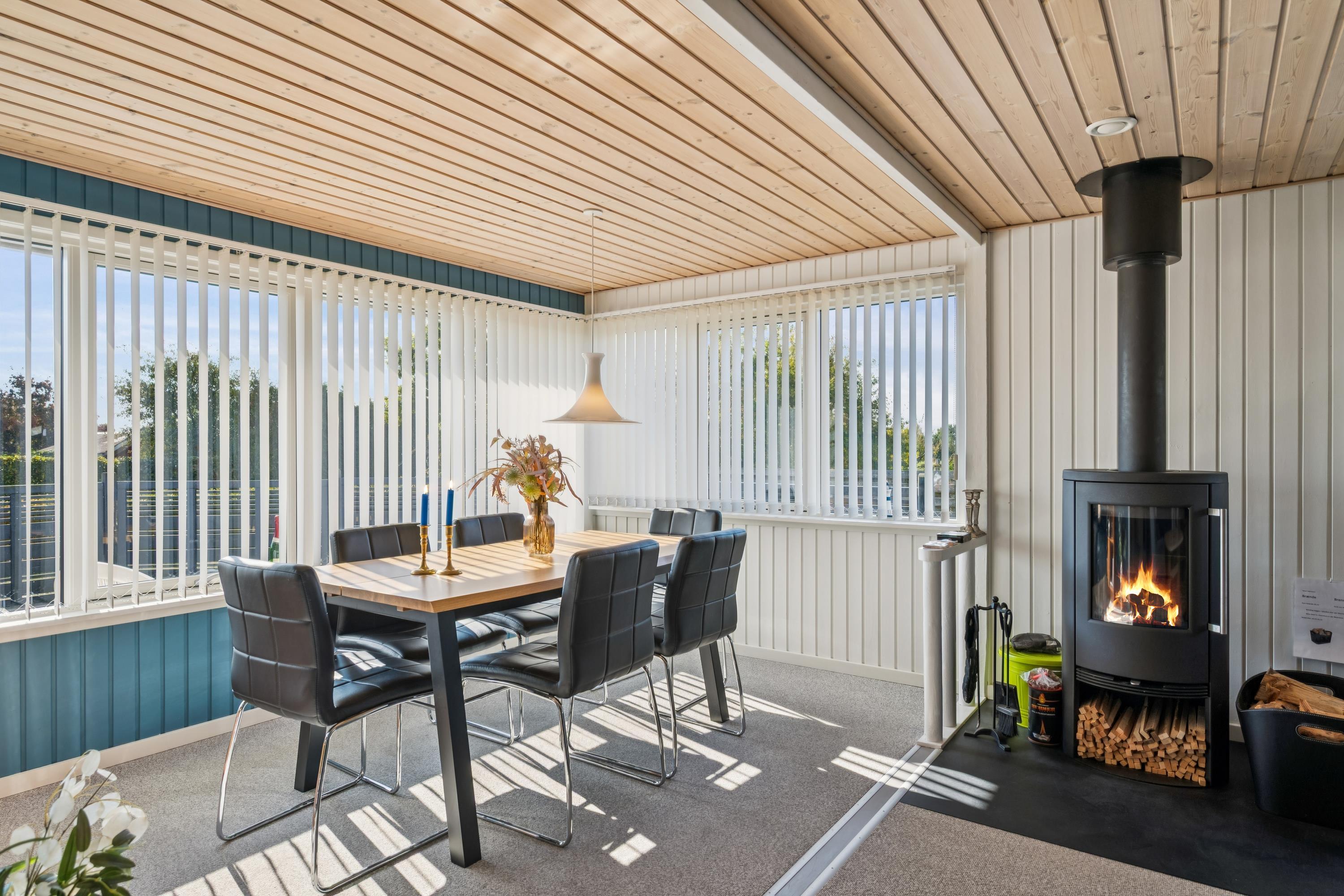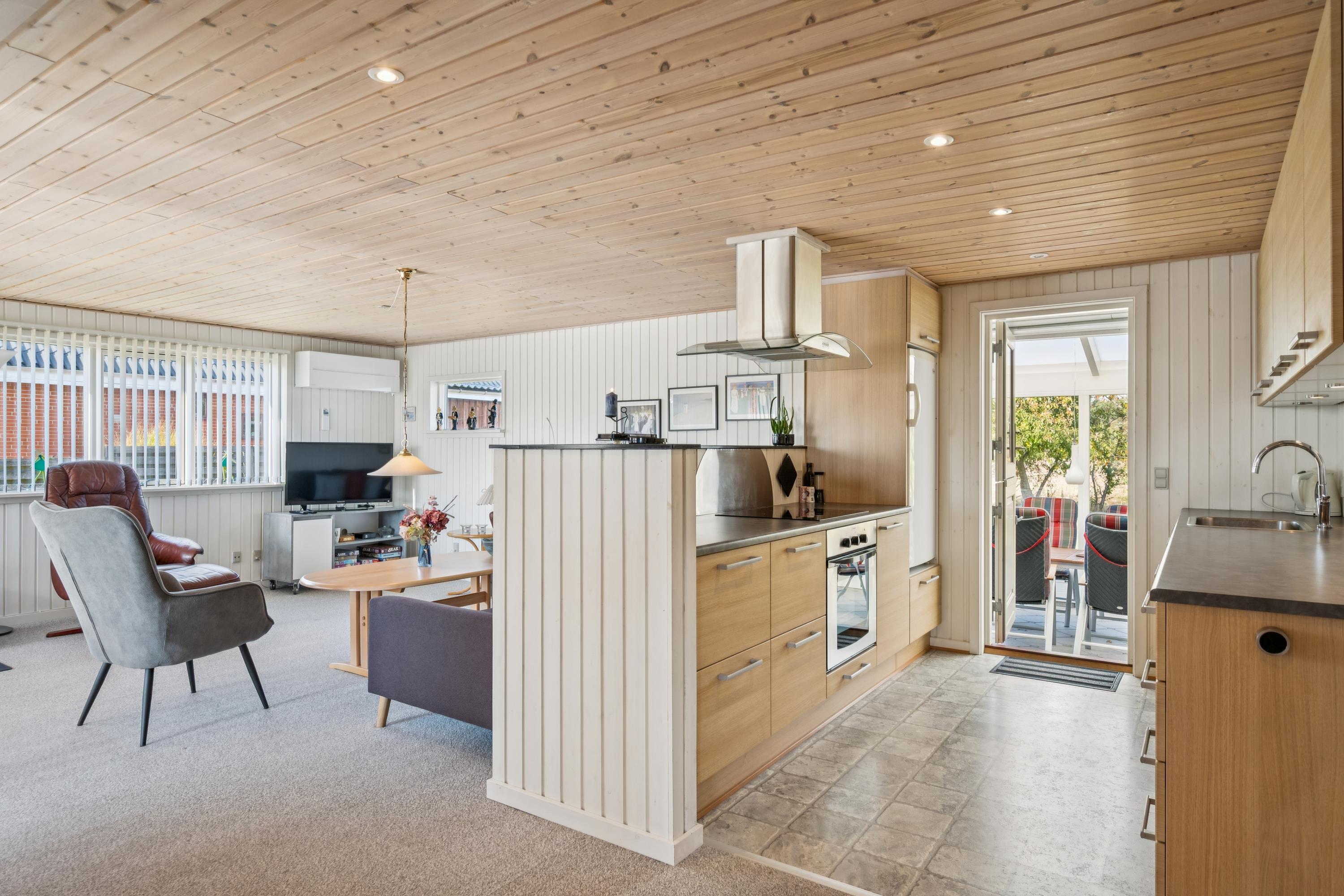 You enter directly into the large living/dining room with a wood-burning stove, comfortable sofa corner, TV with Danish (including TV2) and German channels, and a separate dining area for 6 people with a view of the garden. In open connection with the living room, there is a really nice, well-equipped kitchen with ample workspace and a stove with ceramic hobs and oven, fridge/freezer, dishwasher, and microwave. From the kitchen, there is also an exit to the conservatory. The house accommodates 6 sleeping places distributed among 2 good bedrooms with double beds and 1 slightly smaller room/annex with an entrance from the conservatory. New, regular bathroom with a shower, cabinet arrangement, and washing machine. There are, among other things, darts, a foosball table, and table tennis available in the newly furnished activity section, and there is internet in the house. Firewood can be purchased from the owner for the wood-burning stoves.