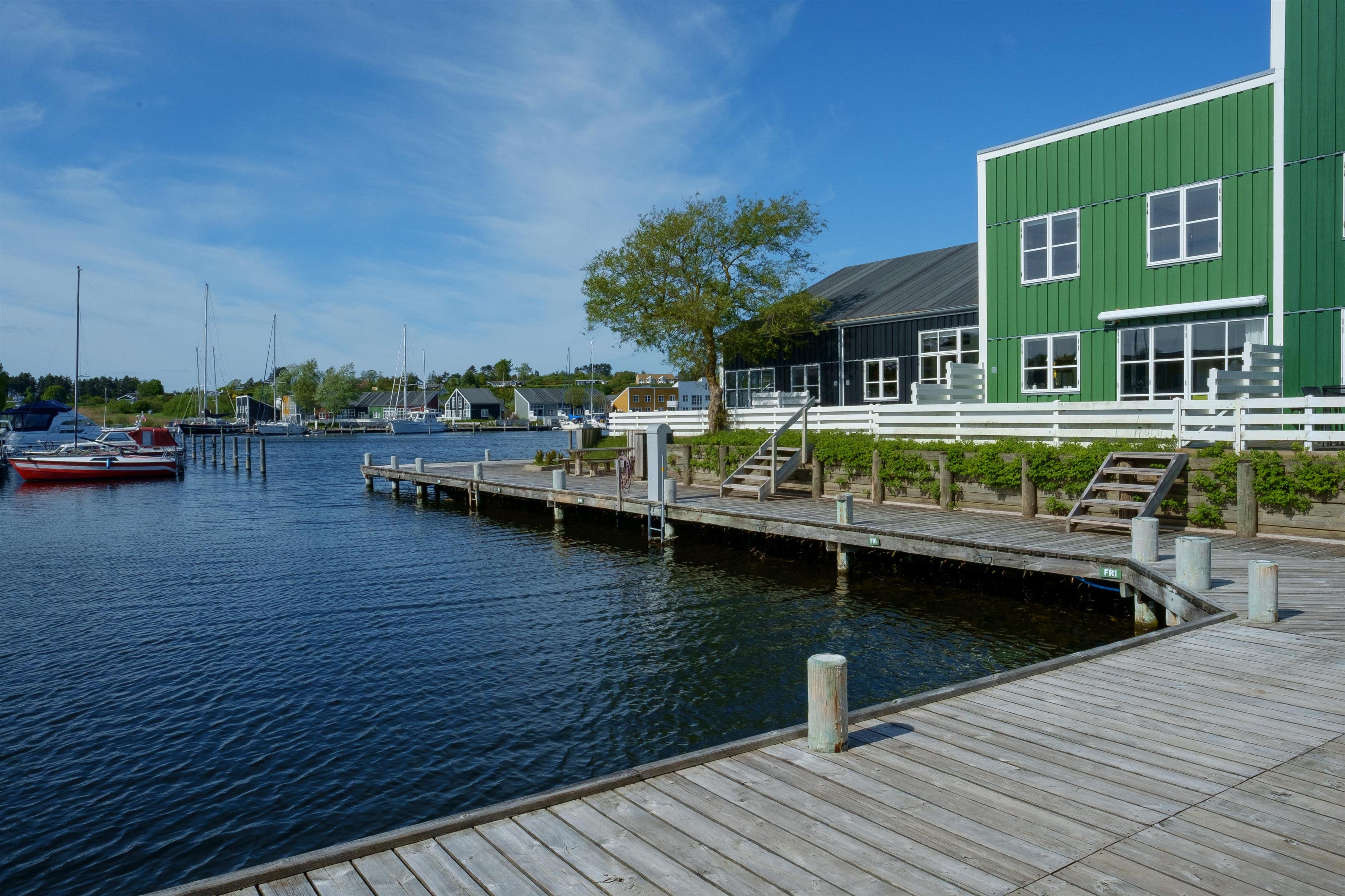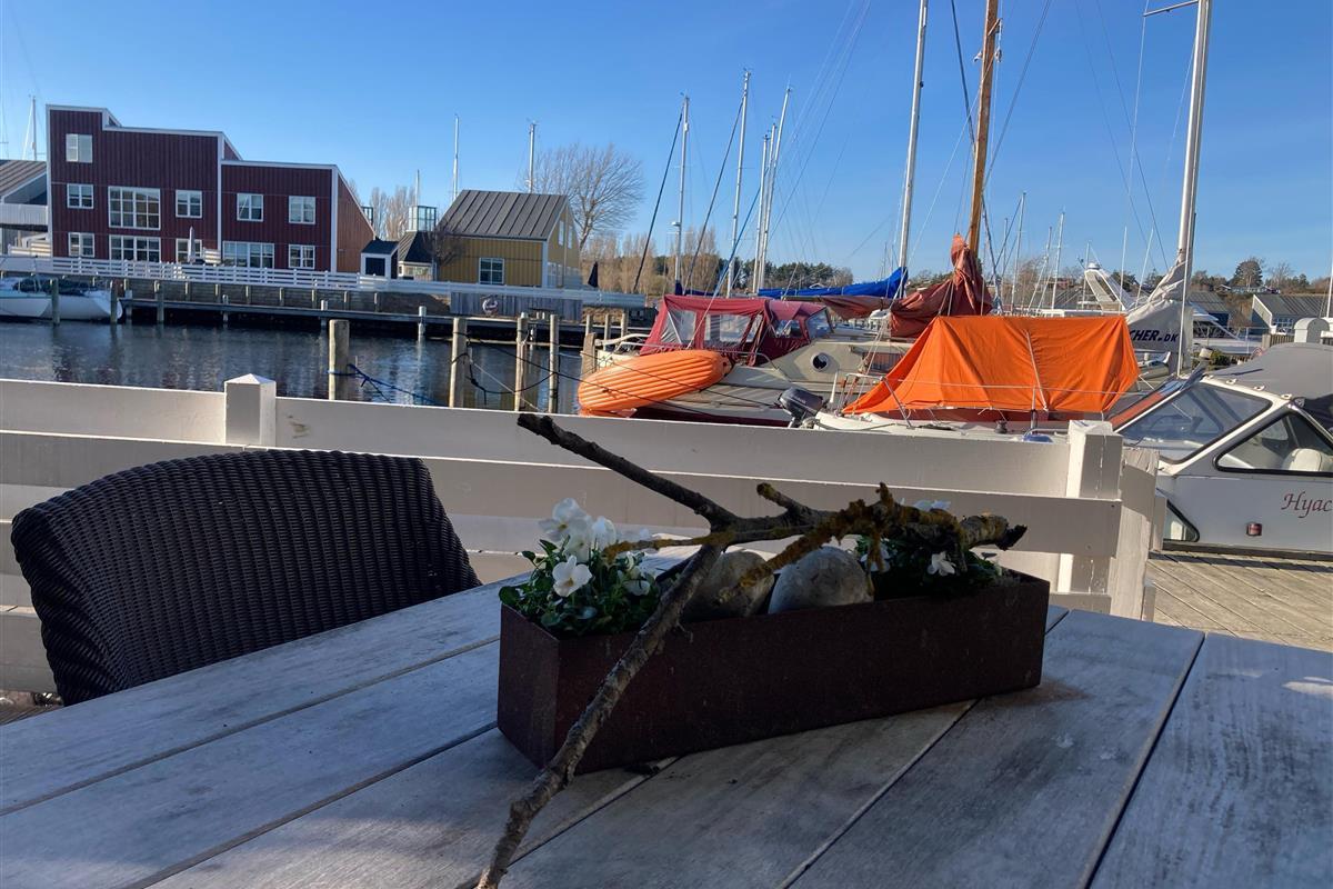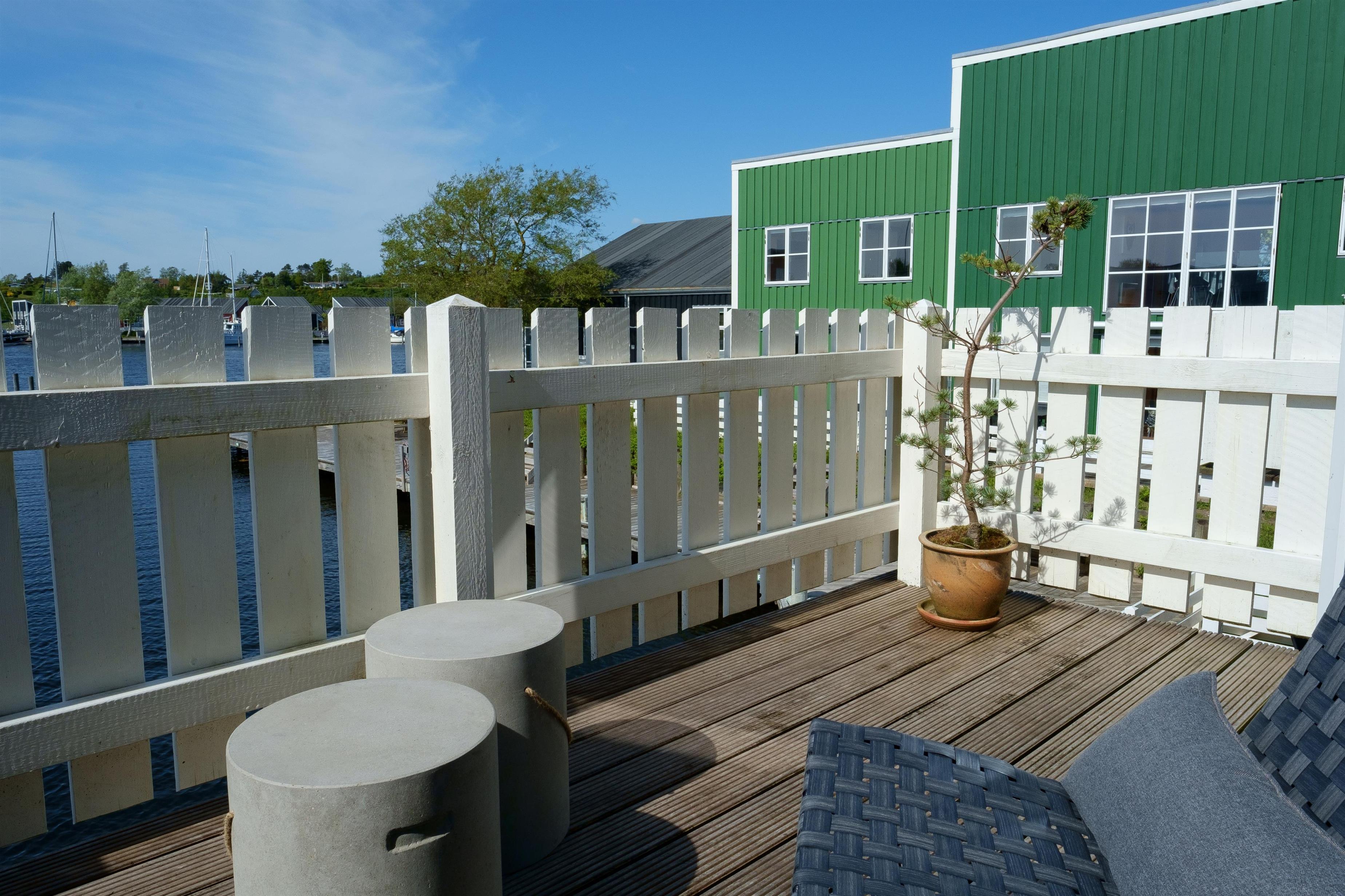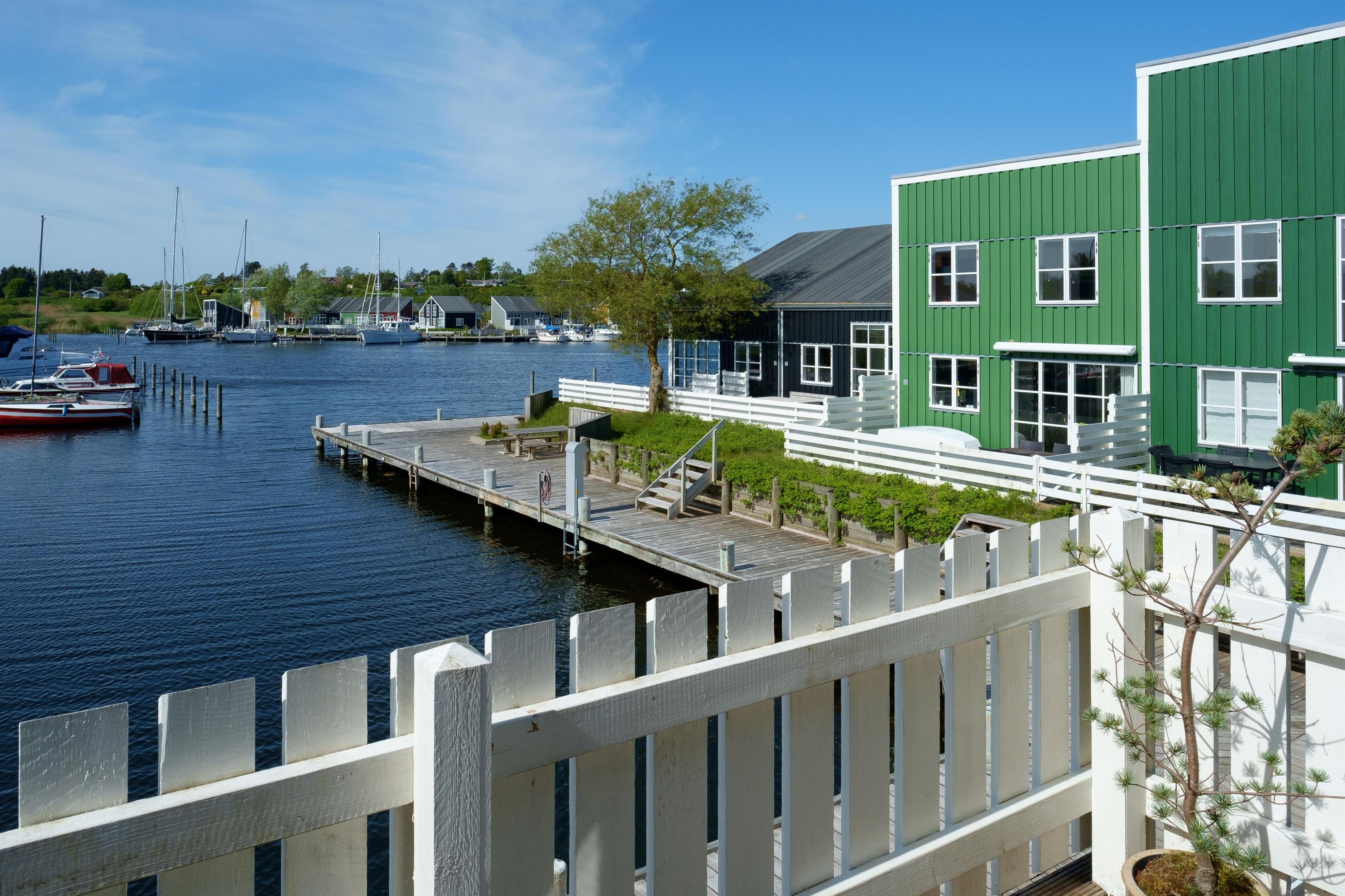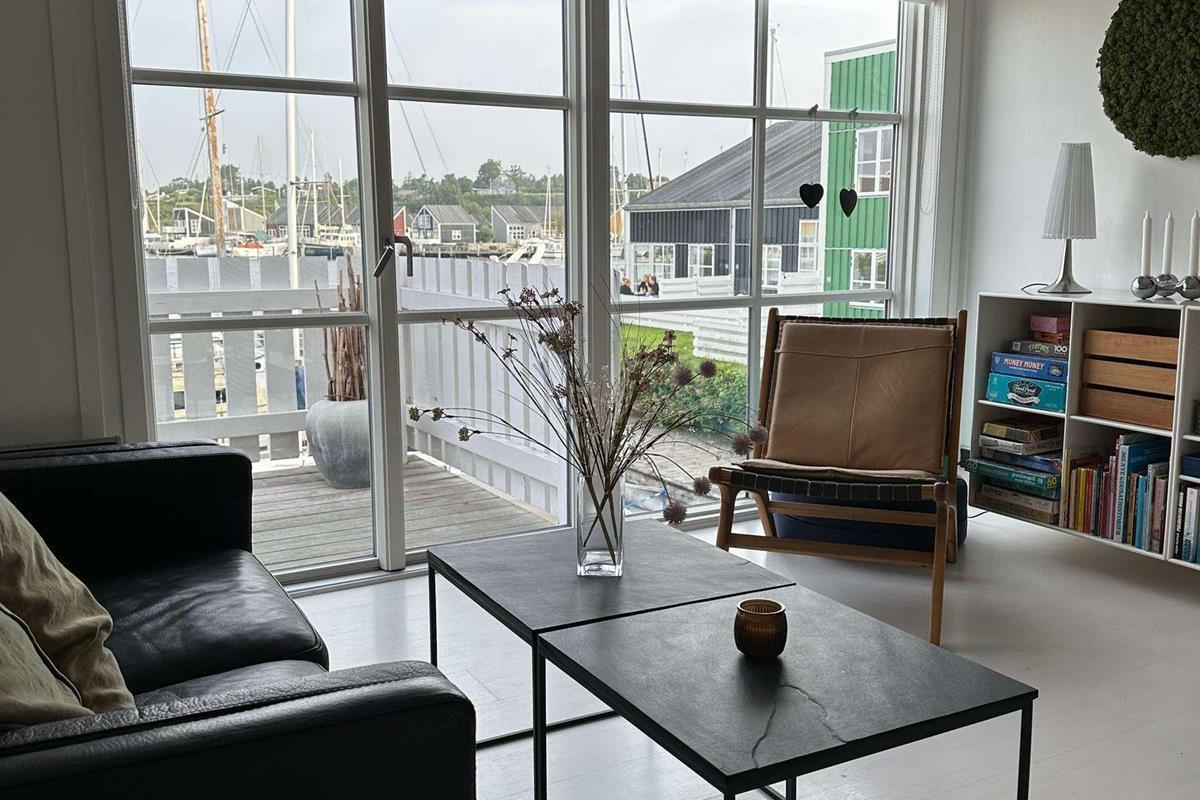 Renovated and exceptionally well-appointed holiday apartment on 2 levels located in the scenic Øer Maritime Holiday Village, with a delightful view of the boat moorings from the east-facing wooden terrace and common area, as well as from the balcony and living room on the 1st floor. The house is equipped with garden furniture, sun loungers, a parasol, and a grill. Additionally, the house features a lovely, tiled courtyard by the entrance door to the west.