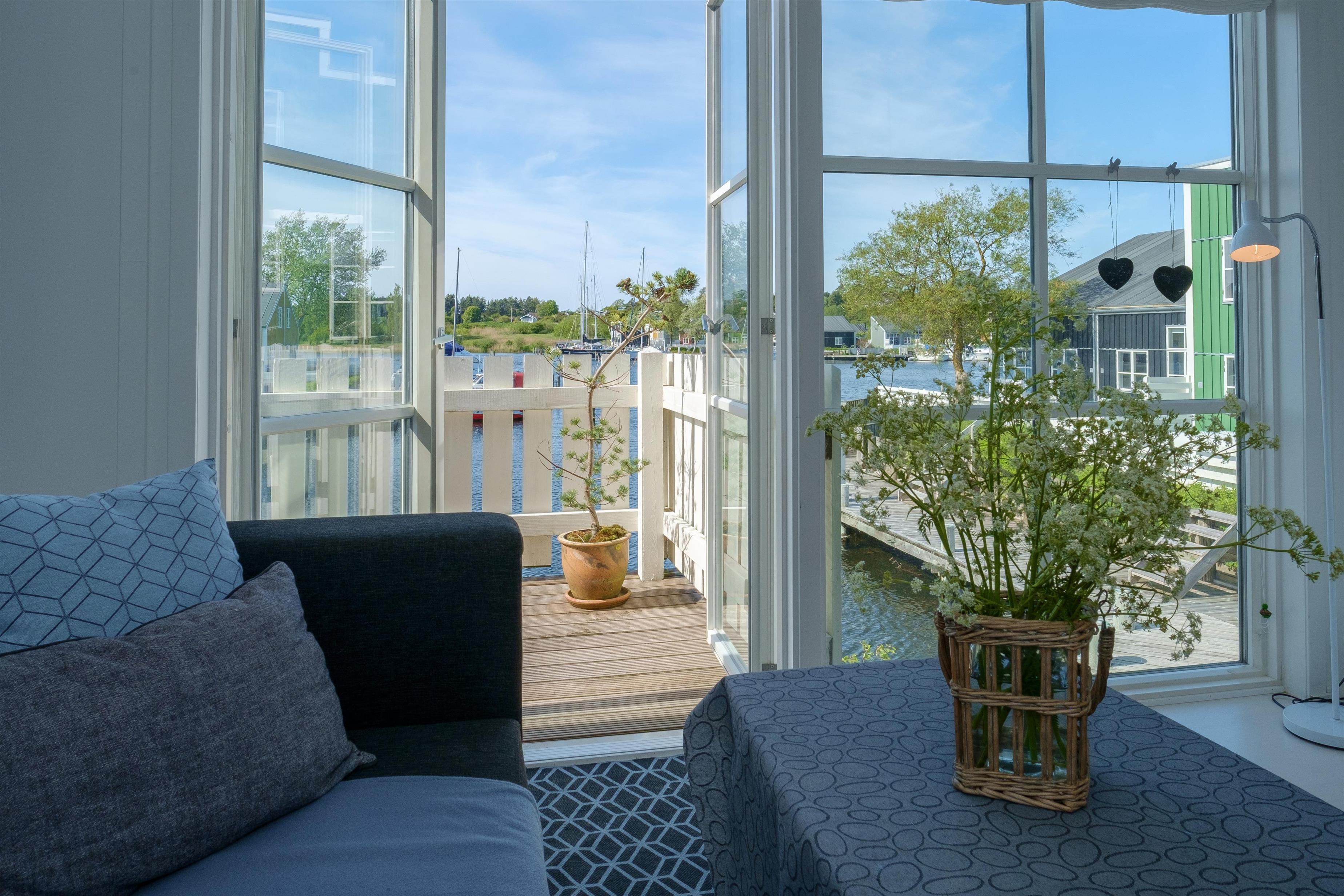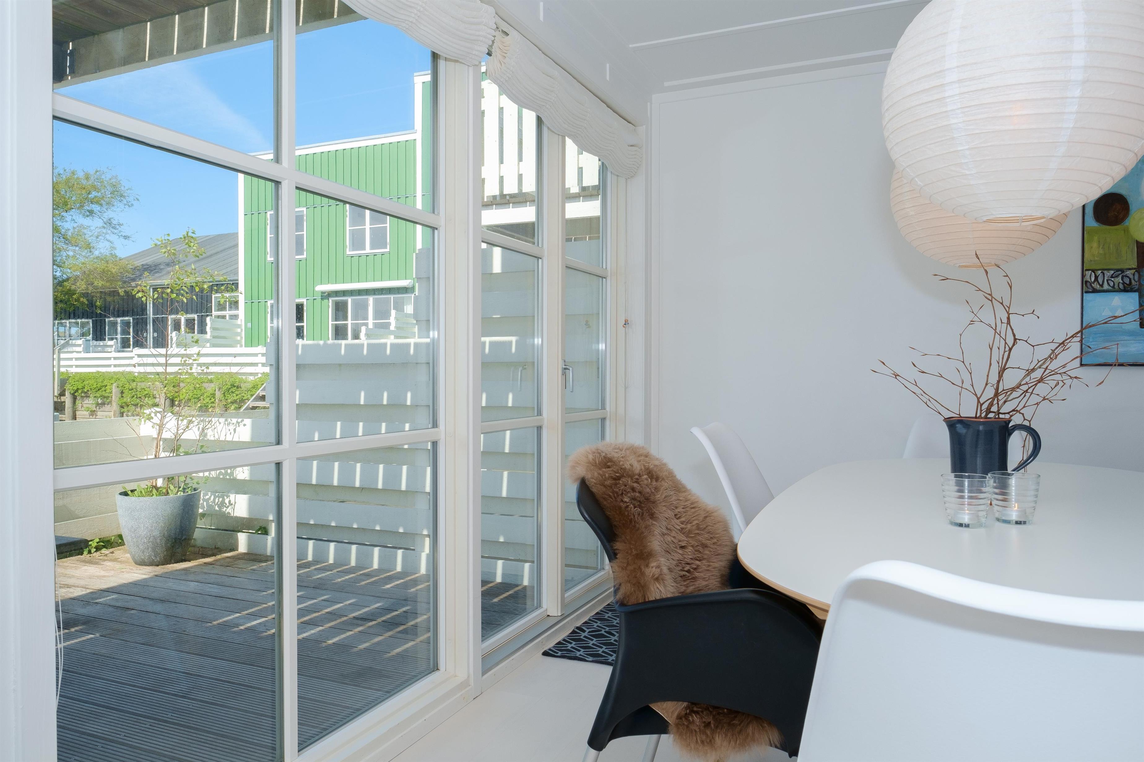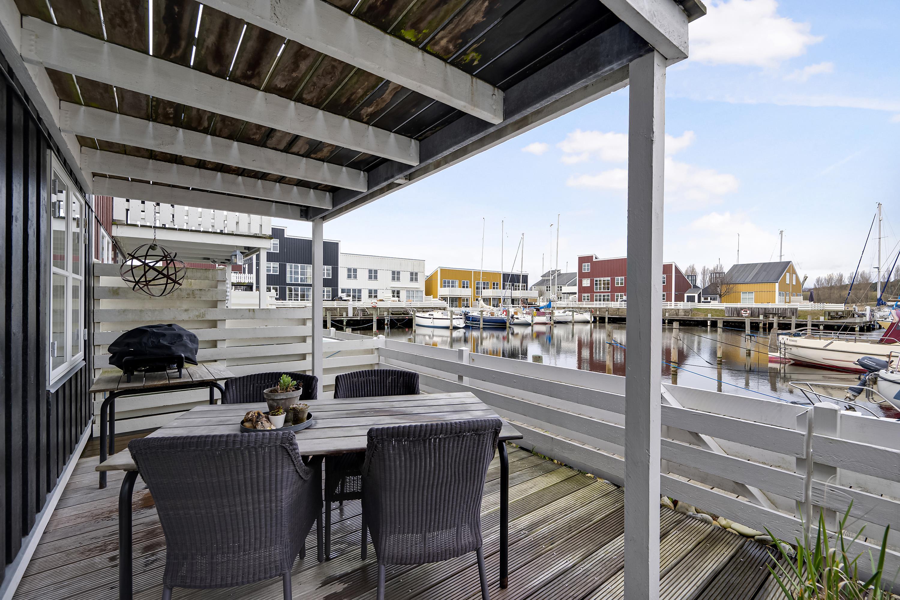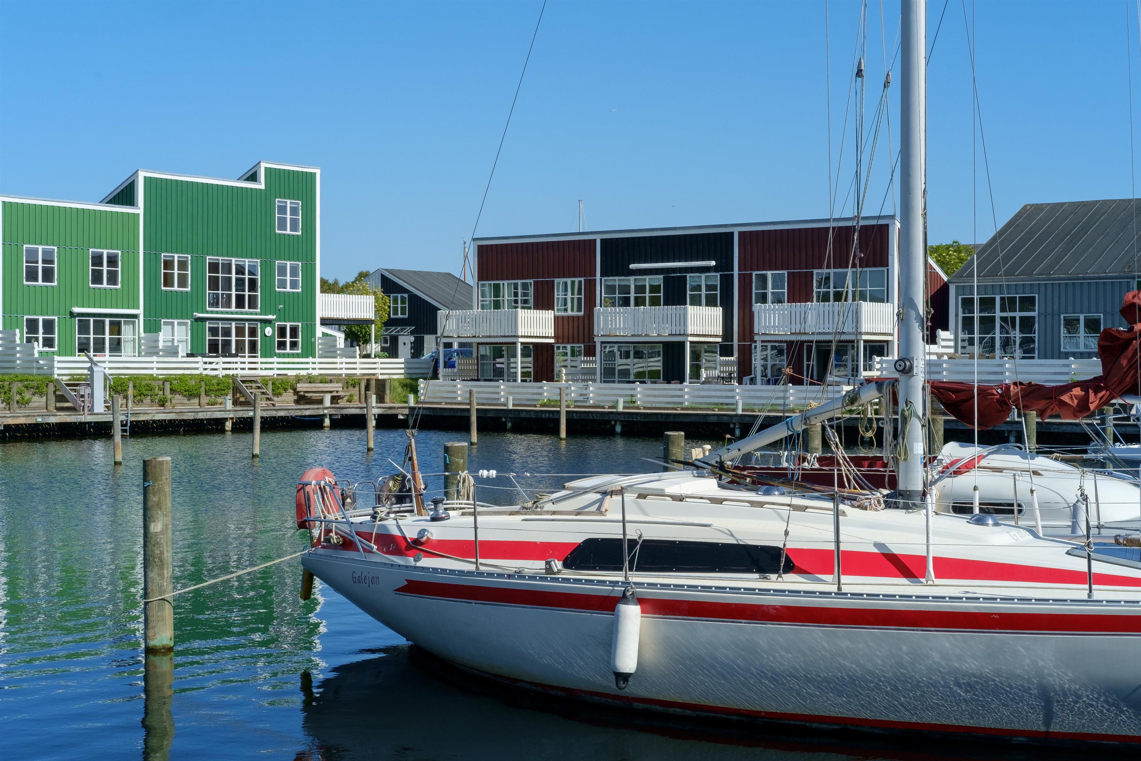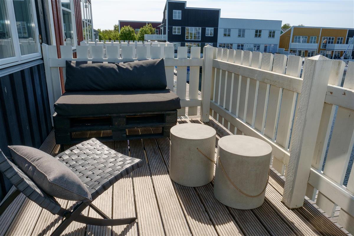 Renovated and exceptionally well-appointed holiday apartment on 2 levels located in the scenic Øer Maritime Holiday Village, with a delightful view of the boat moorings from the east-facing wooden terrace and common area, as well as from the balcony and living room on the 1st floor. The house is equipped with garden furniture, sun loungers, a parasol, and a grill. Additionally, the house features a lovely, tiled courtyard by the entrance door to the west.