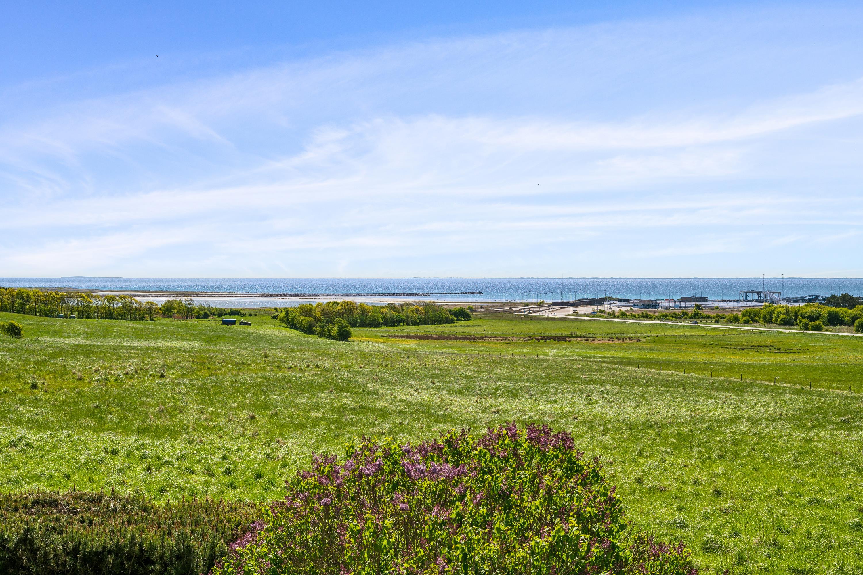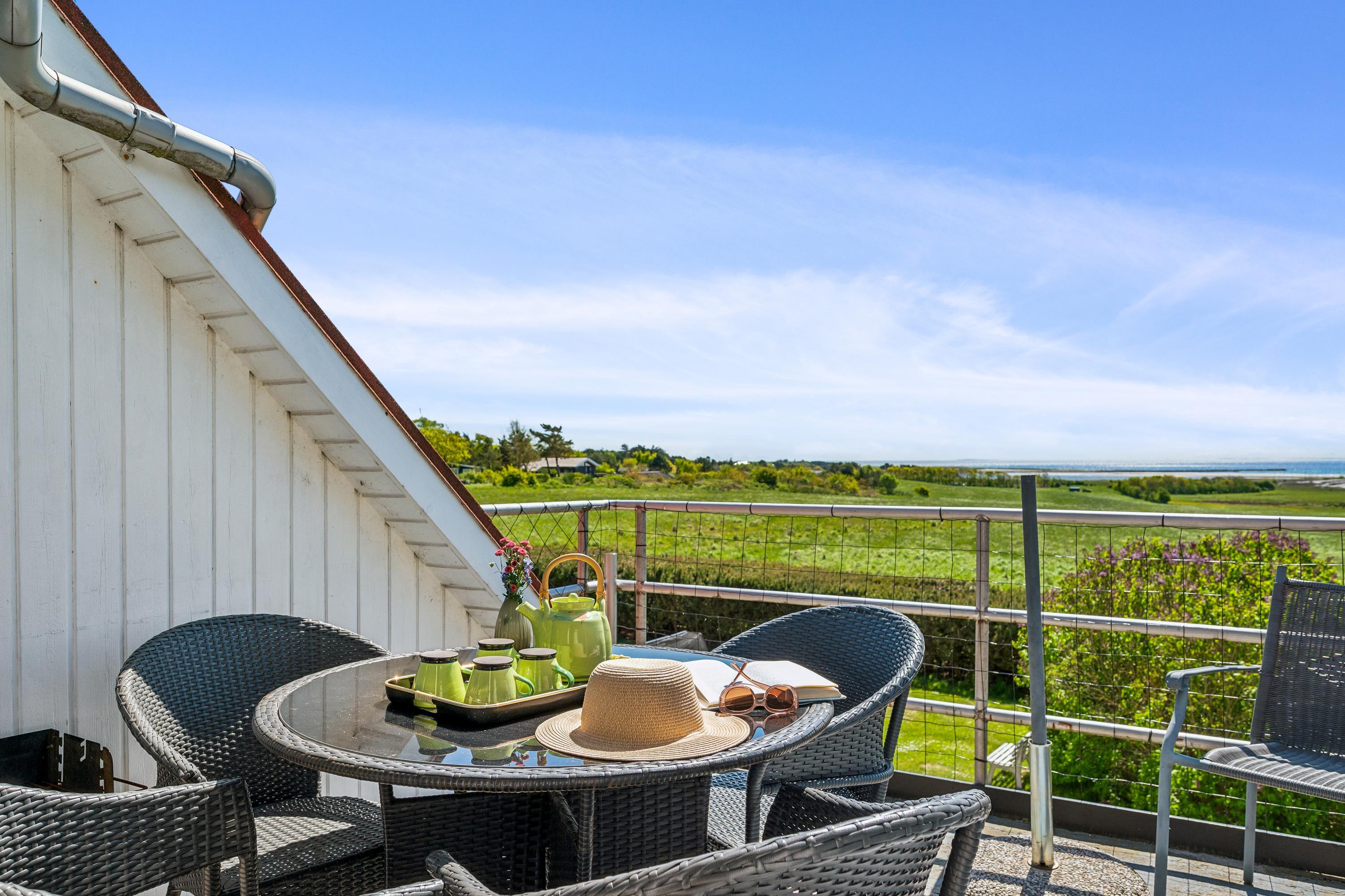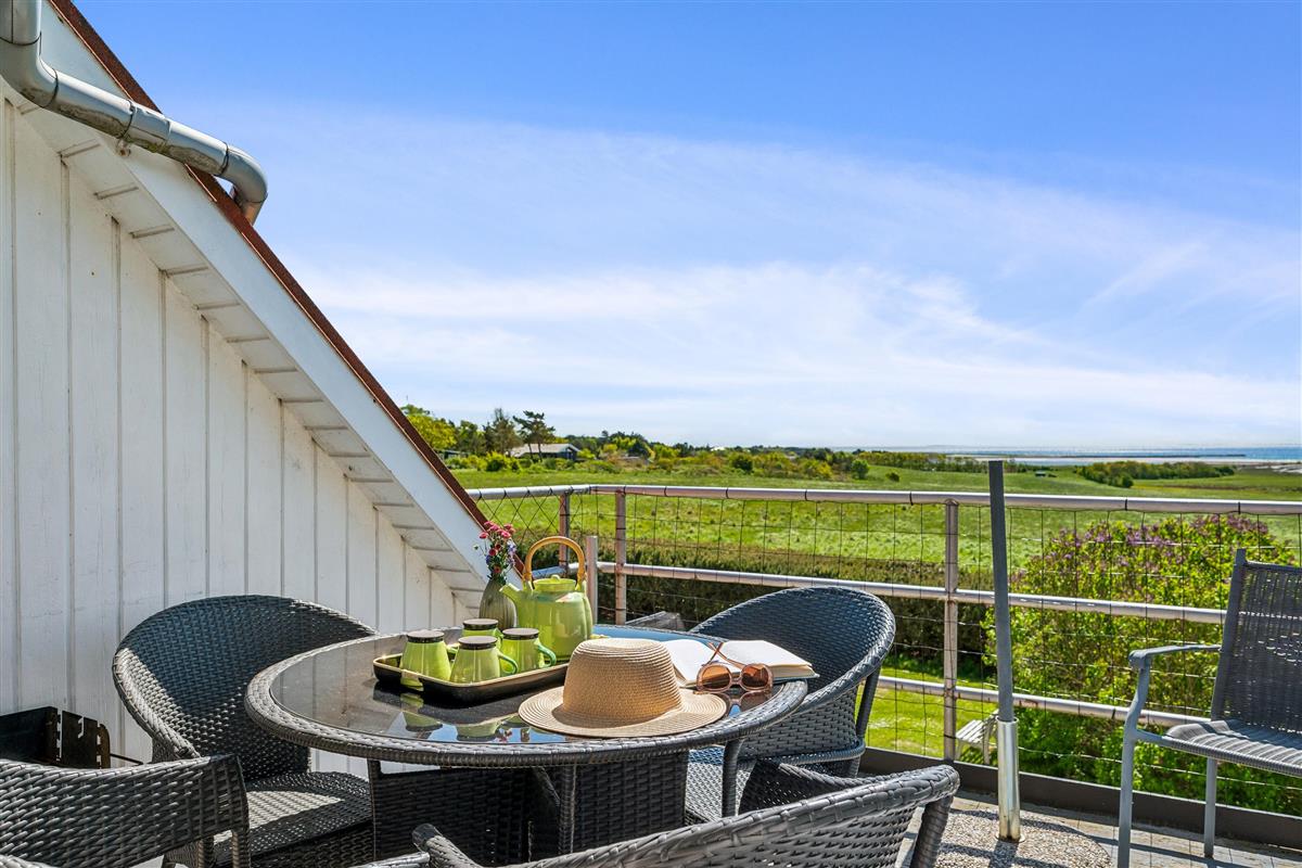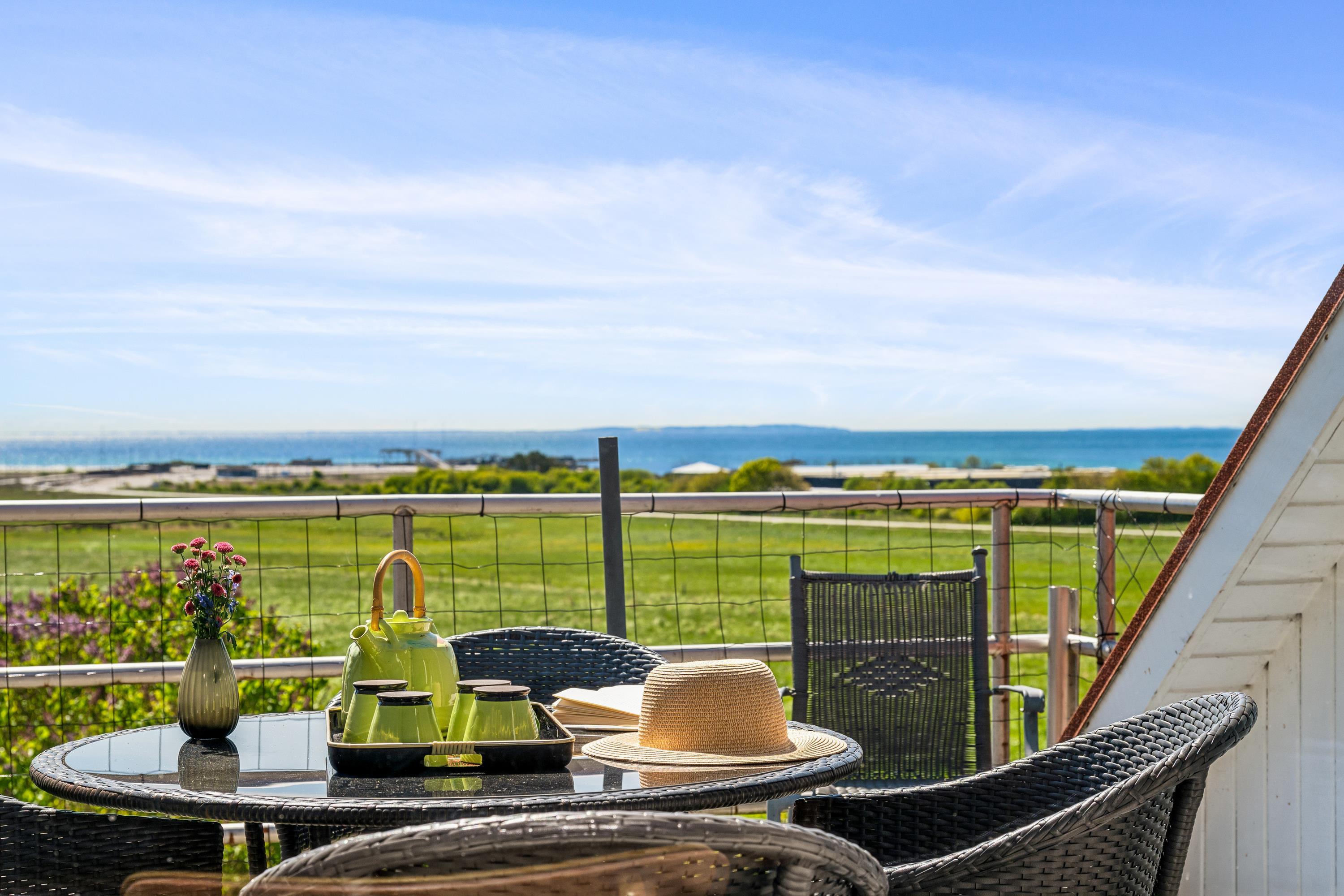 Well-maintained, bright, and inviting holiday apartment on an elevated, open natural plot with panoramic views of the Kattegat Sea and the hilly landscape south of Ebeltoft. The apartment is on the 1st floor and has a southwest-facing balcony with garden furniture and a grill. On the large lot, shared with three other holiday apartments, there is a bonfire area as well as a swing set and sandbox for the children.