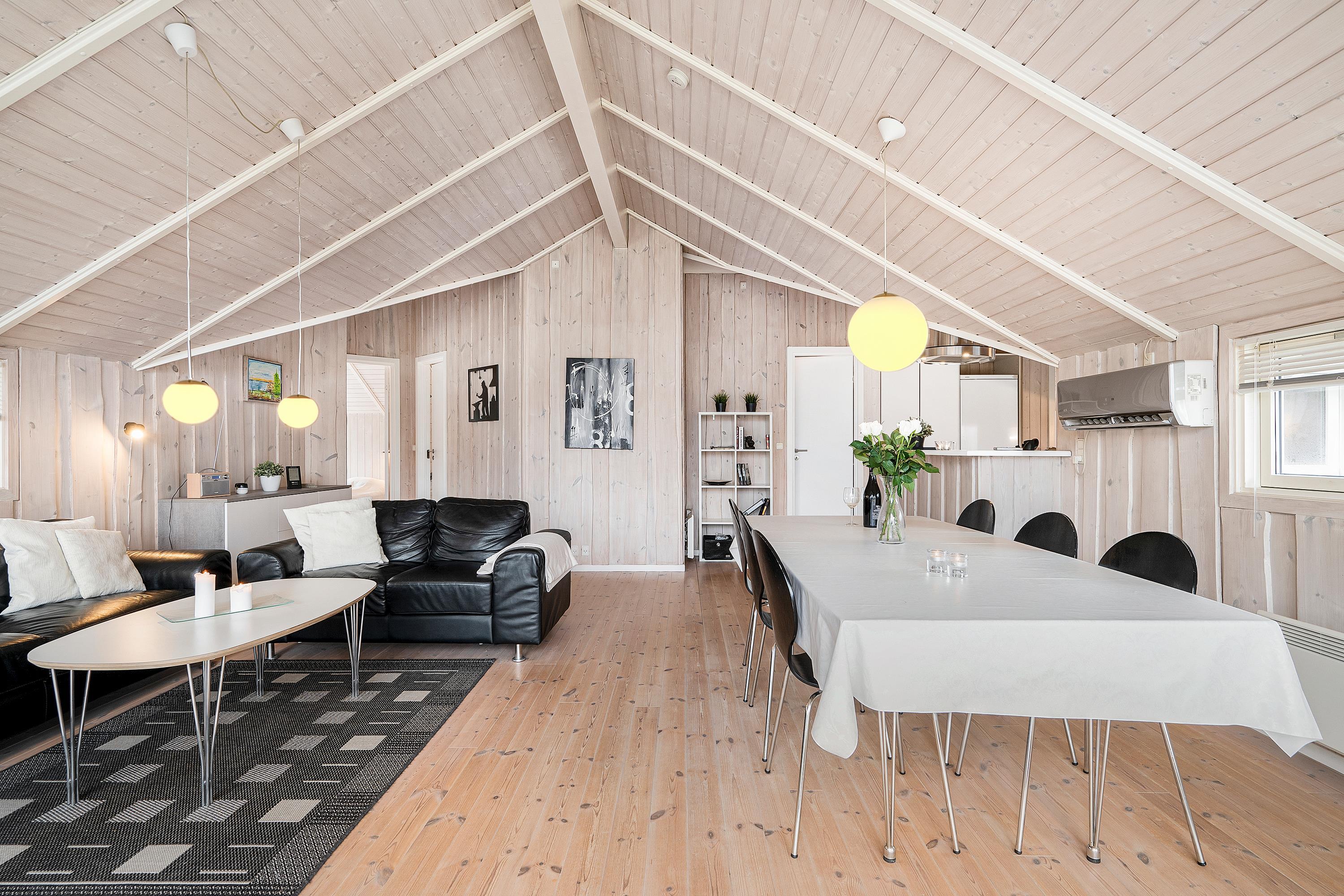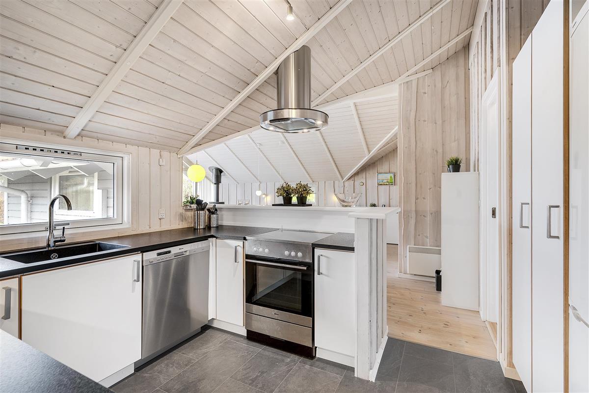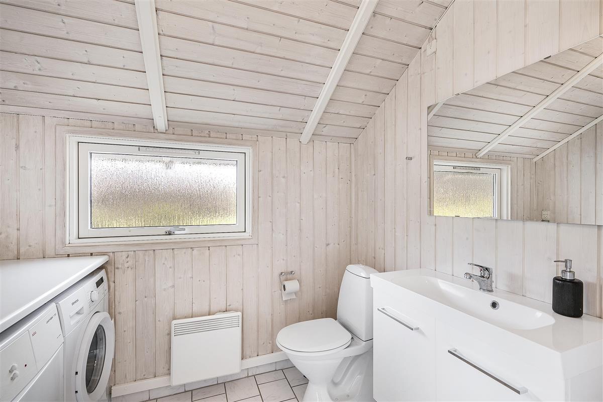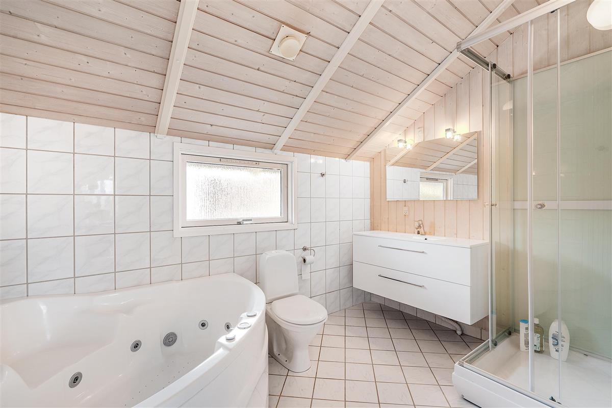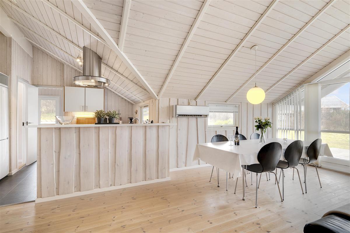 Bright and lovely living room in open connection with the kitchen and with access to the terrace. It features a wood-burning stove, dining area for 8 people, sofa furniture, and TV with Danish (including TV2) and German channels. Newer, well-equipped kitchen with a stove with ceramic hobs and oven, refrigerator/freezer, and dishwasher. The house accommodates 8 sleeping places distributed among 3 good bedrooms with double beds and 1 room with 2 single beds. Spacious and luxurious tiled bathroom with a shower, whirlpool, and sauna, as well as a slightly smaller bathroom with a washing machine and a dryer, both wet rooms with underfloor heating. The house has a heat pump with air conditioning, and there is internet access.