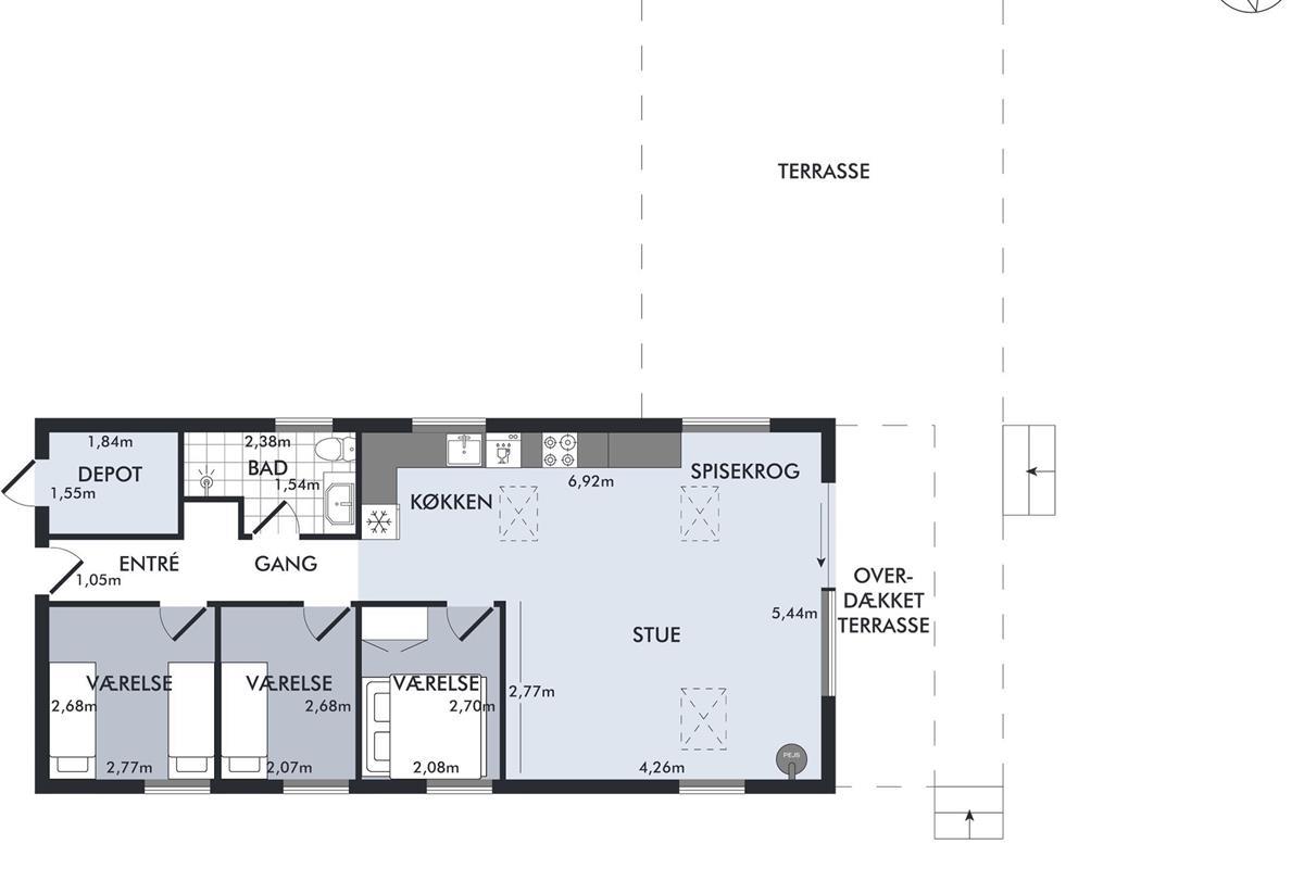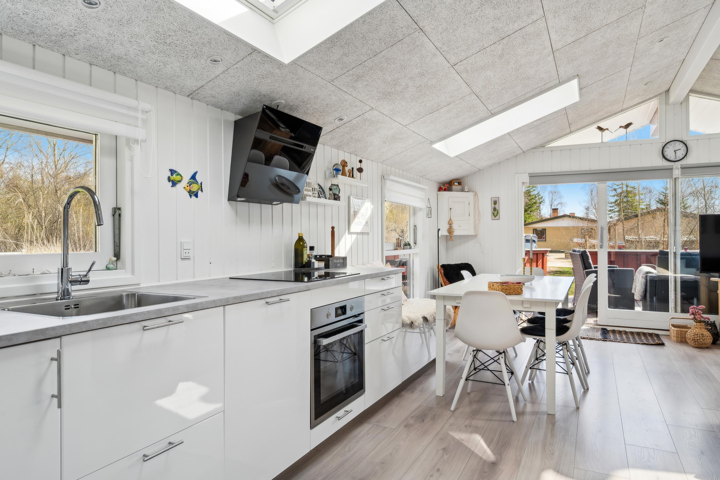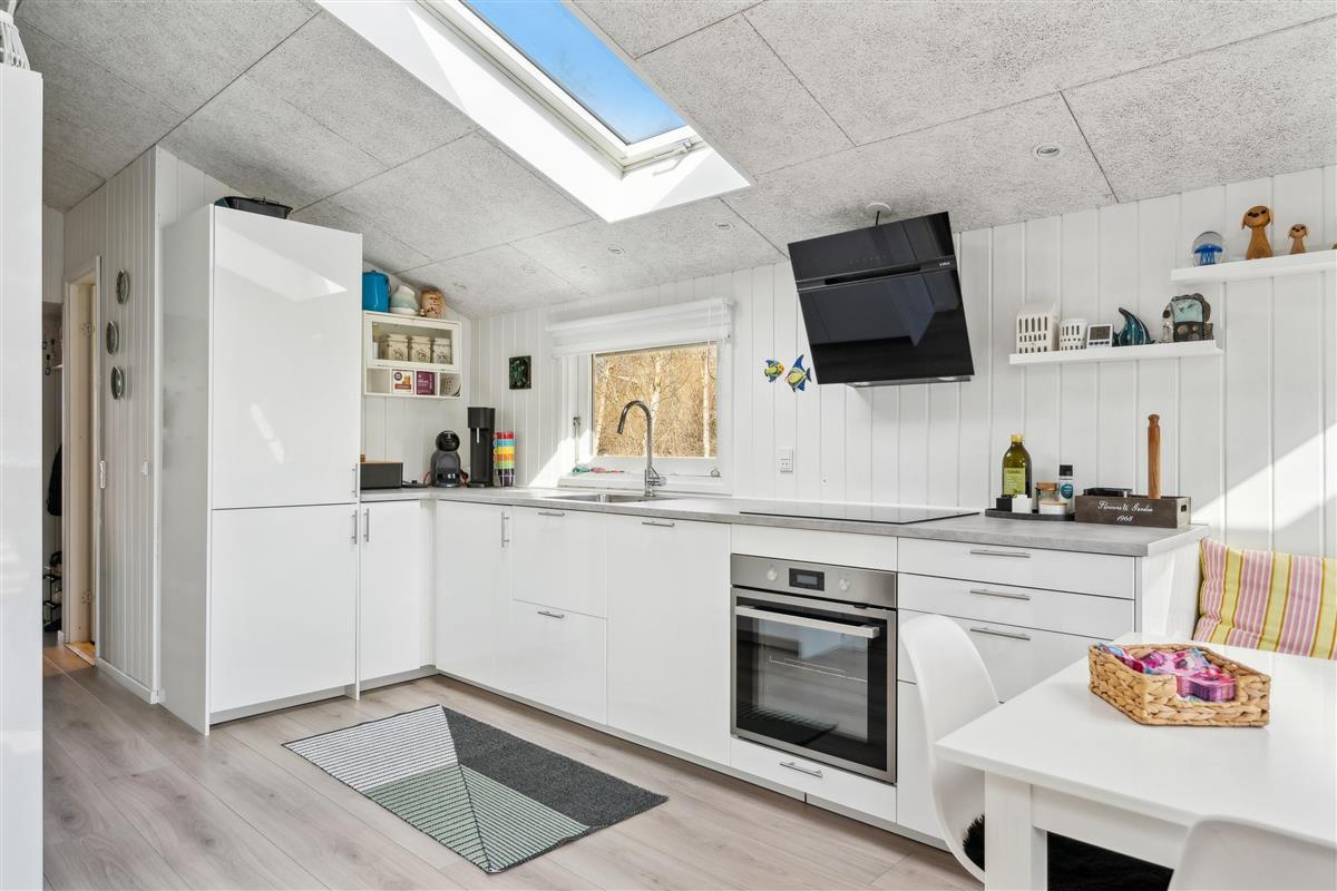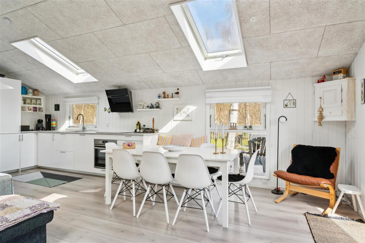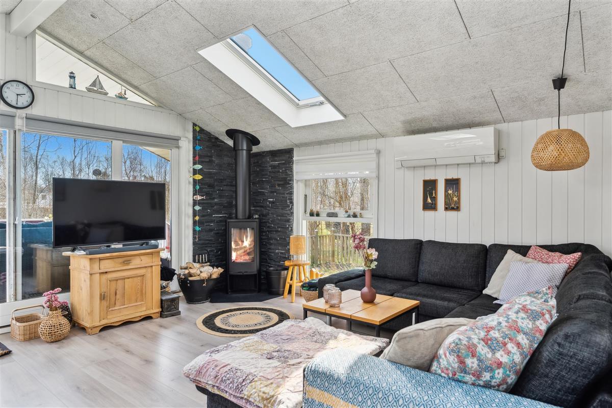 Already upon entering the hallway, you can sense the genuine holiday home atmosphere in this cozy house. The living room is tastefully furnished, featuring comfortable furniture, a heat pump, and a wood-burning stove. From the living room, there is access to a lovely covered terrace with lounge furniture and to a large open terrace with garden furniture and a barbecue.
