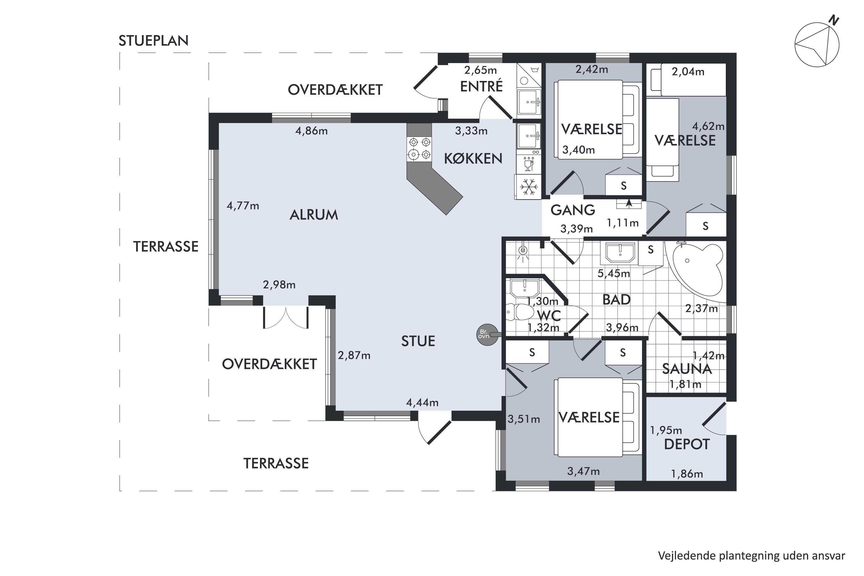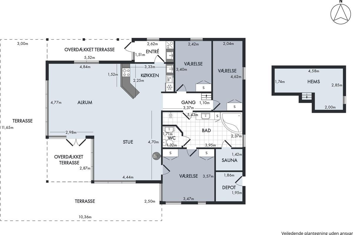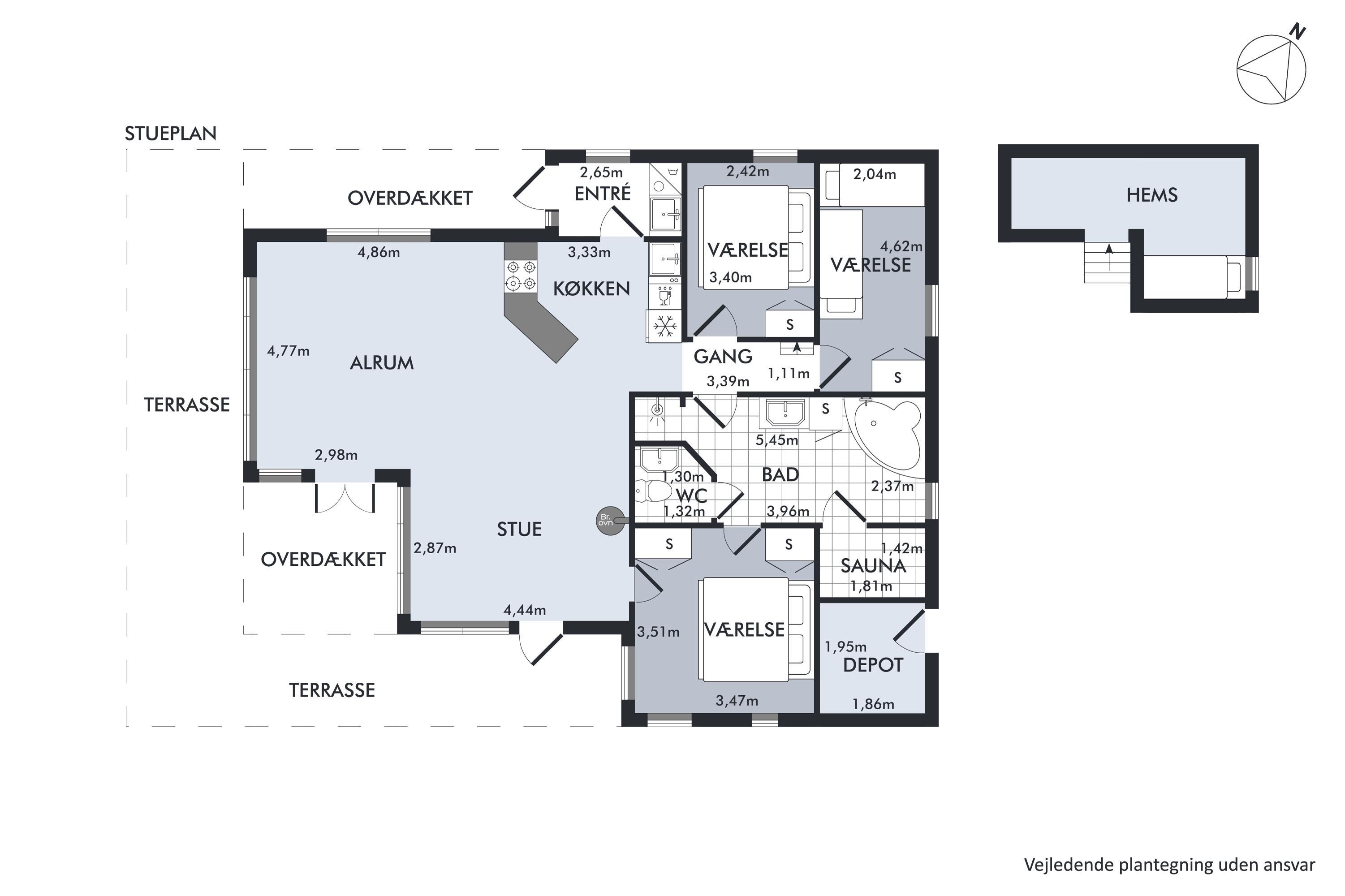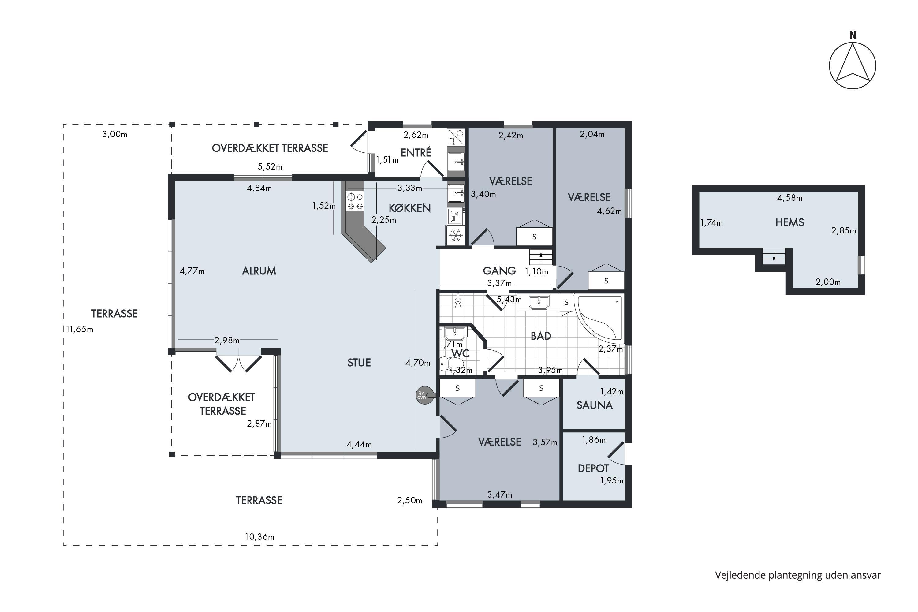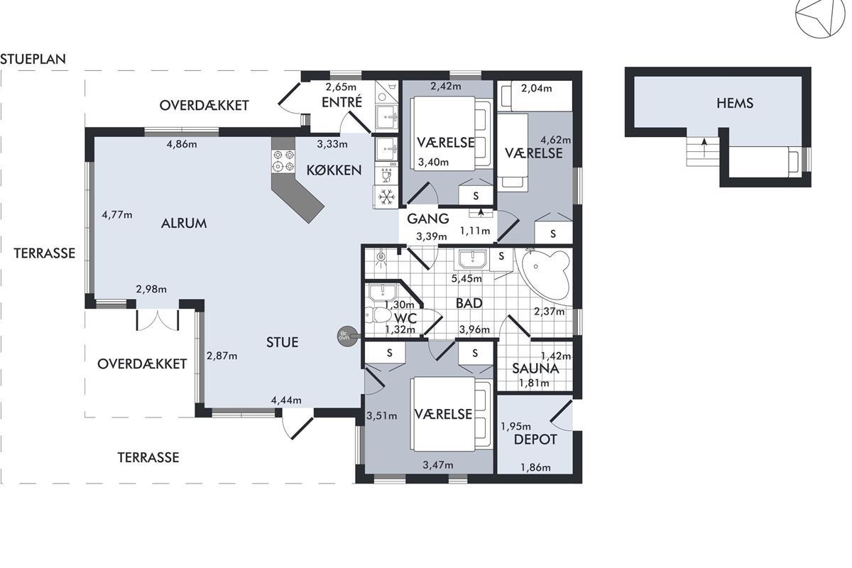 The house is bright and welcoming throughout, featuring high ceilings and good natural light. The spacious living room with panoramic windows and access to the terrace includes a wood-burning stove, a comfortable sofa area, TV with Danish channels (including TV2), and a dining area for 8 people. In open connection with the living room is a well-equipped, modern kitchen with ceramic hobs, oven, refrigerator/freezer, dishwasher, and microwave. The 8 sleeping spaces are distributed among 2 large rooms with double beds, 1 smaller room with 1 single bed and a bunk bed, as well as a spacious loft with a double bed and a single bed. Lovely bathroom with a shower, spa bath, and sauna. Underfloor heating in all wet rooms. In a separate room connected to the kitchen, you'll find a washing machine and a tumble dryer. Internet access is available.