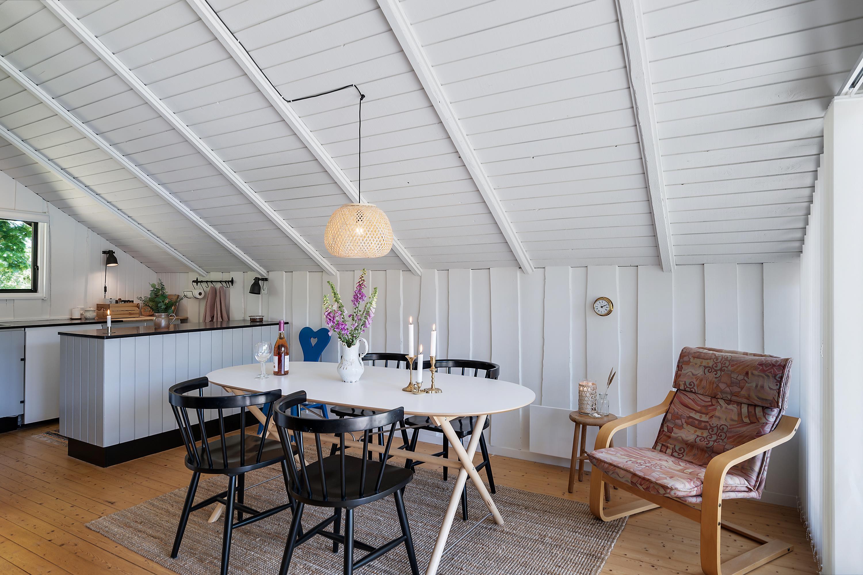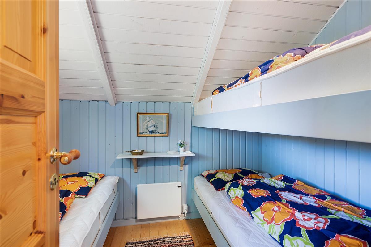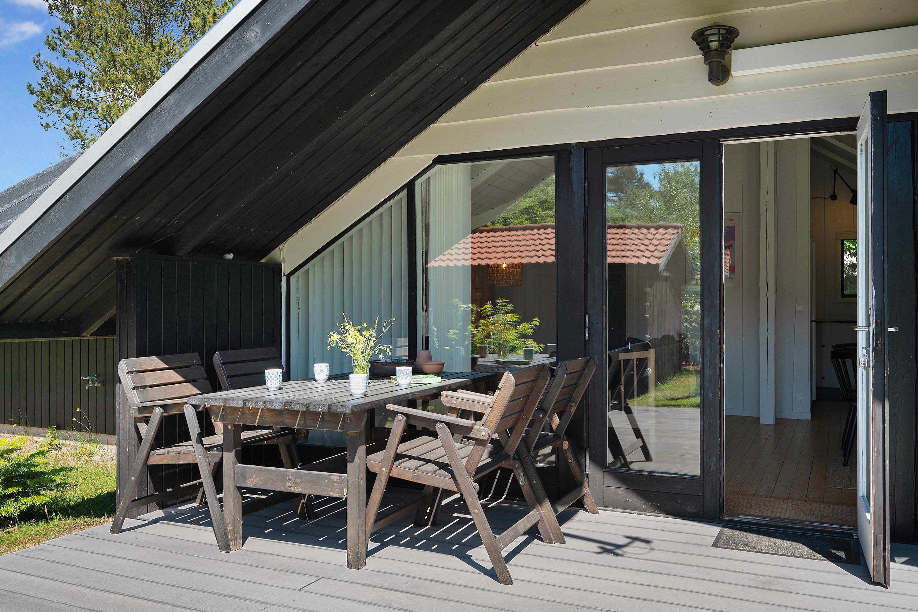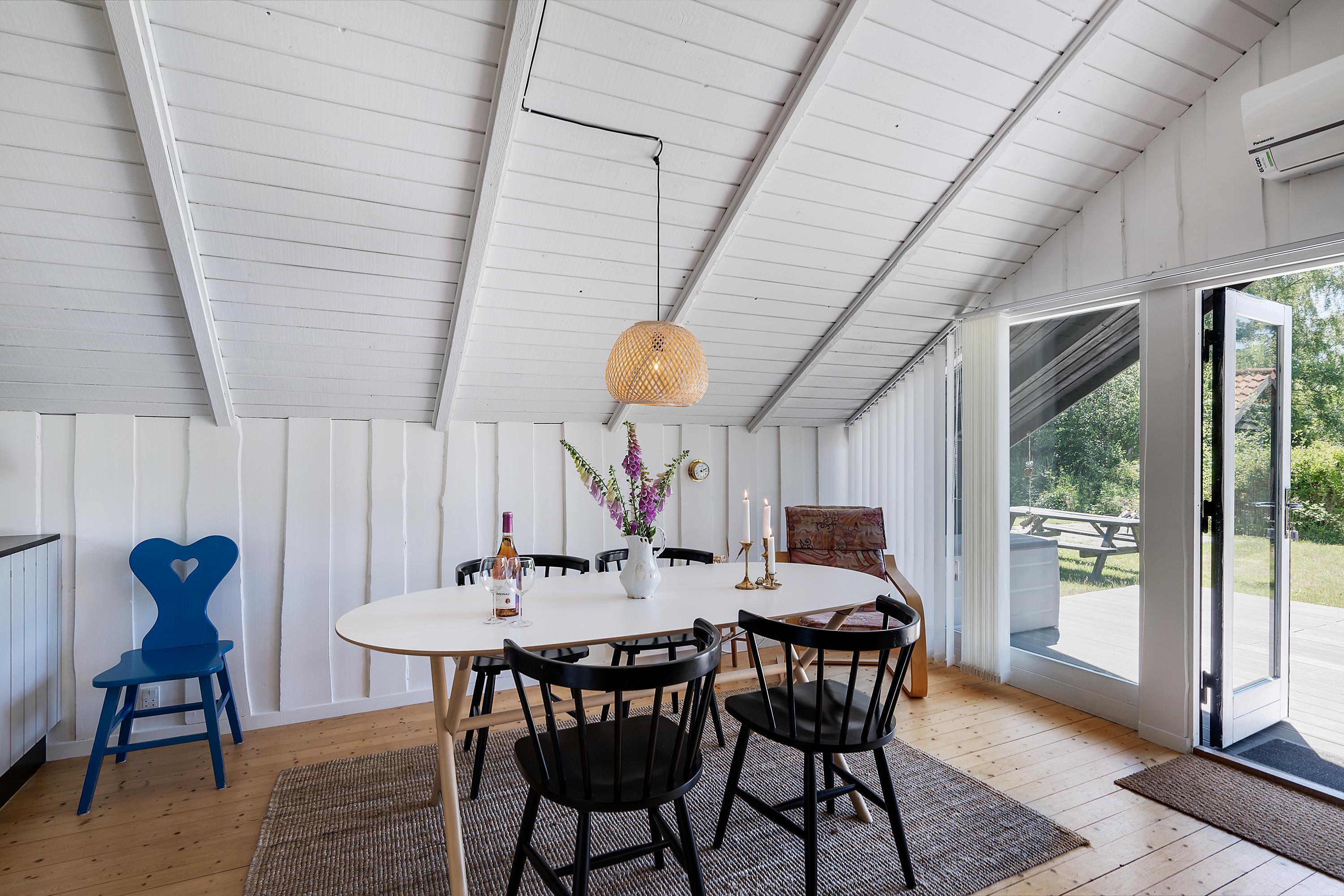 As soon as you open the door and step into the entrance, you sense the genuine cottage atmosphere in this house. Here, you'll find a well-appointed and truly cozy living room with good furniture and, among other things, a heat pump. From the living room, there is access to a lovely covered terrace, where you can sit and eat in peace while observing the rich wildlife in the area. Connected to the dining area, you'll find the smaller but functional kitchen with a dishwasher. The sleeping places in the house are located in the three cozy bedrooms, including one room with a double bed and two rooms with bunk beds. Nice and bright bathroom with a shower. There is internet in the house.