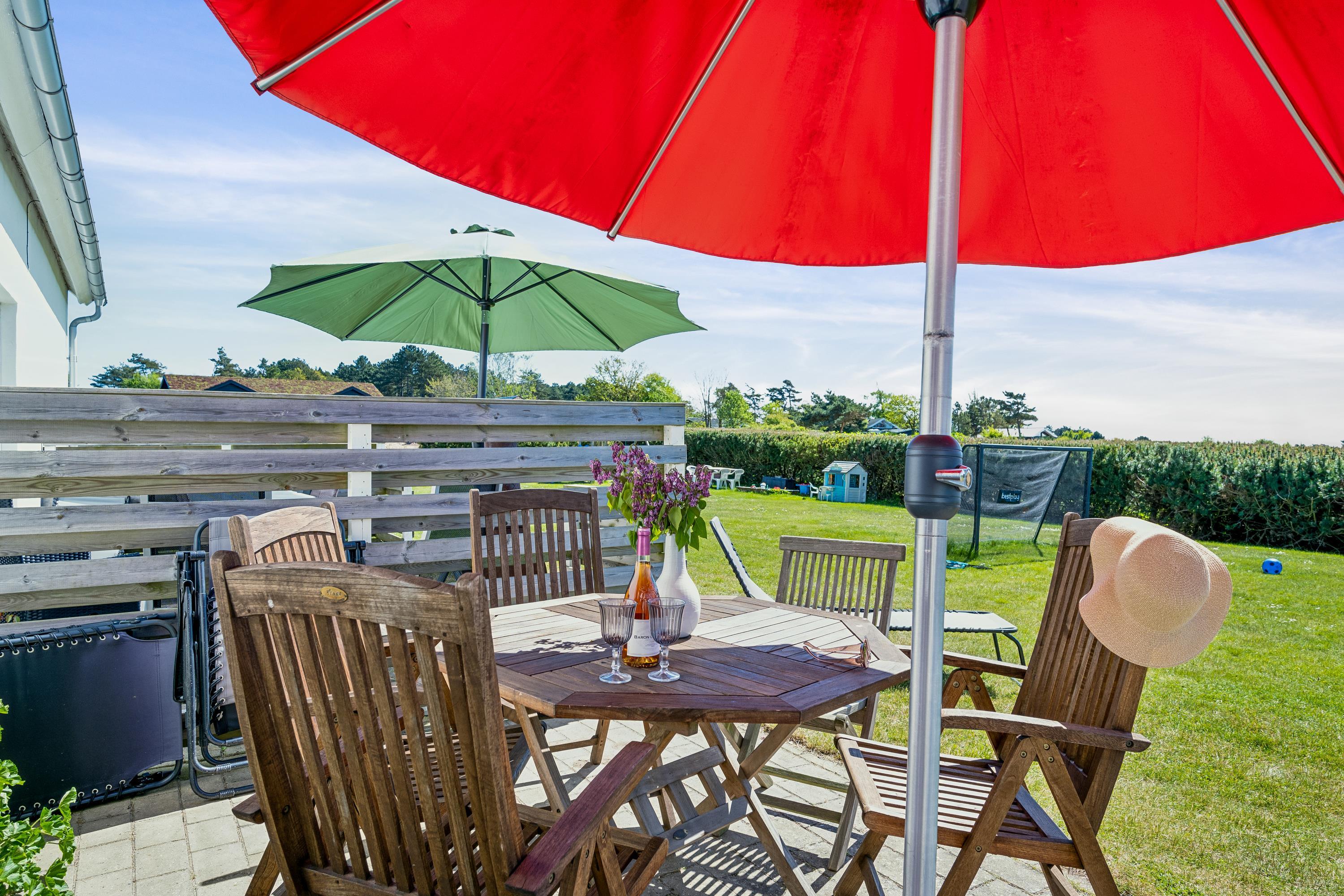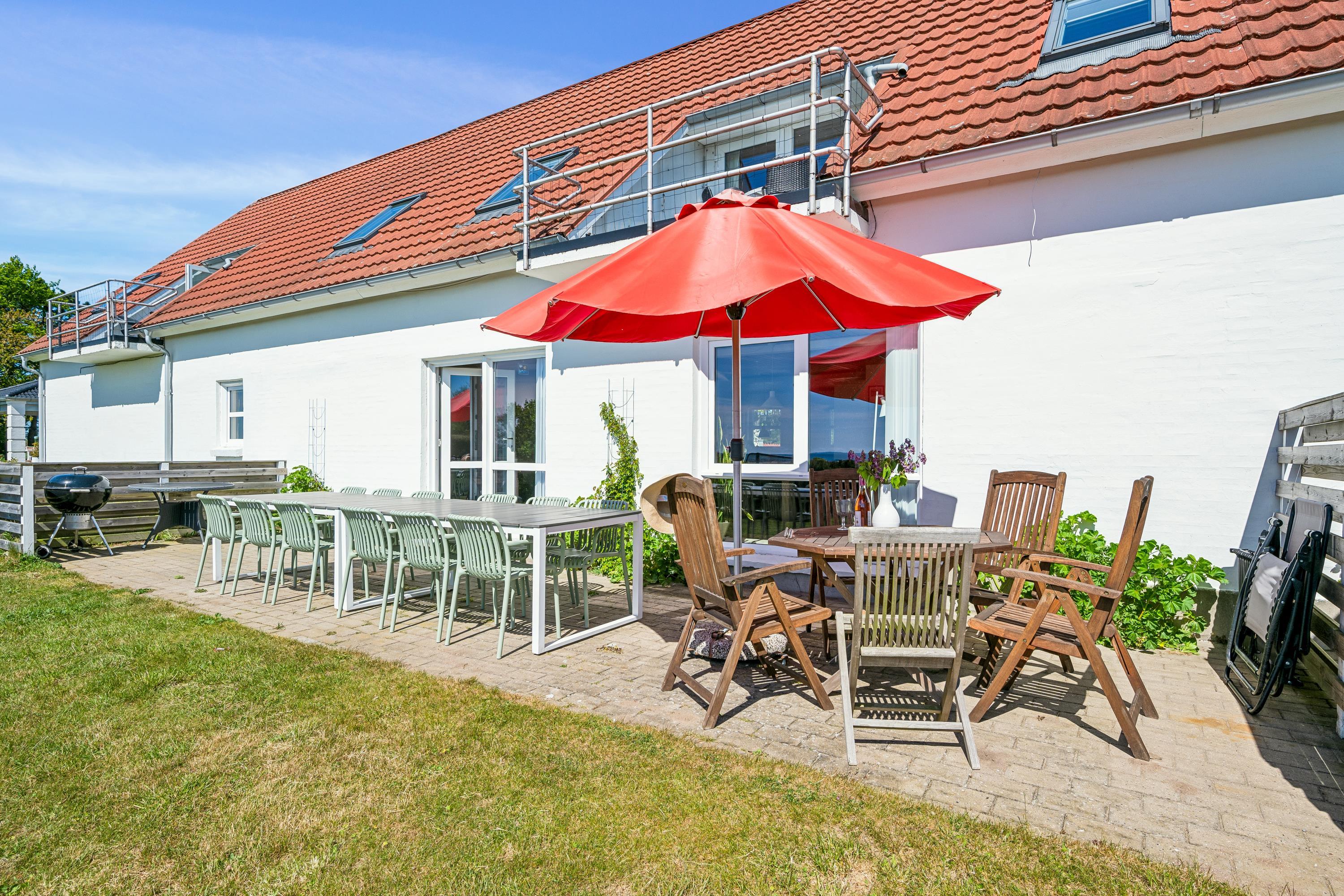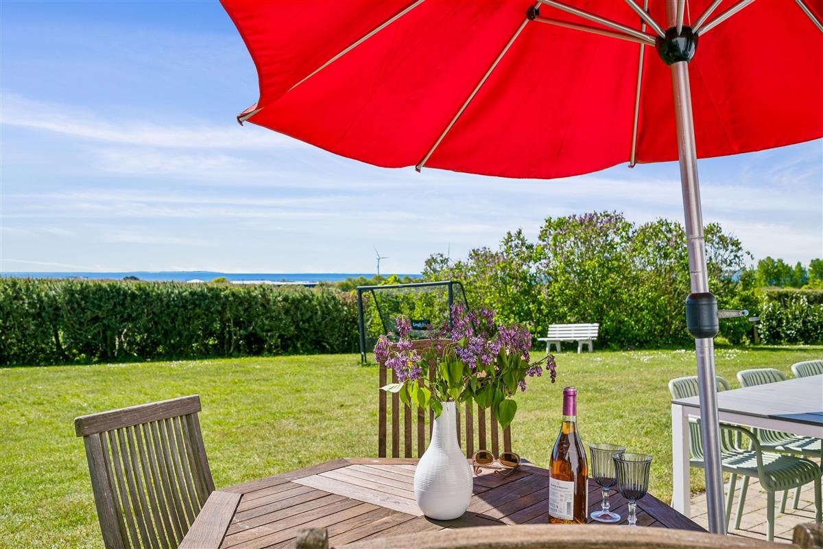 Well-maintained, spacious, and inviting holiday apartment on an elevated, open natural plot with panoramic views of the Kattegat Sea and the hilly landscape south of Ebeltoft. The apartment is on the ground floor and has a southwest-facing tiled terrace with garden furniture, sun loungers, and a grill. On the large plot, shared with three other holiday apartments, there is a bonfire area as well as a swing set and sandbox for the children.