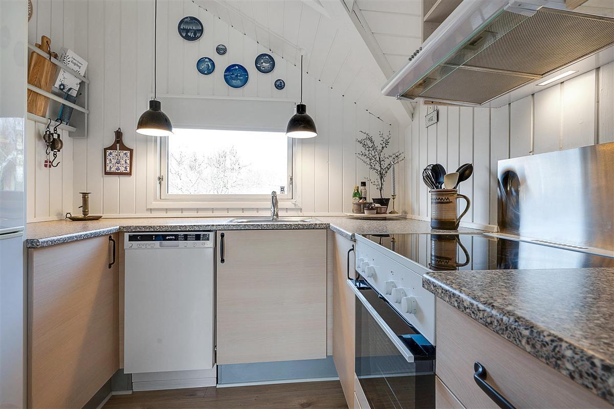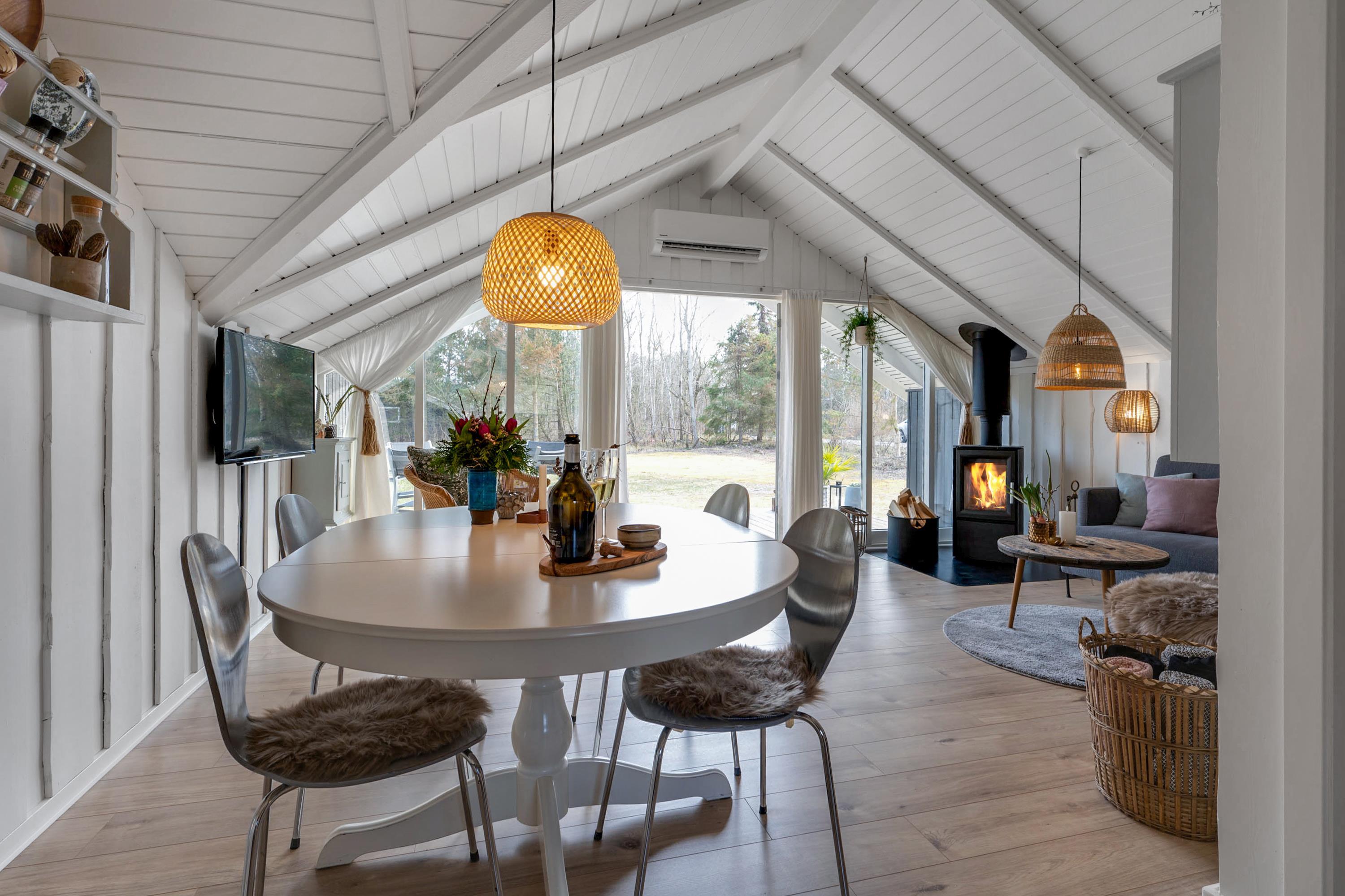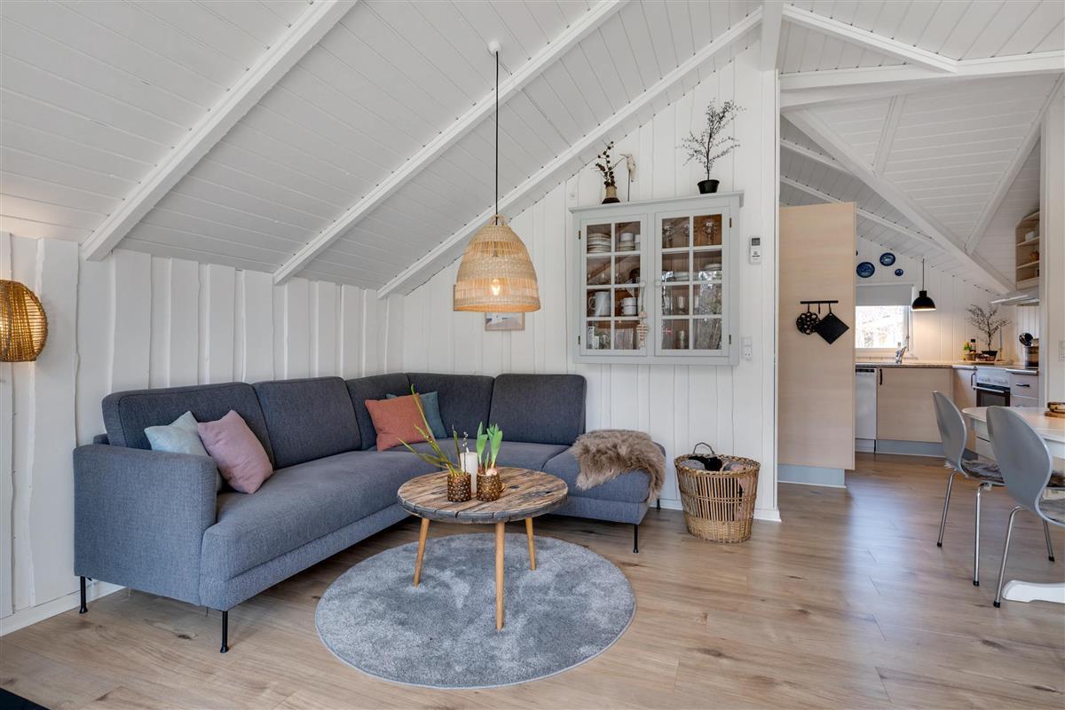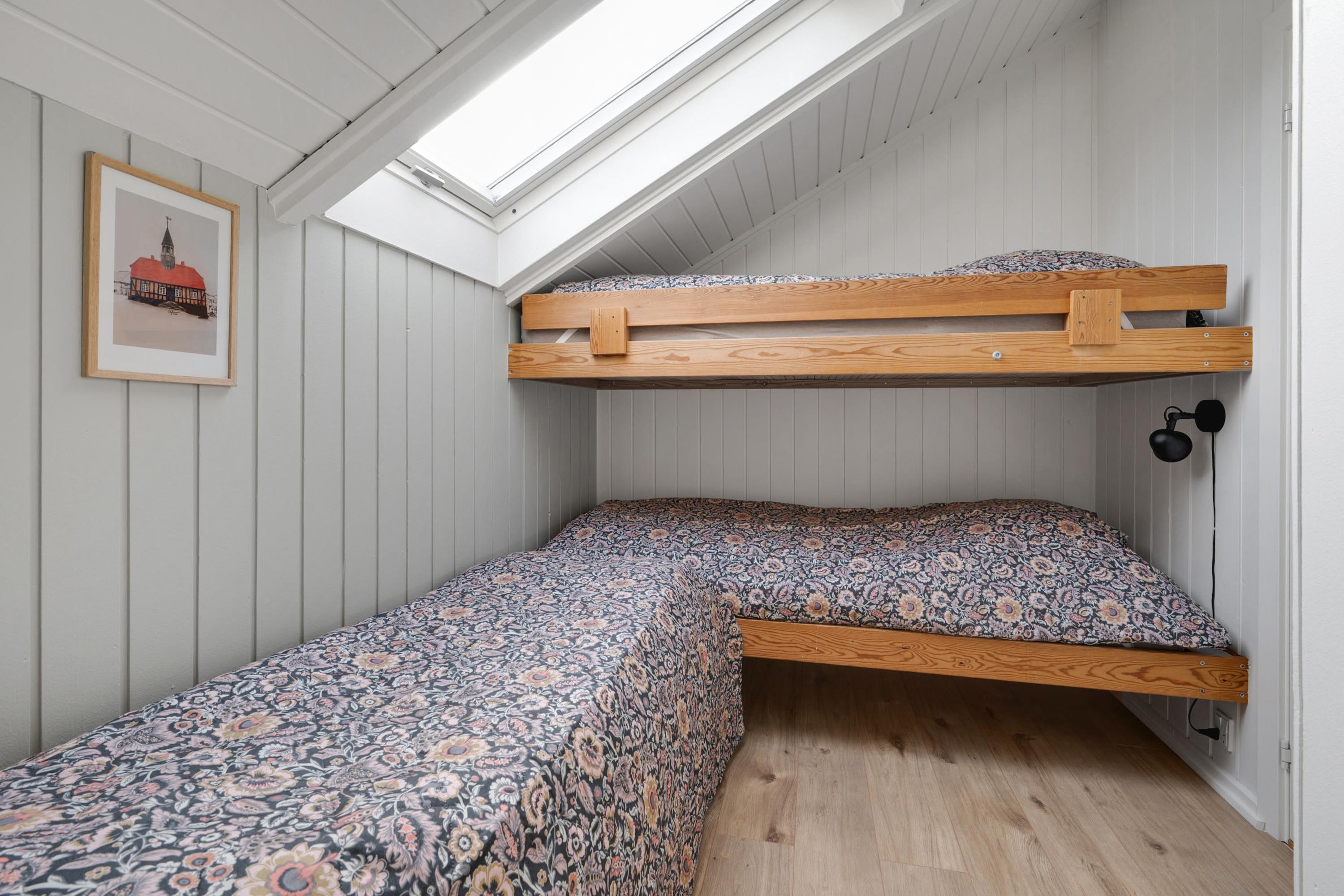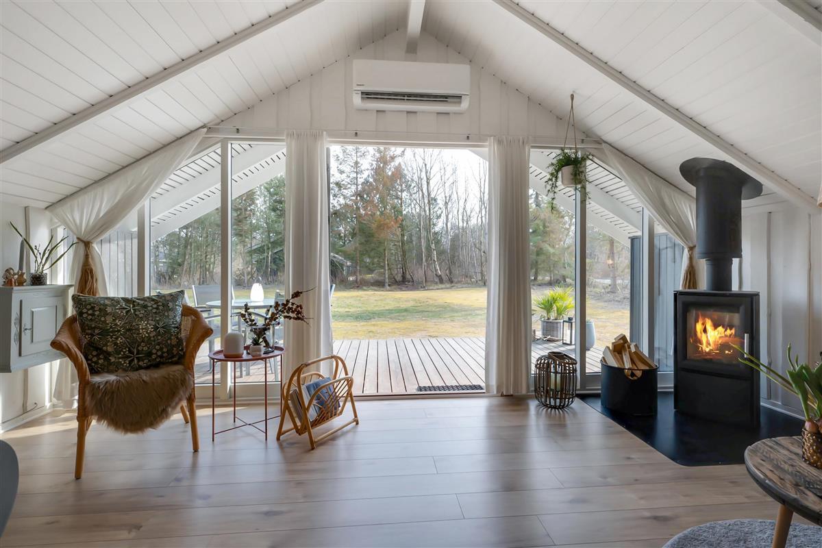From the entrance and hallway, you enter a delightful living room in open connection with the kitchen and with access to the terrace. There is a wood-burning stove, a dining area for 6 people, sofa furniture, and an armchair, as well as a TV with streaming capabilities. Very well-equipped kitchen with a combination oven, stove with ceramic hobs and oven, refrigerator/freezer, and dishwasher. The house's 6 sleeping places are distributed among 3 good bedrooms – 1 large room with a double bed and 2 smaller rooms: 1 with 2 single beds and 1 bunk bed, and 1 with 1 single bed and a bunk bed. Spacious, renovated bathroom with a shower. The house has a heat pump with air conditioning, and there is internet access.