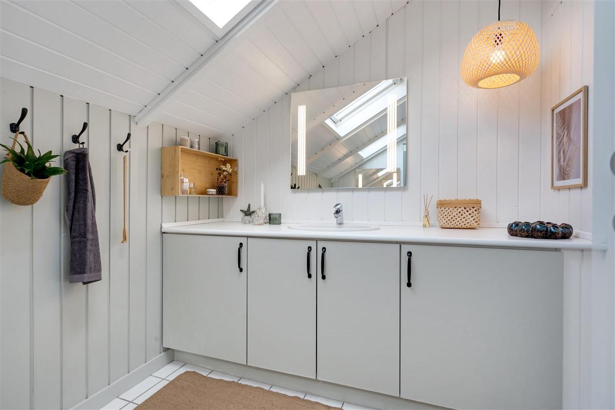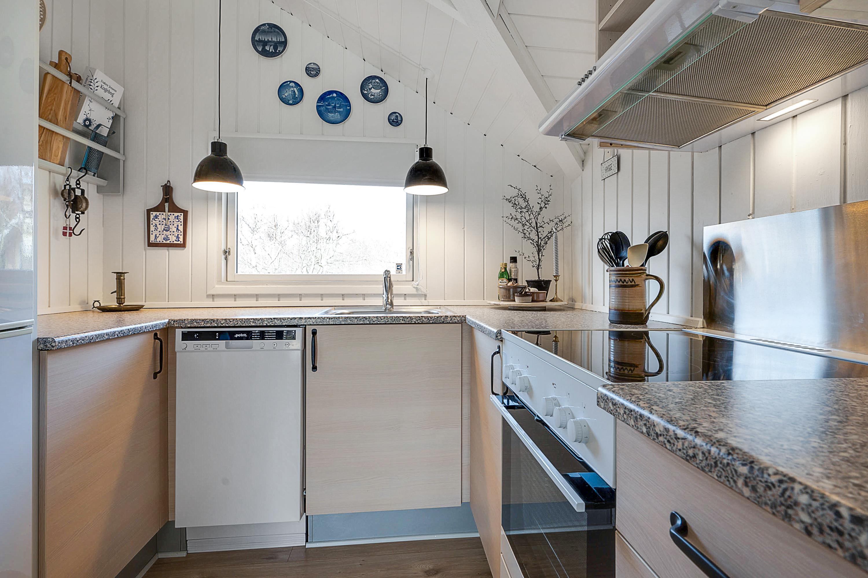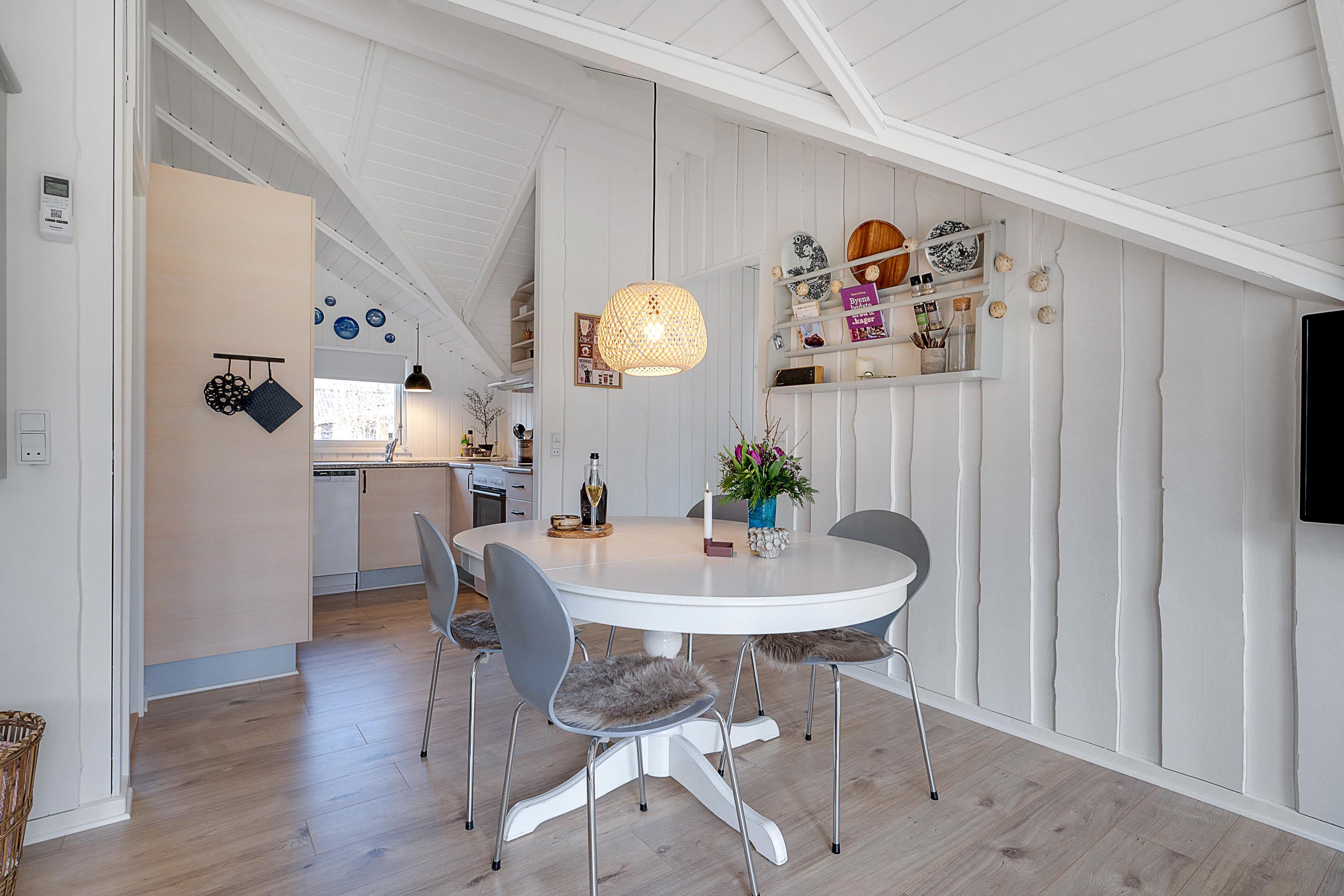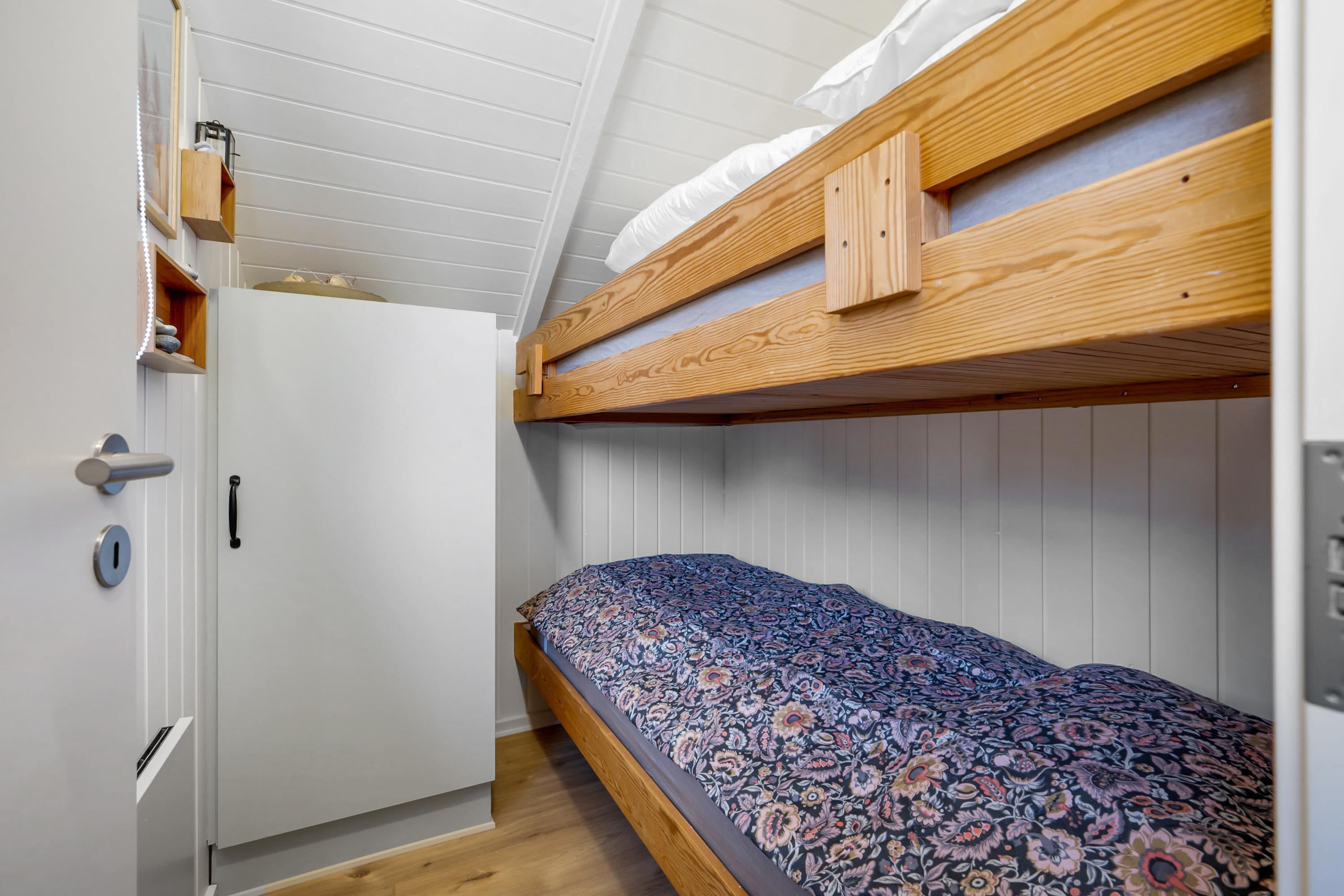 From the entrance and hallway, you enter a delightful living room in open connection with the kitchen and with access to the terrace. There is a wood-burning stove, a dining area for 6 people, sofa furniture, and an armchair, as well as a TV with streaming capabilities. Very well-equipped kitchen with a combination oven, stove with ceramic hobs and oven, refrigerator/freezer, and dishwasher. The house's 6 sleeping places are distributed among 3 good bedrooms – 1 large room with a double bed and 2 smaller rooms: 1 with 2 single beds and 1 bunk bed, and 1 with 1 single bed and a bunk bed. Spacious, renovated bathroom with a shower. The house has a heat pump with air conditioning, and there is internet access.