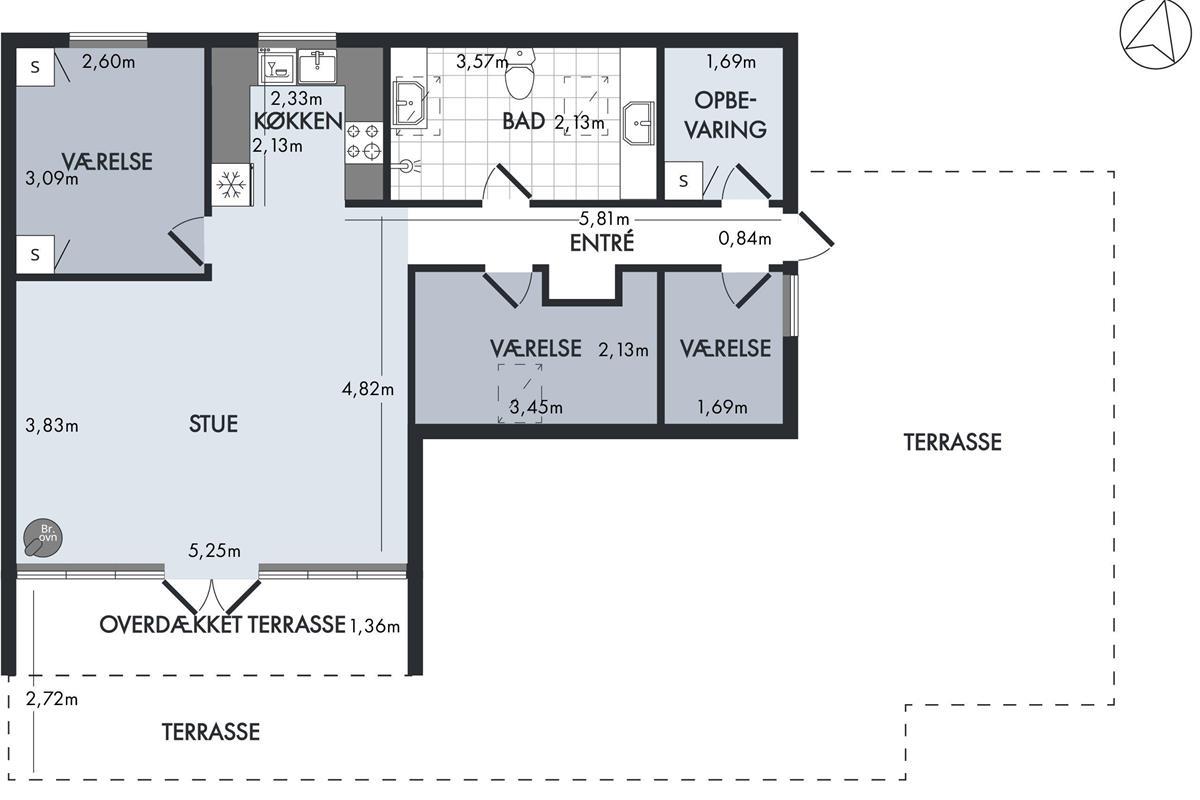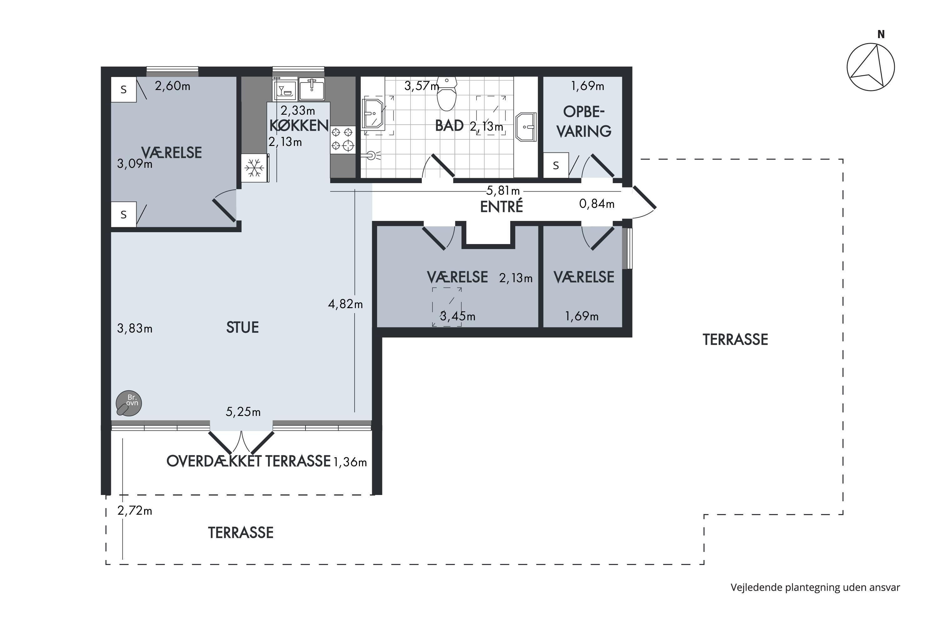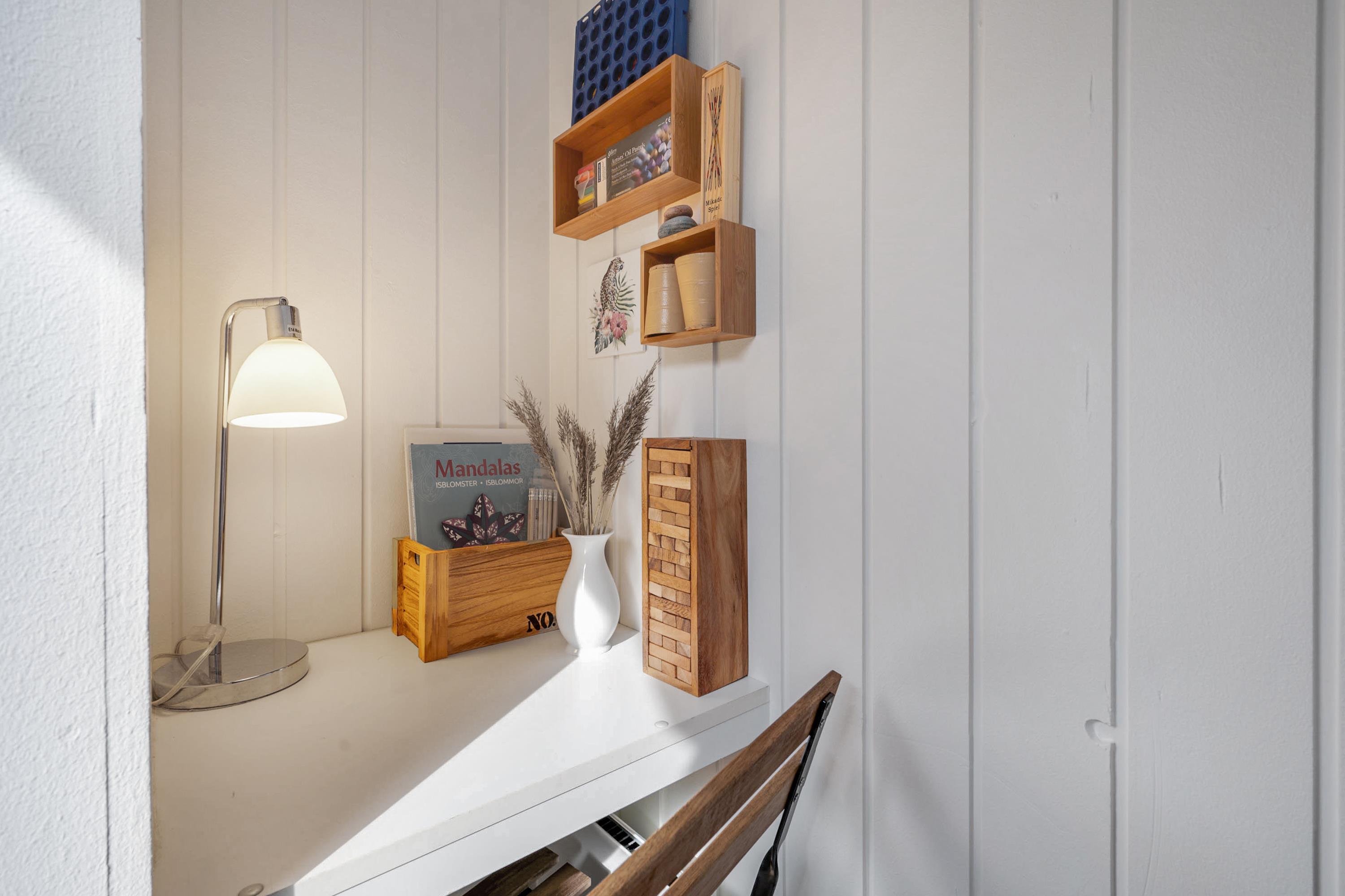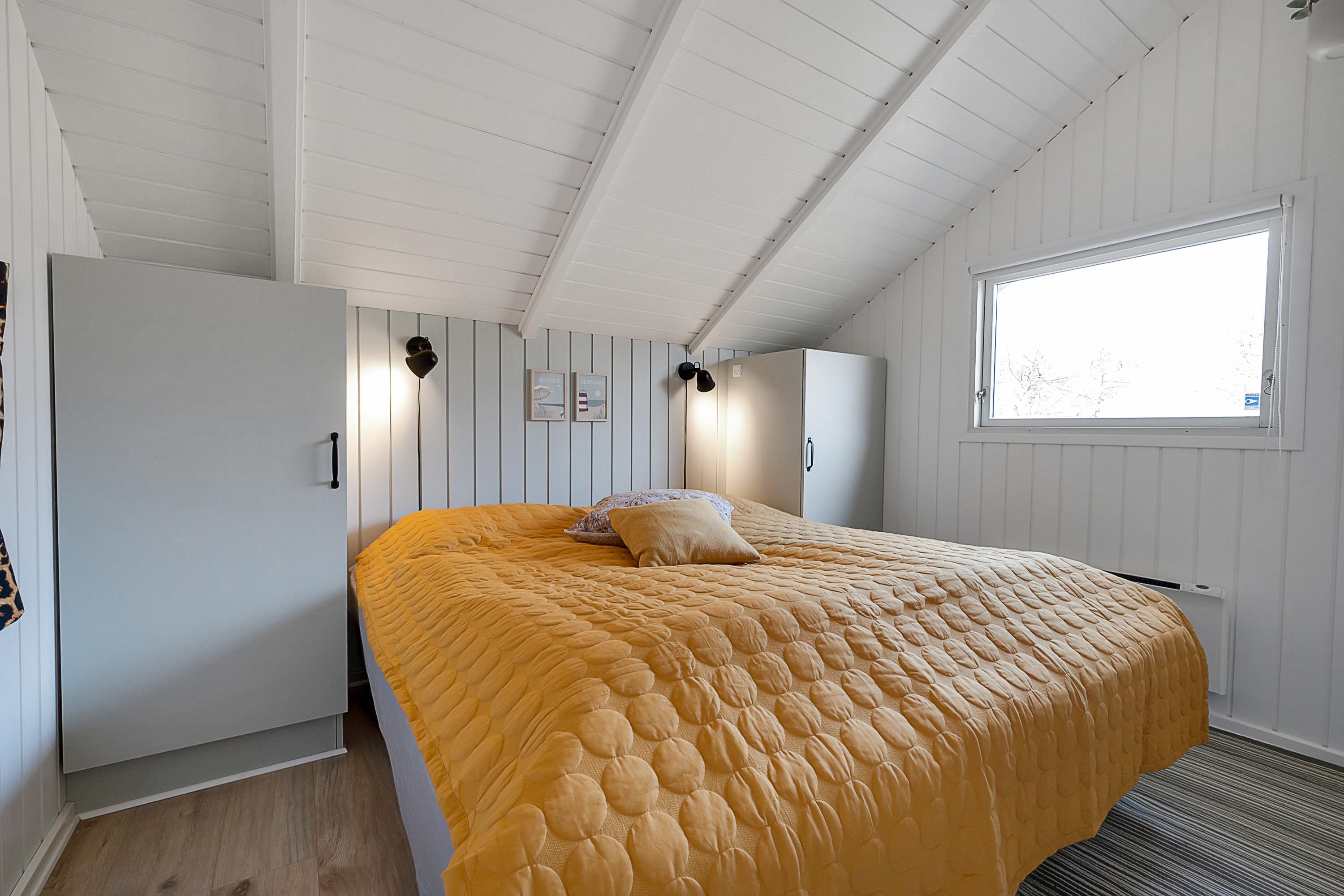 From the entrance and hallway, you enter a delightful living room in open connection with the kitchen and with access to the terrace. There is a wood-burning stove, a dining area for 6 people, sofa furniture, and an armchair, as well as a TV with streaming capabilities. Very well-equipped kitchen with a combination oven, stove with ceramic hobs and oven, refrigerator/freezer, and dishwasher. The house's 6 sleeping places are distributed among 3 good bedrooms – 1 large room with a double bed and 2 smaller rooms: 1 with 2 single beds and 1 bunk bed, and 1 with 1 single bed and a bunk bed. Spacious, renovated bathroom with a shower. The house has a heat pump with air conditioning, and there is internet access.