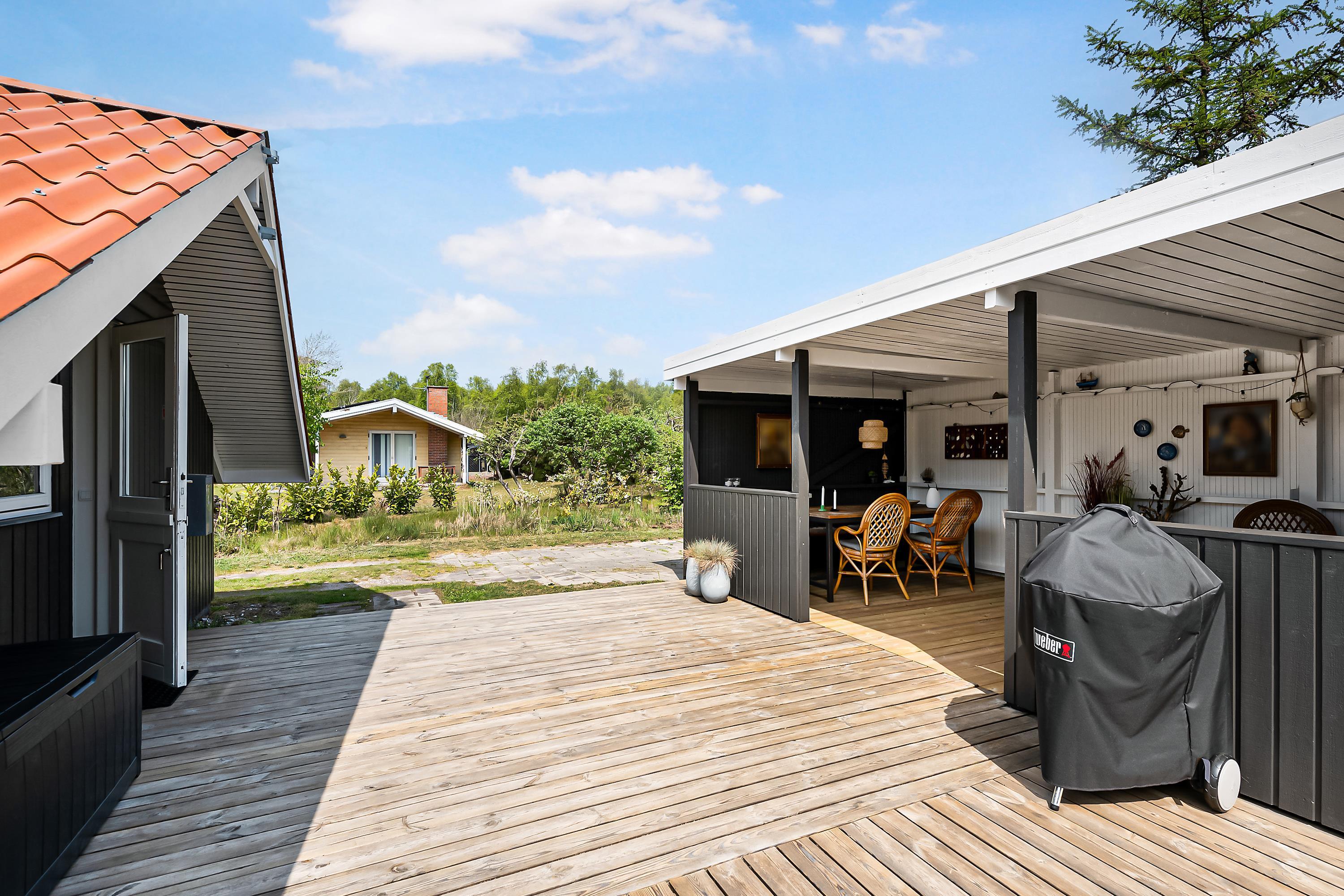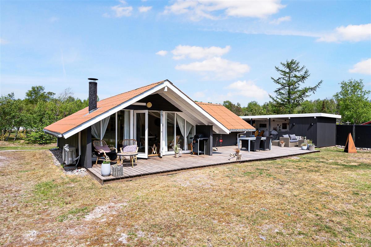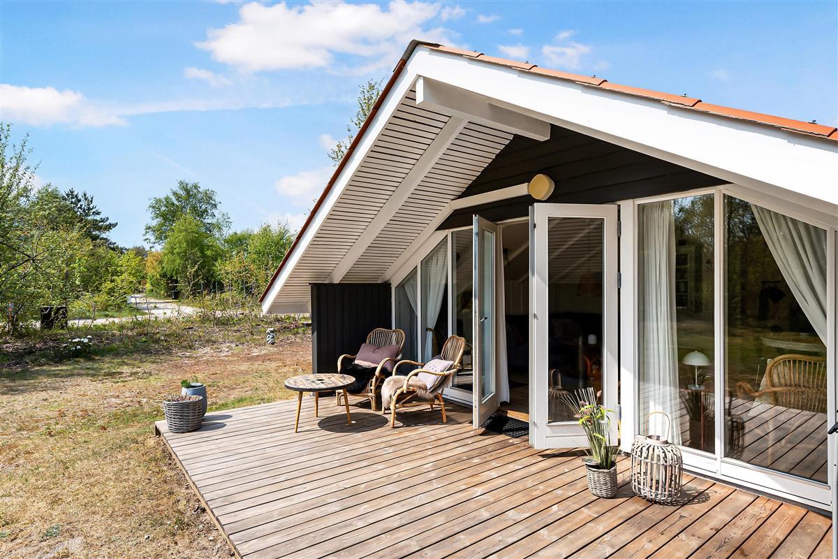 Renovated holiday house located on a secluded natural lot in the beautiful cottage area near Øer Strand, just 250 meters from sand dunes and a child-friendly beach. A traditional and truly cozy house. The house is surrounded by a large, lovely, partially covered wooden terrace with garden furniture and a grill, where you can enjoy the sun from morning to evening.
