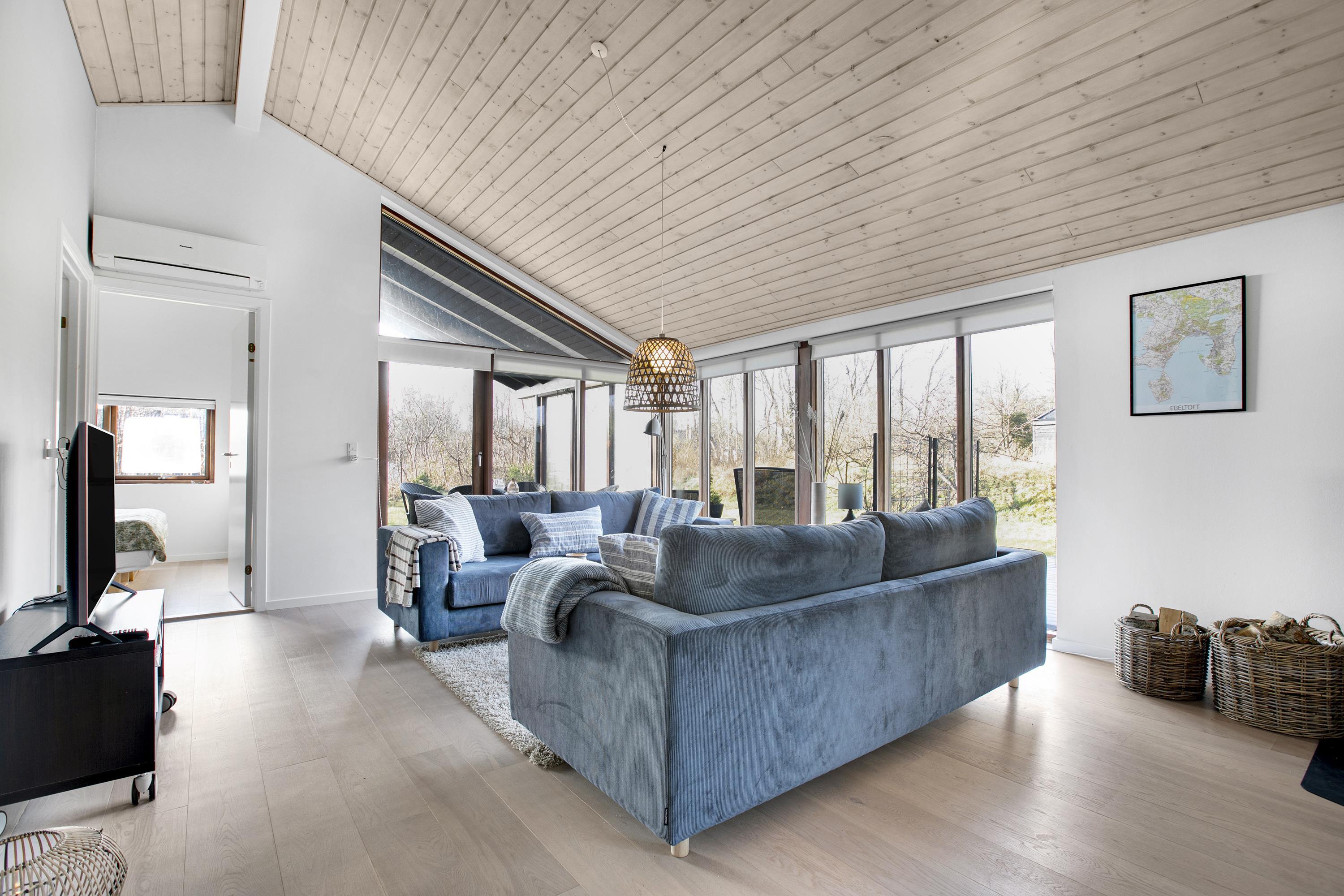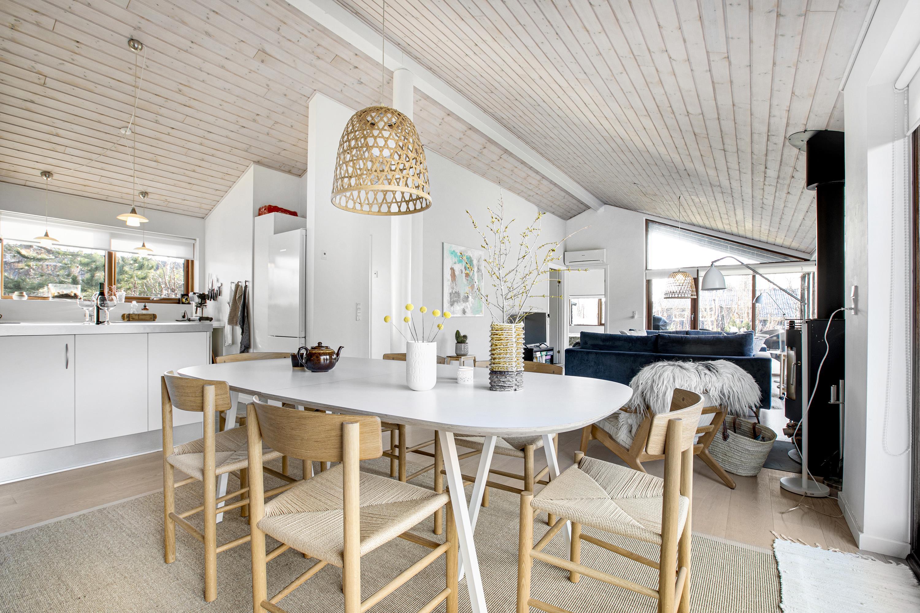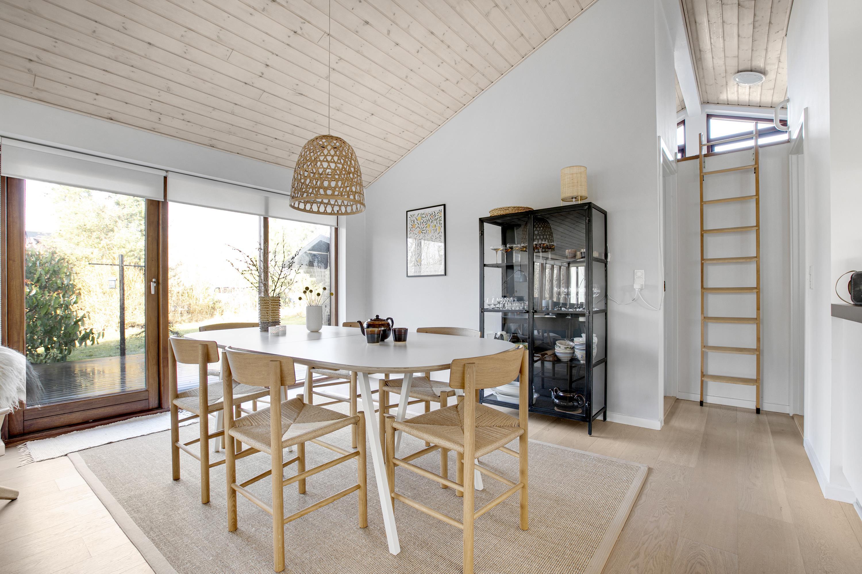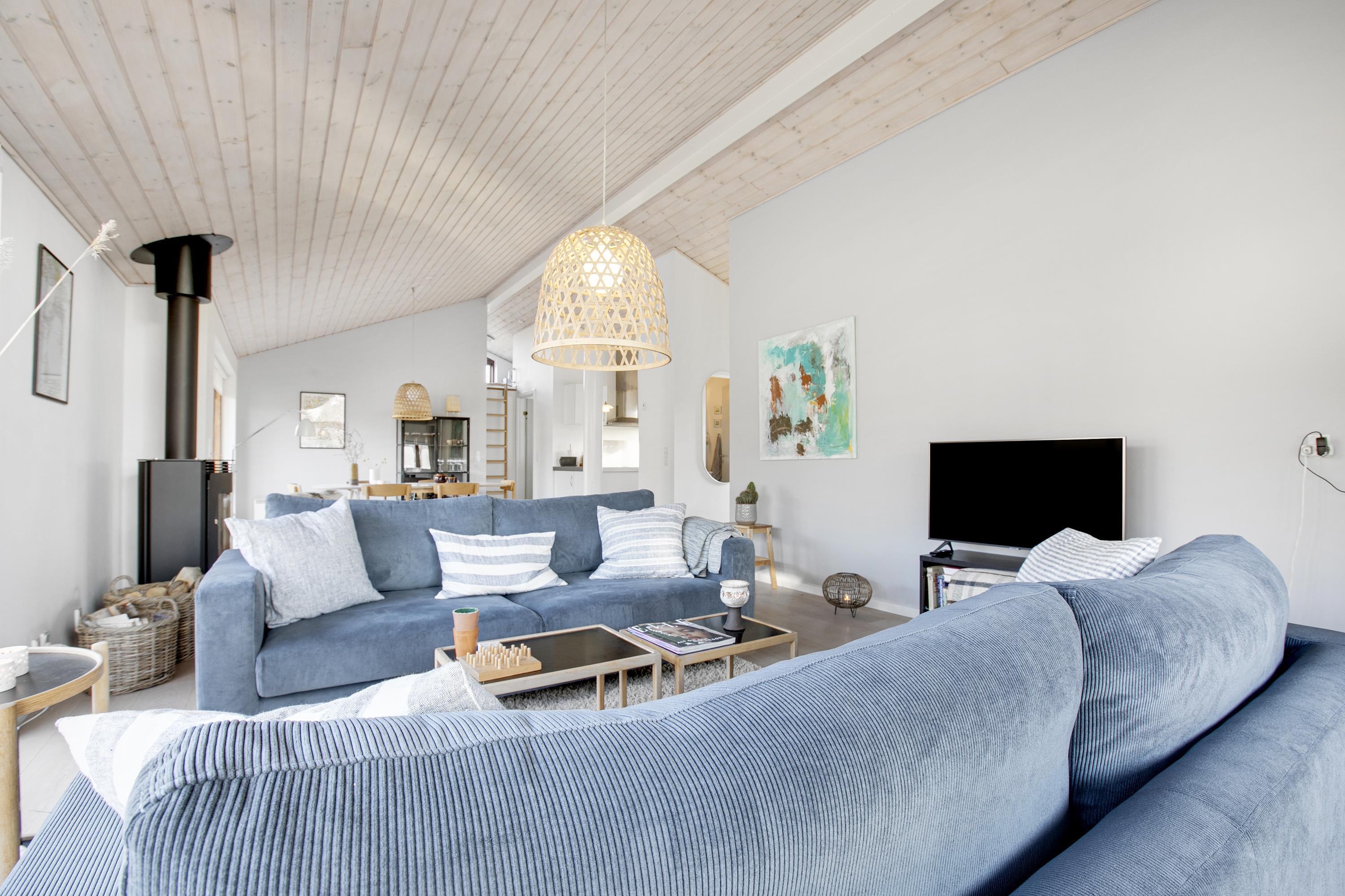 Light and beautiful living room in open connection with the kitchen and with access to the terrace. Like the rest of the house, the ceilings are high and furnished with a wood-burning stove, dining area for 6 people, comfortable sofa furniture, and a TV with Chromecast. New, well-equipped kitchen with ceramic hobs and oven, fridge/freezer, dishwasher, and microwave. The house's 6 sleeping places are distributed across 3 lovely bedrooms with double beds. Large, luxurious bathroom with cabinet arrangement and shower cubicle and sauna, as well as a slightly smaller bathroom with a shower cubicle, both wet rooms with underfloor heating. In a small utility room with entrance from the terrace, you will find a washing machine and a dryer, and for the little guests, there is a high chair. The house has a heat pump and internet access.