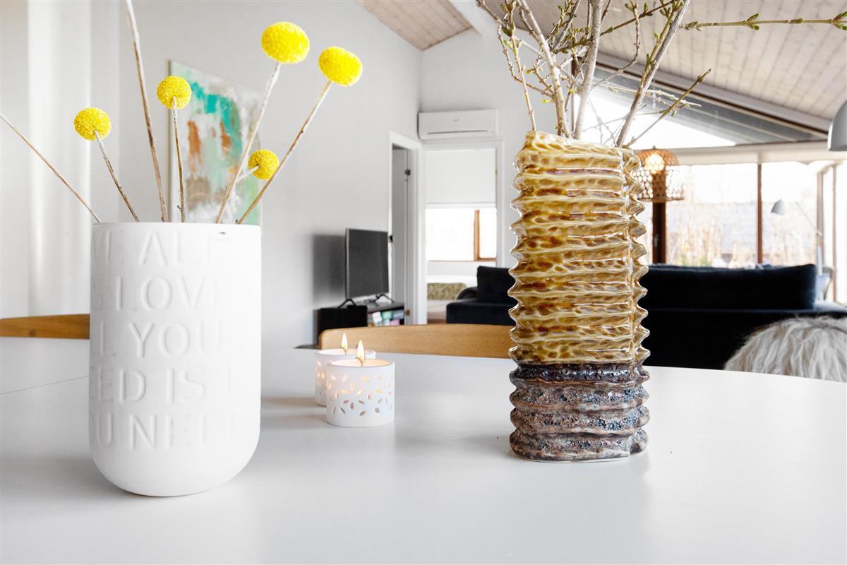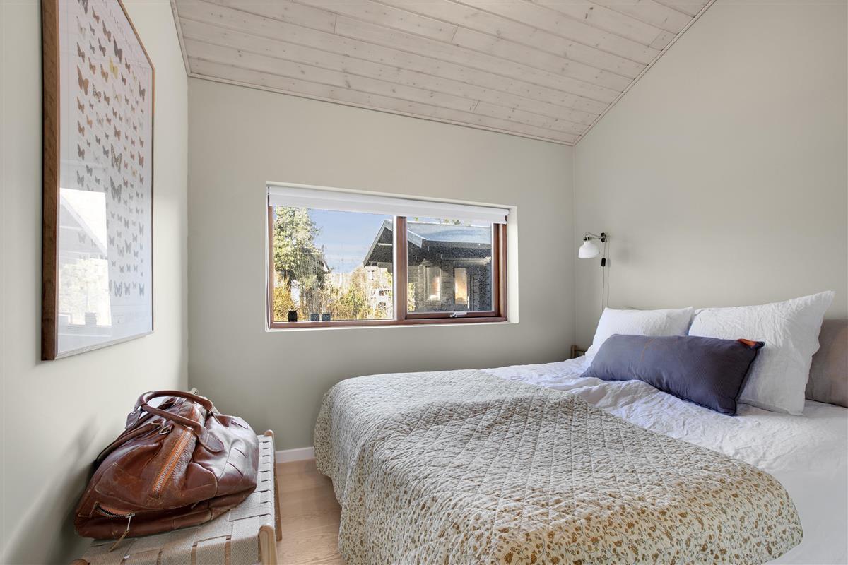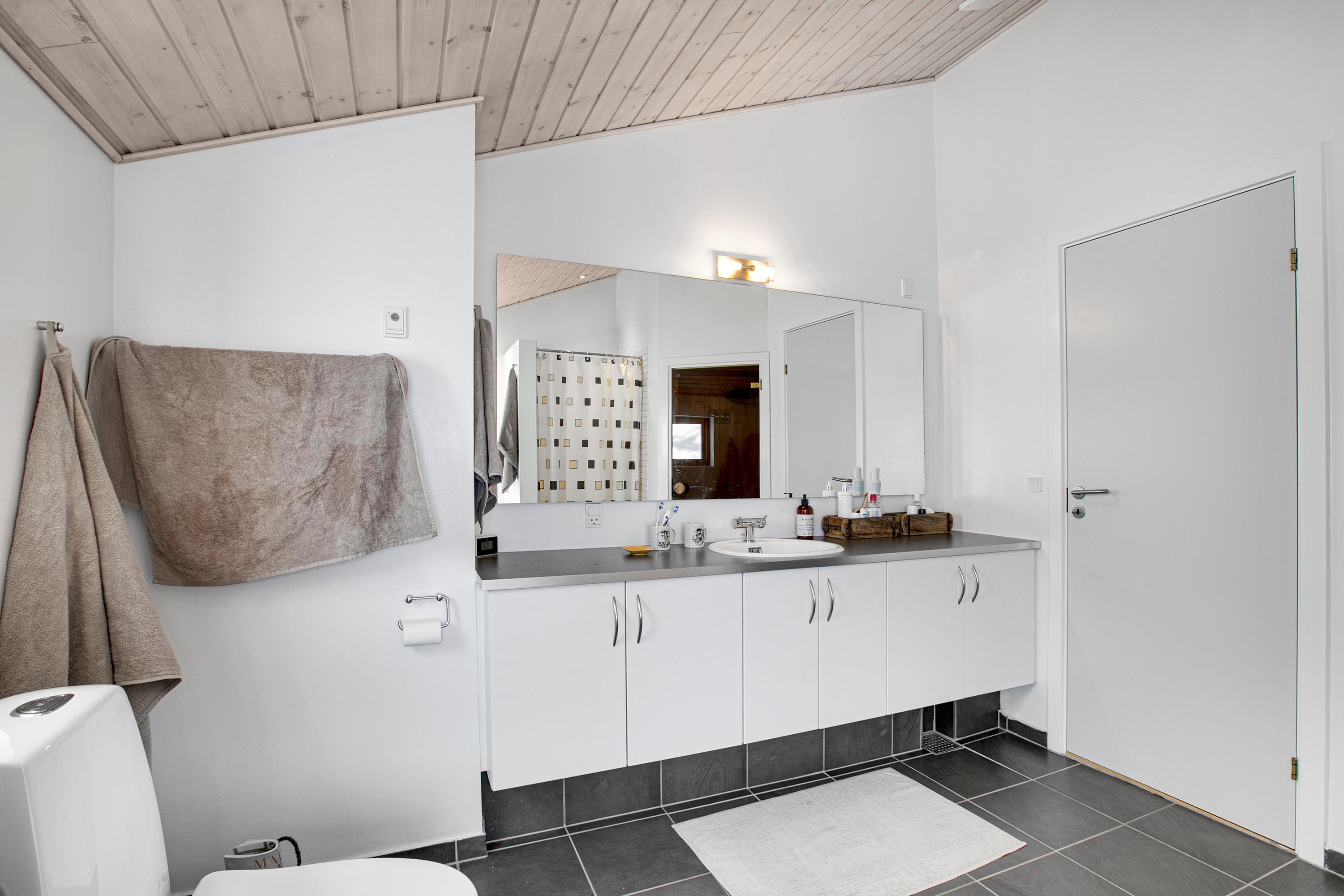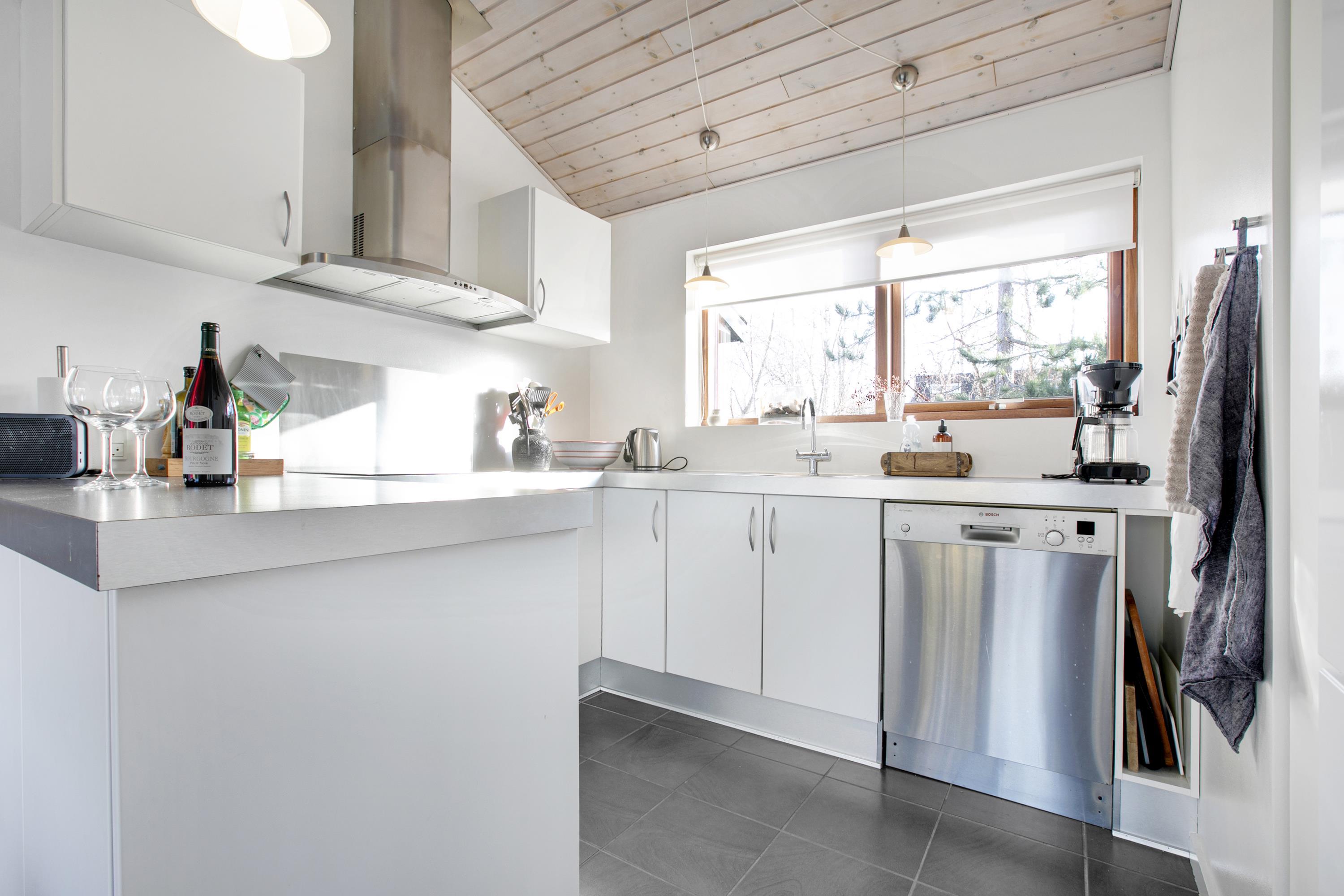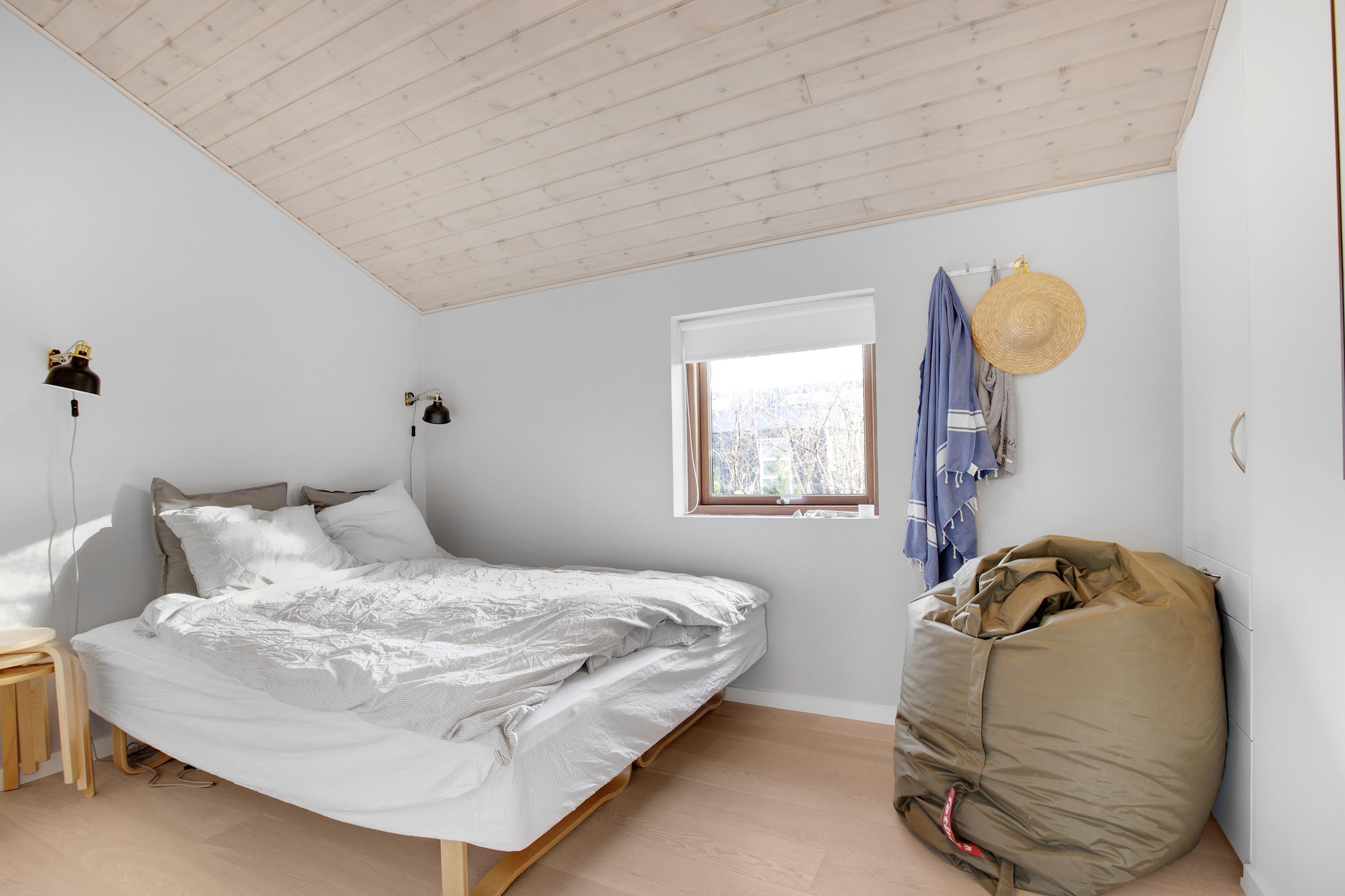 Light and beautiful living room in open connection with the kitchen and with access to the terrace. Like the rest of the house, the ceilings are high and furnished with a wood-burning stove, dining area for 6 people, comfortable sofa furniture, and a TV with Chromecast. New, well-equipped kitchen with ceramic hobs and oven, fridge/freezer, dishwasher, and microwave. The house's 6 sleeping places are distributed across 3 lovely bedrooms with double beds. Large, luxurious bathroom with cabinet arrangement and shower cubicle and sauna, as well as a slightly smaller bathroom with a shower cubicle, both wet rooms with underfloor heating. In a small utility room with entrance from the terrace, you will find a washing machine and a dryer, and for the little guests, there is a high chair. The house has a heat pump and internet access.