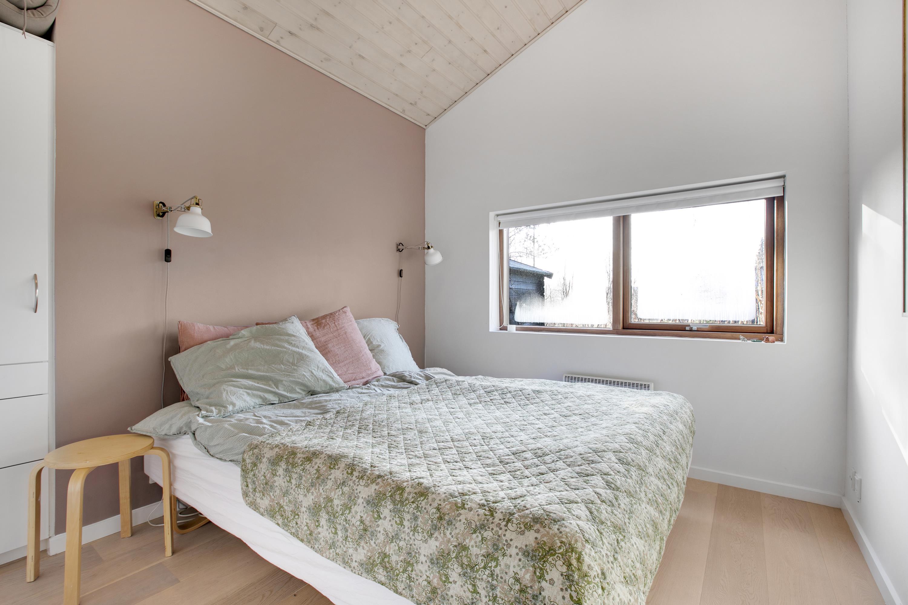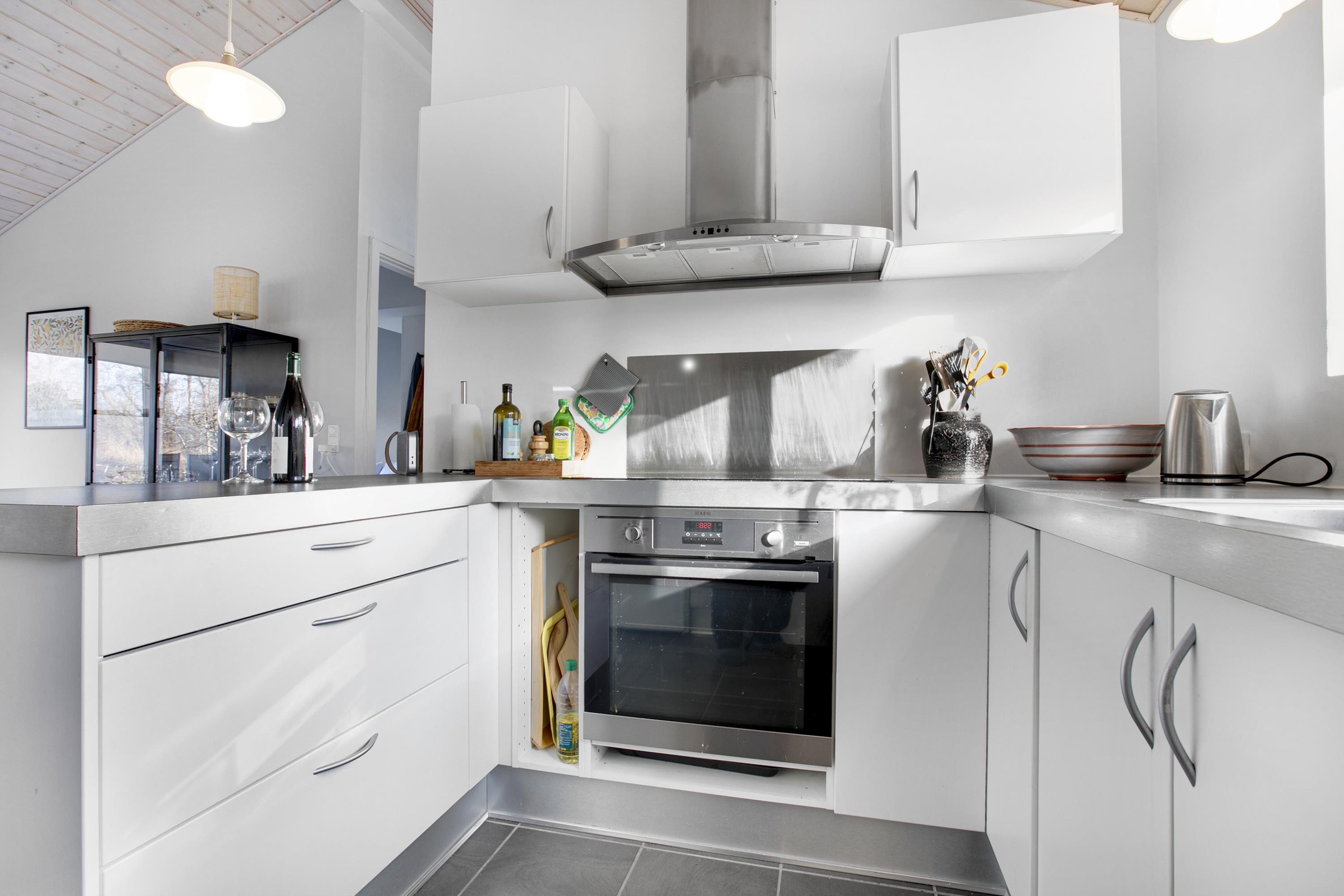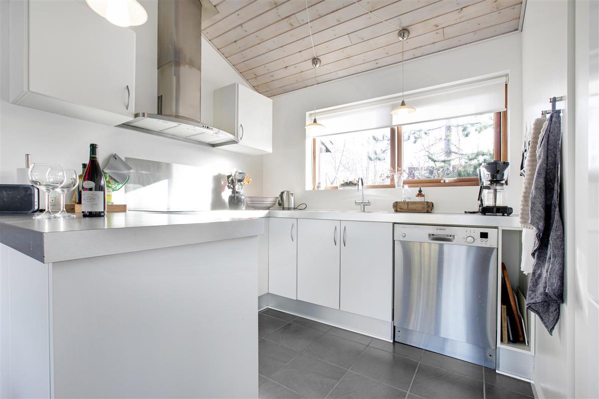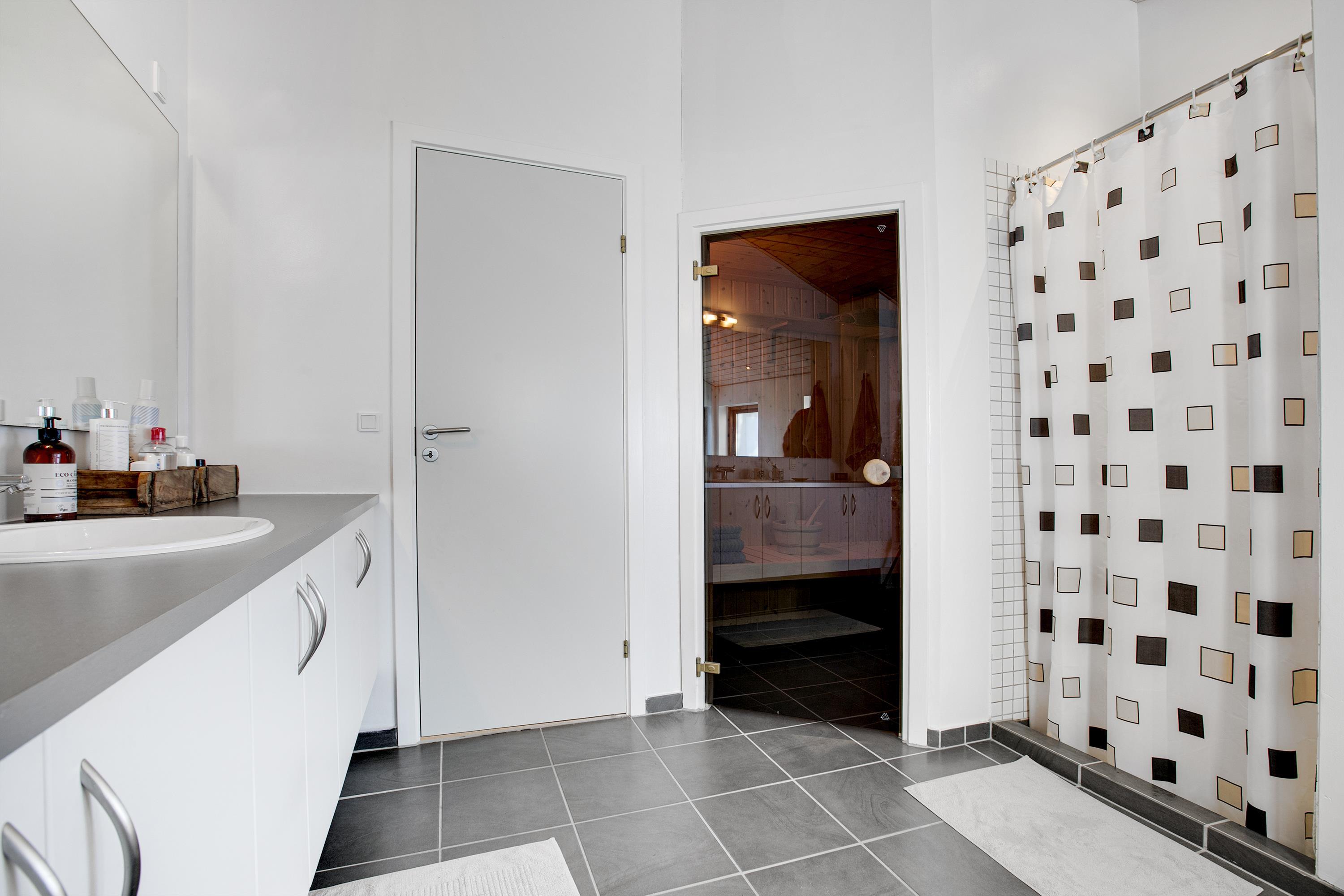 Light and beautiful living room in open connection with the kitchen and with access to the terrace. Like the rest of the house, the ceilings are high and furnished with a wood-burning stove, dining area for 6 people, comfortable sofa furniture, and a TV with Chromecast. New, well-equipped kitchen with ceramic hobs and oven, fridge/freezer, dishwasher, and microwave. The house's 6 sleeping places are distributed across 3 lovely bedrooms with double beds. Large, luxurious bathroom with cabinet arrangement and shower cubicle and sauna, as well as a slightly smaller bathroom with a shower cubicle, both wet rooms with underfloor heating. In a small utility room with entrance from the terrace, you will find a washing machine and a dryer, and for the little guests, there is a high chair. The house has a heat pump and internet access.