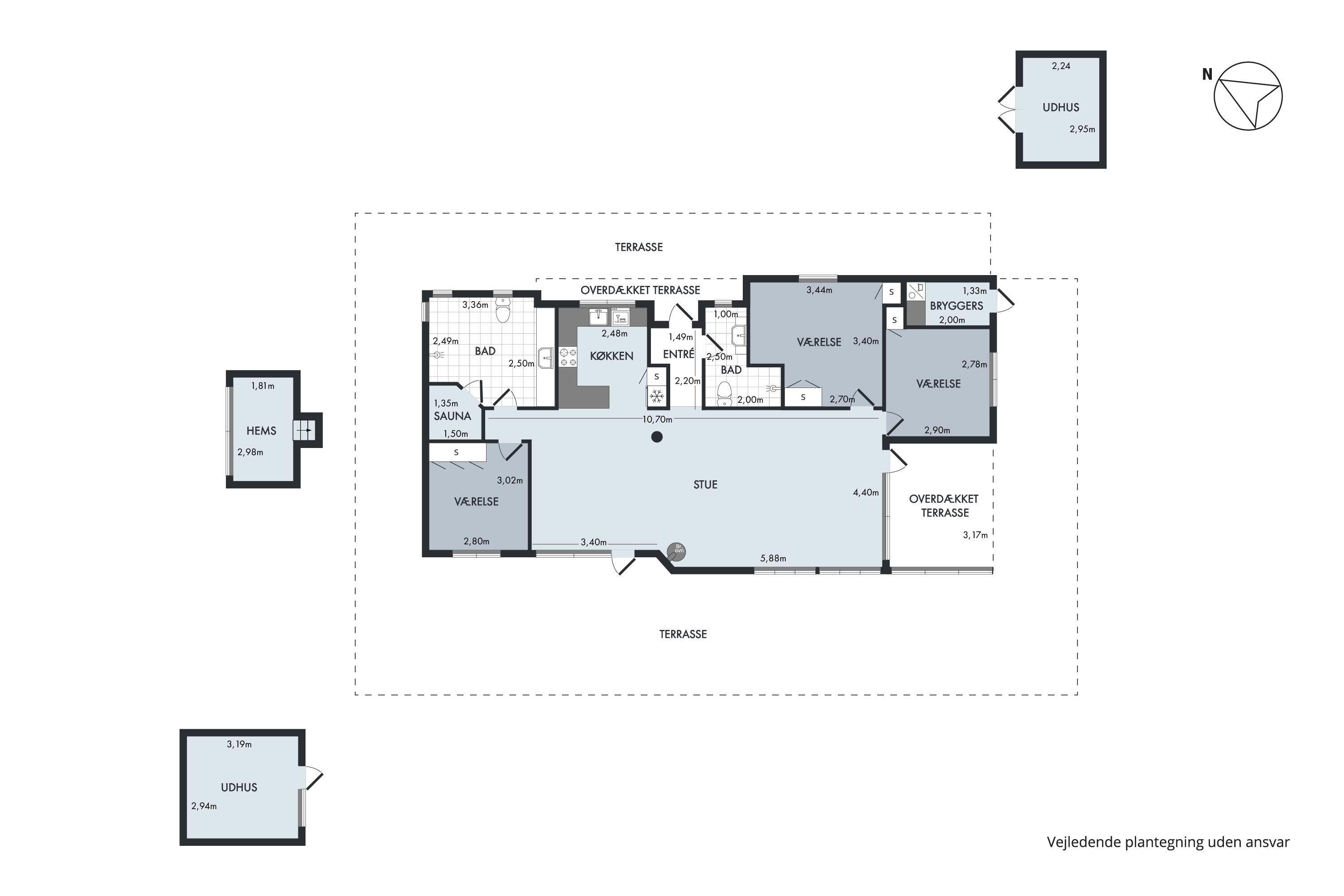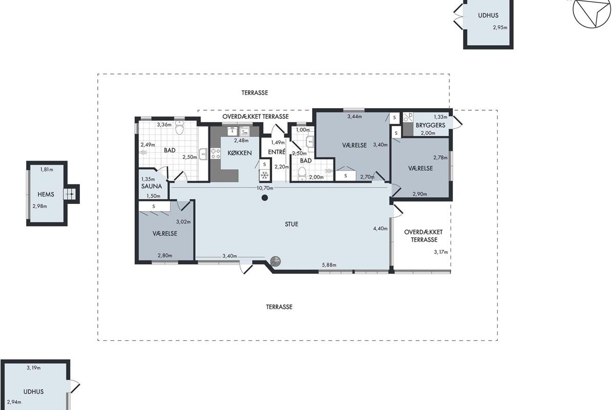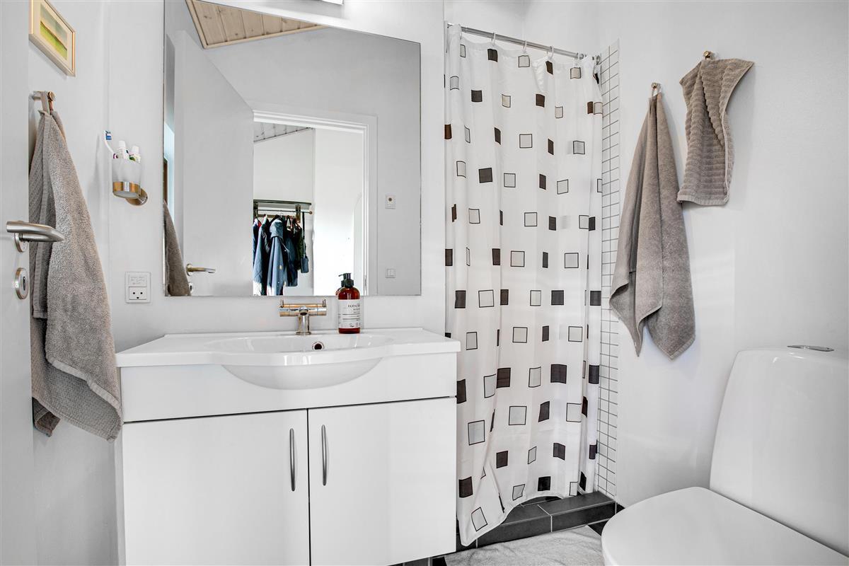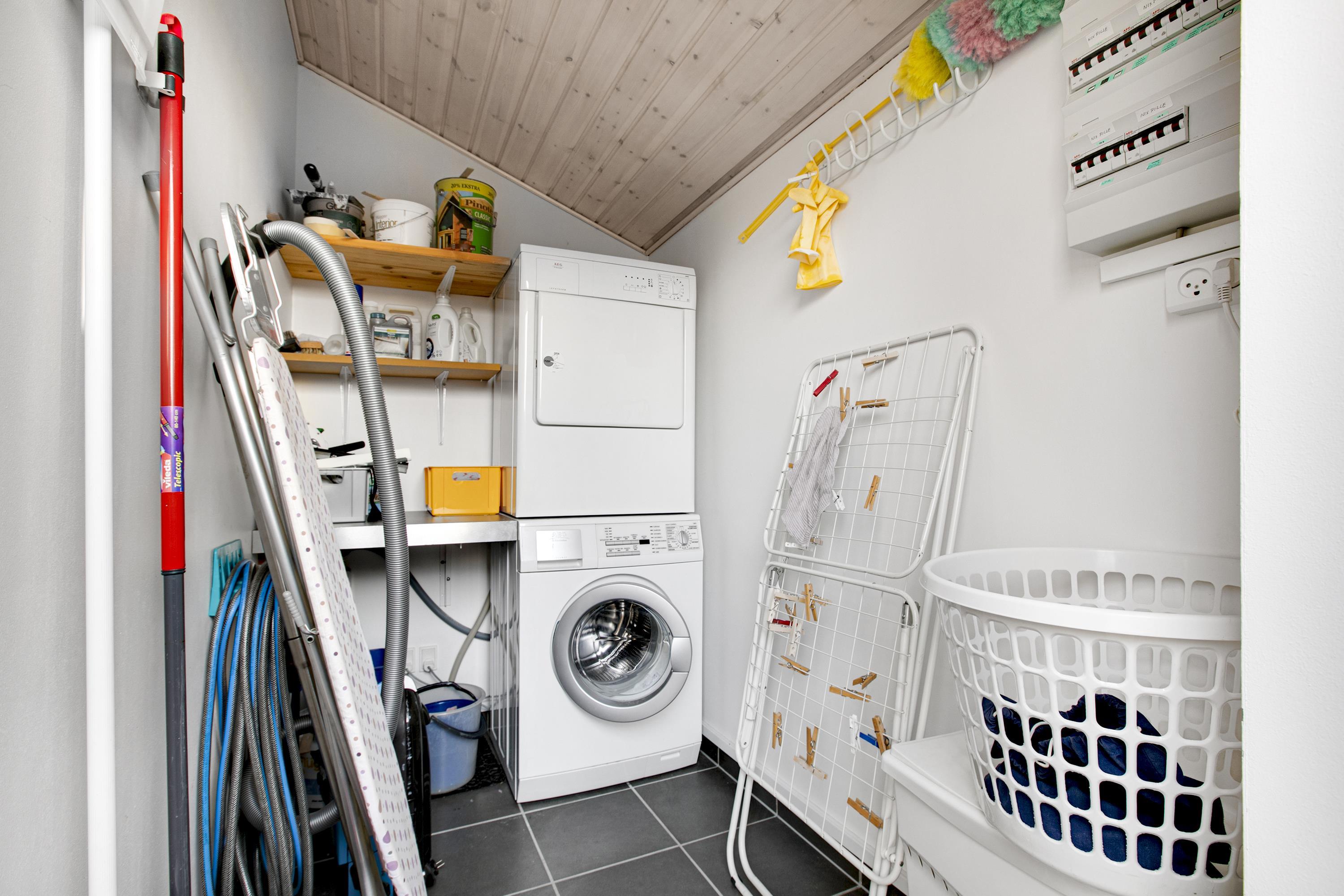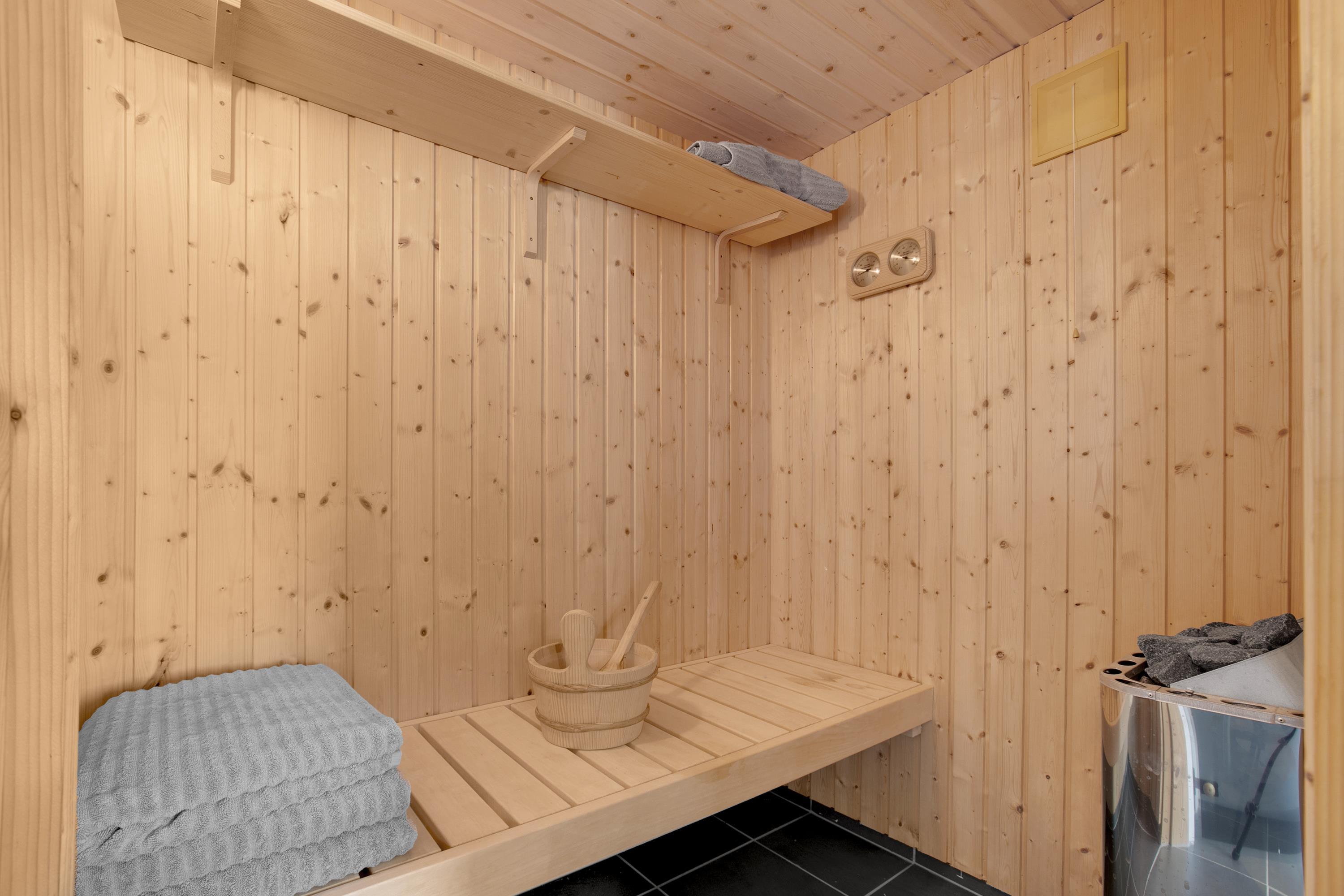 Light and beautiful living room in open connection with the kitchen and with access to the terrace. Like the rest of the house, the ceilings are high and furnished with a wood-burning stove, dining area for 6 people, comfortable sofa furniture, and a TV with Chromecast. New, well-equipped kitchen with ceramic hobs and oven, fridge/freezer, dishwasher, and microwave. The house's 6 sleeping places are distributed across 3 lovely bedrooms with double beds. Large, luxurious bathroom with cabinet arrangement and shower cubicle and sauna, as well as a slightly smaller bathroom with a shower cubicle, both wet rooms with underfloor heating. In a small utility room with entrance from the terrace, you will find a washing machine and a dryer, and for the little guests, there is a high chair. The house has a heat pump and internet access.