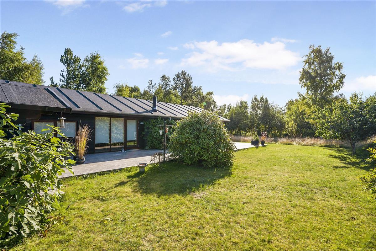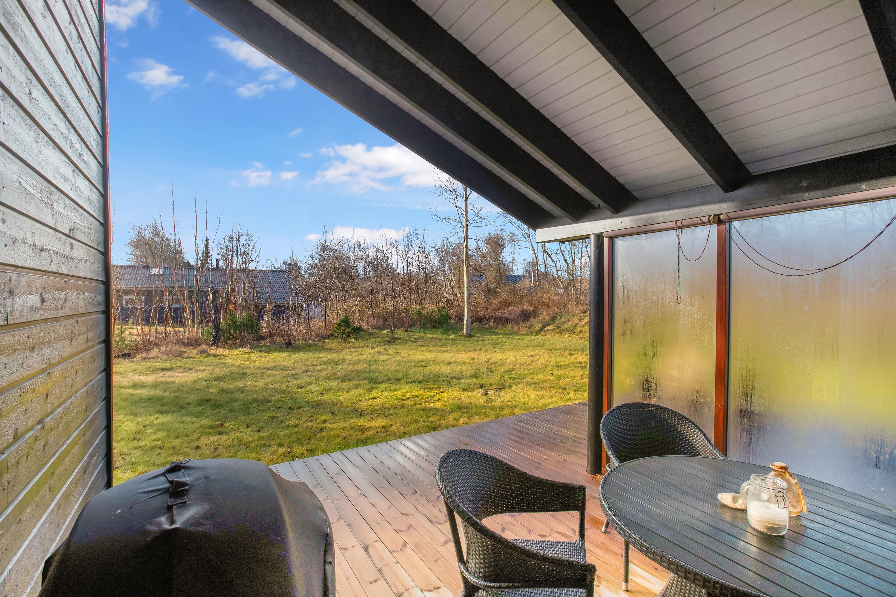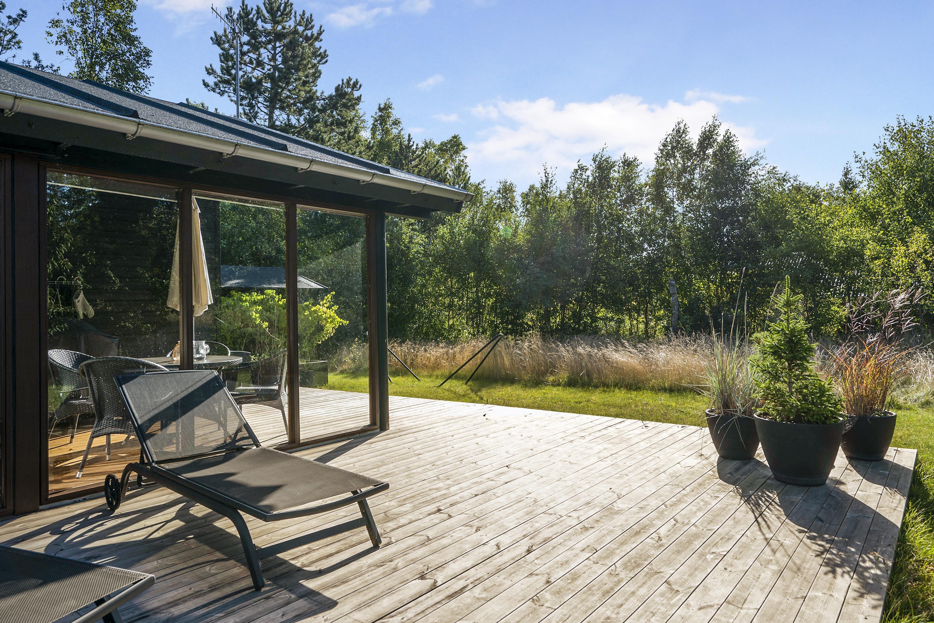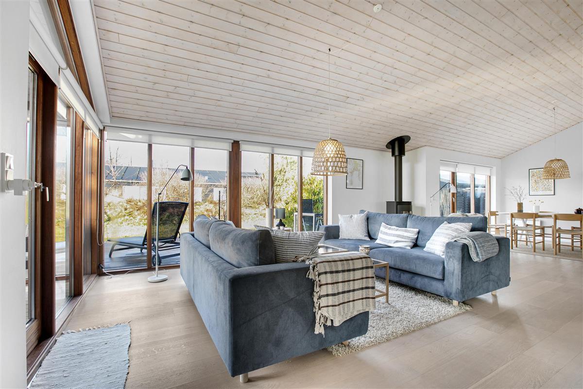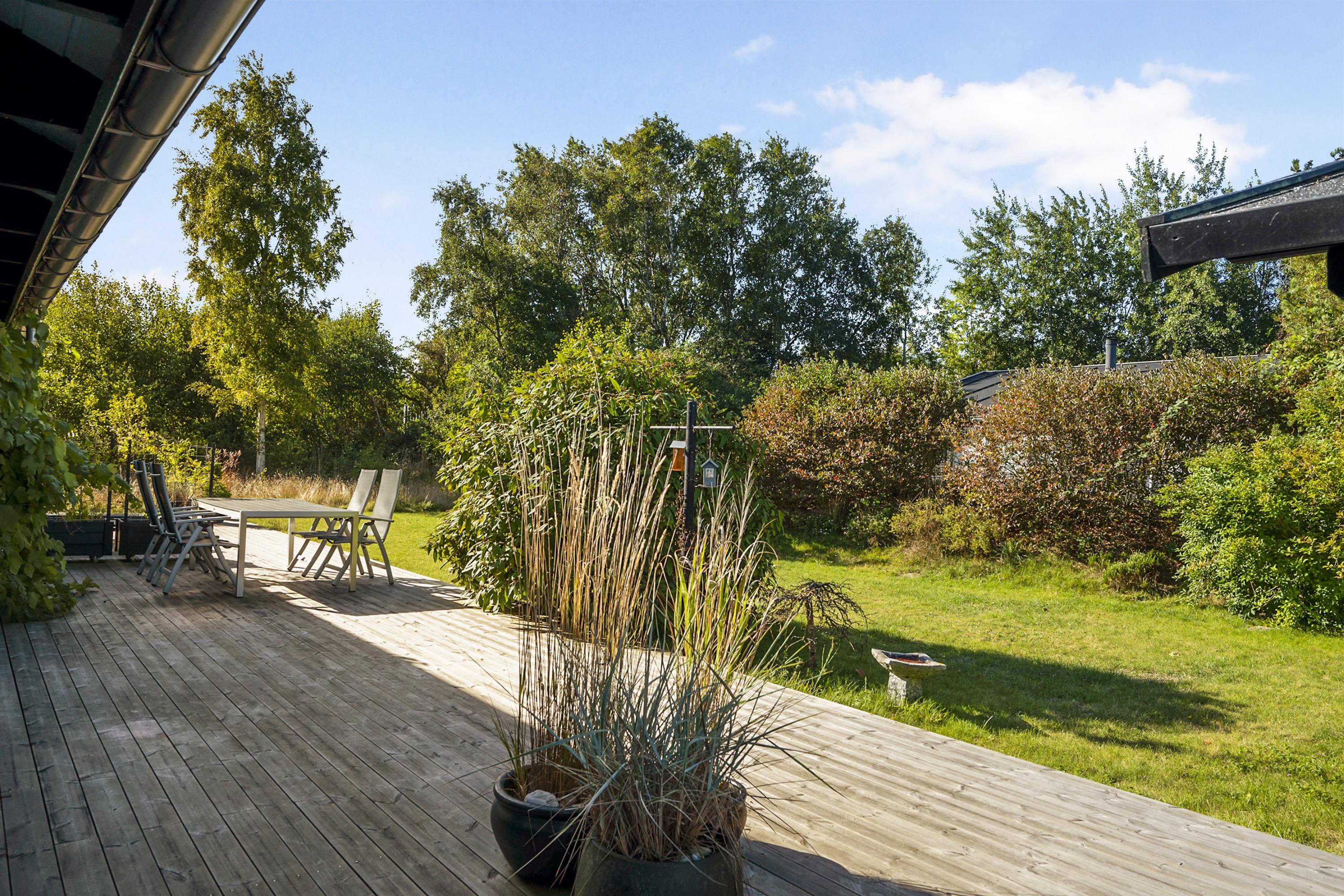 Newer and exceptionally well-maintained, spacious holiday home on a natural lot near Øer with a short distance to sandy dunes and a child-friendly beach. A bright and tastefully decorated house surrounded by a large southwest-facing, partially covered wooden/terrace with garden furniture, sun loungers, parasol, and a grill, where you can enjoy the sun from morning to evening. The lot also has a lockable shed.