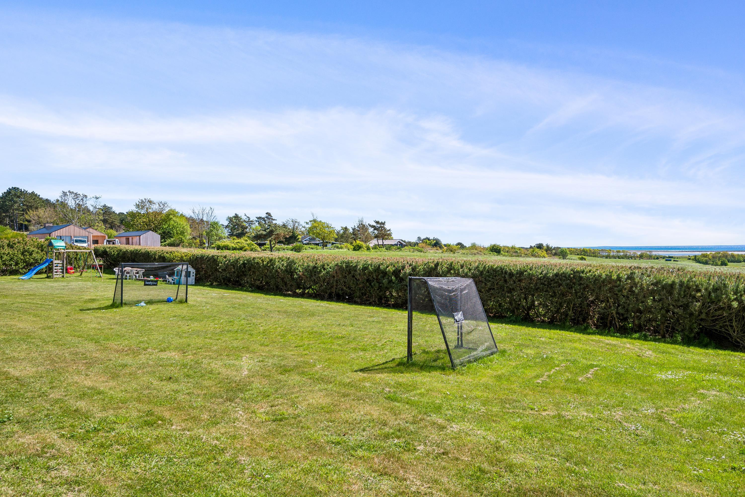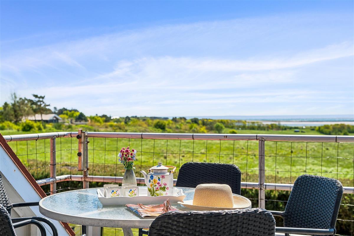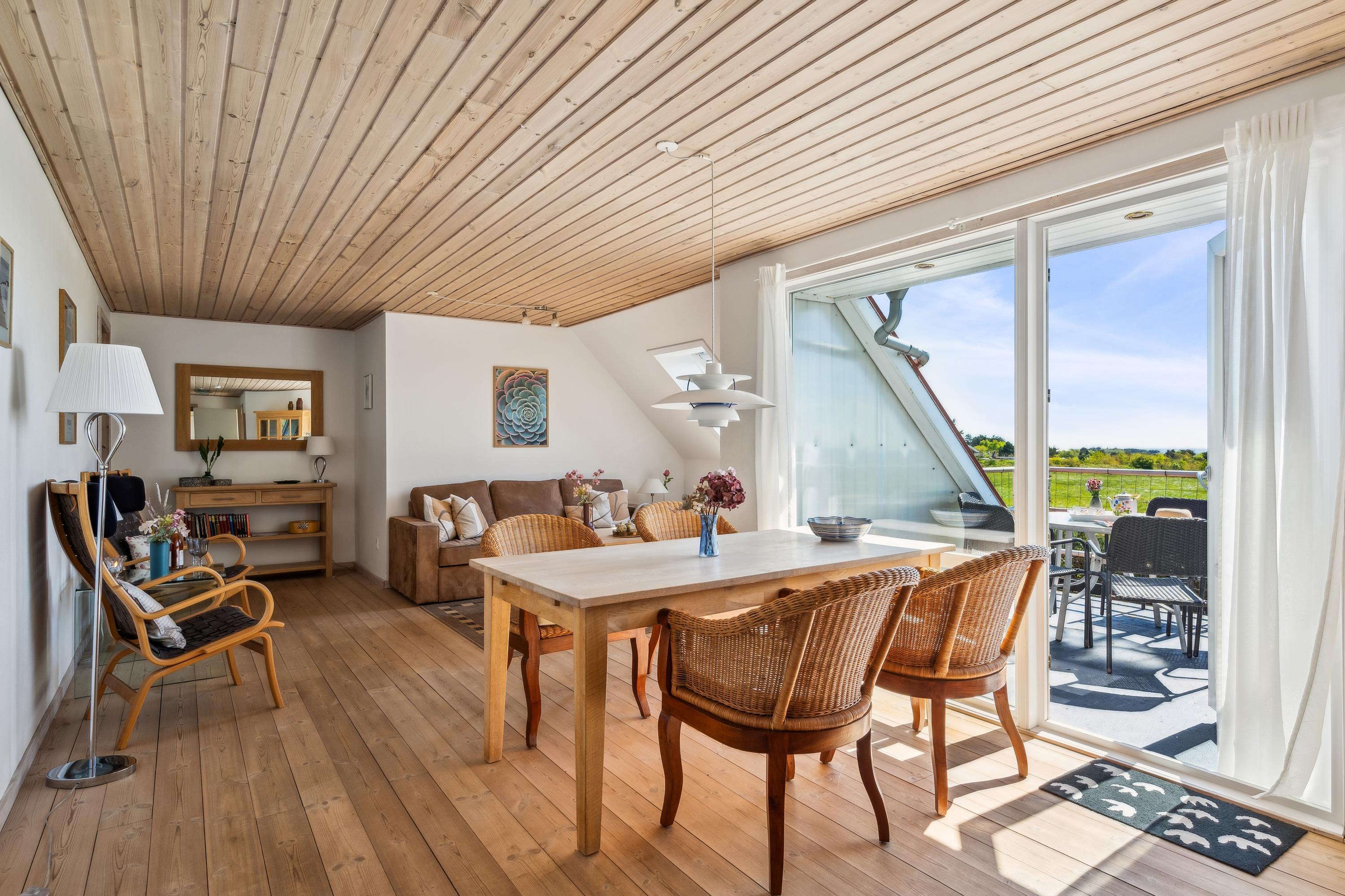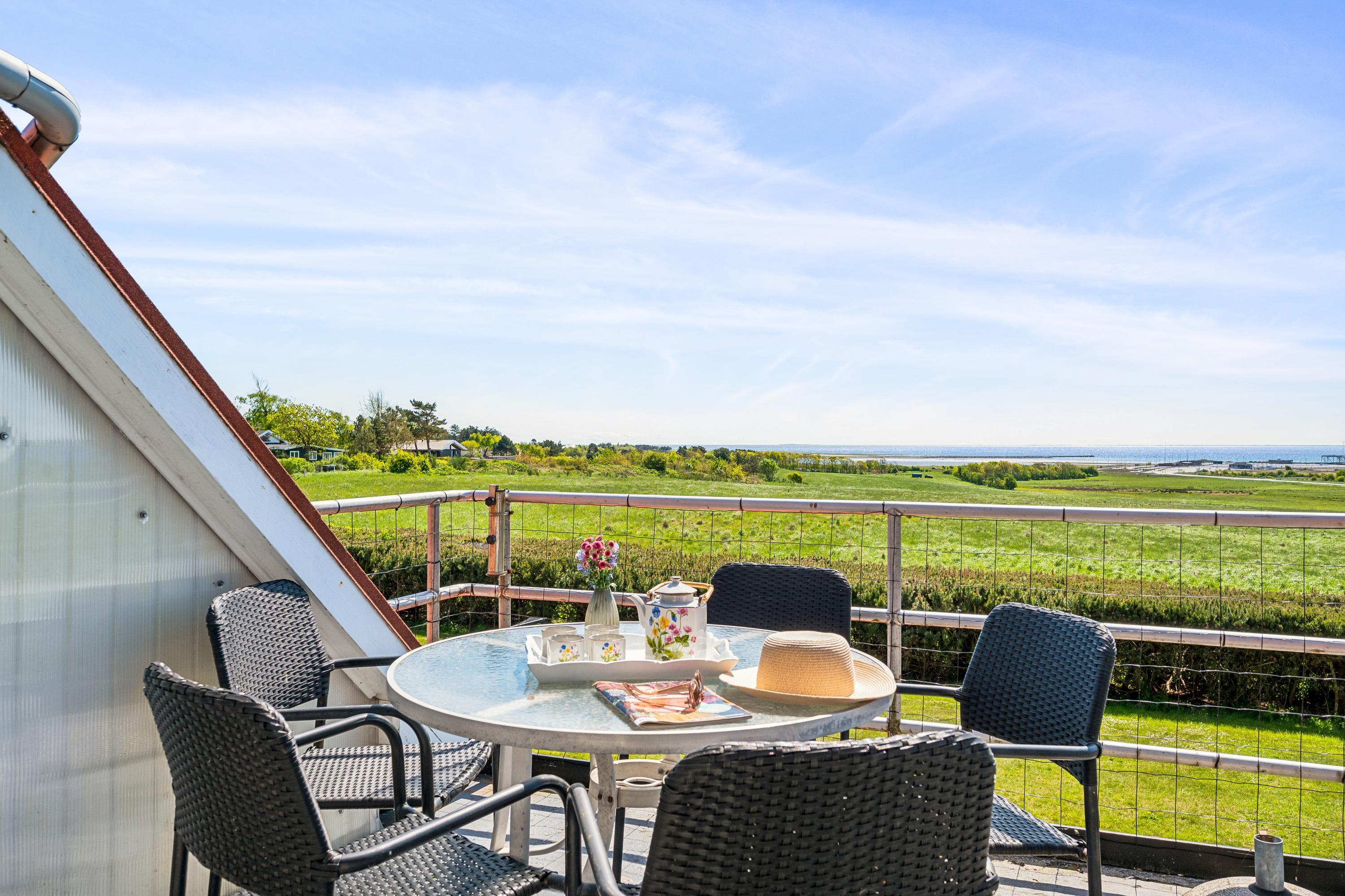 Well-maintained, bright, and inviting holiday apartment on an elevated, open natural plot with panoramic views of the Kattegat Sea and the hilly landscape south of Ebeltoft. The apartment is on the 1st floor and has a southwest-facing balcony with garden furniture, sun loungers, and a grill. On the large lot, shared with three other holiday apartments, there is a bonfire area as well as a swing set and sandbox for the children.