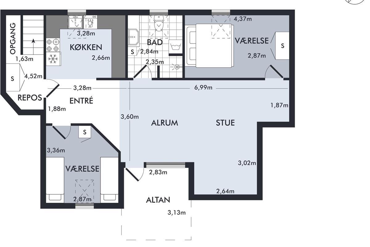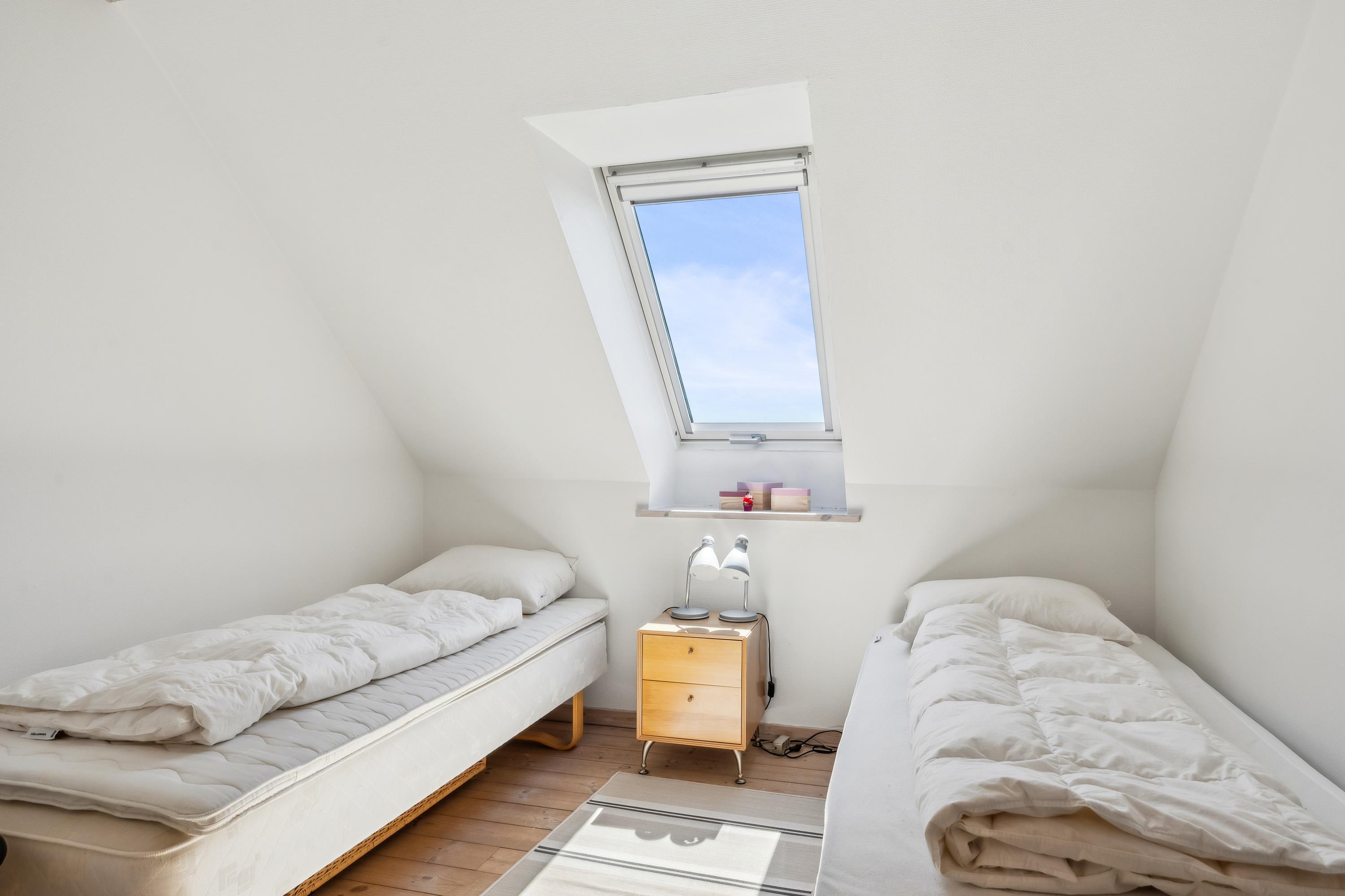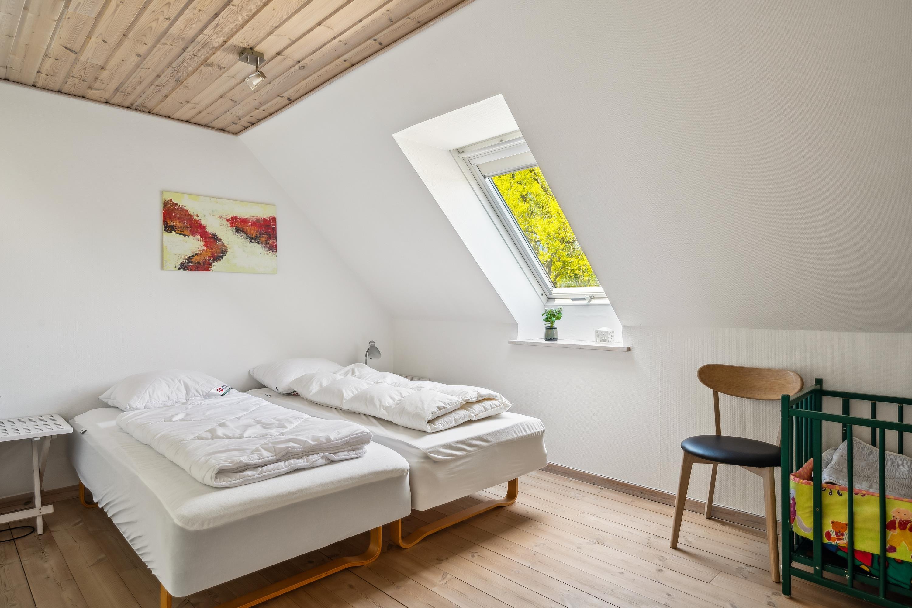 The apartment shares the main door with the ground floor apartment, and from the entrance, you ascend the stairs to your own entrance door. Here, you enter directly into the cozy living room in a semi-open connection with the kitchen. The living room has access to the balcony and accommodates a dining area for 6 people, a sofa corner with armchairs, and a TV with Danish free channels. Large kitchen with ample workspace, stove with ceramic hobs and oven, fridge/freezer, dishwasher, and microwave. The total of 6 sleeping places are distributed in 1 good, bright bedroom with a double bed, a slightly smaller room with 2 single beds, in addition to 2 sleeping places on a sofa bed in the living room. Nice, well-furnished bathroom with underfloor heating, shower, and washing machine. There is a crib and a high chair for the little ones. Internet access.