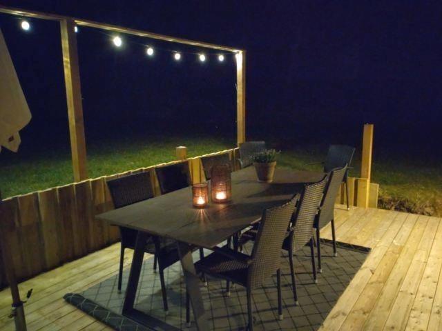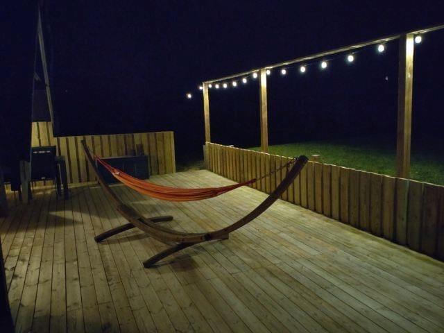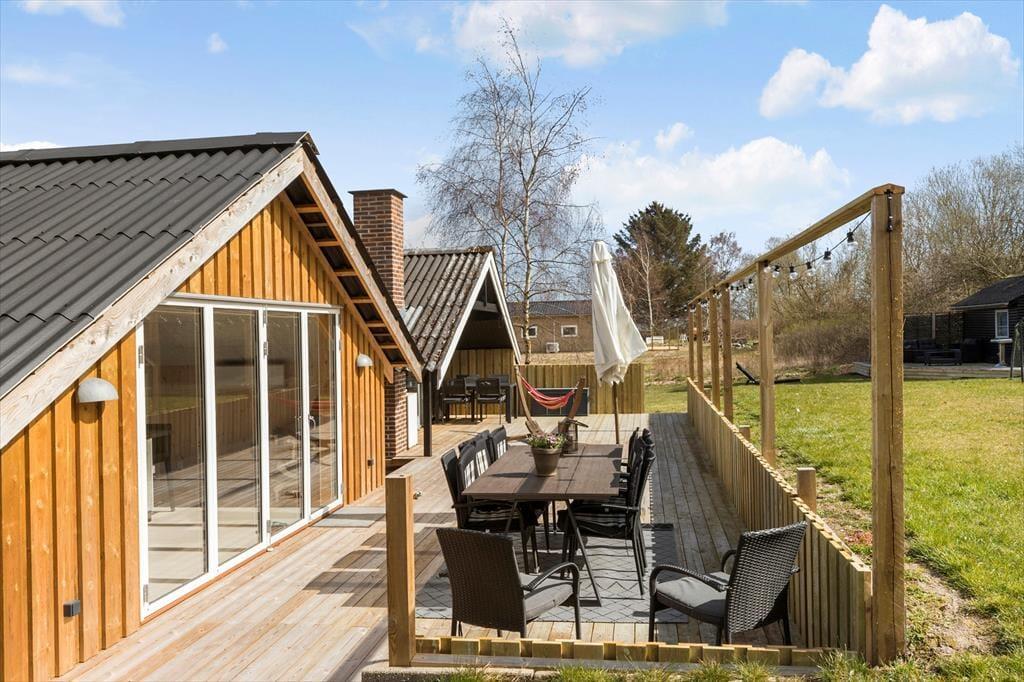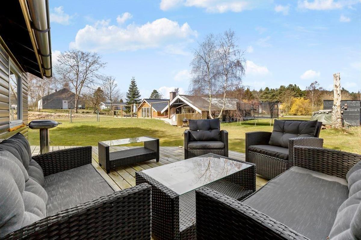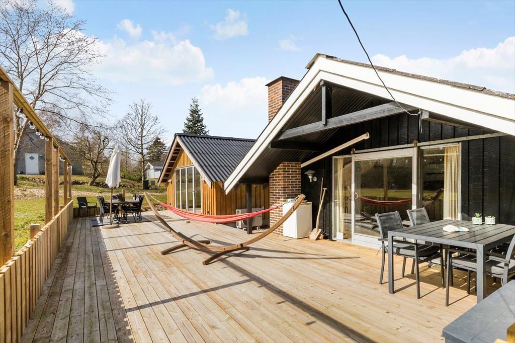 Die große, teilweise überdachte Holzterrasse wird im Nu zum Lieblingsplatz aller Mitreisenden avancieren. Hier kannst du es dir mit deinen Lieben auf den Gartenstühlen gemütlich machen, dir ein Nickerchen in der Hängematte gönnen und deine Familie allabendlich mit köstlichem Essen vom Grill verwöhnen. Das Grundstück ist schön eben und eignet sich somit perfekt zum Ballspielen, zum Umhertollen und für ausgedehnte Sonnenbäder im Gras. Abends werdet ihr gern in gemütlicher Runde auf der Terrasse beisammensitzen und den erlebnisreichen Tag in stimmungsvoller Runde ausklingen lassen.