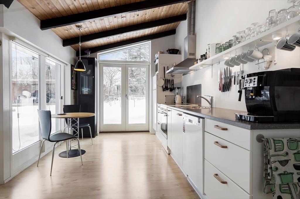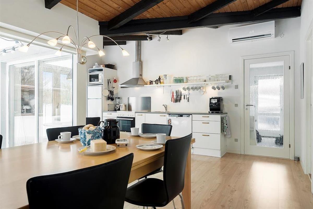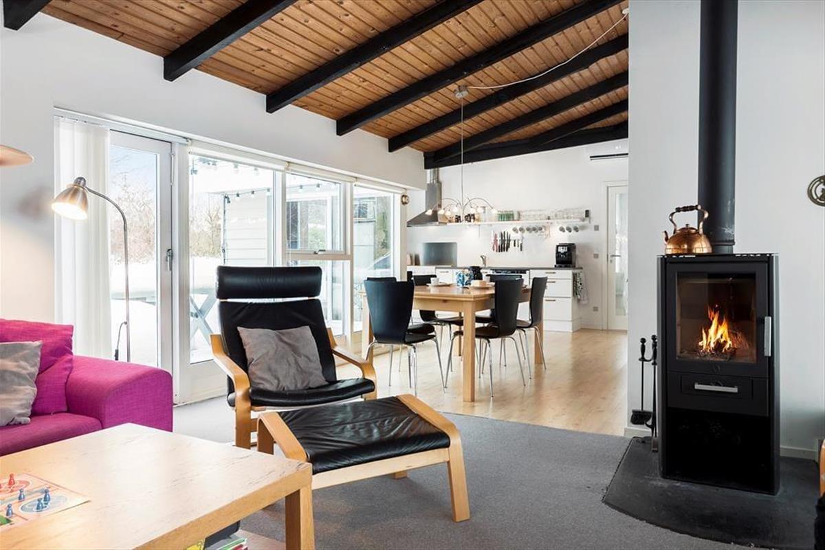 Unmittelbar nach dem Betreten dieses modernen Ferienhauses spürst du die helle, angenehm luftige Wohnatmosphäre. Das Herzstück des Mietobjektes ist der offen kombinierte Küchen- und Essbereich, der fließend in den Wohnraum übergeht. Vielen gemütlichen Stunden im Kreise deiner Lieben steht daher nichts im Wege. In der gut ausgestatteten Küche wird das Zubereiten köstlicher Mahlzeiten zum Vergnügen. Selbst während du kochst, genießt du die Nähe und Gesellschaft deiner Familienmitglieder, die es sich am Esstisch oder auf dem Sofa gemütlich gemacht haben. Die großen Fenster gewähren einen fantastischen Tageslichteinfall und schaffen eine schöne Verbindung zur umliegenden Natur. Die drei komfortablen Schlafräume laden nach langen, erlebnisreichen Tagen zu erholsamen Nächten ein. Mit einem Maximum an Entspannung verwöhnt dich der im ansprechenden Badezimmer platzierte Whirlpool. Dieses Ferienhaus bietet beste Möglichkeiten, dich in wunderschönem Rahmen im Kreise deiner Familie in vollen Zügen zu erholen.