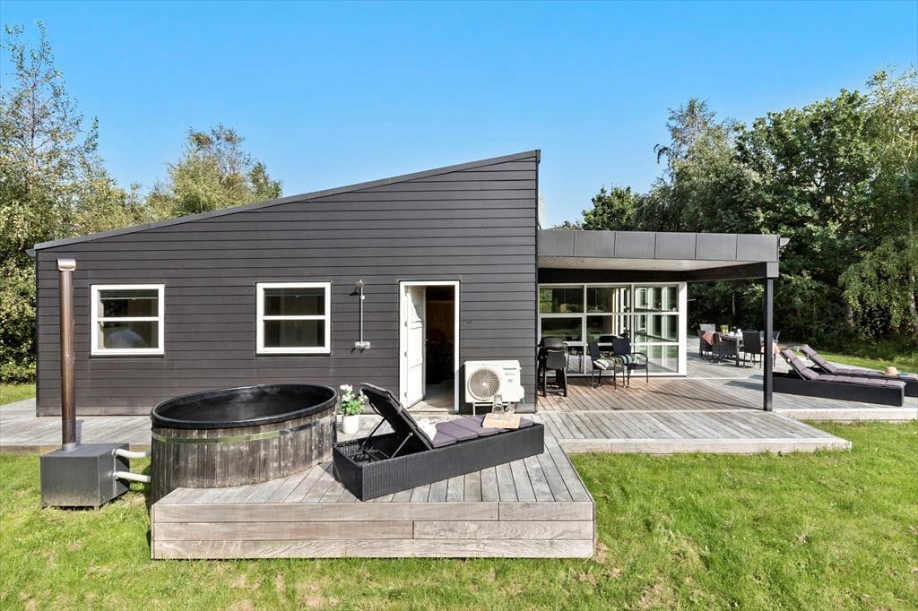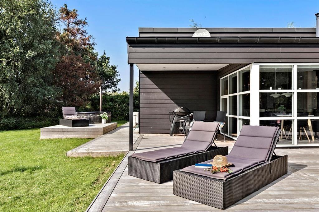 Auf der Terrasse spürst du die Nähe zur Natur. Jeden neuen Tag begrüßt ihr am besten mit einem frischen Kaffee oder einem ausgedehnten Frühstück im Freien. Während die Kinder am Nachmittag ausgelassen unter freiem Himmel spielen, machst du es dir auf einer der Sonnenliegen gemütlich oder gönnst dir ein wohlig warmes Bad in der Schwedischen Badetonne. Die singenden Vögel in den Baumwipfeln und das viele Grün ringsum bilden dabei eine wunderschöne Kulisse. Allabendlich werdet ihr den langen erlebnisreichen Tag gern mit einem köstlichen Essen vom Grill in gemütlicher Runde ausklingen lassen. Das ist es, worum es im Urlaub in Dänemark geht - der Natur nahe zu sein, in ihr zu leben und dabei die Gesellschaft der Herzensmenschen zu genießen.